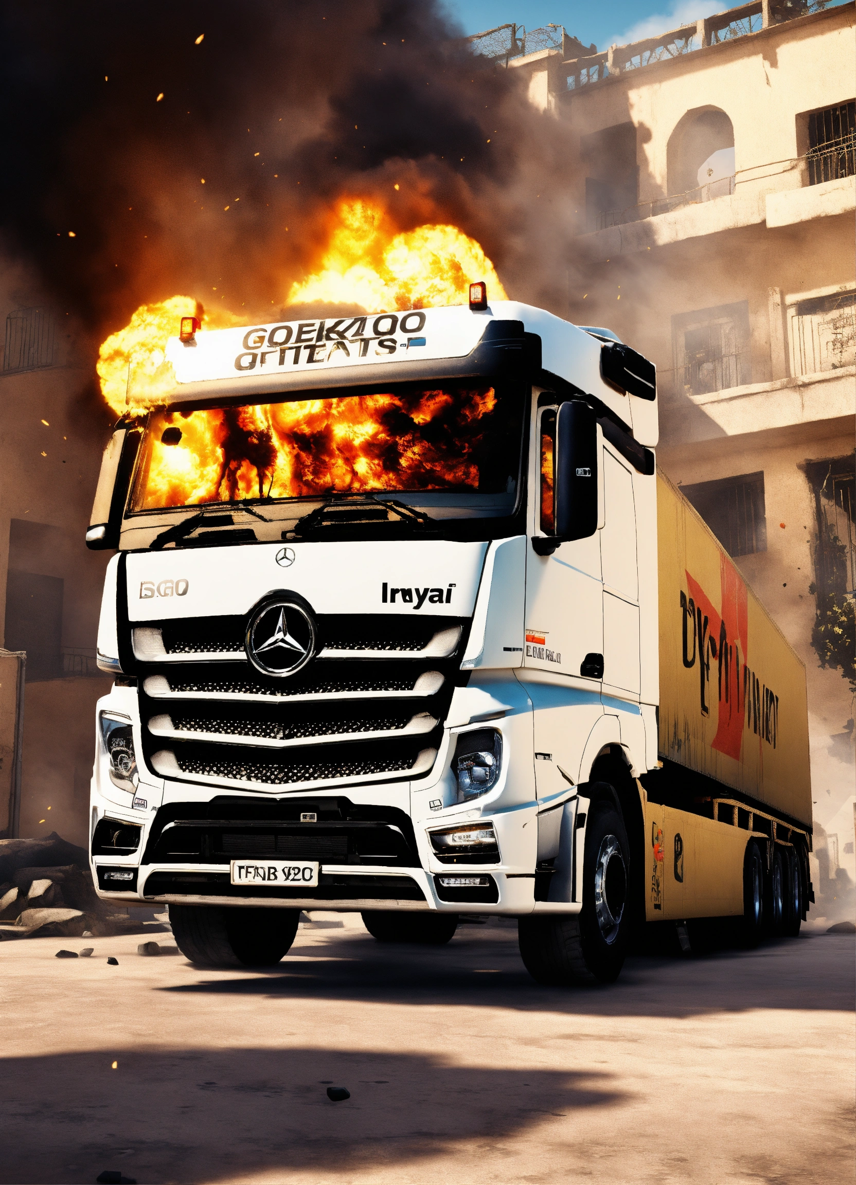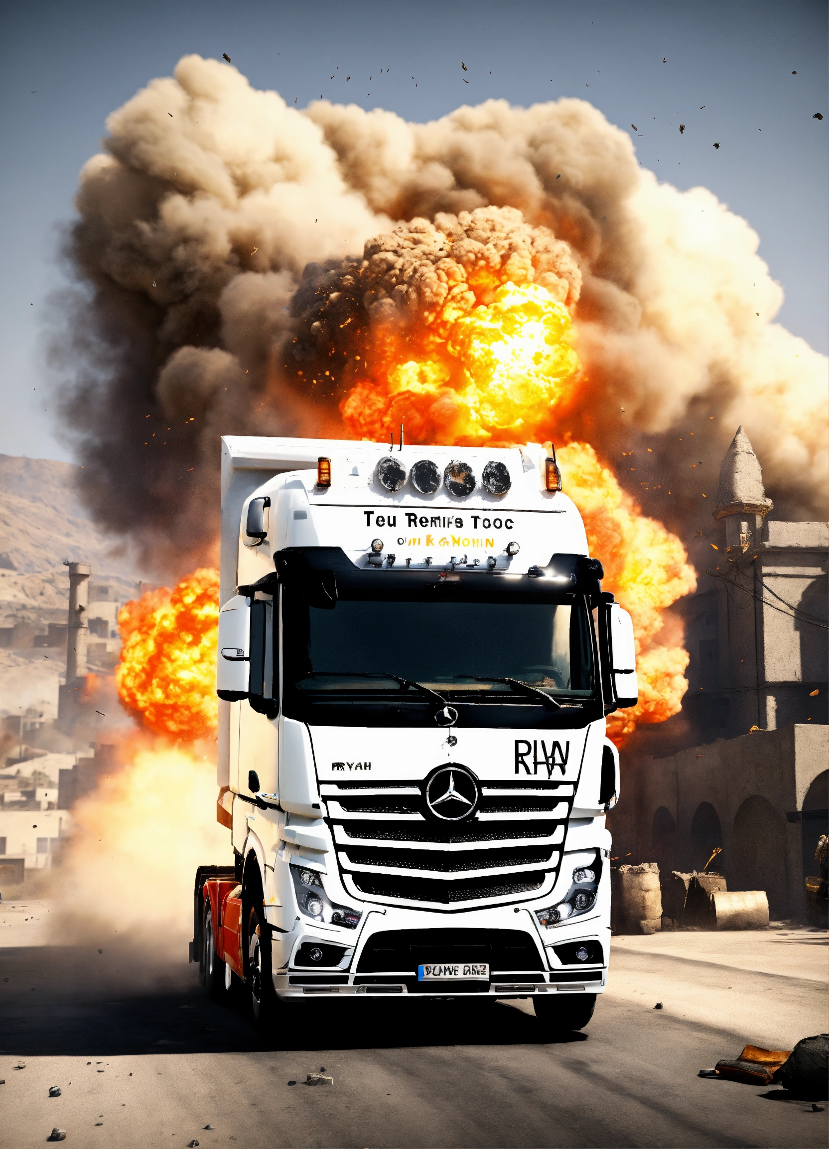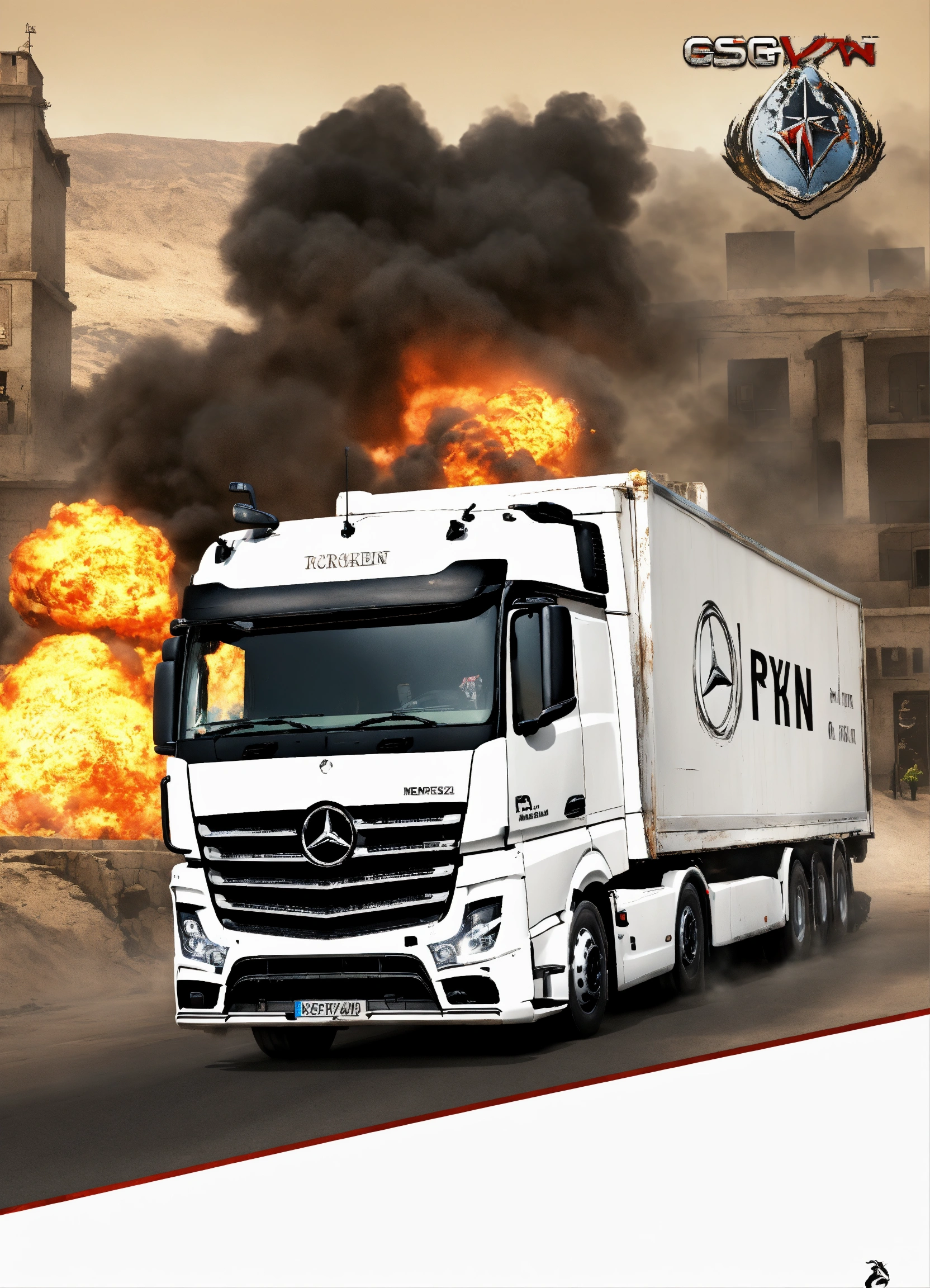 A large white mercedes actros hgv truck with the word ryan in text on it, in the counter-strike csgo global offensive map de_dust 2 with an explosion in the background