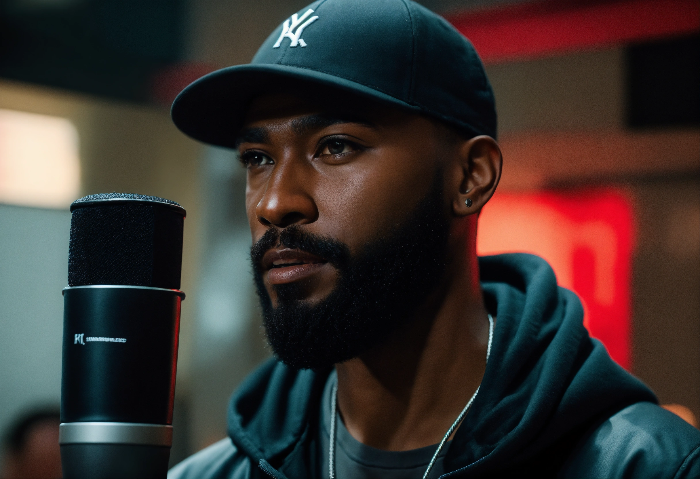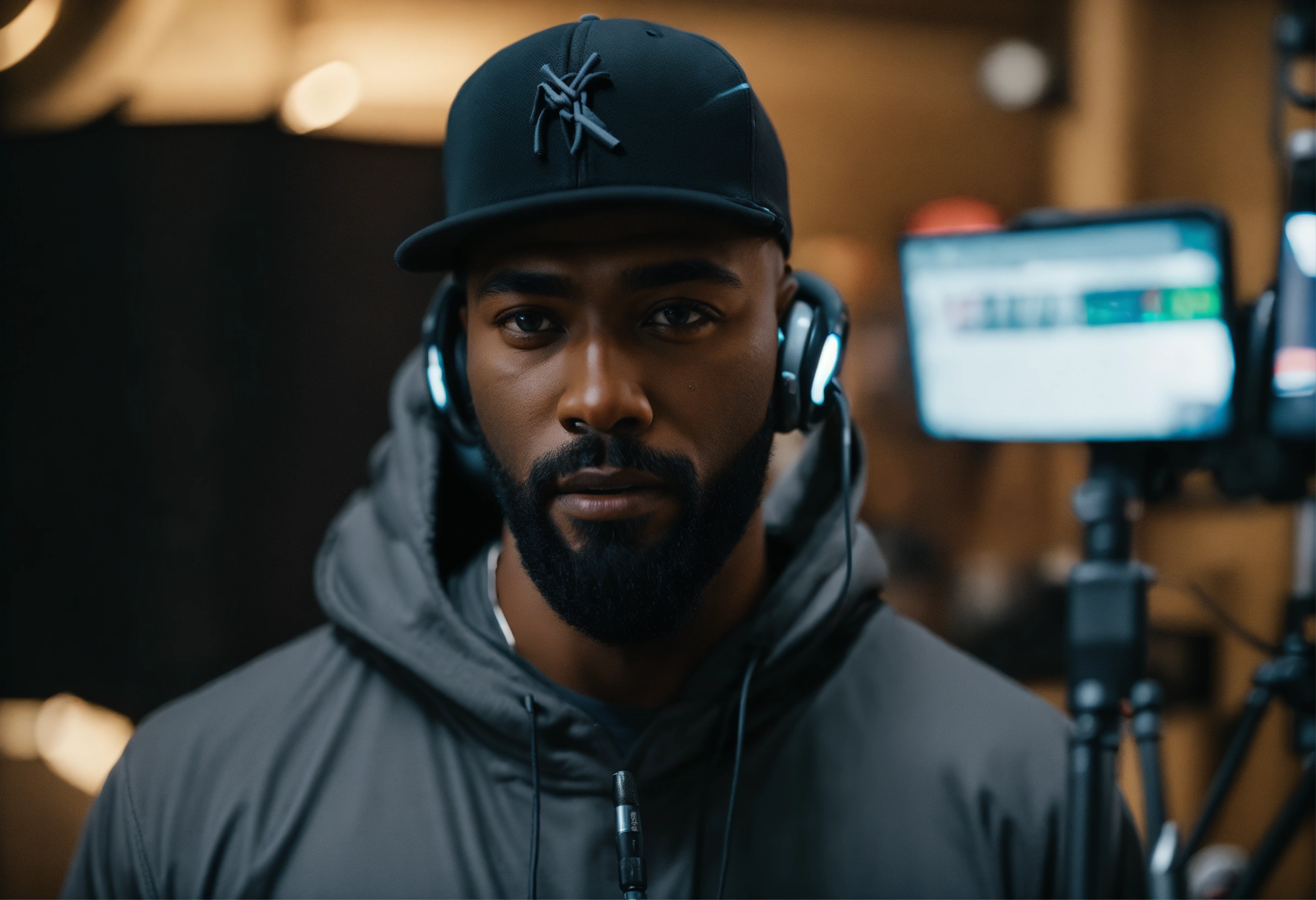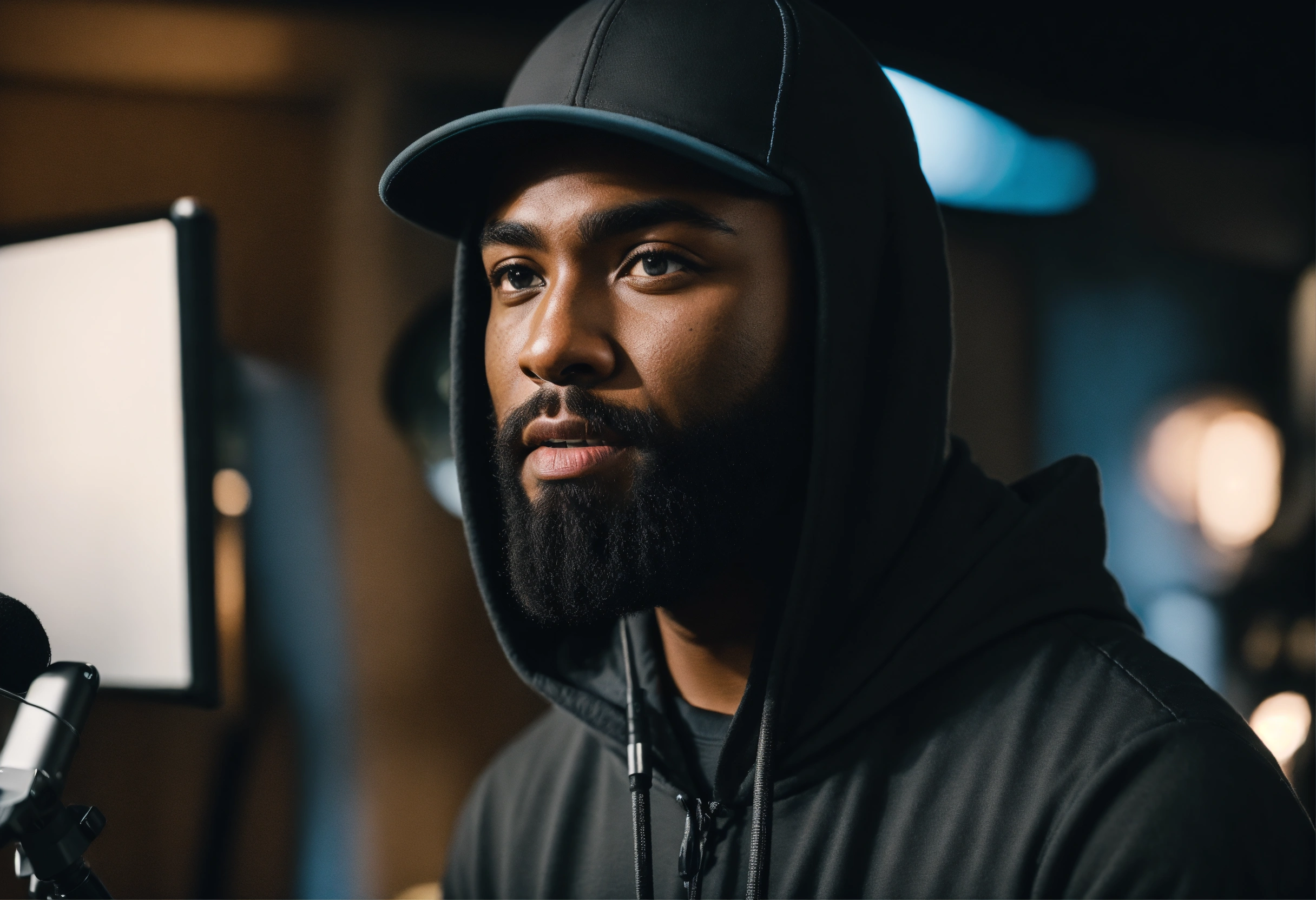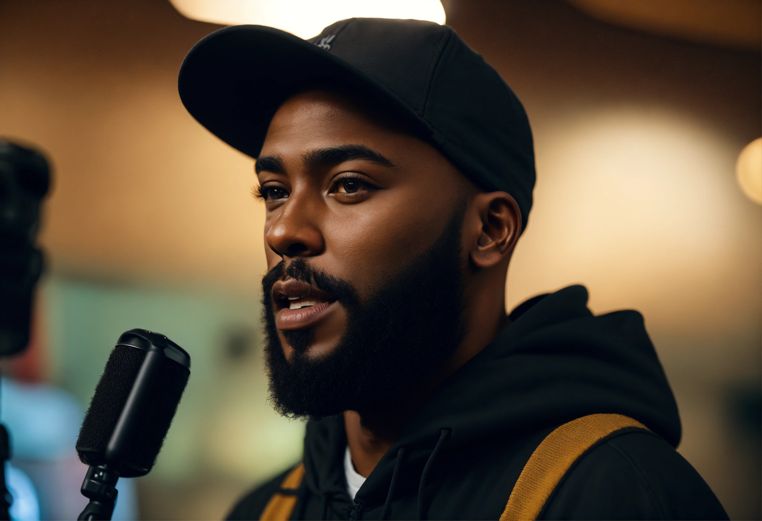 Bald dark skin black handsome man with beard, talking into a mic on a mic stand, 8k, he is wearing a black hoody, black baseball cap, he's very dark skin, he's facing the camera in a front profile, his body is face front, his eyes at looking into the camera, camera equipment in the background, very real, actual human photo, very detailed, 8k, everything looks like a real photo, cinematic lighting.