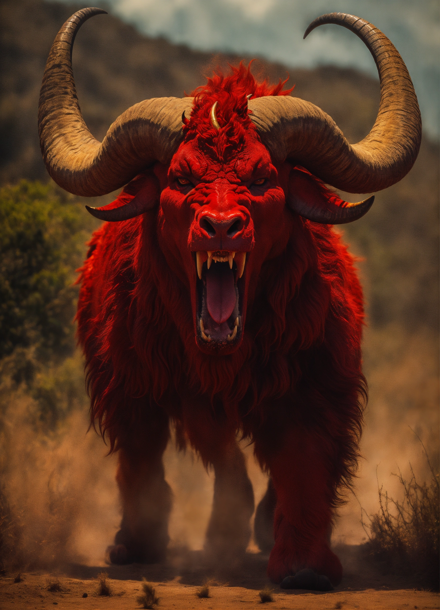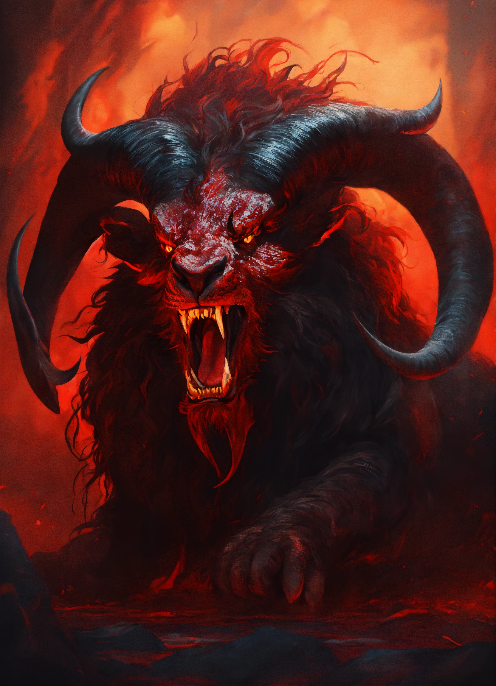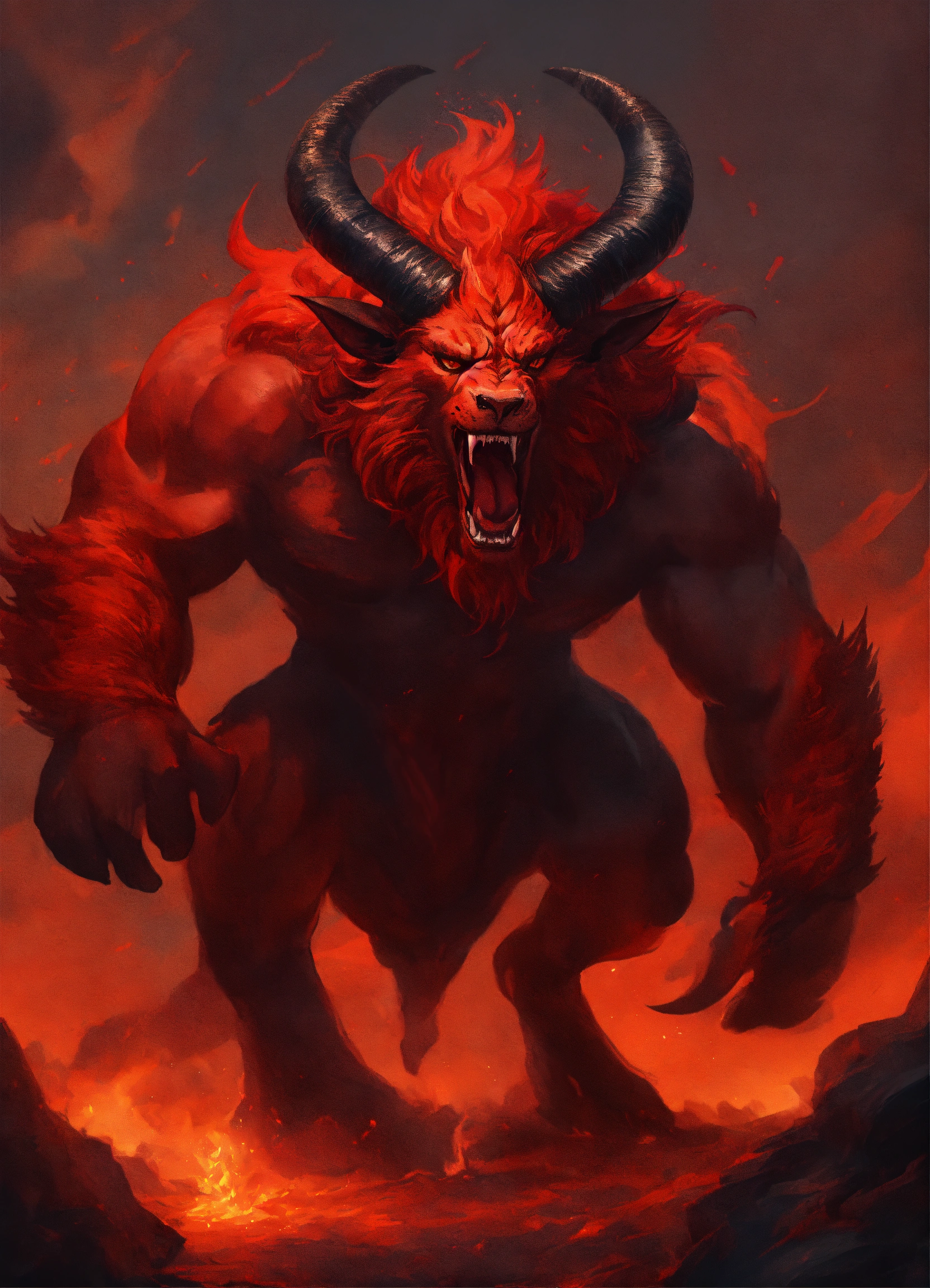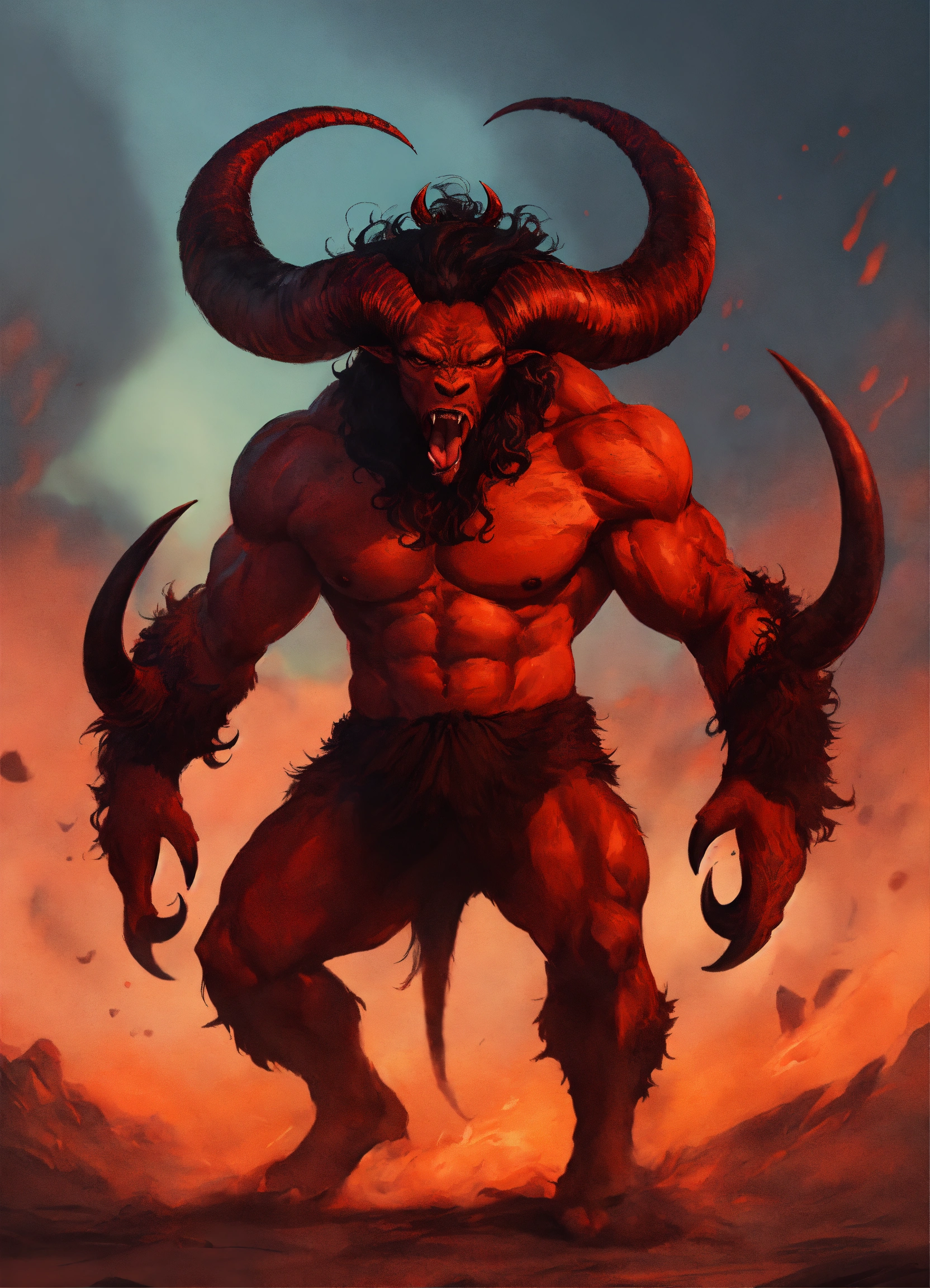 A hellish image of an absurdly muscular red-skinned and hooved feet curly long tail crazy long black horns long split tongue roaring demon with african features
