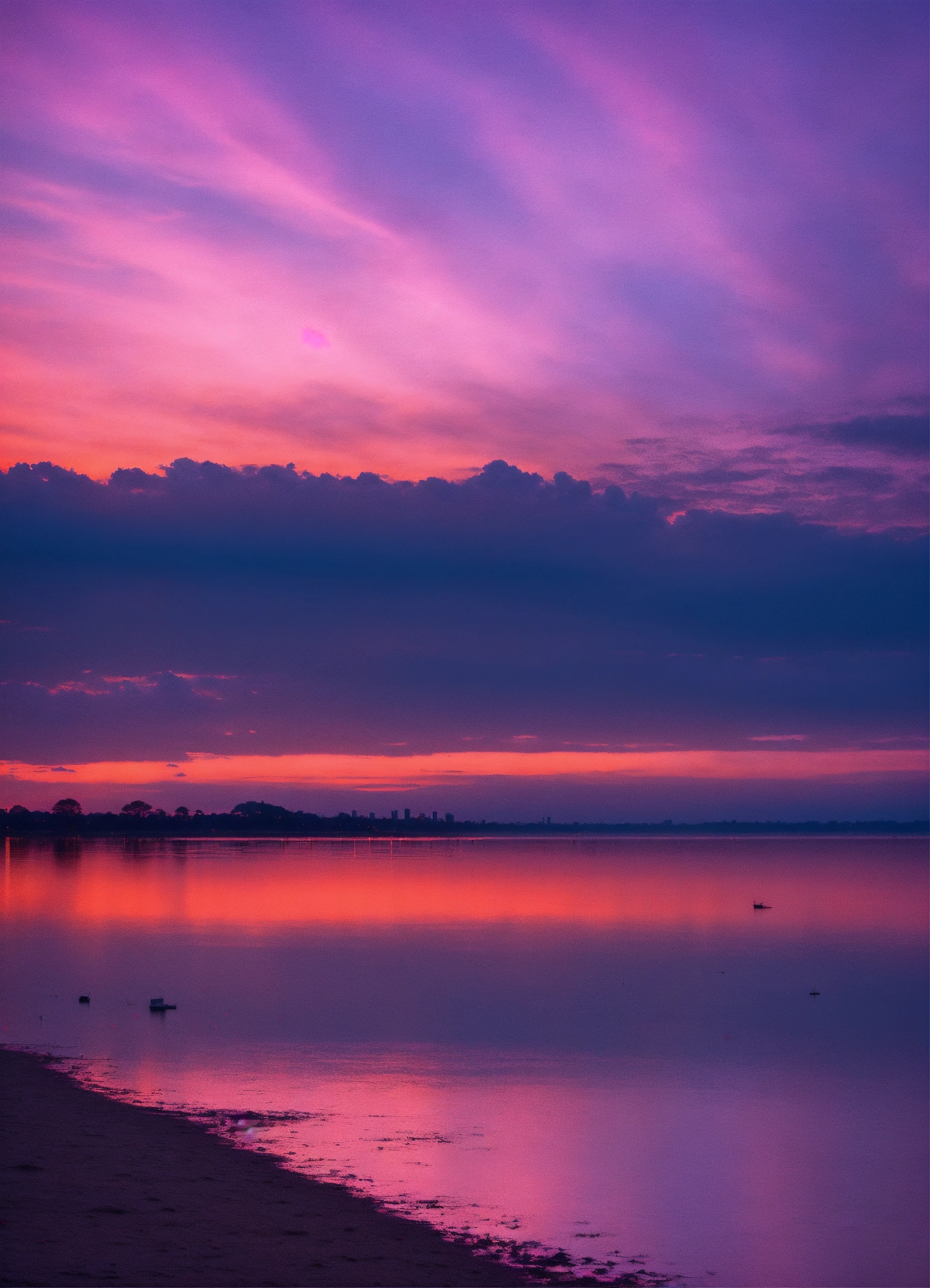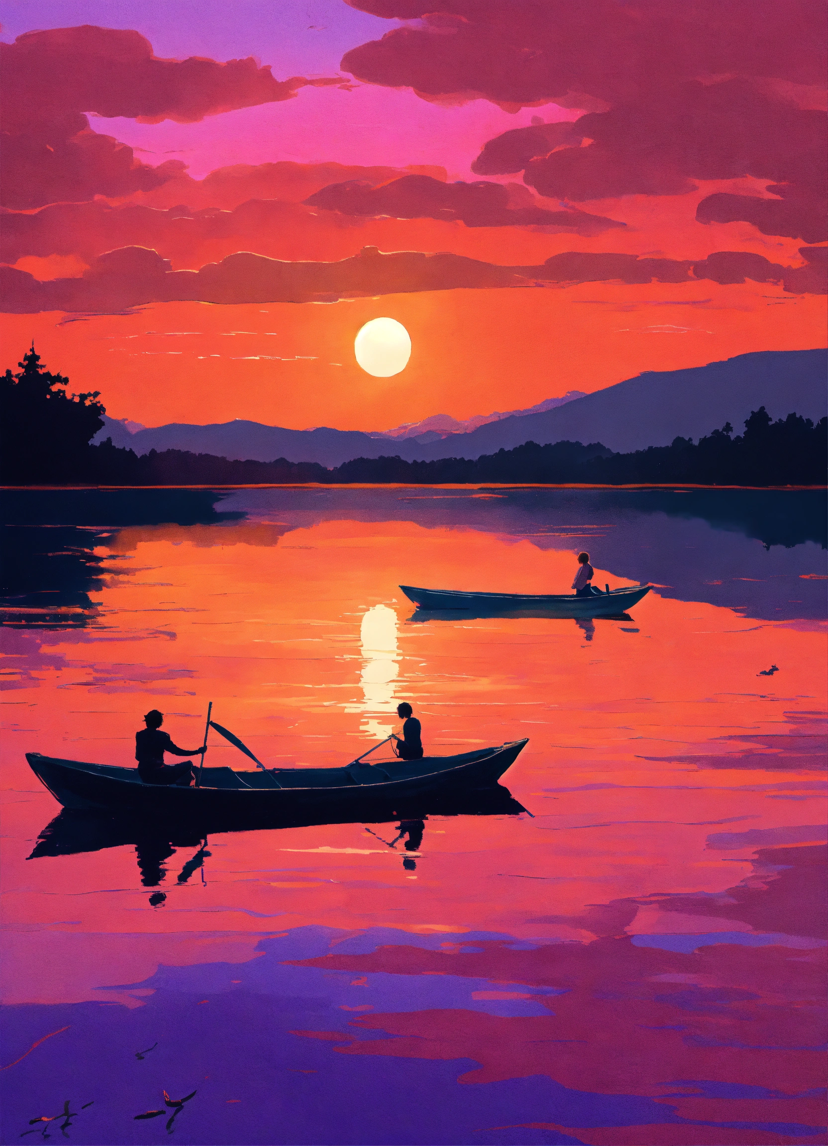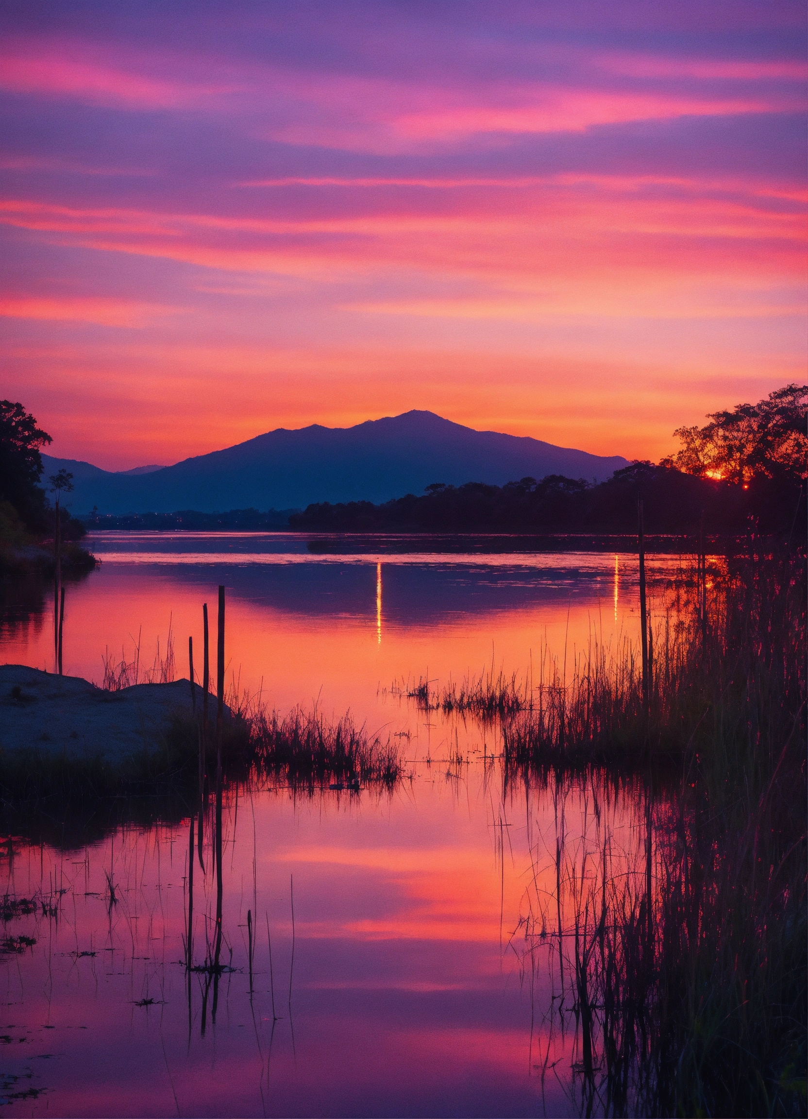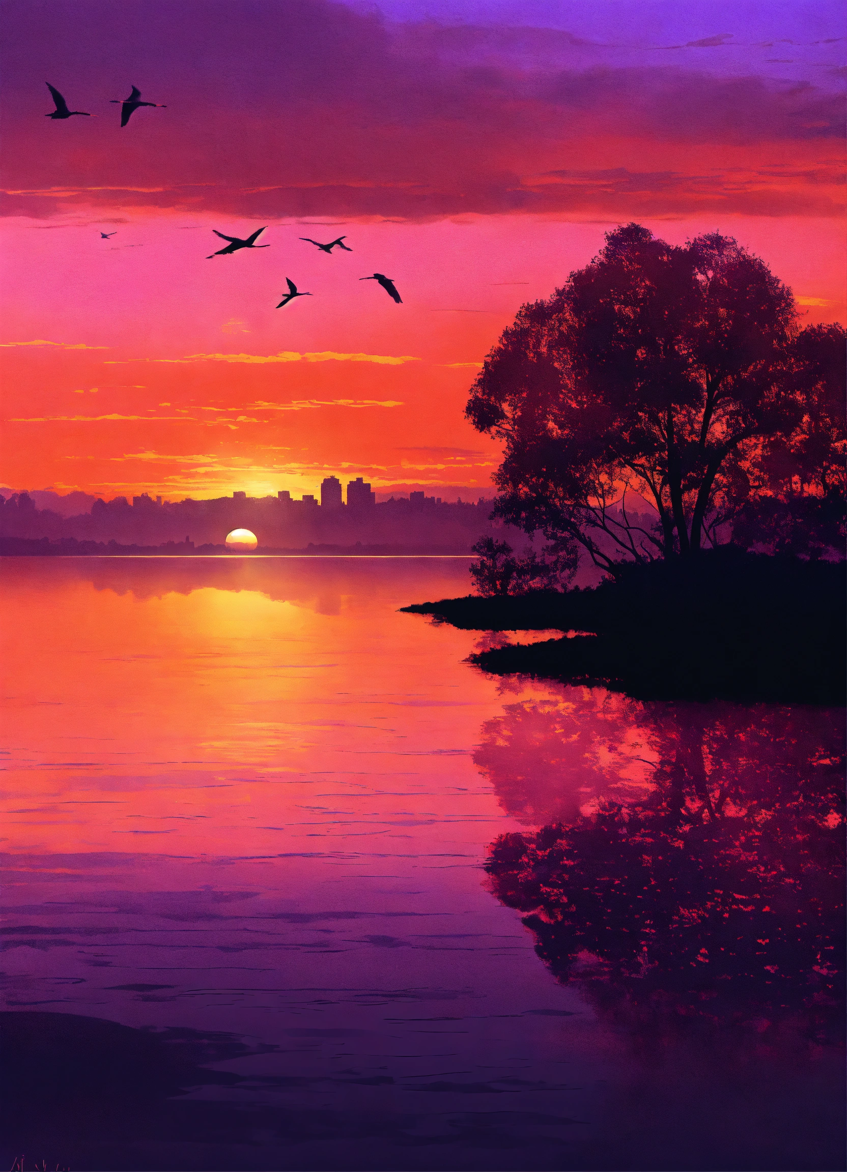 Craft a tranquil scene that encapsulates the fleeting beauty of a sunset. let the colors paint the sky with hues of orange, pink, and purple, gradually melting into the darkening horizon. in the foreground, silhouette the world in its serenity, whether it's the gentle ripples on a quiet lake or the outline of a cityscape bidding the day goodbye. bring to life the ephemeral moment when day meets night, and the world stands still in awe.