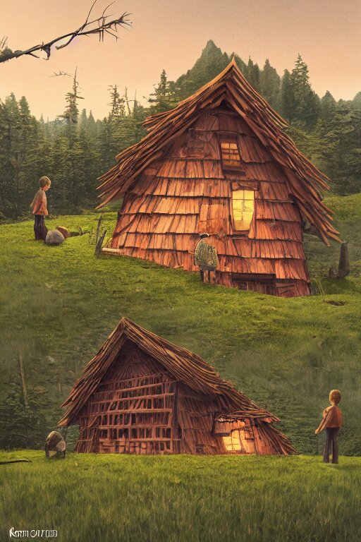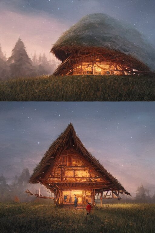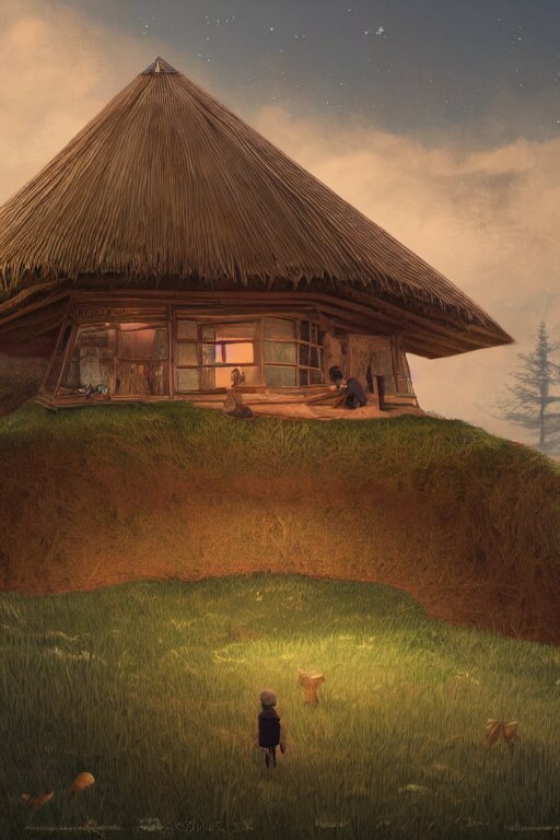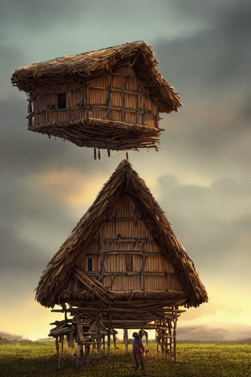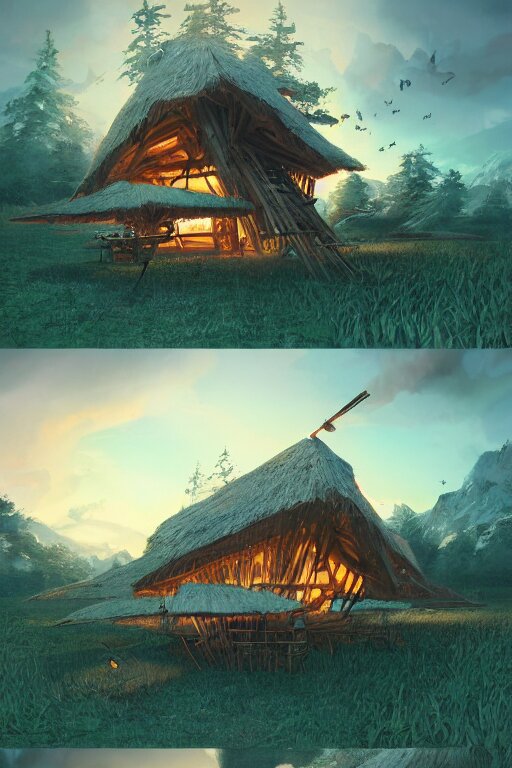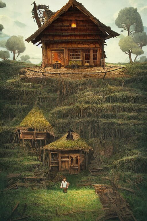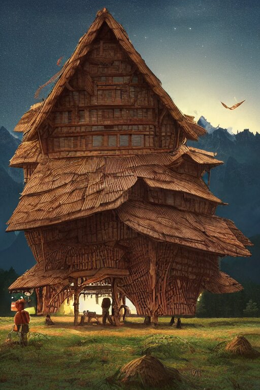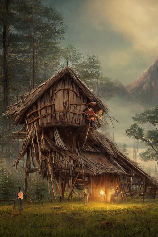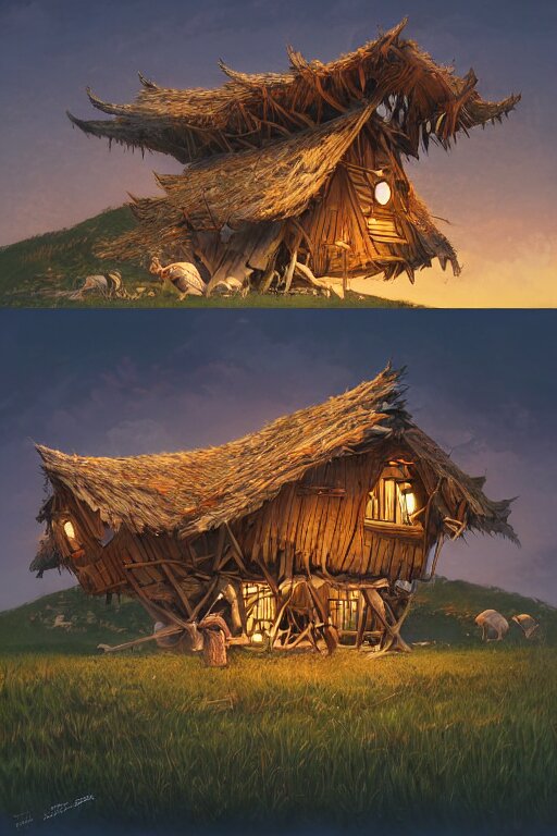 An awesome twilight day concept art of old hut standing at giant hen's legs, by kengo kuma and wes anderson with village, mixed development, cgsociety, fantastic realism, artstation hq