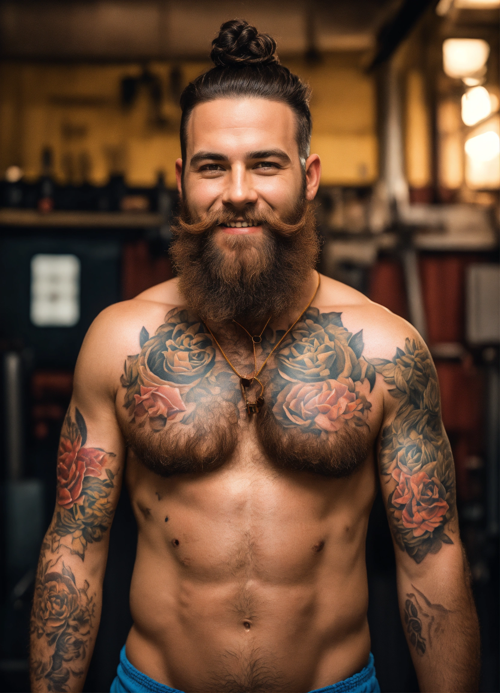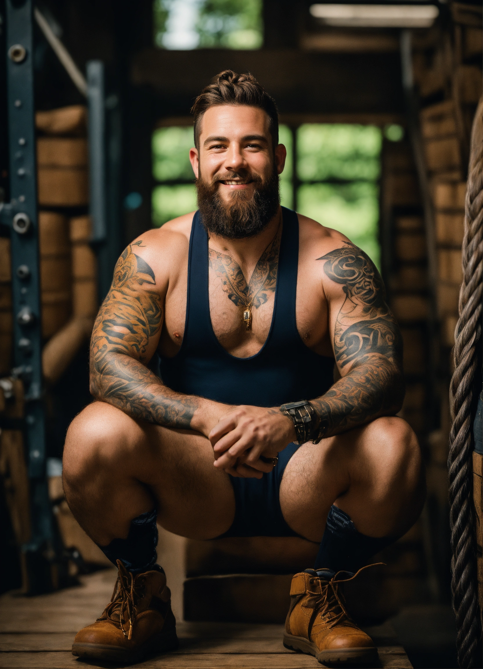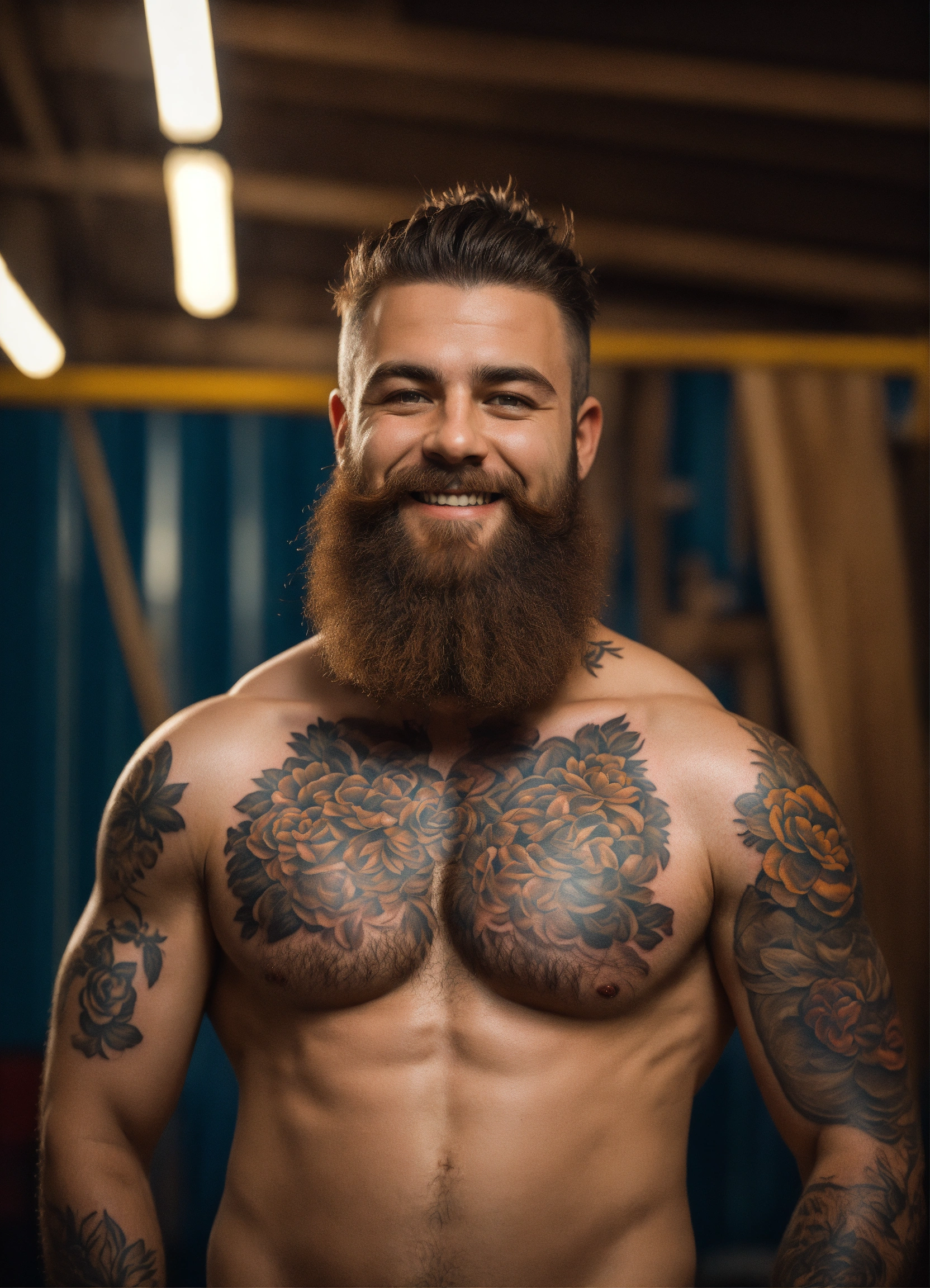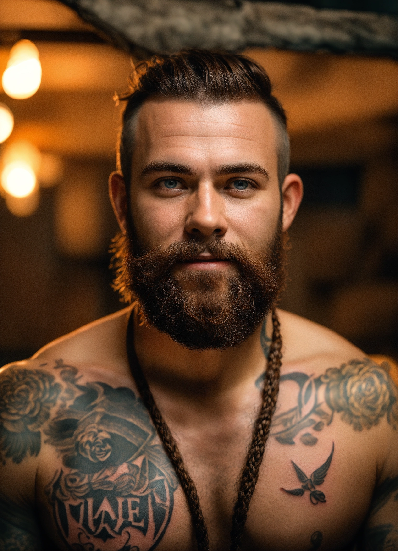 Photo realistic portrait of dwarf, male, hairy chest, tattoos, brown hair, realistic eyes, braided beard, smiling, speedo, centered in frame, facing camera, symmetrical face, ideal human, 85m m lens, f8, photography, ultra details, natural light, workshop background, photo, out of focus barrels in background –ar 916 –testp –v 3 –upbeta