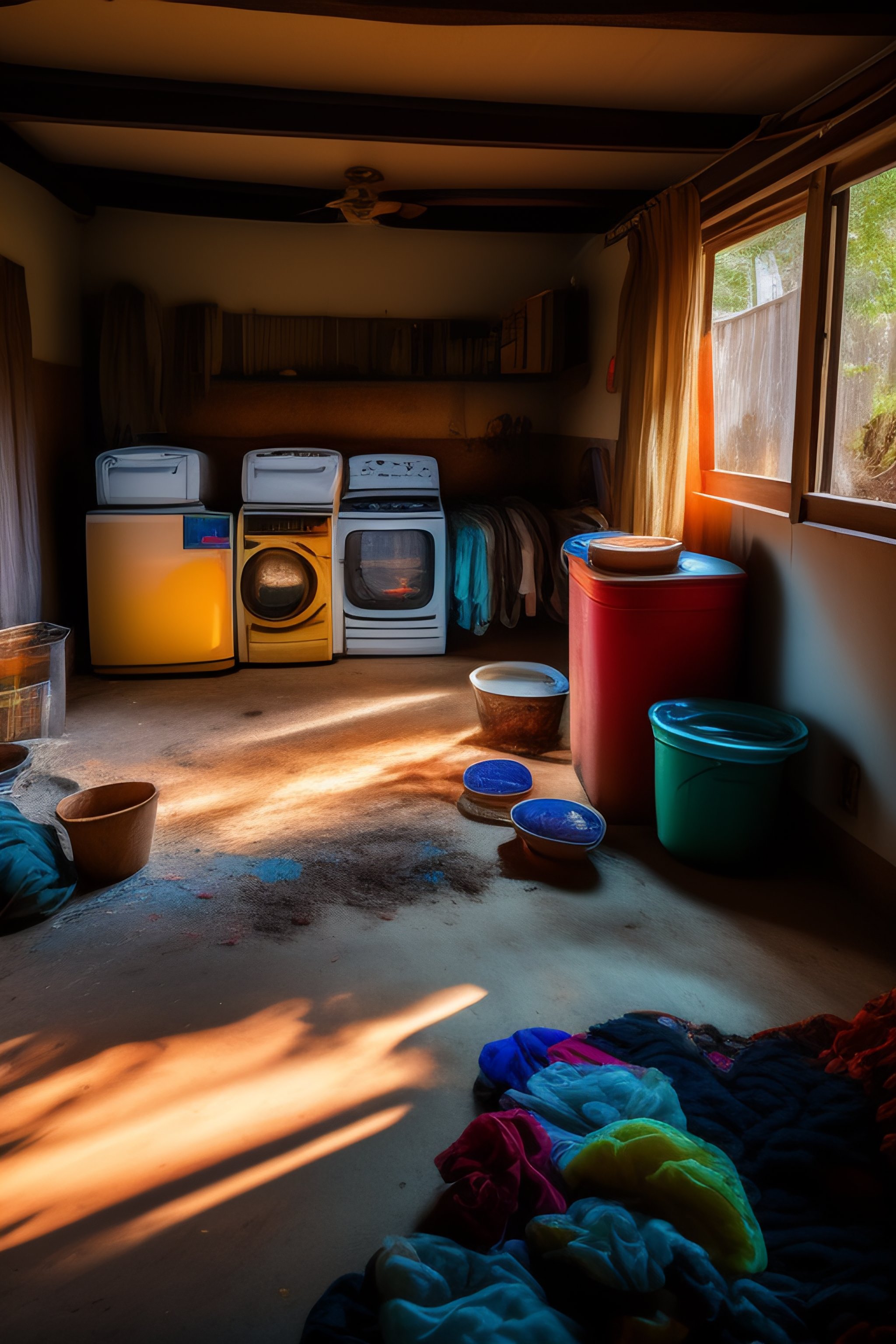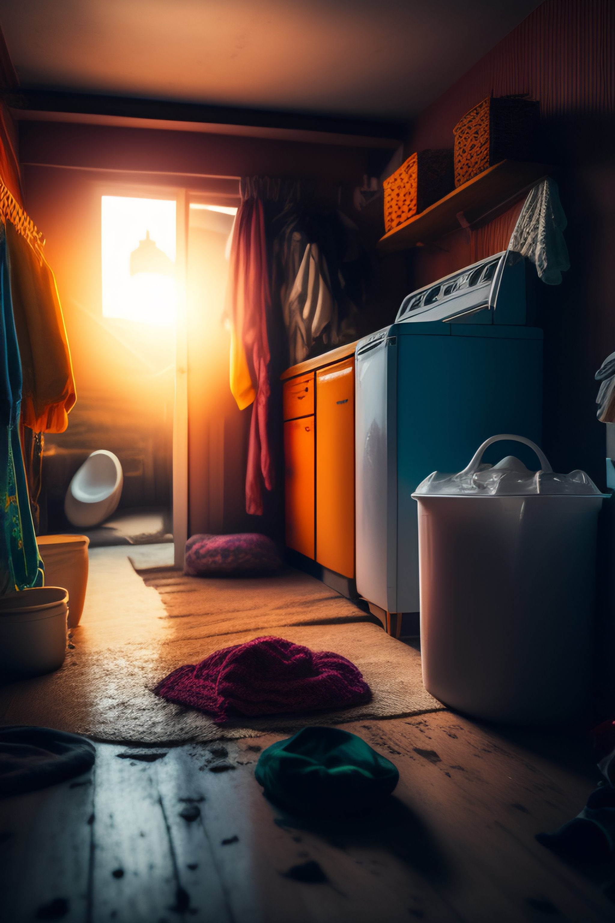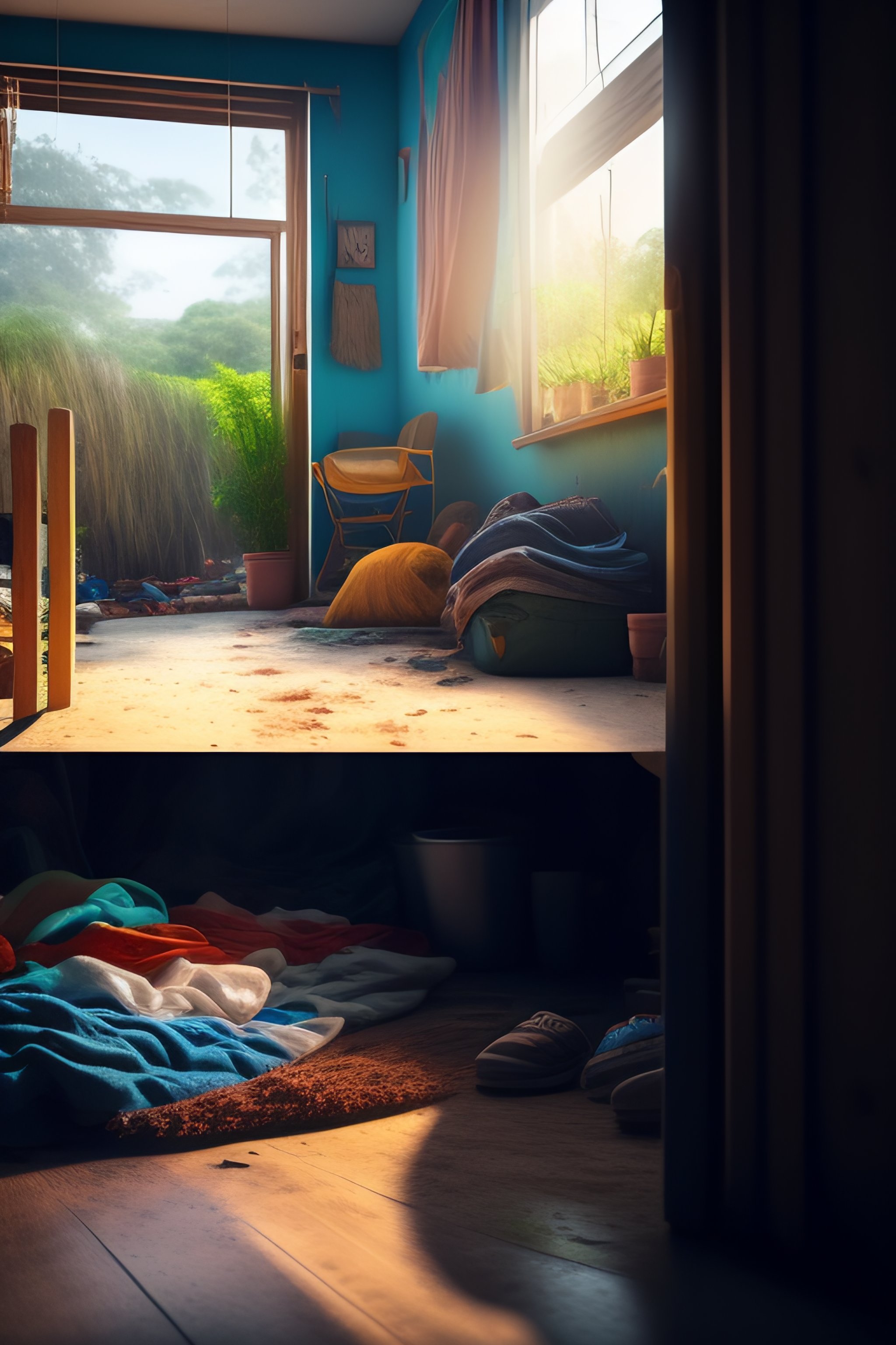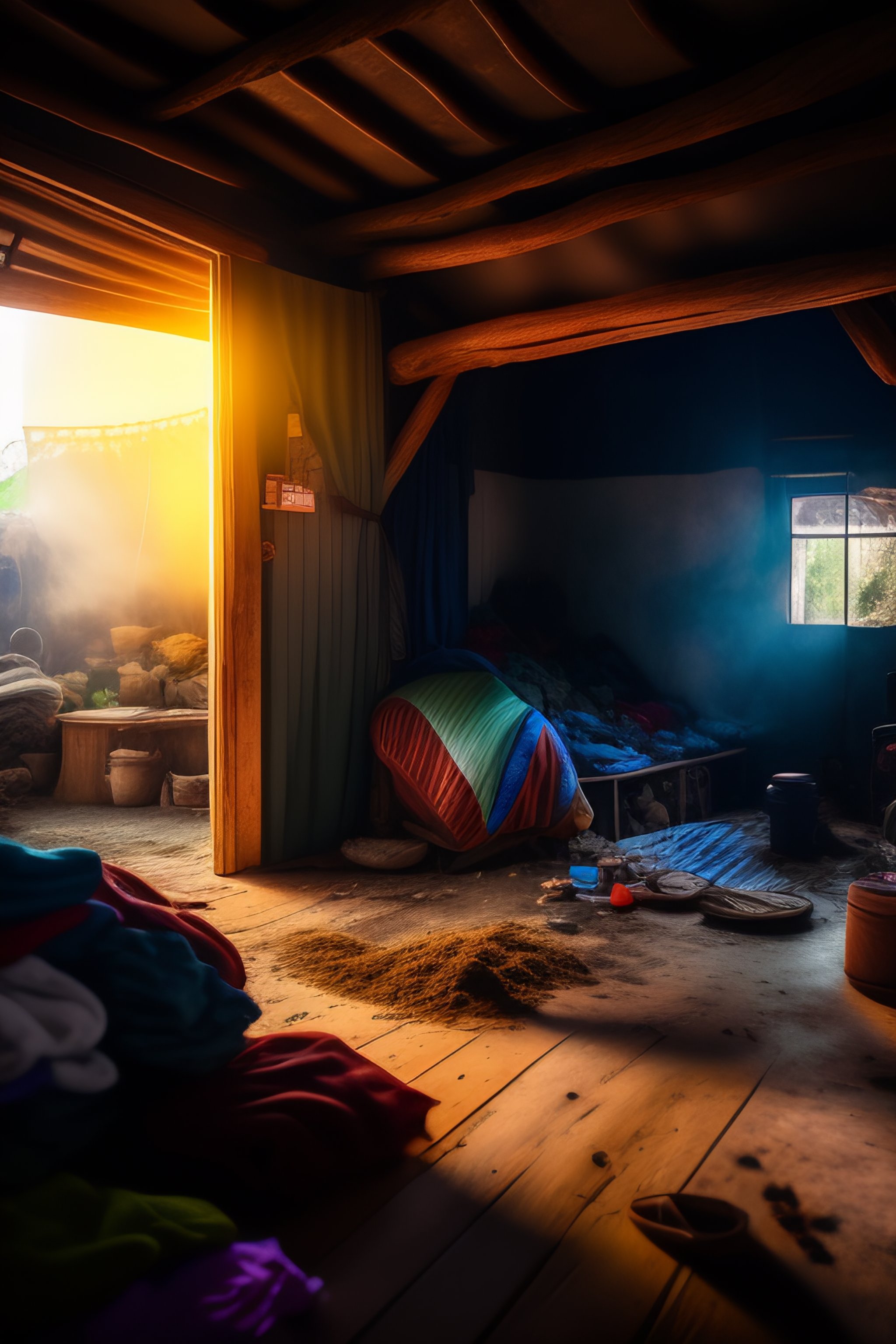 Inside a dirty house with a lot of untidy and messy clothes on the floor, chaotic hut in the background. vibrant, photorealistic, realistic, dramatic, dark, sharp focus, 8k.
