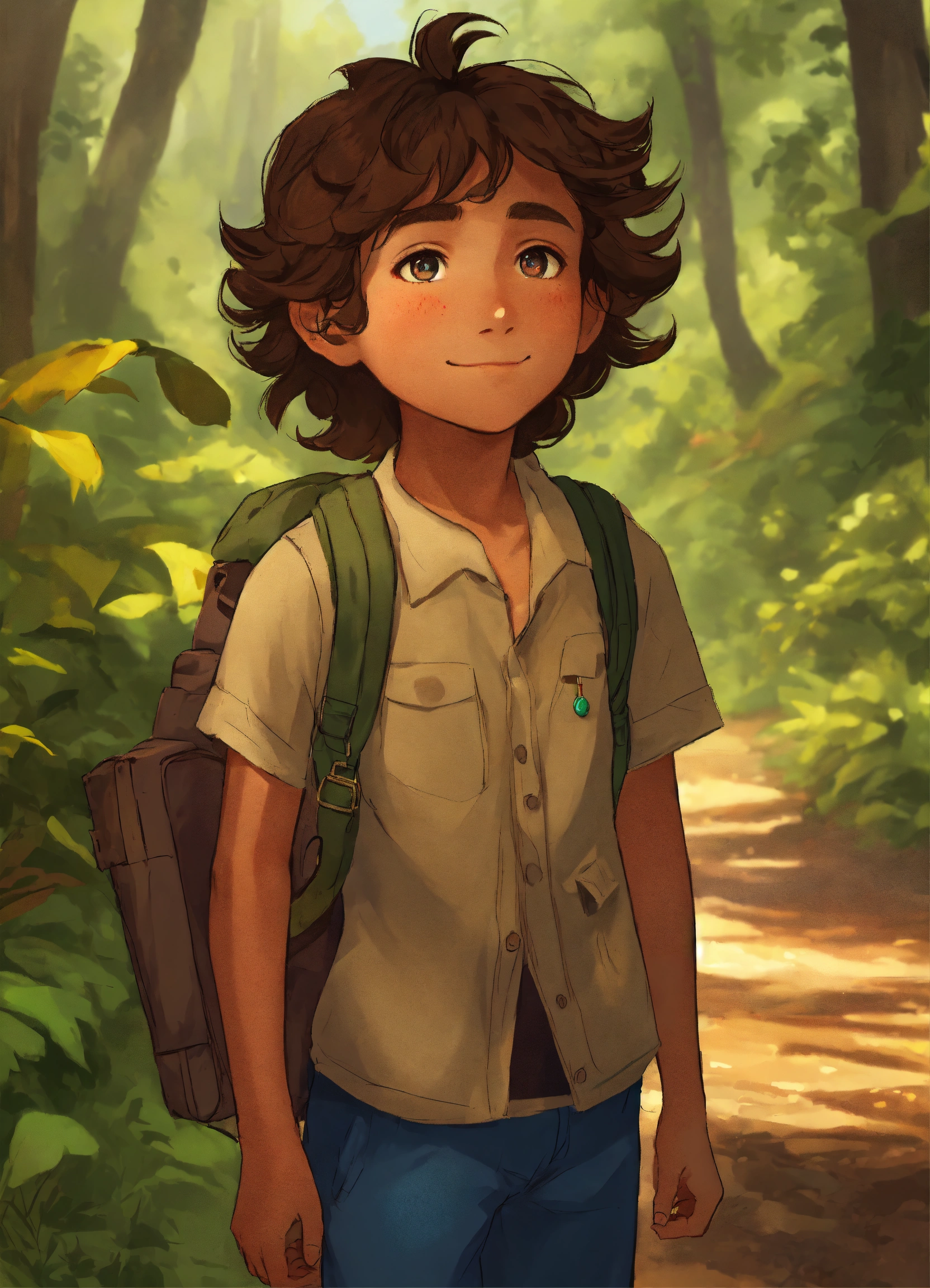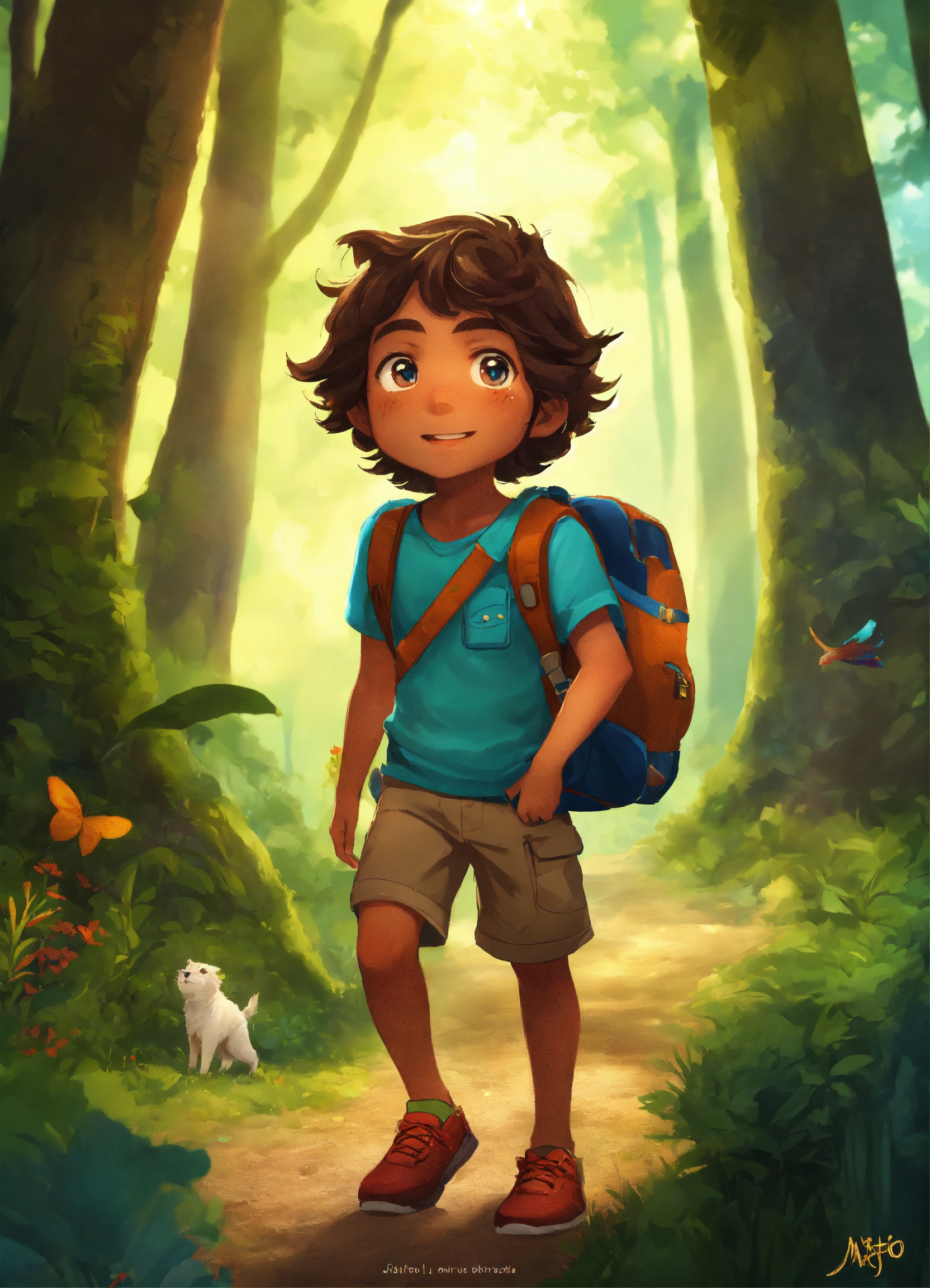 Mateo mateo is a boy of about 10 years old. he has dark and messy hair. his eyes are bright and expressive, reflecting a mixture of curiosity and courage. he usually wears comfortable clothes, such as a t-shirt and shorts, suitable for adventures in the forest. he always carries with him an old map deployed, which is his guide in the treasure hunt. sofia sofía is a little younger than mateo, maybe around 8 or 9 years old. her hair is a soft color, and her face reflects a determination and contagious joy. dress in colorful and comfortable clothes, which make her stand out in the middle of the magical forest. she usually carries a backpack where she keeps objects that they find in her adventure.