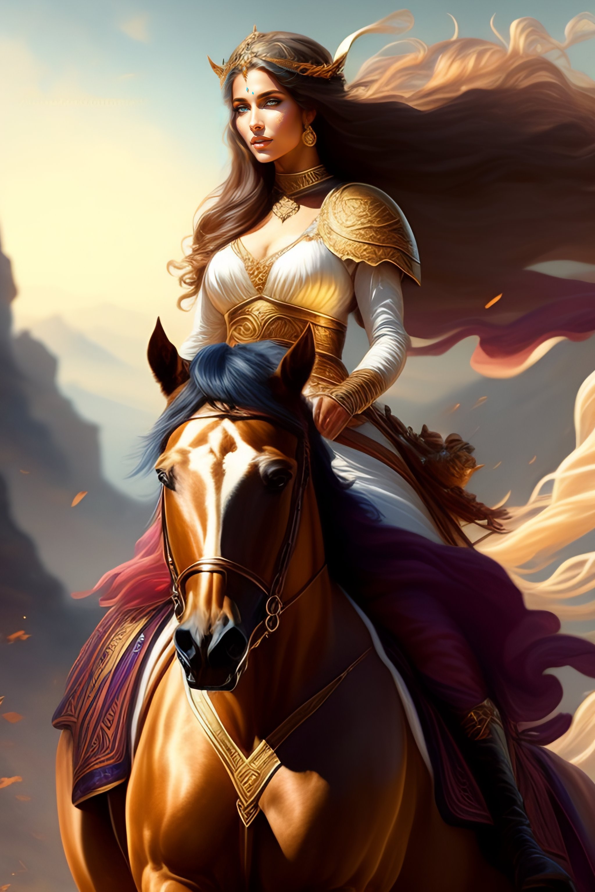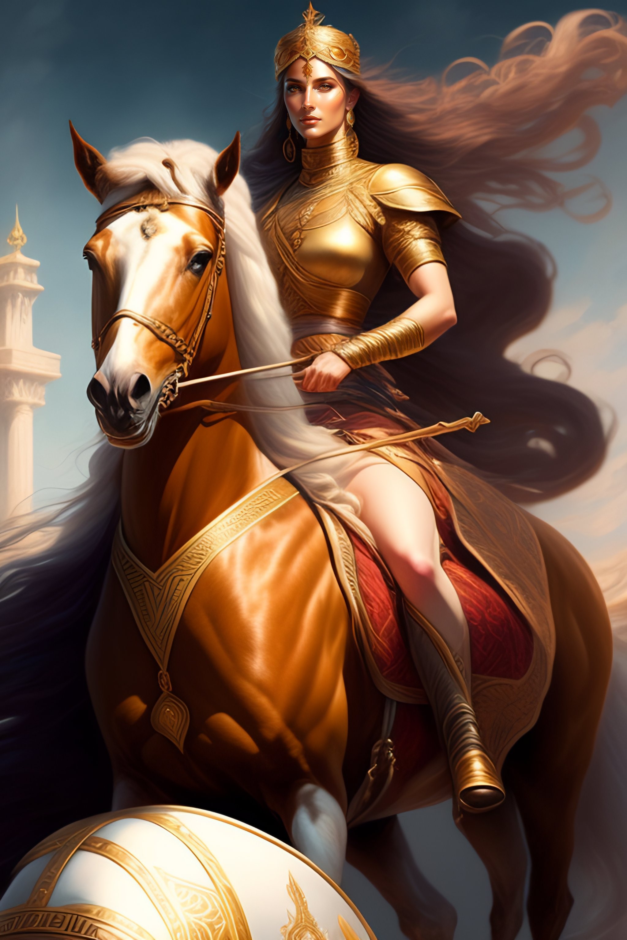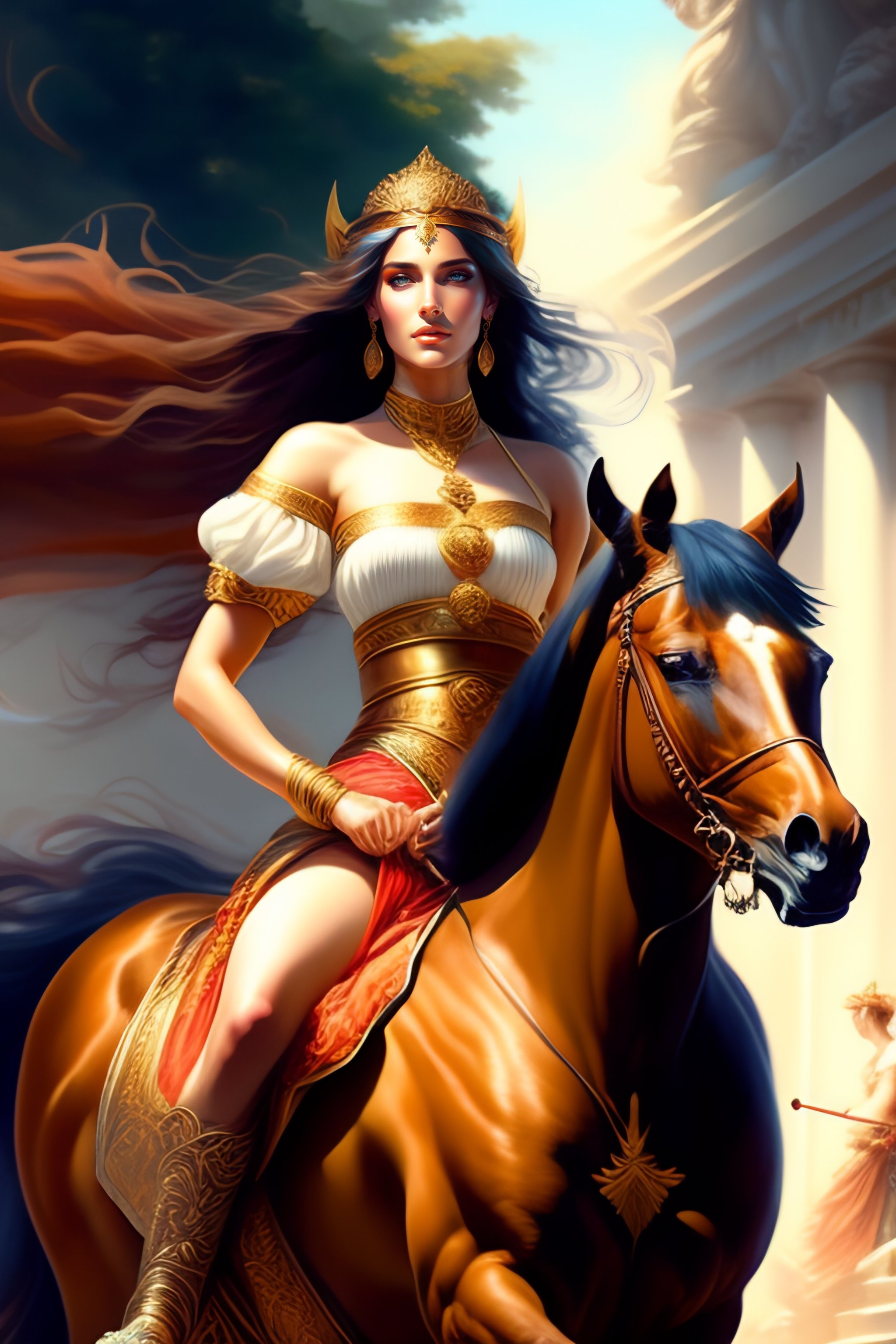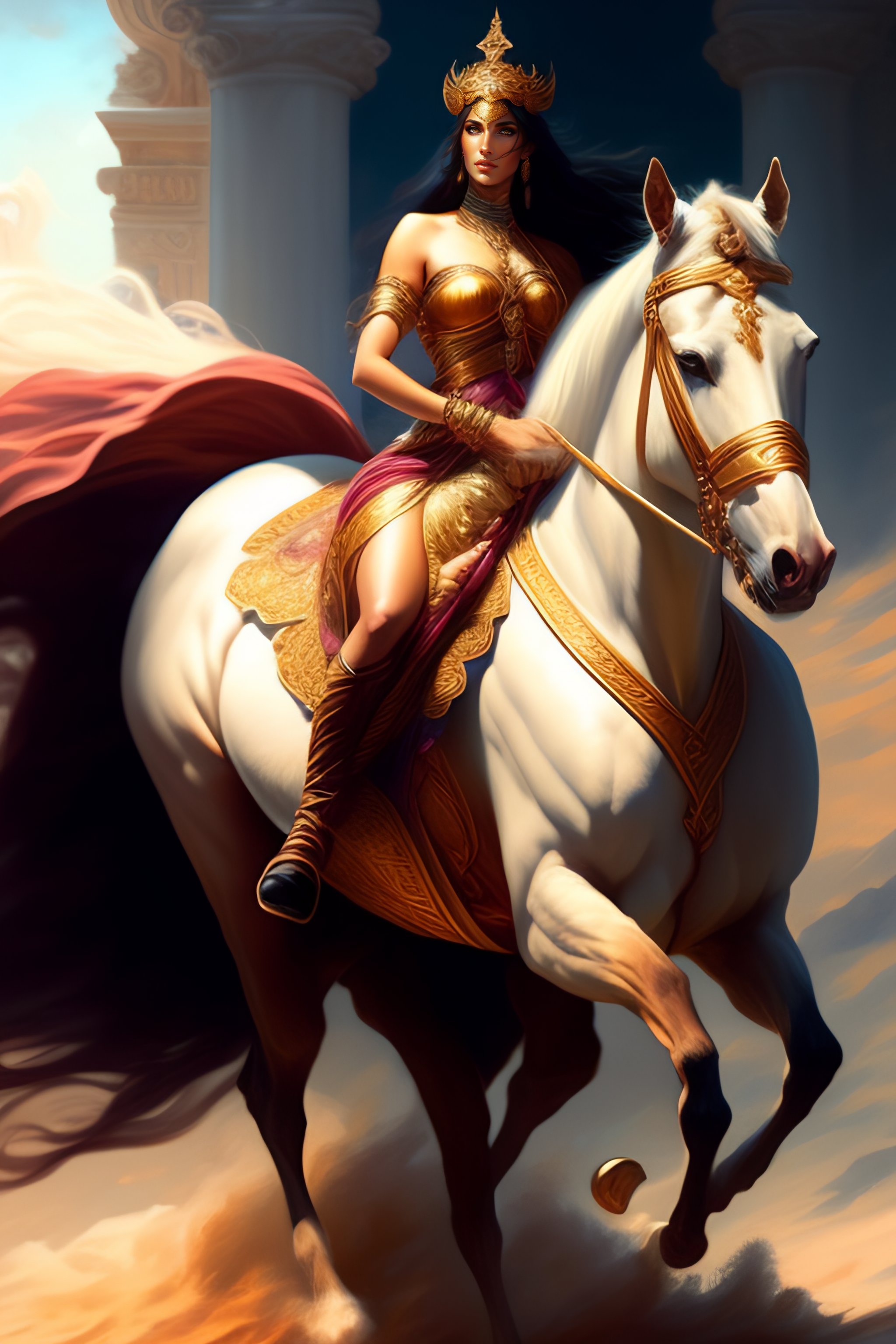 Image of greek goddess riding horse, d & d, beautiful, renaissance, fantasy, intricate, elegant, hindu, highly detailed, digital painting, artstation, concept art, smooth, sharp focus, illustration, art by artgerm and greg rutkowski and alphonse mucha