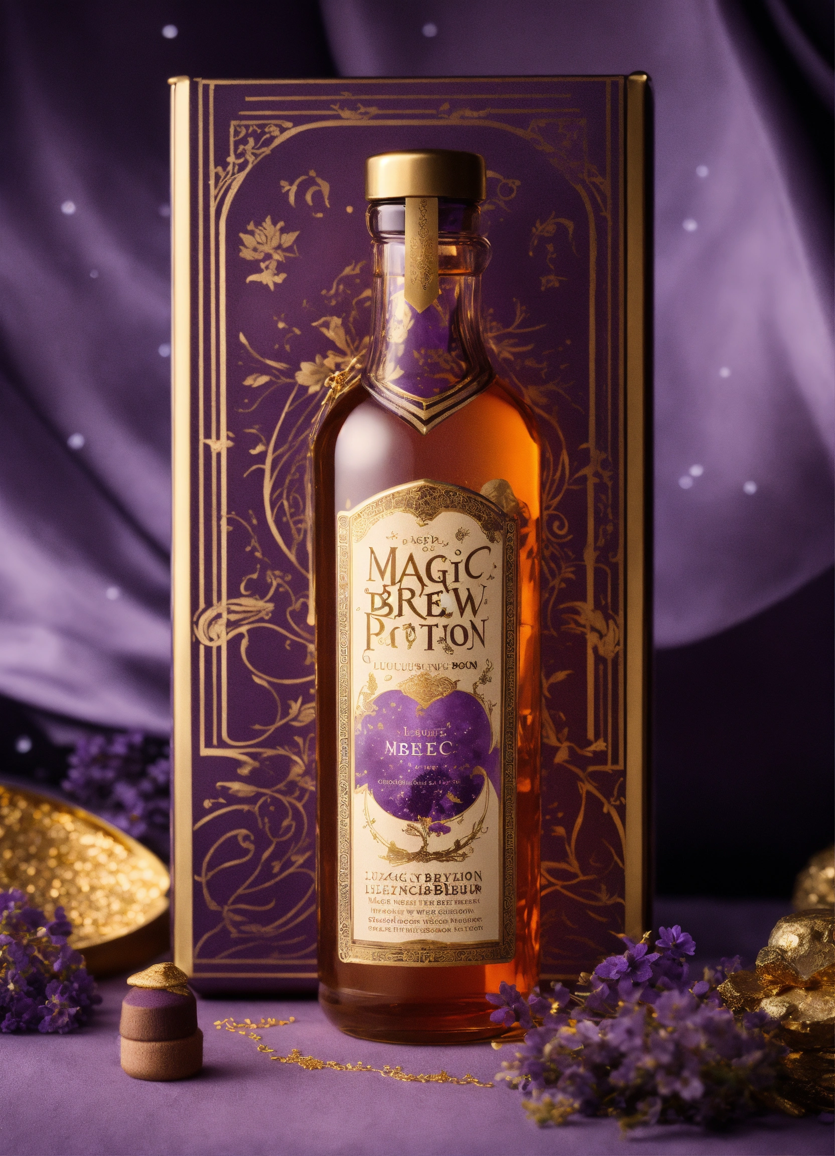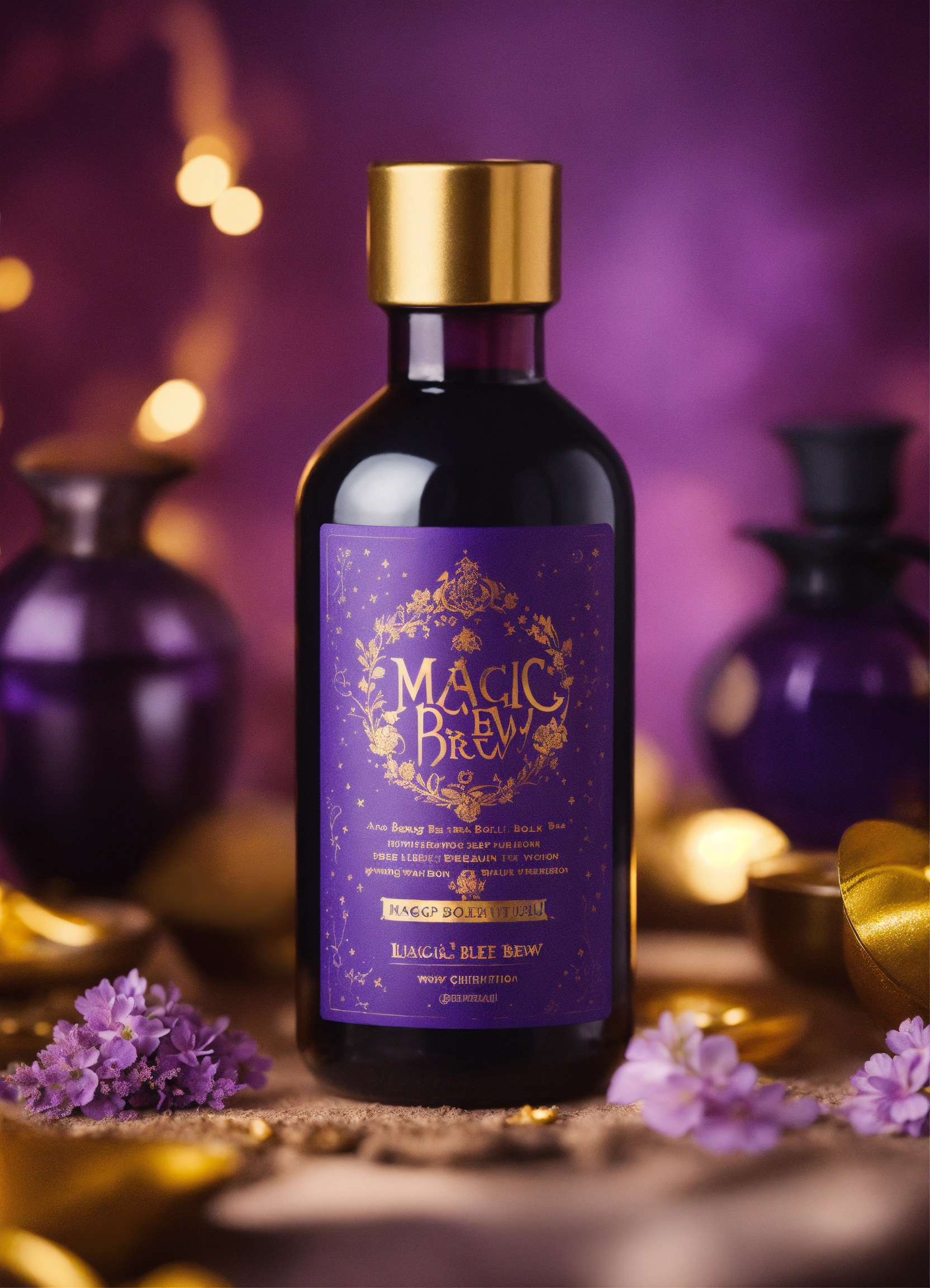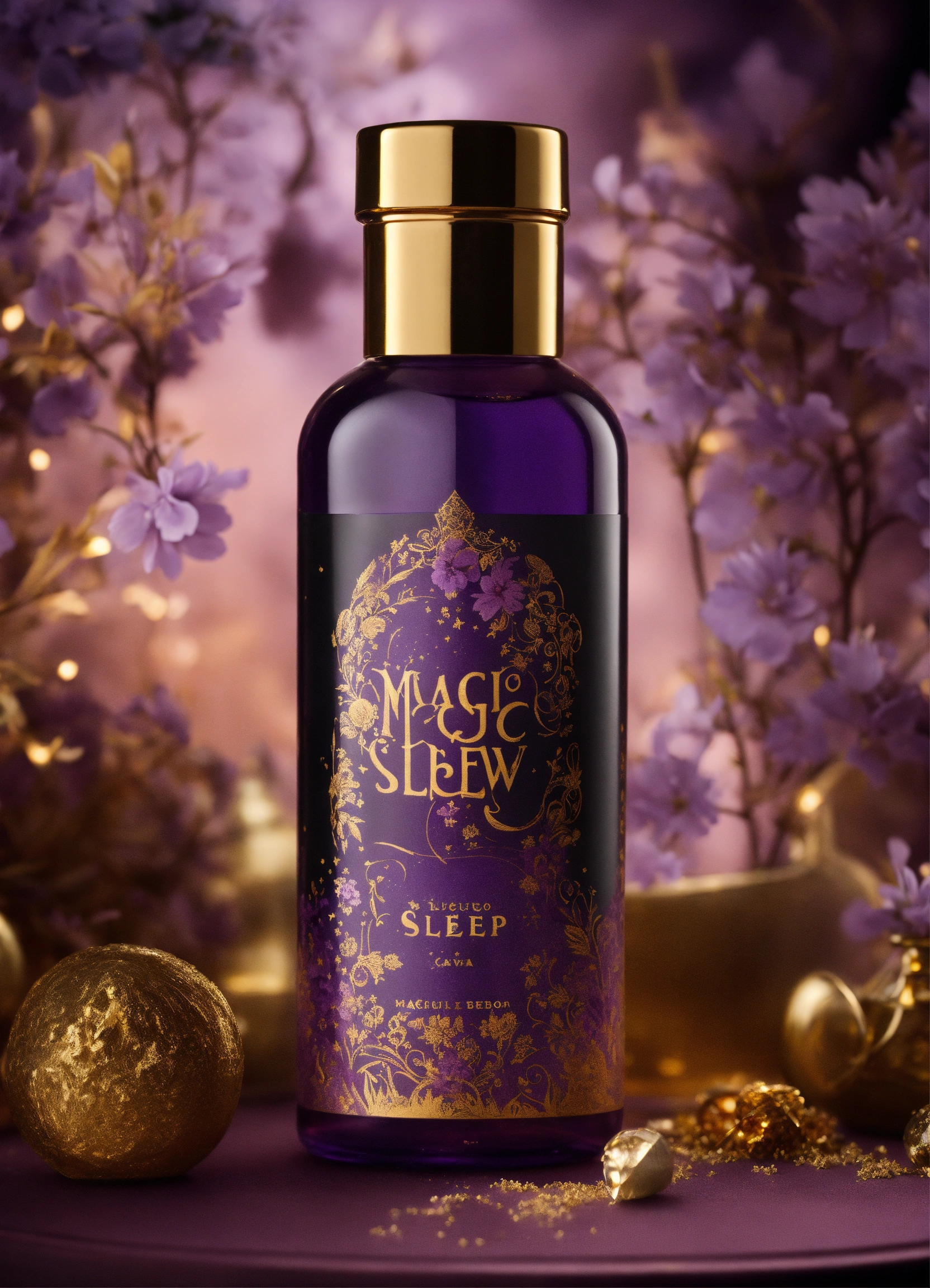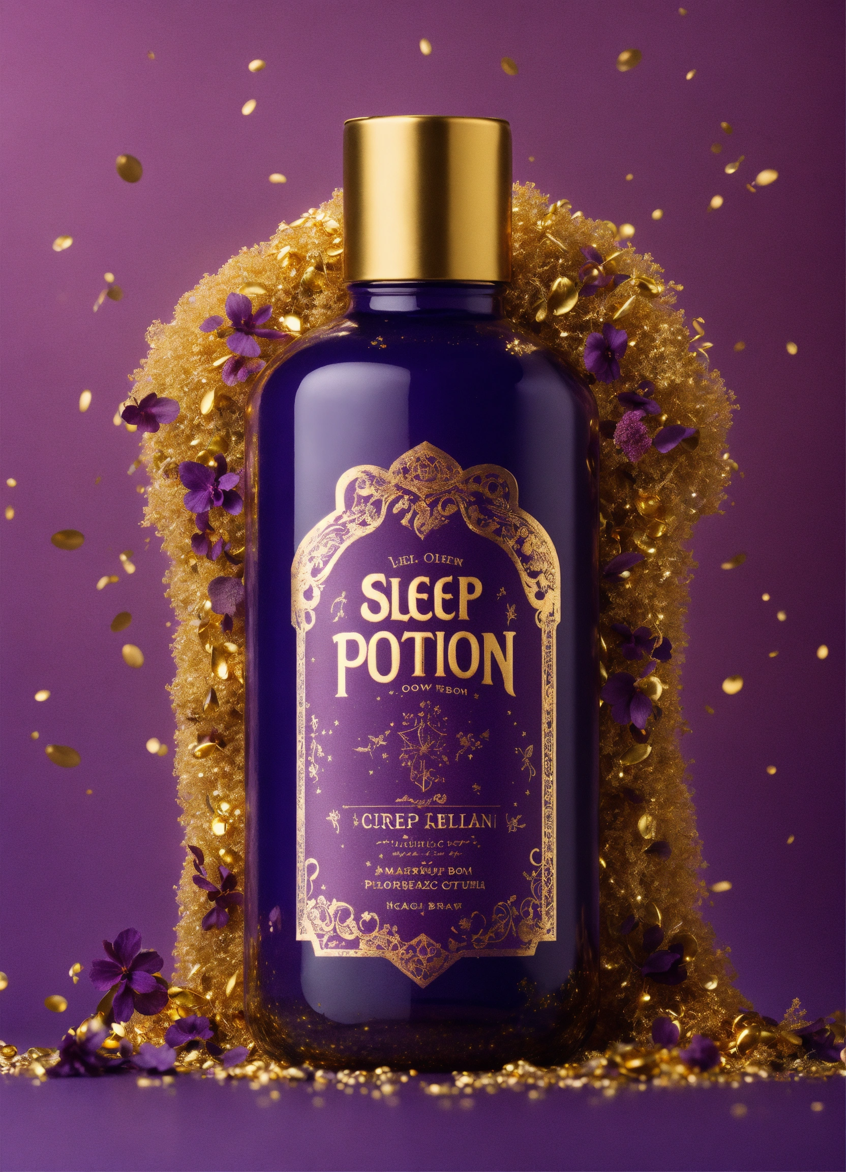 Luxurious "magic brew" sleep potion packaging with deep purples and gold, highlighting its natural ingredients using a transparent fairy-tale bottle, bold whimsical typography, and eco-friendly features targeting adults seeking enchantment and relaxation.