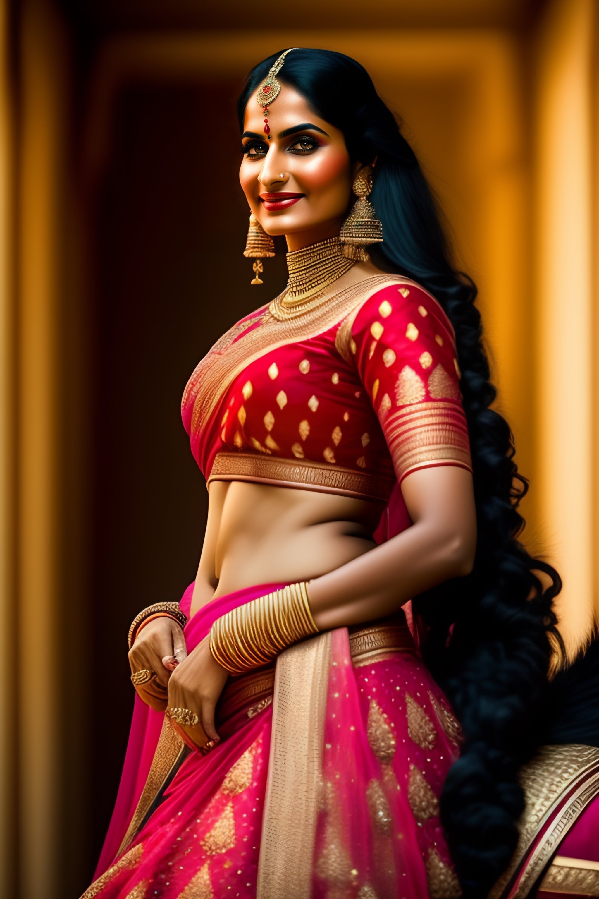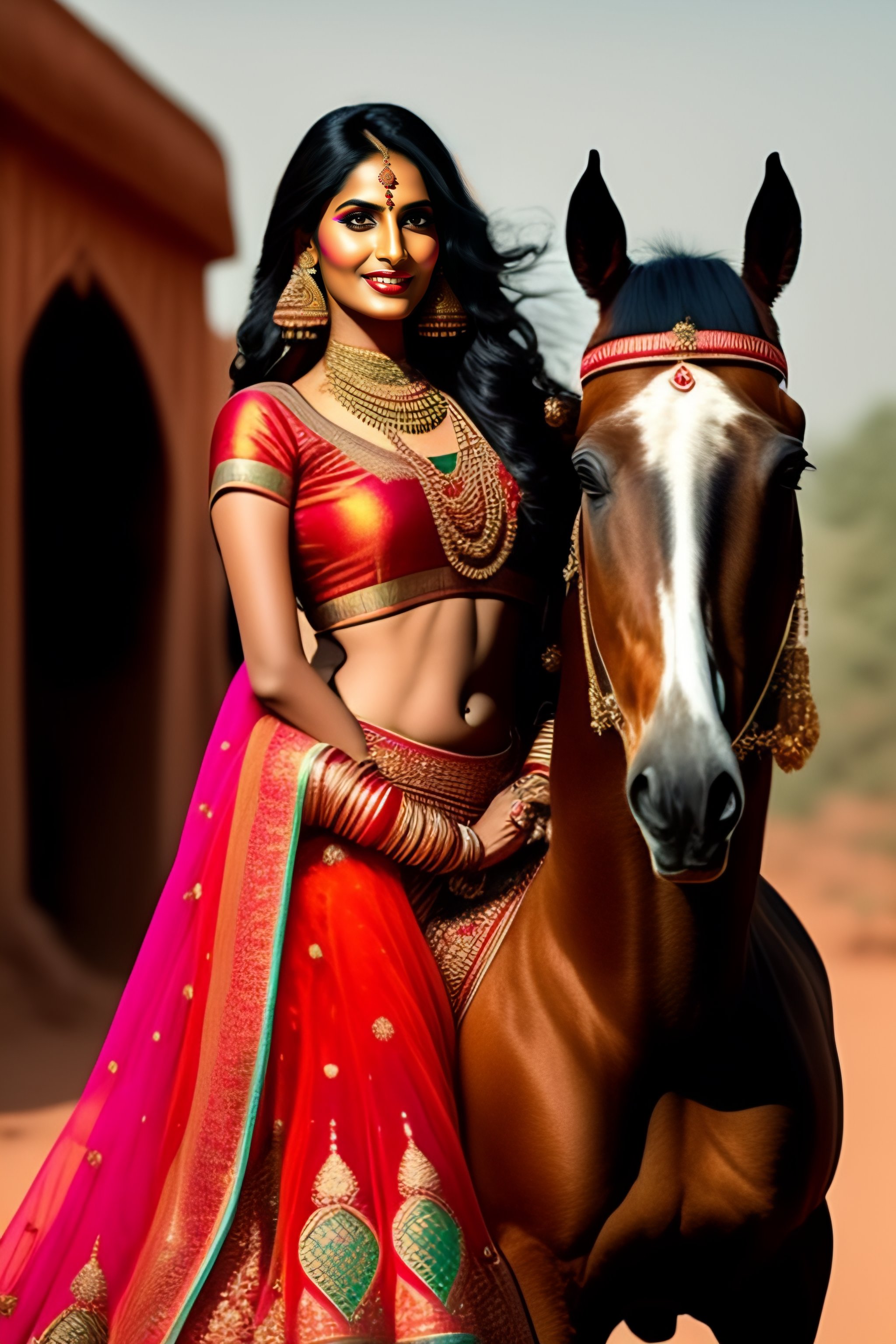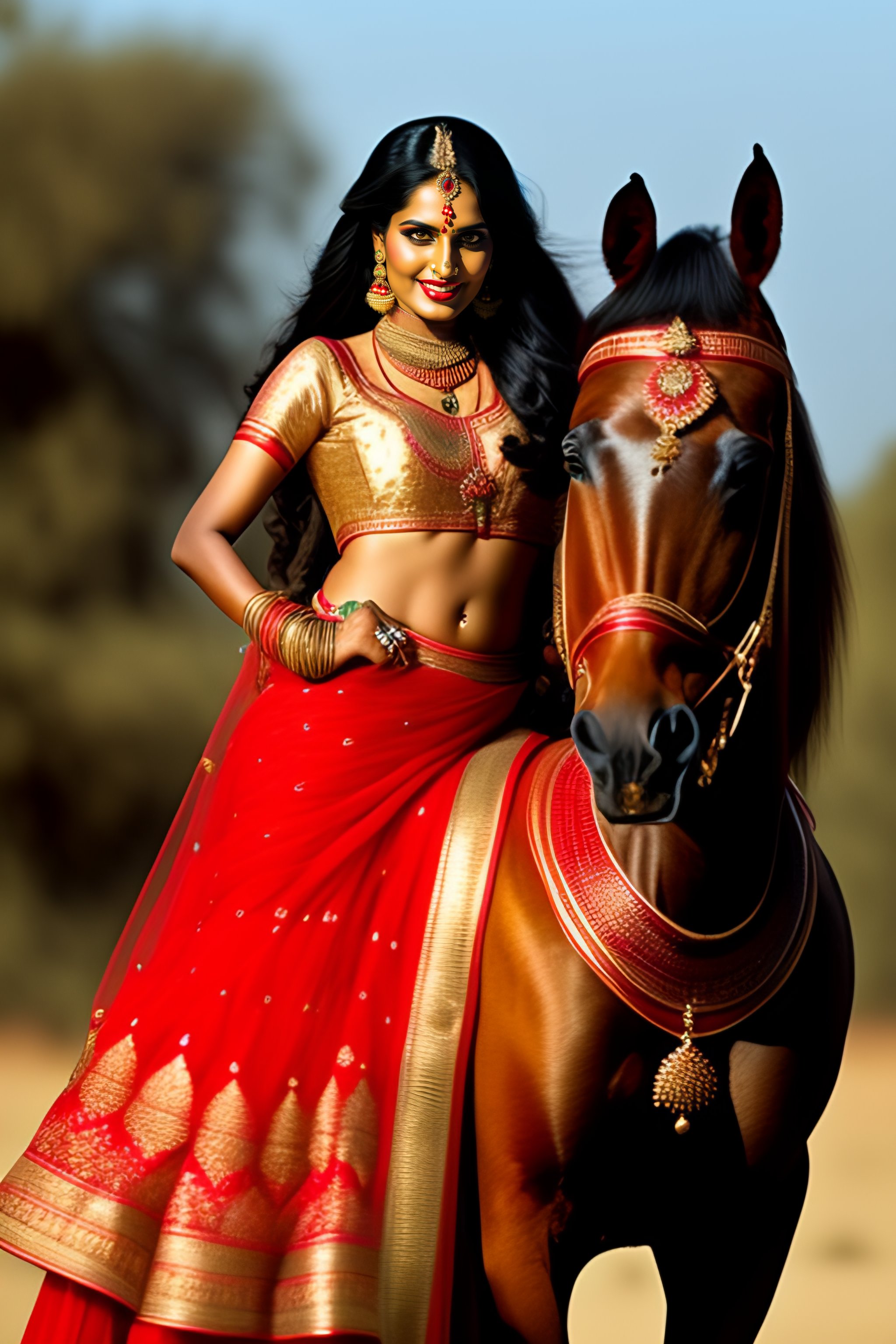 Indian punjabi female wearing lehenga posing with a gun riding a horse