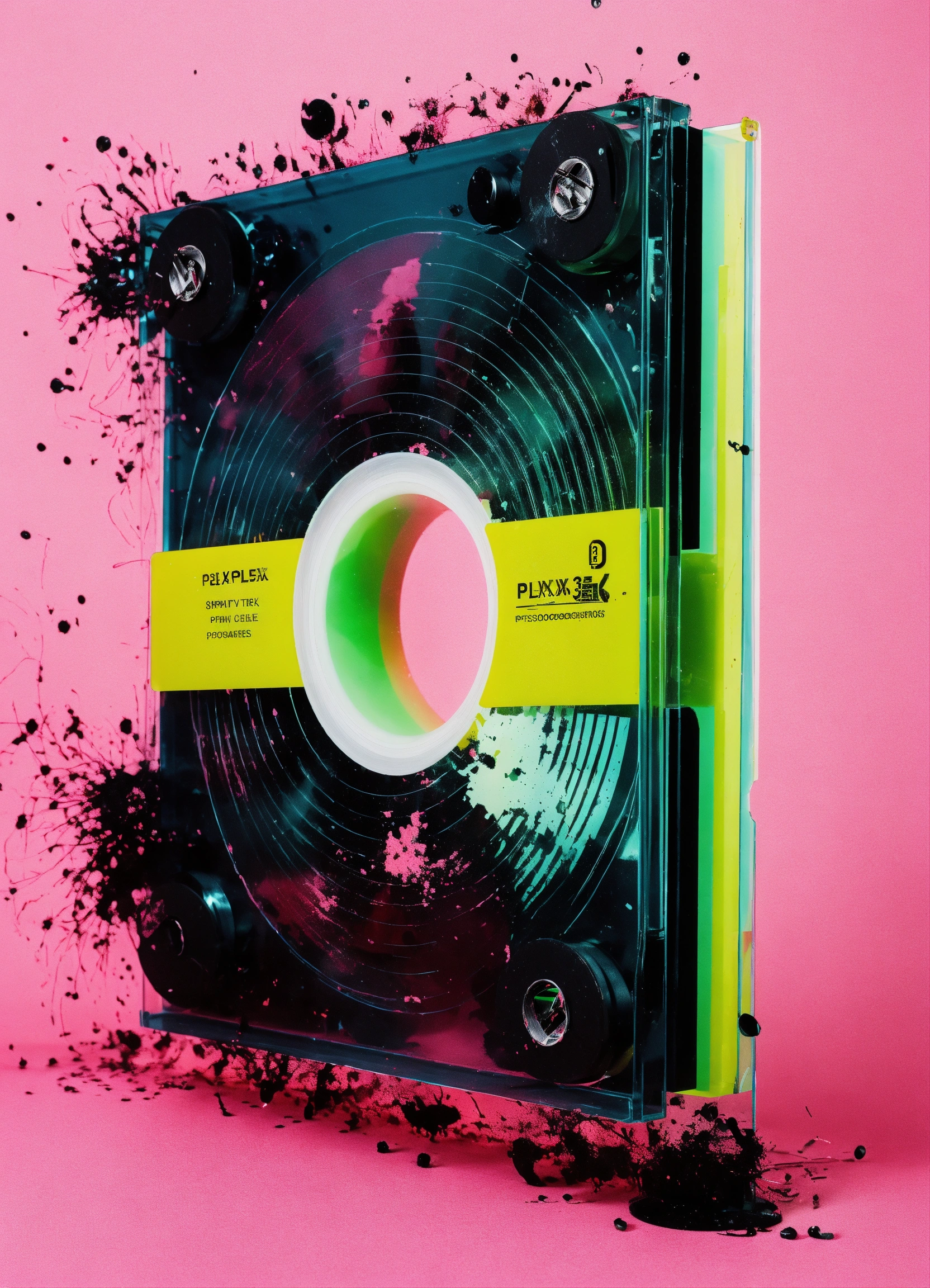 Pastel color shot photography of a 3d plexiglass audio tape, emerges from spiral black ink splatters, 80 degree view