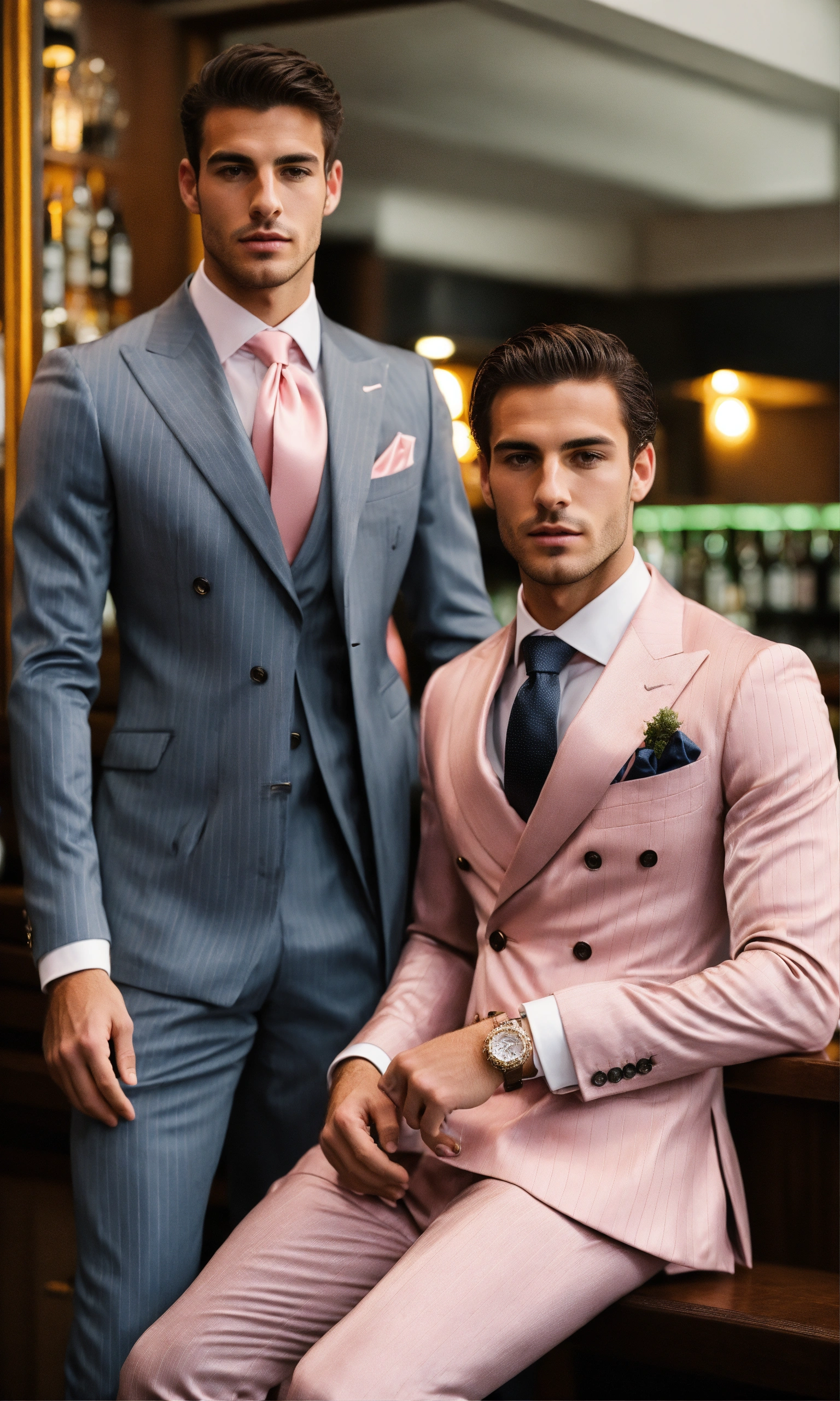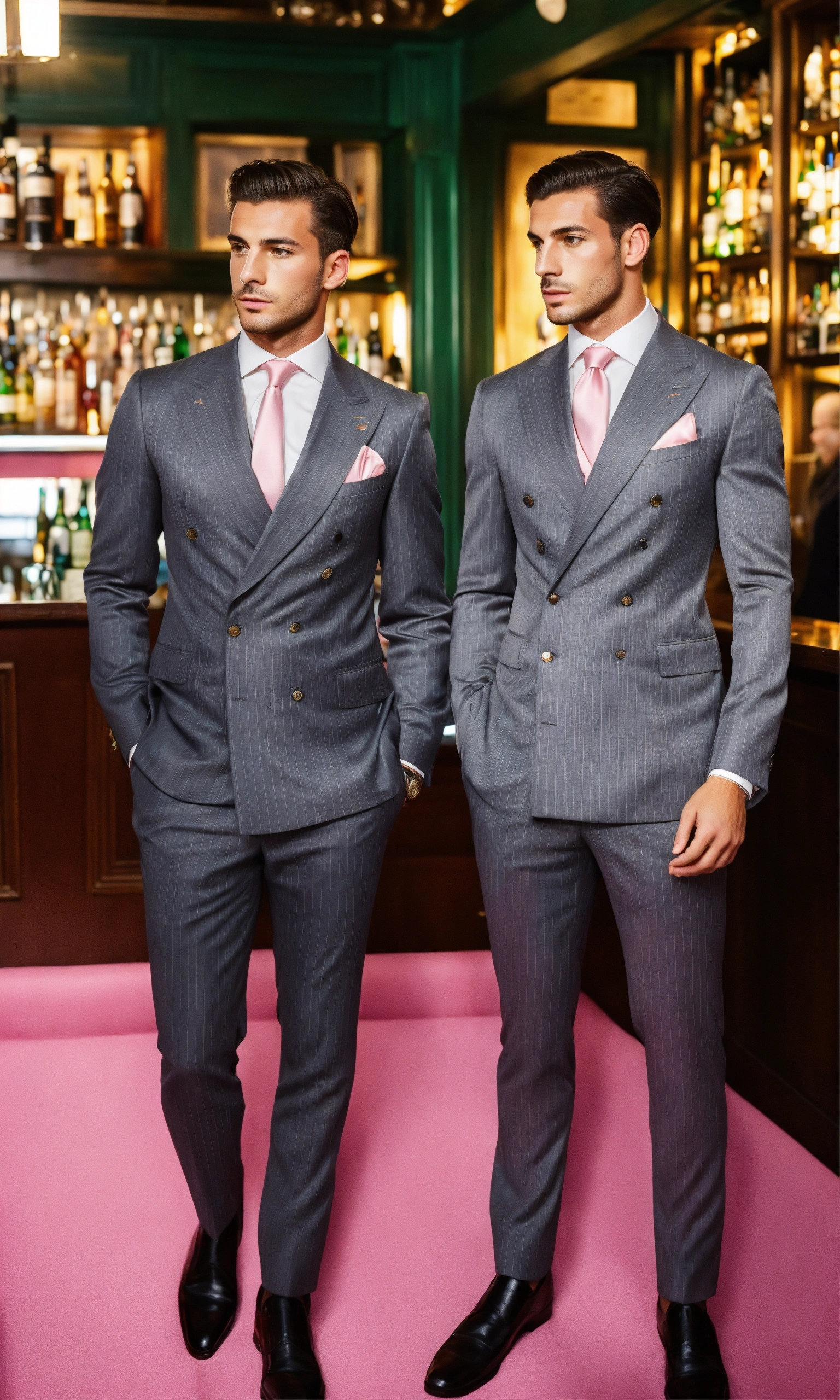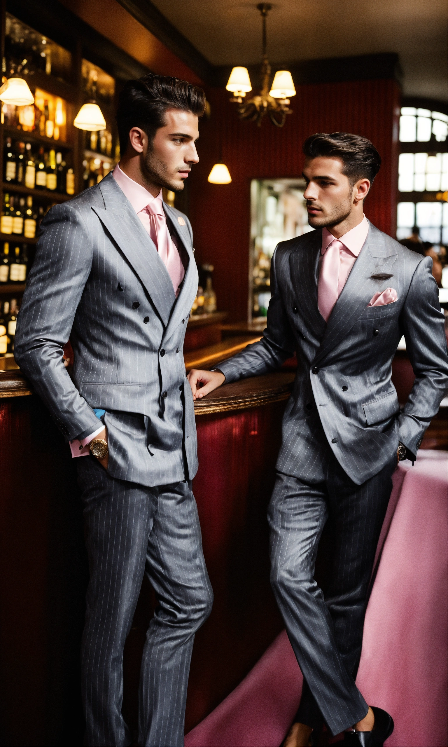 Two young italian male sportsmen in silk satin grey pinstripe double breasted suit, pale pink tie, meeting in a bar