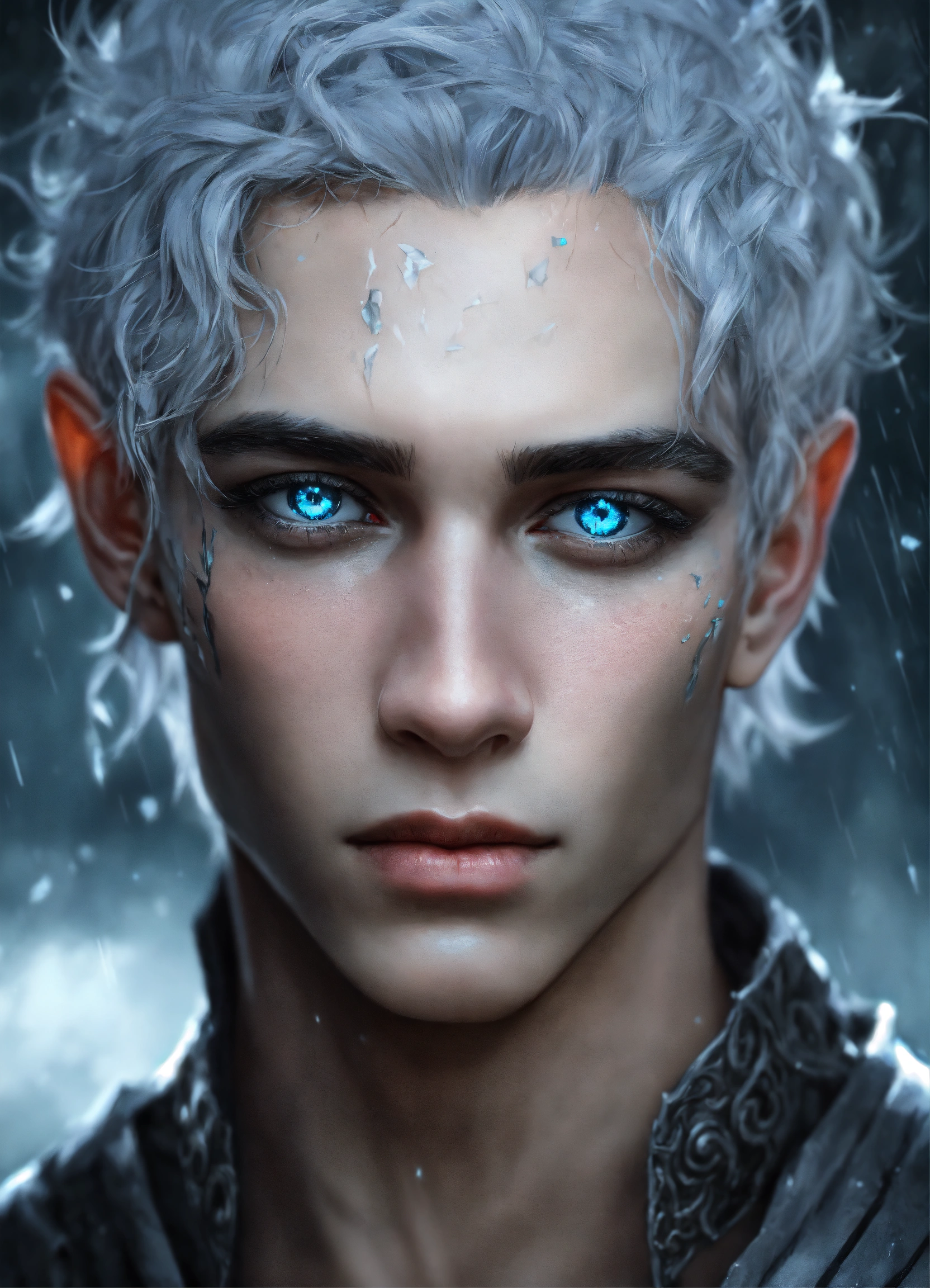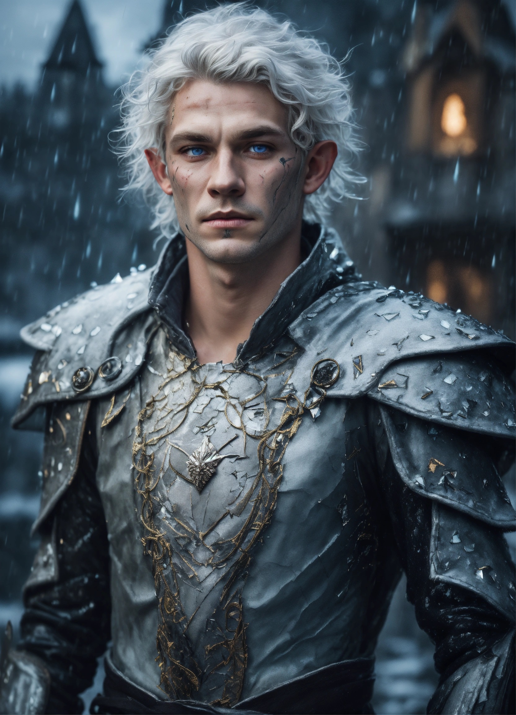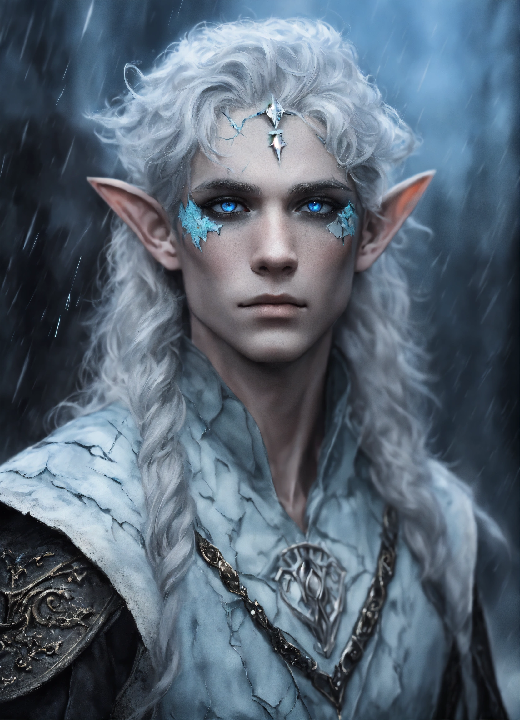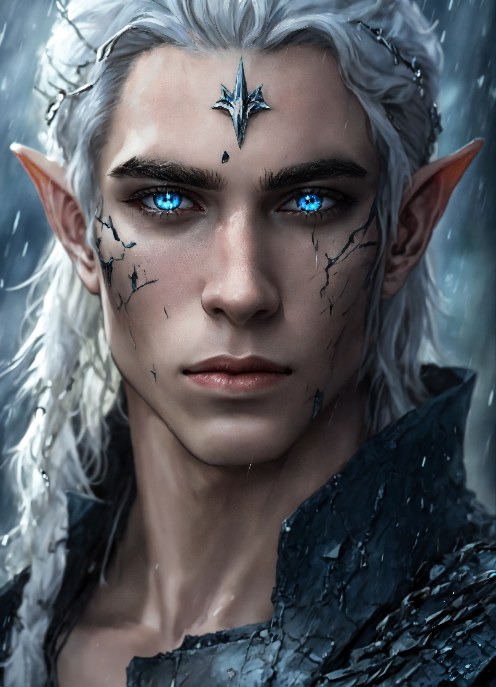 Fantasy portrait of a ash-grey skinned elf, masculine, androgynous, large black facial scars, shattered skin, pale blue eyes, sharp features, sad expression, soft smile, glowing white curly hair, rainy castle background, ultra detailed