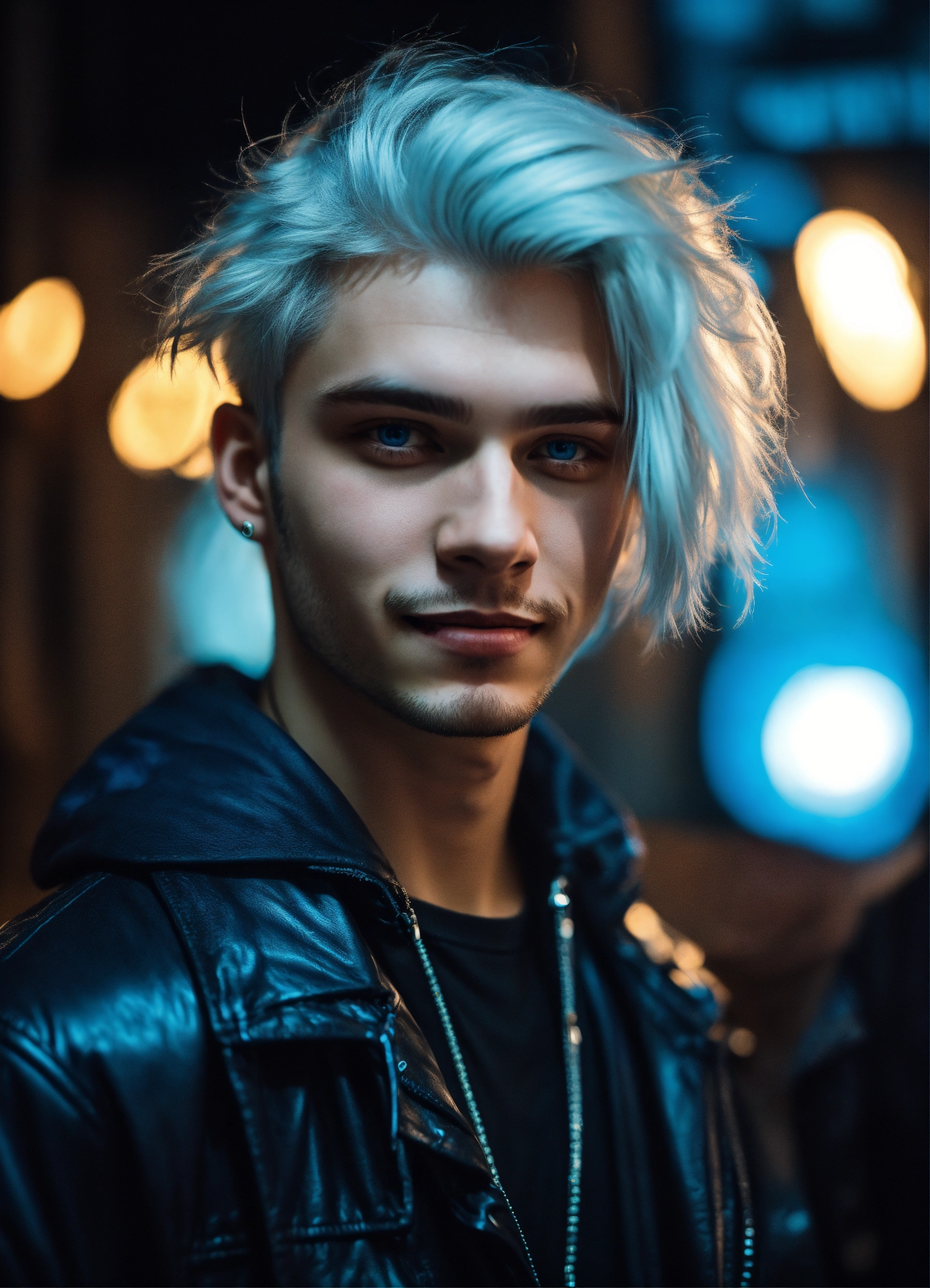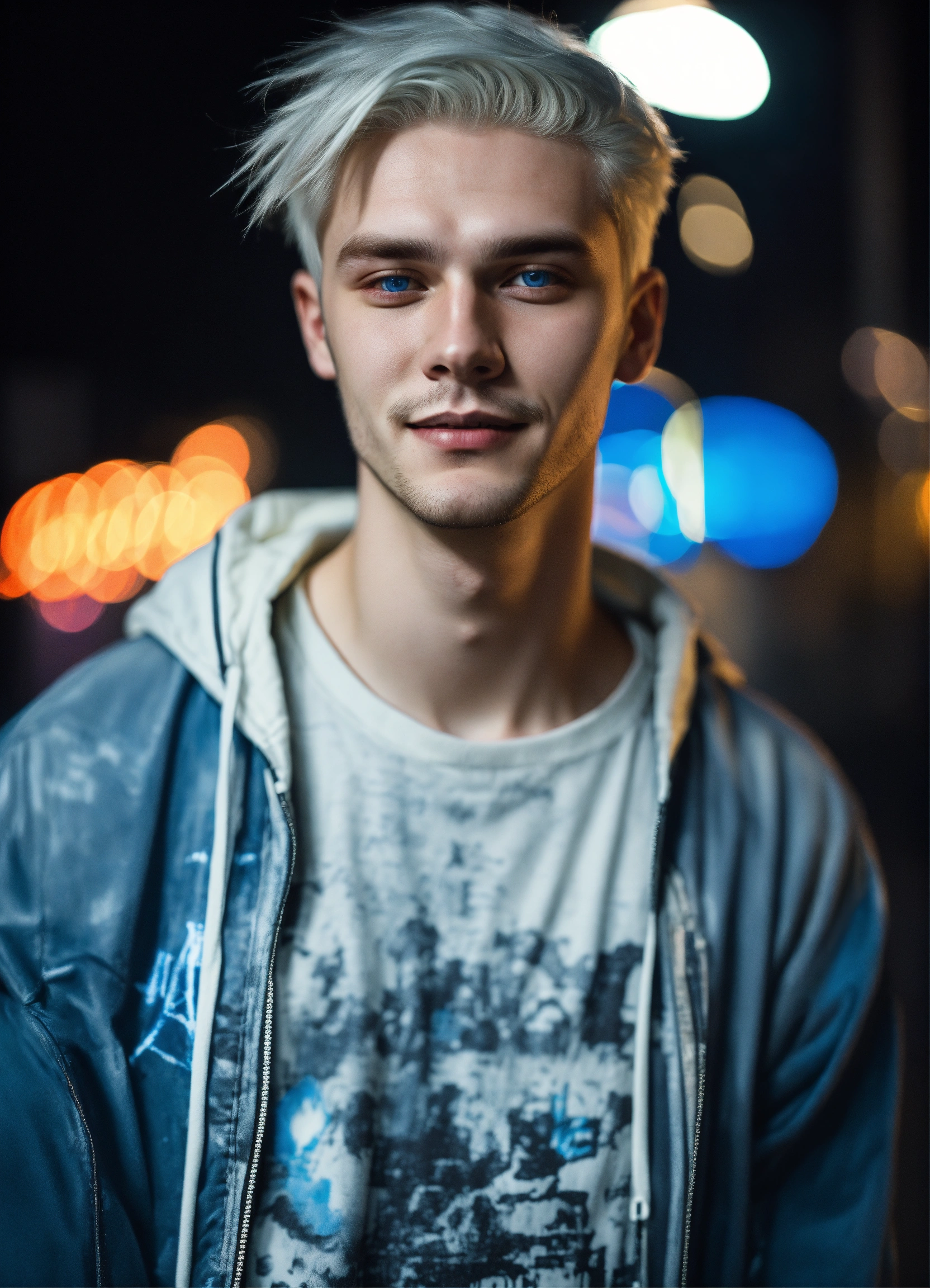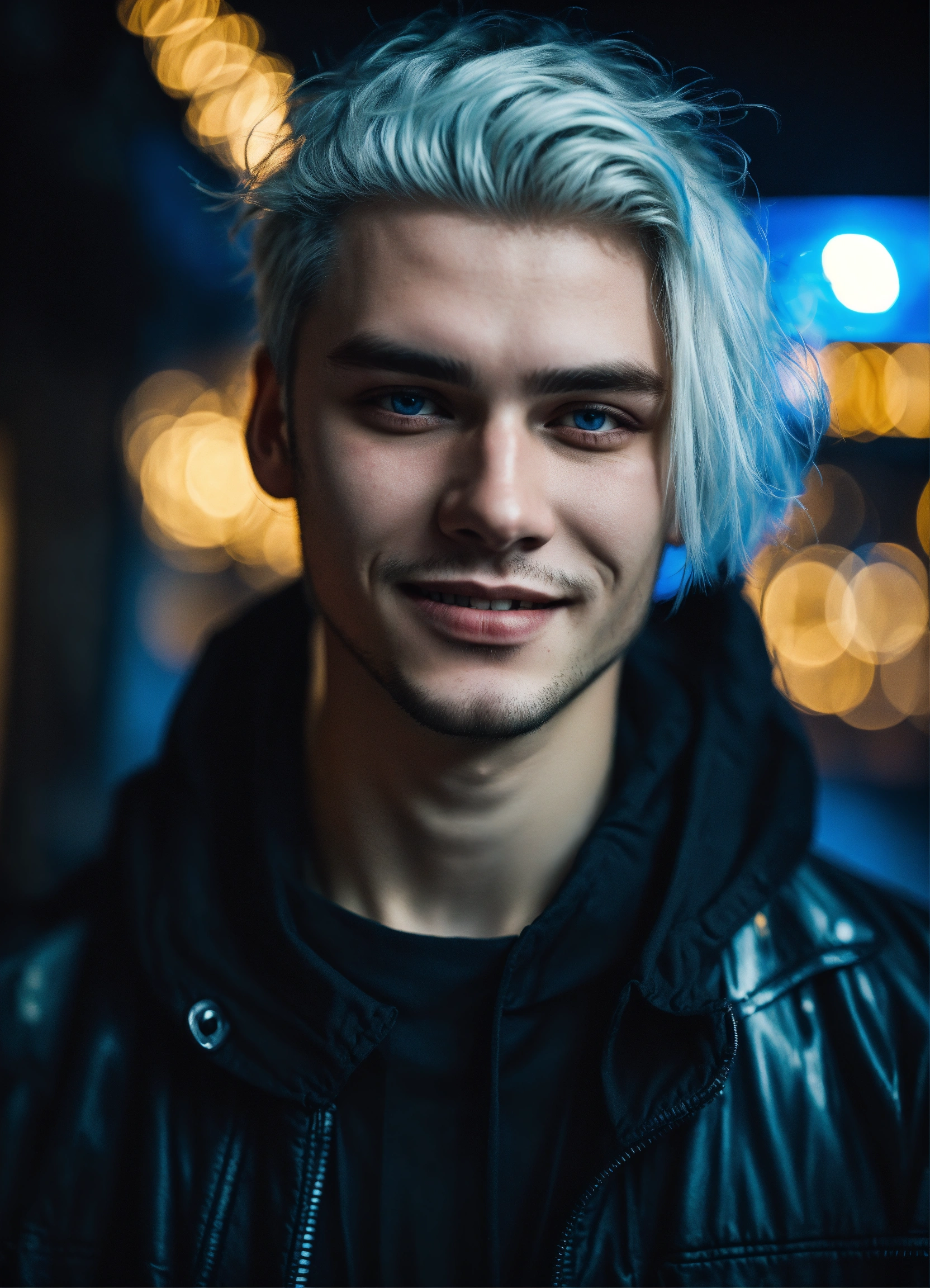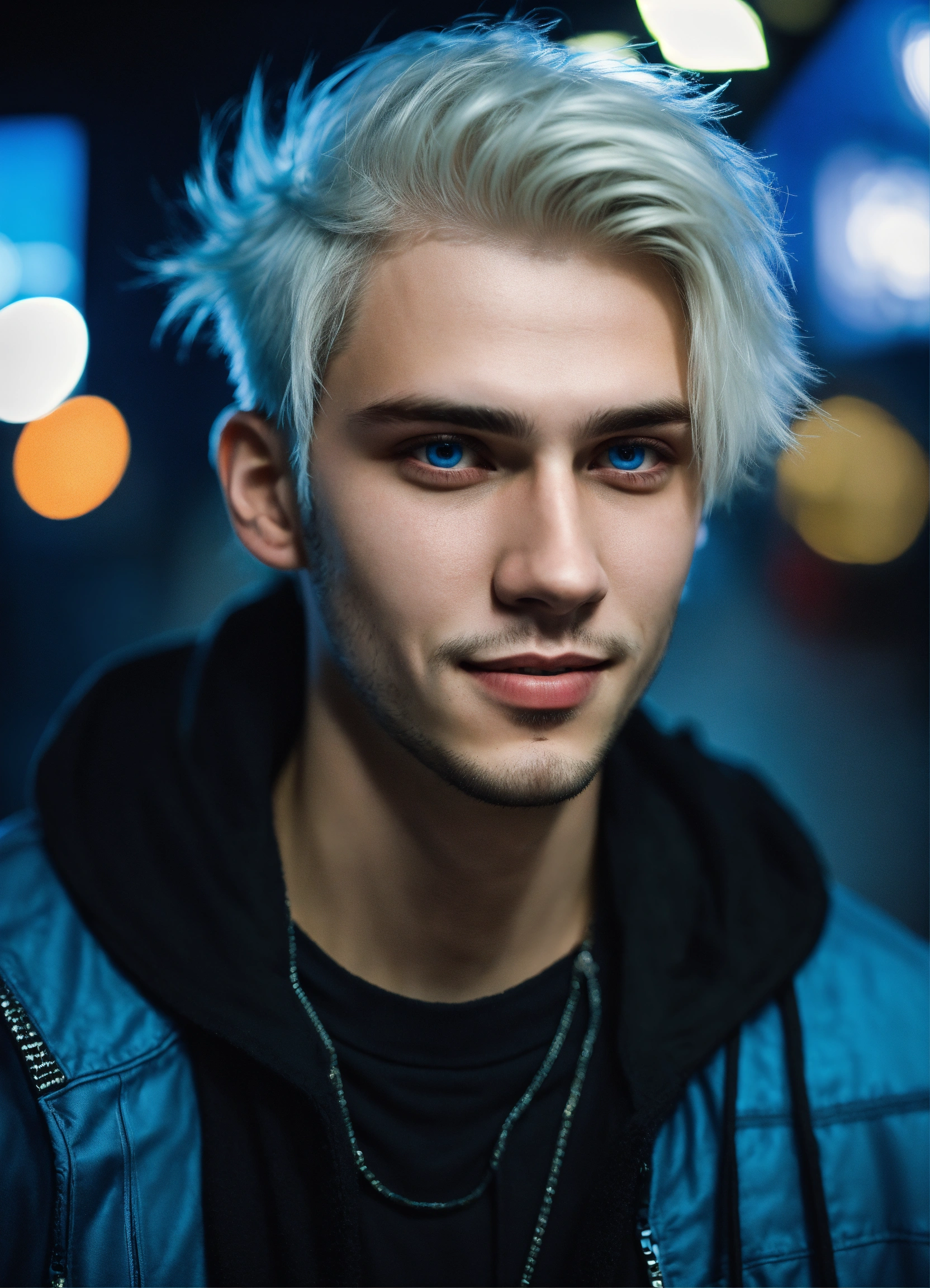 Highly detailed night time portrait of young russian man 27 years old, smile, white hair, blue eyes, in black and blue streetstyle, black, grunge aesthetic!!! cyberpunk background