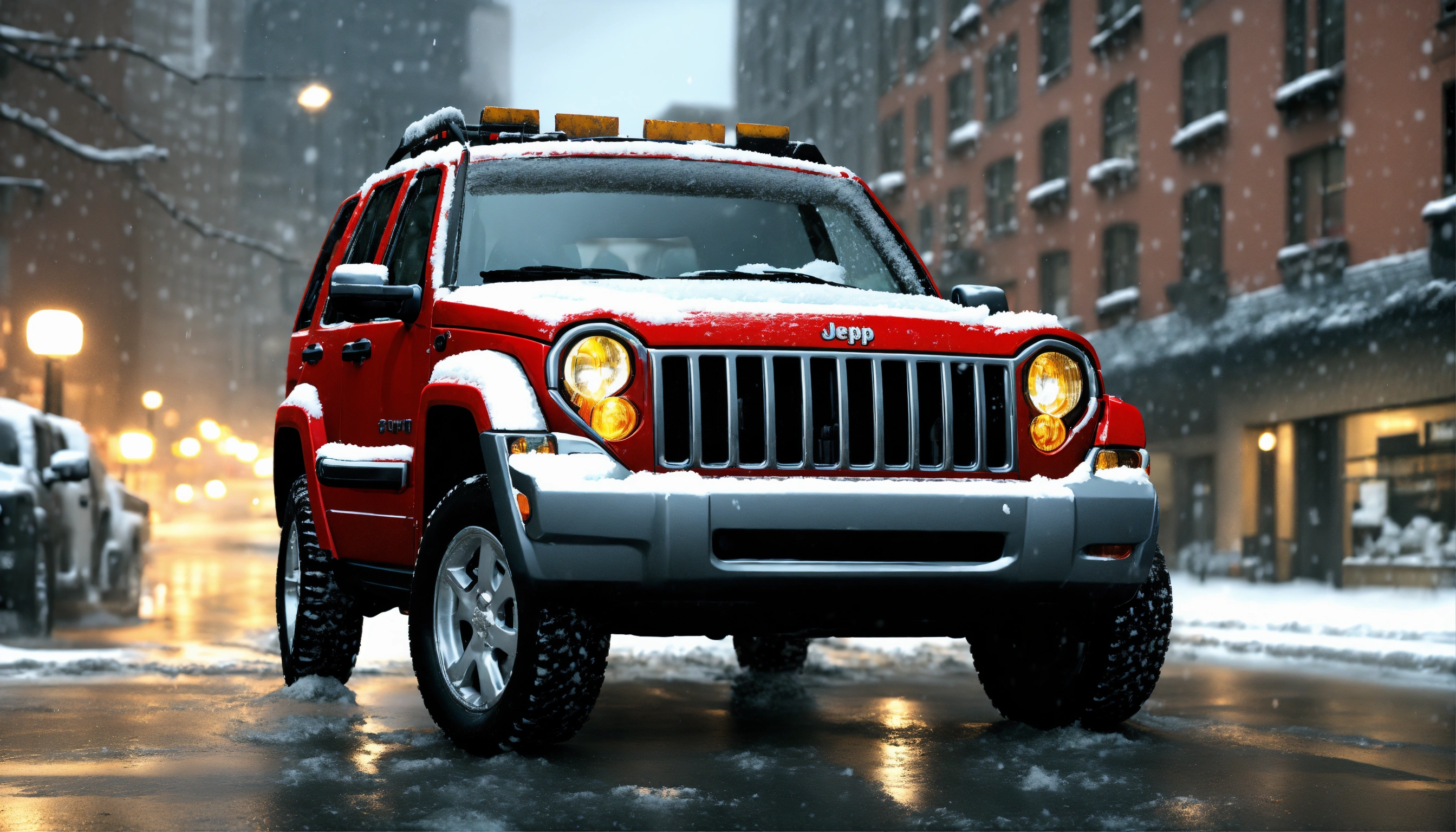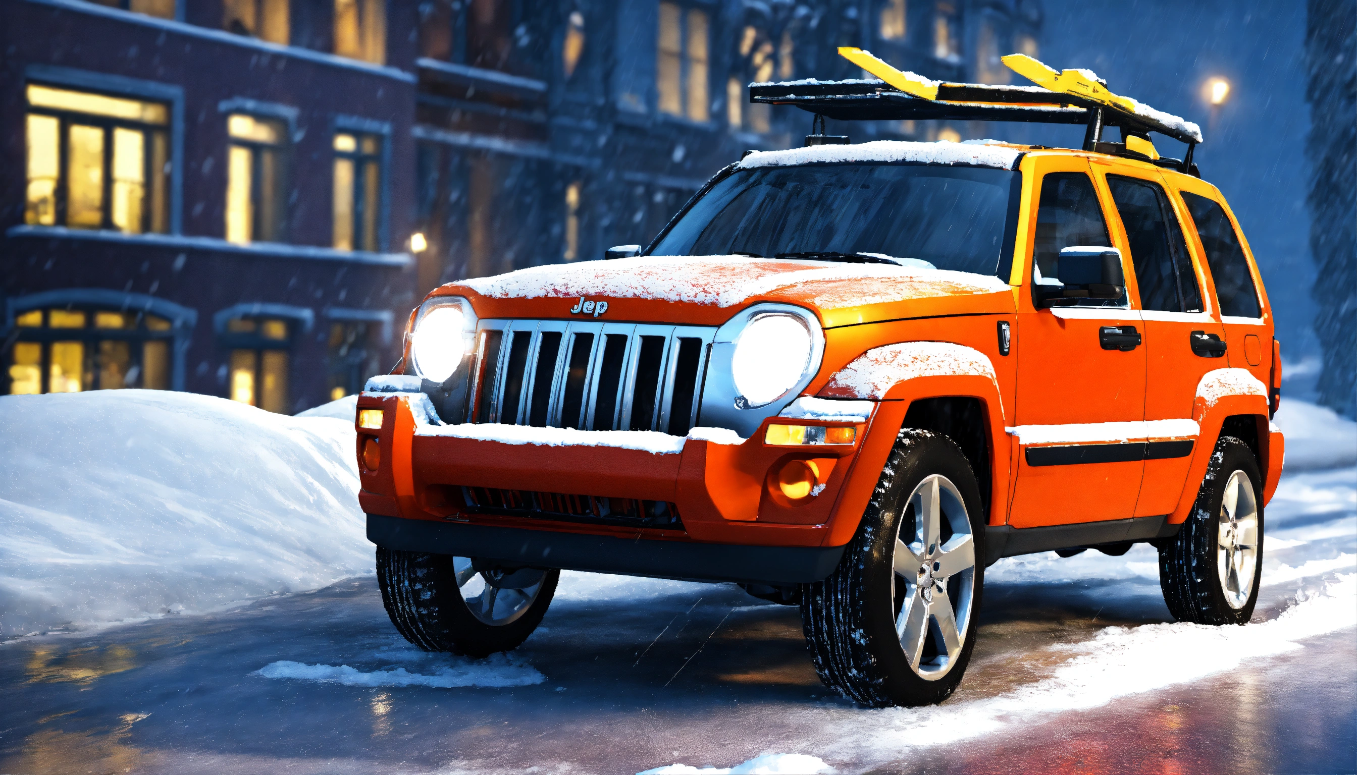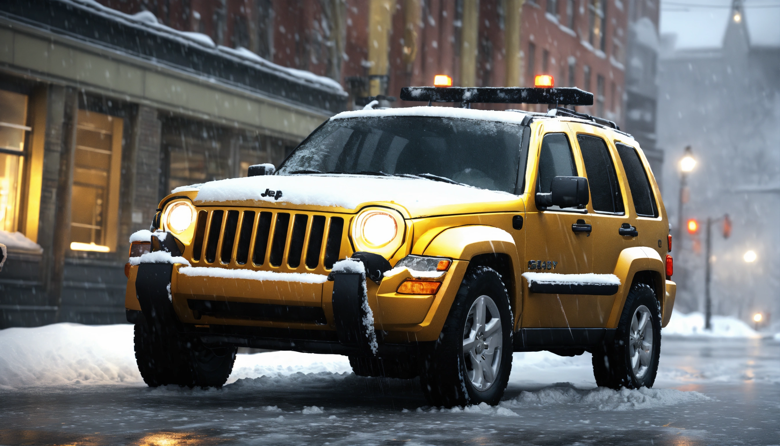 Jeep liberty 2006 with snow plow mounted in front on it, in city, snow, storm, rain, 3d render, cinematic