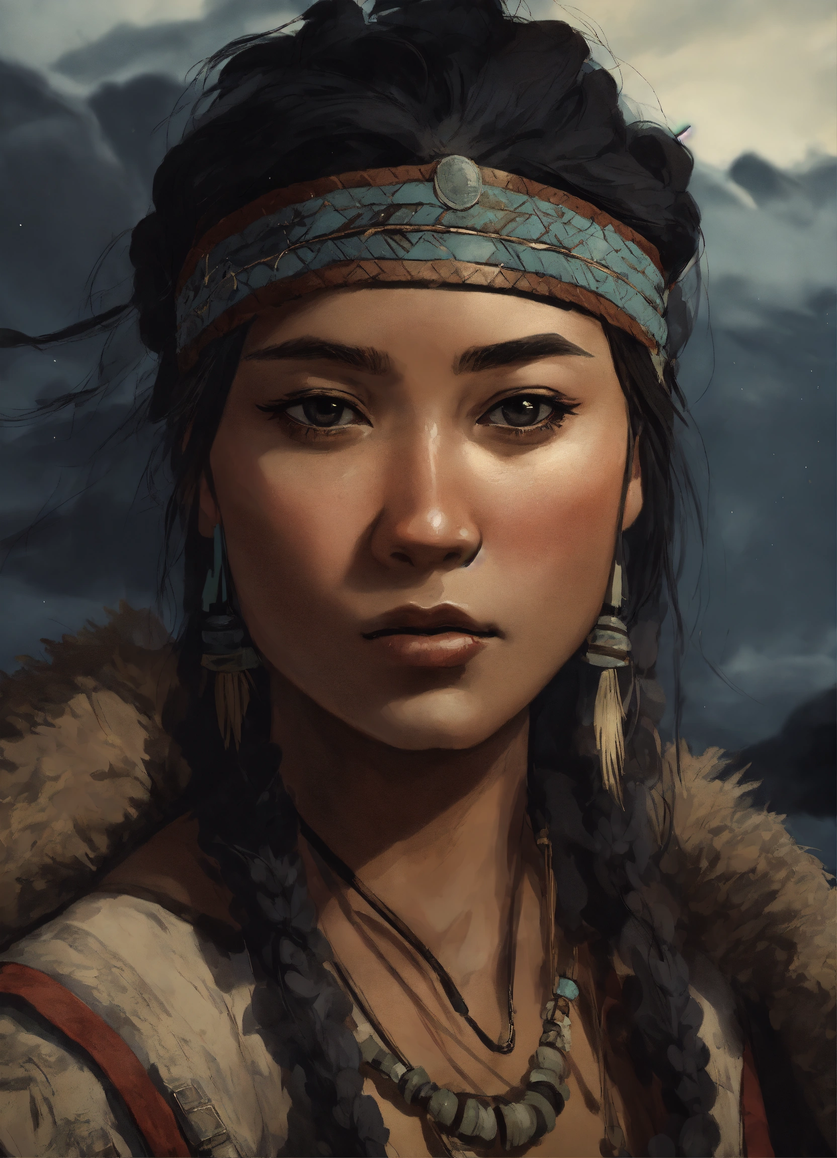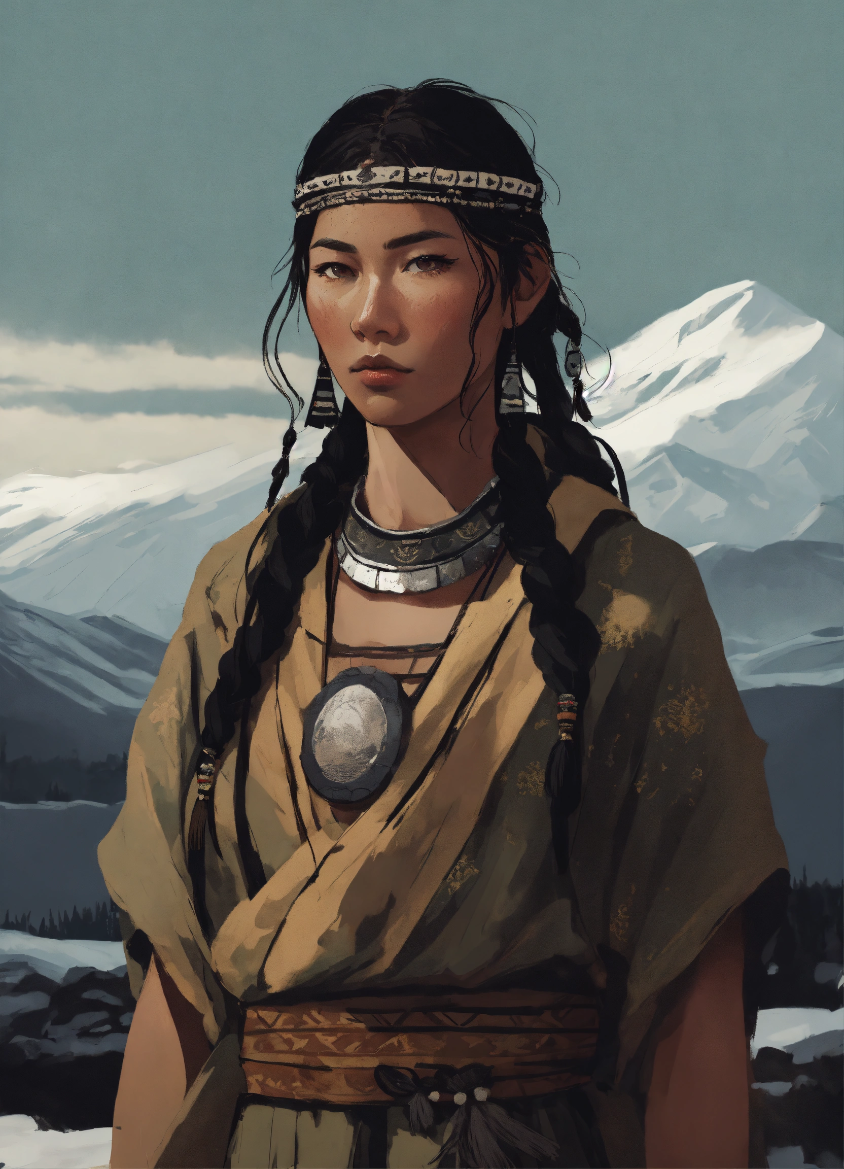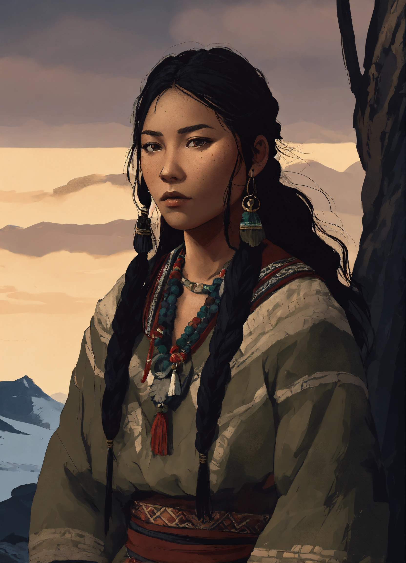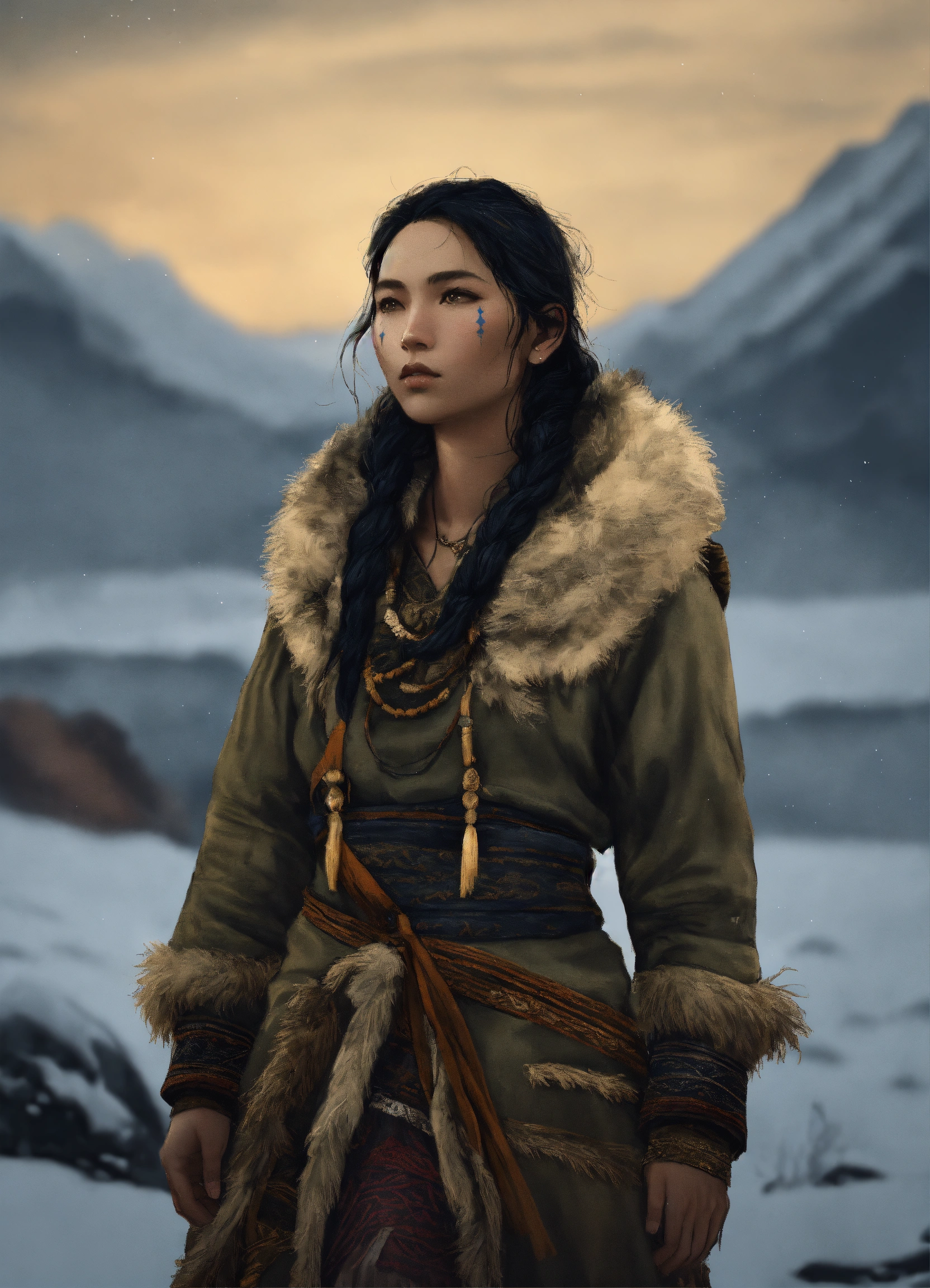 Illustration of a young chukchi woman in the style of tom björklund. olive skin, black hair, asian facial features, siberian indigenous clothing, prehistoric clothing, indigenous adornments, full body. gloomy and depressing atmosphere. dark muted color palette, composition balance, outlined silhouettes, shadows, highlights, intricate details, dark fantasy, narrative-rich illustration, visual compellingness in the style of tom björklund. inspired by senua's hellblade and horizon zero dawn.