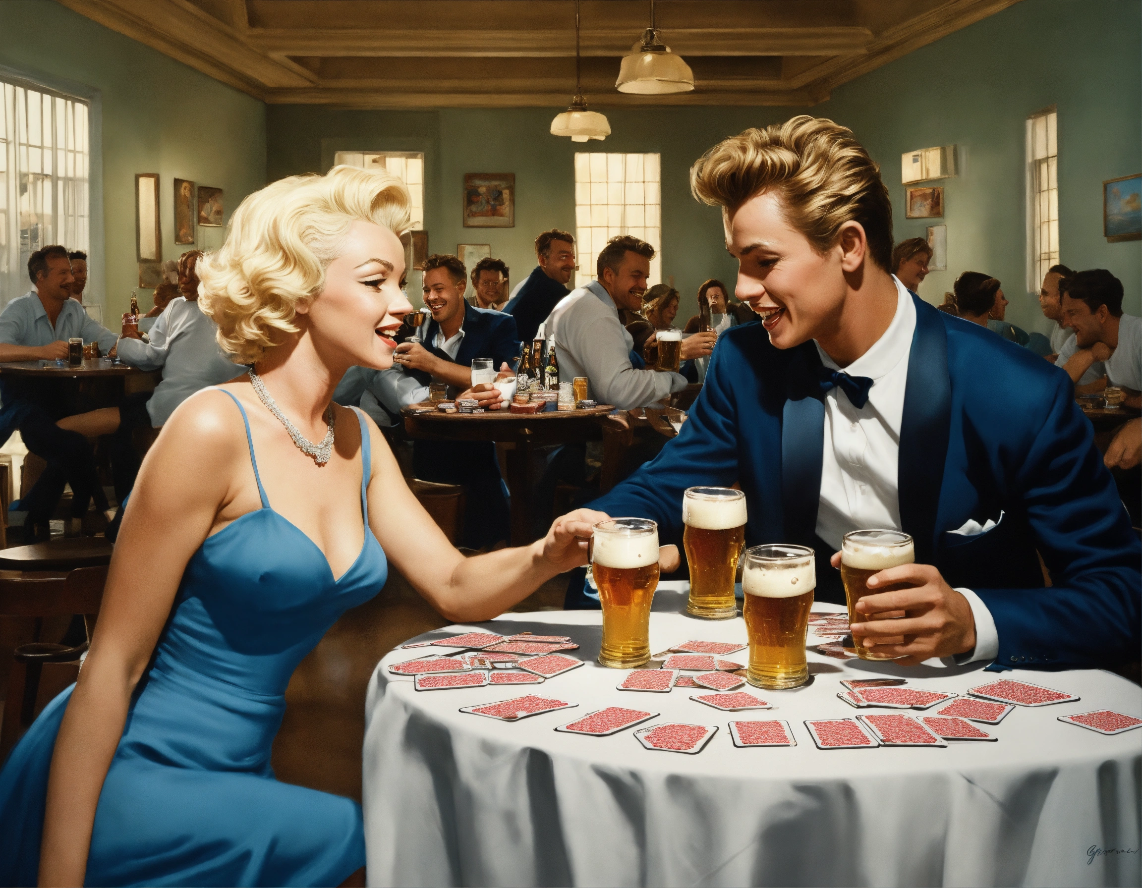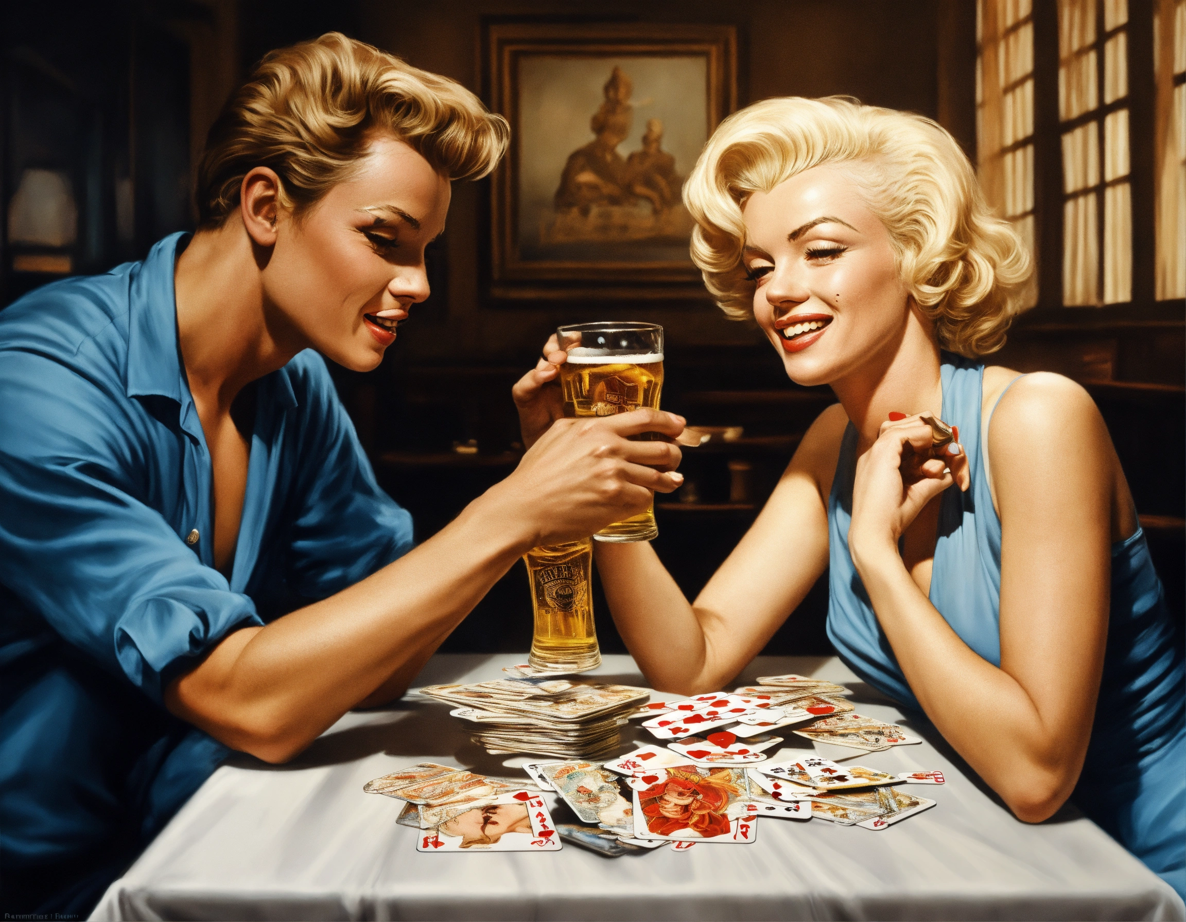 Wide angle view, full color only one marilyn monroe wearing a blue gown and only one james dean wearing a white t-shirt, enhanced hands, detailed anatomically correct hands, symmetrical hands, realistic hands, playing black jack at one uncluttered card free table in an empty white room, laughing, drinking beer, detailed anatomically correct hands, anatomically correct faces, symmetrical hands and arms, realistic hands, wide angle camera shot, art by greg rutowski
