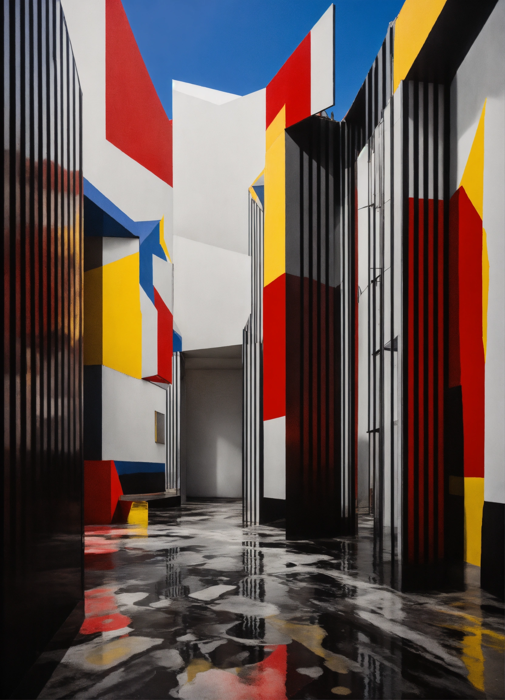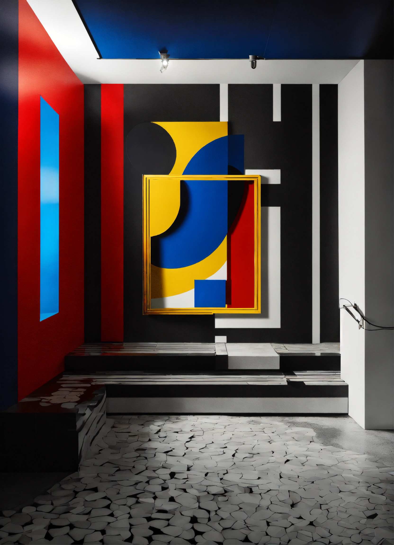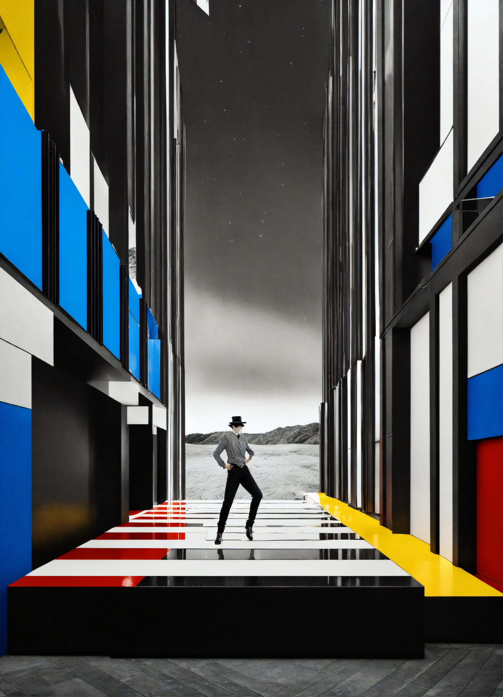 Black and white, primary colors, 3d abstract landscape, original hip-hop dancer photography, immersive-inspired art deco, inside and out landscape, rene magritte inspiration.