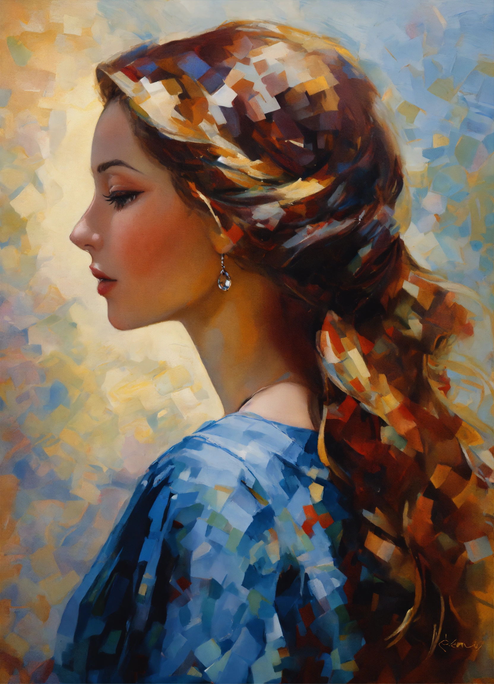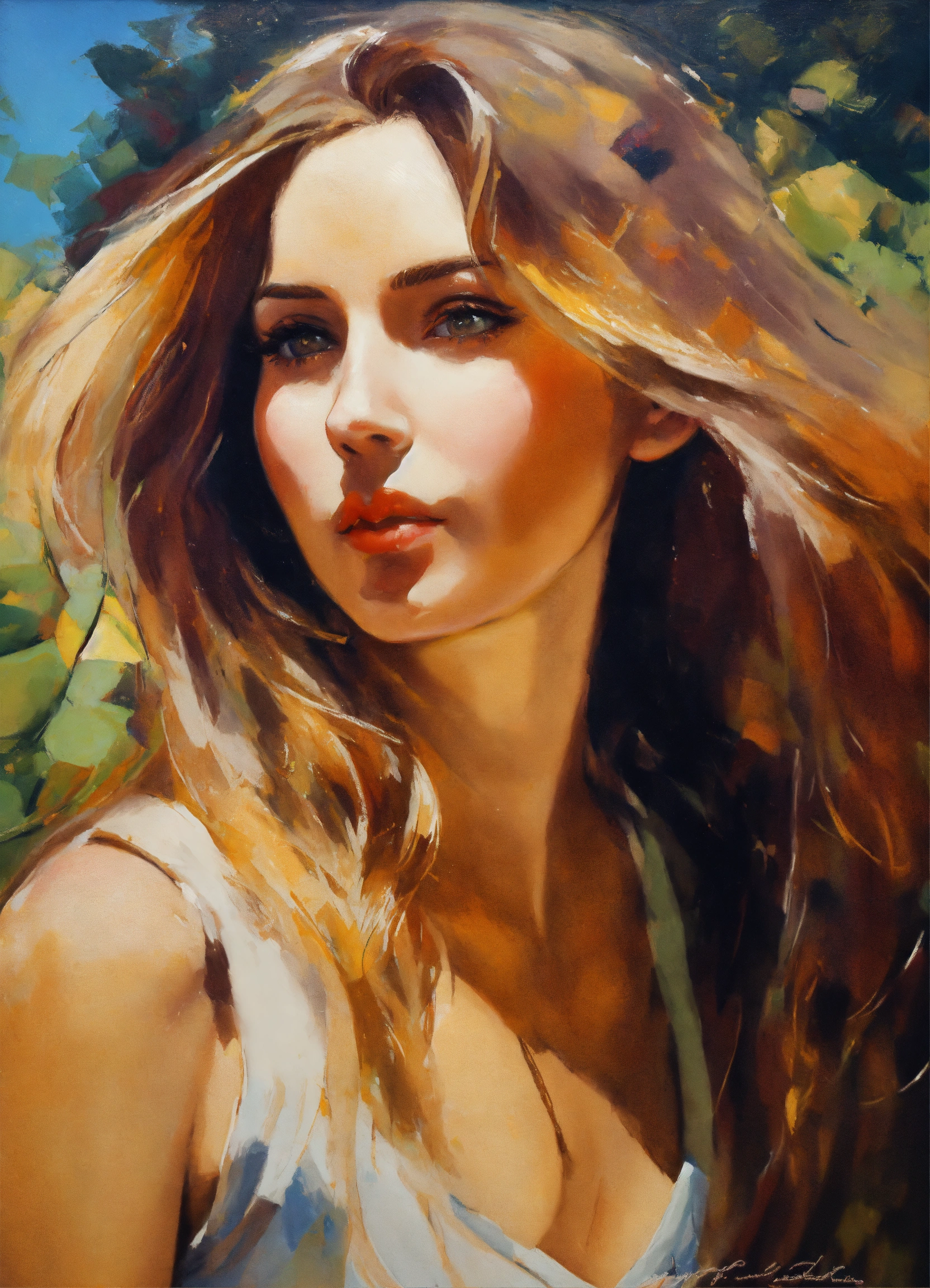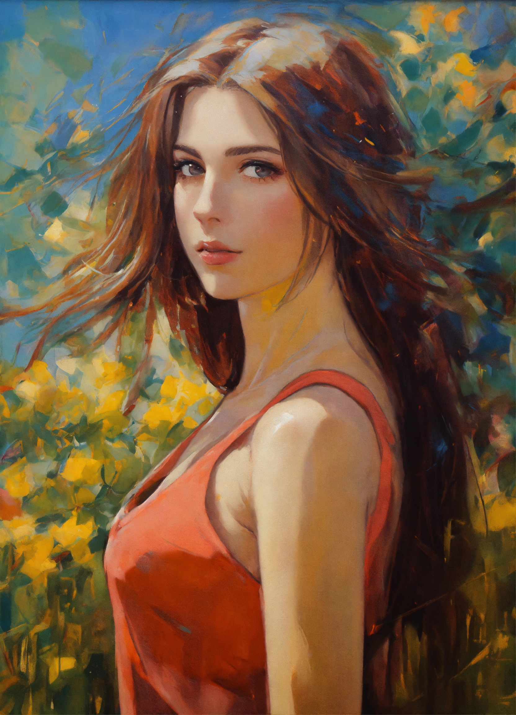 Un dipinto ad olio di una donna di sessant'anni con lunghi capelli lisci nello stile impressionista