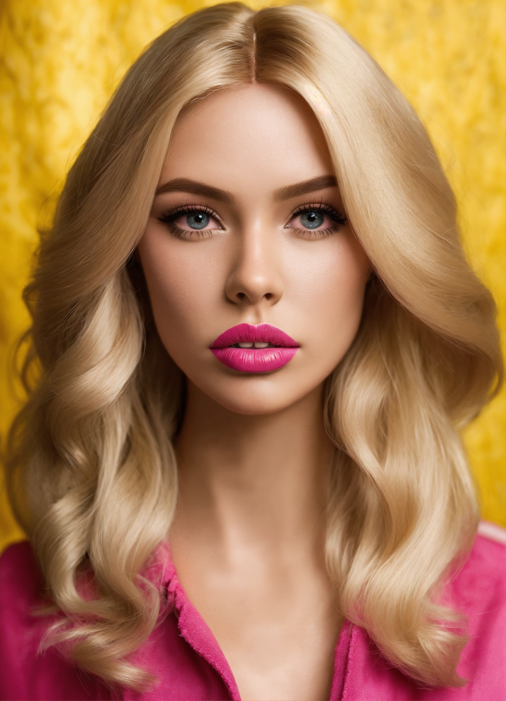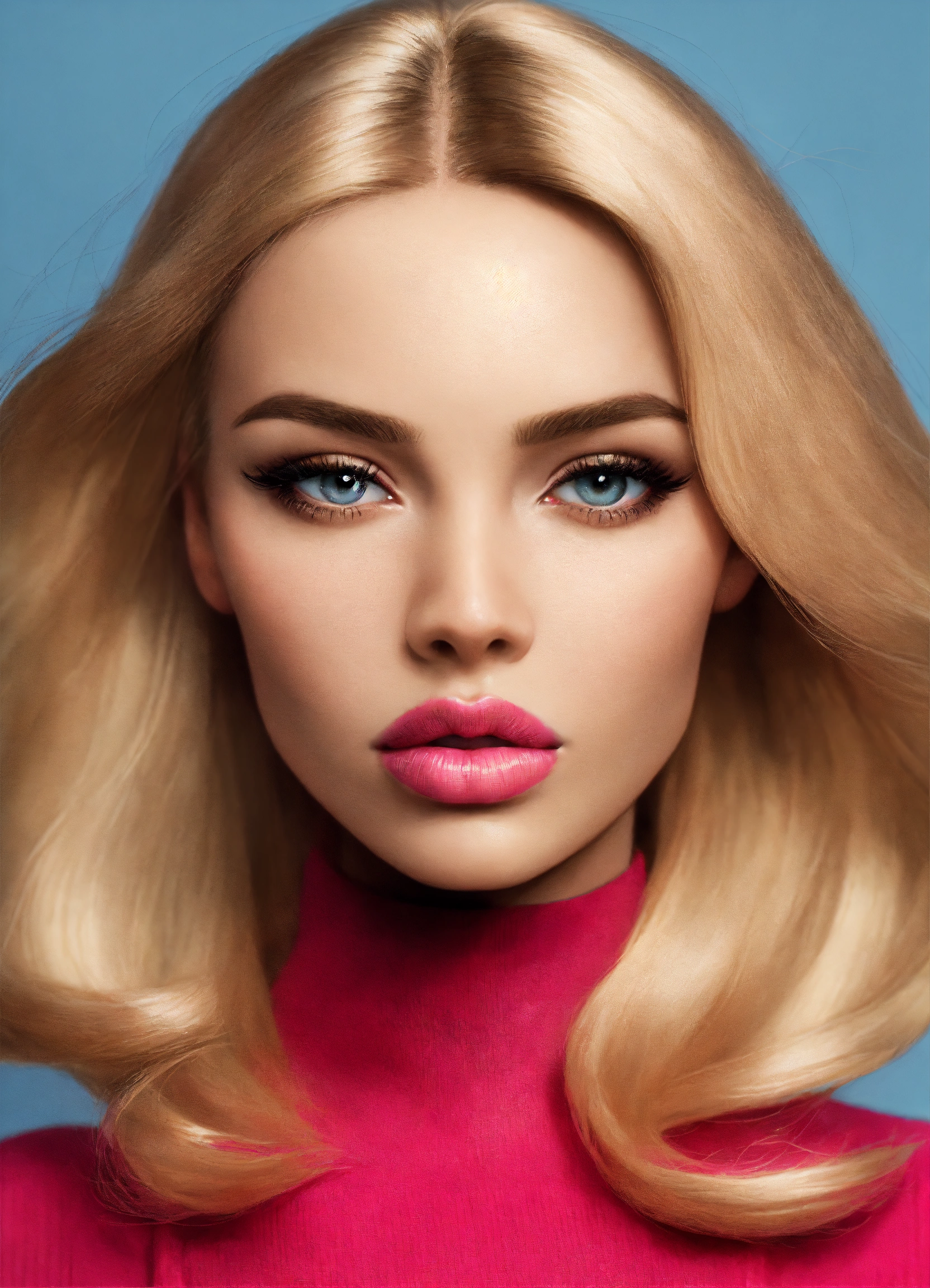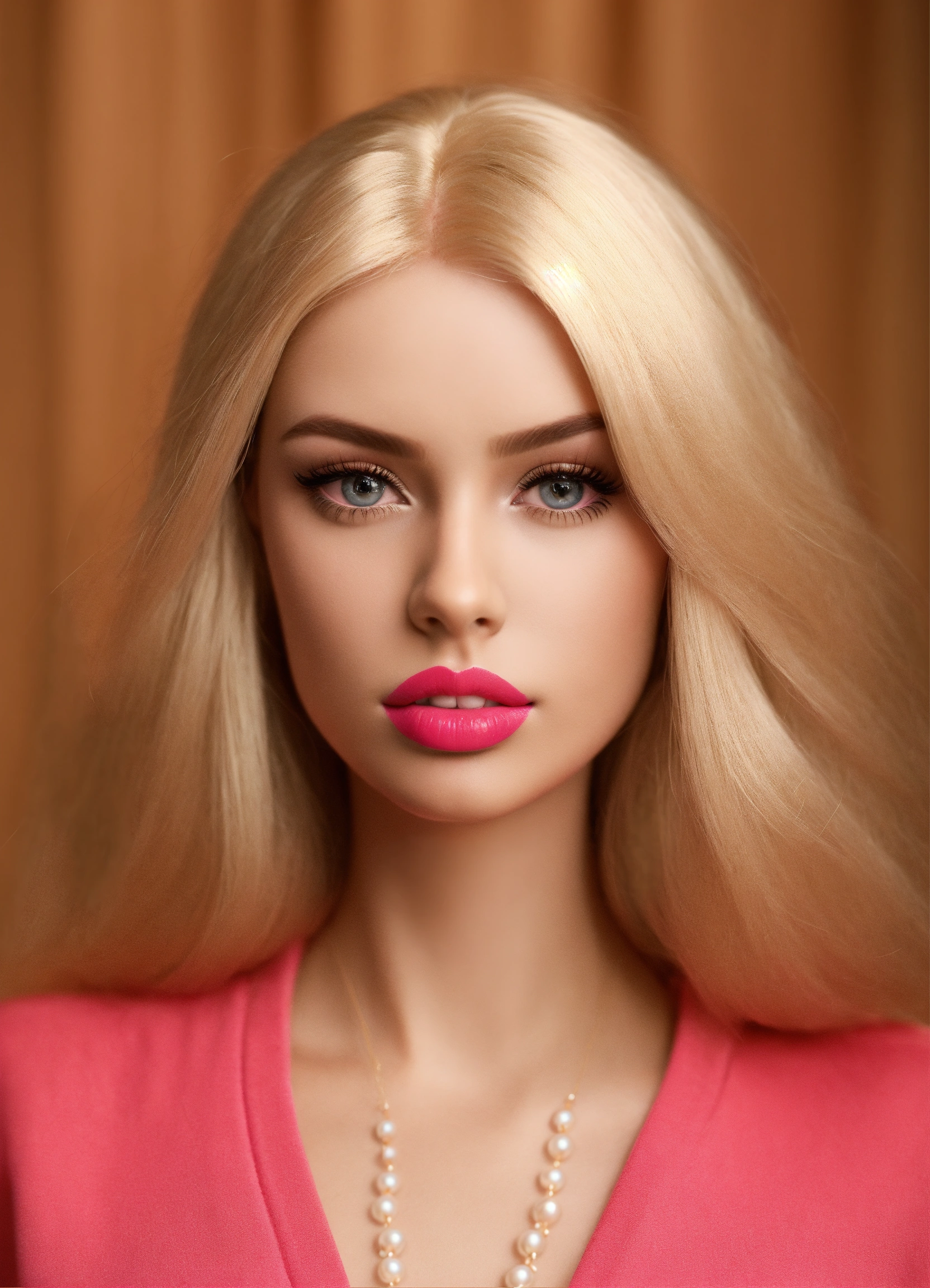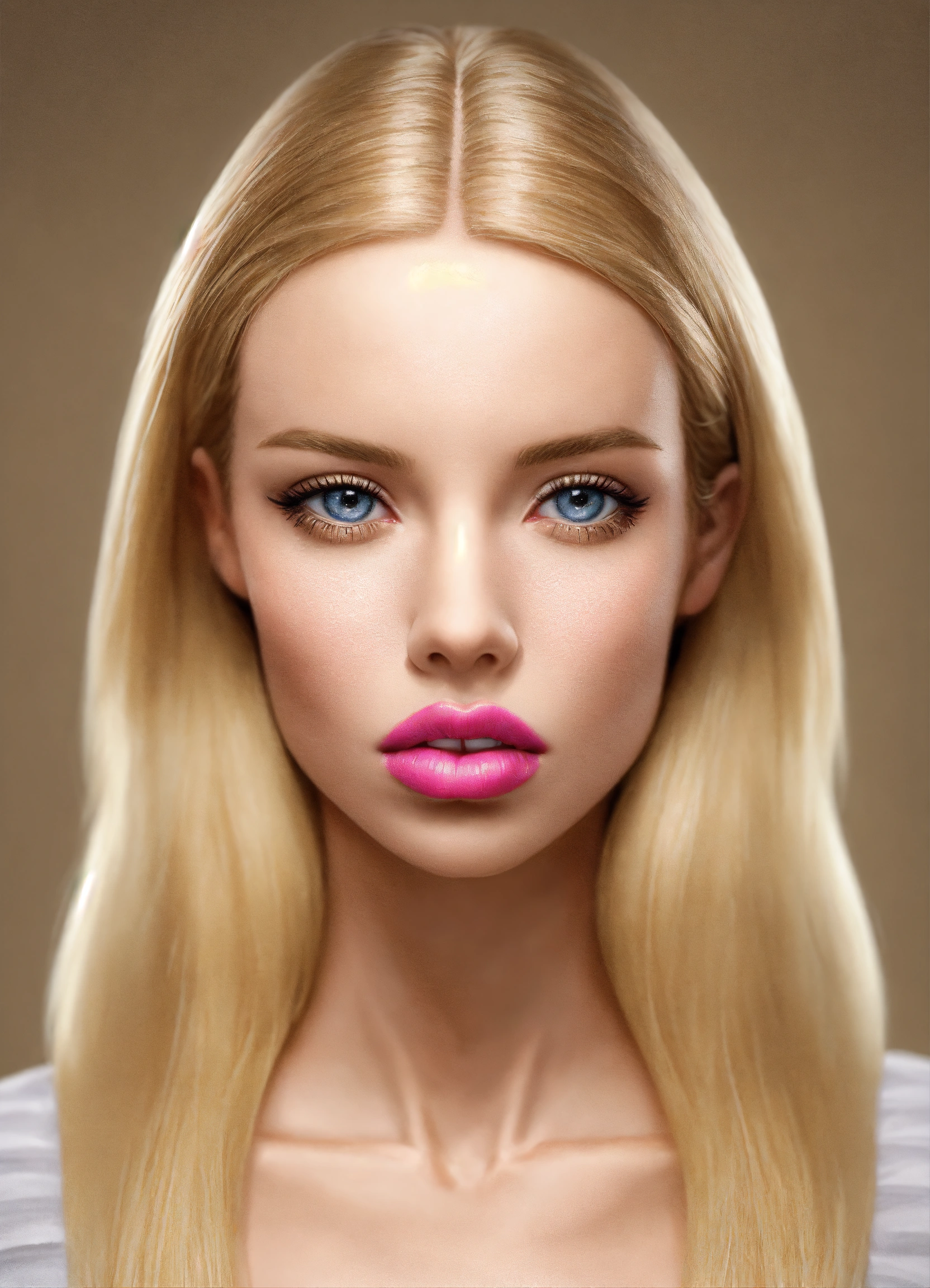 Barbie girl fake blond woman big lips face front on symmetrical photo realistic