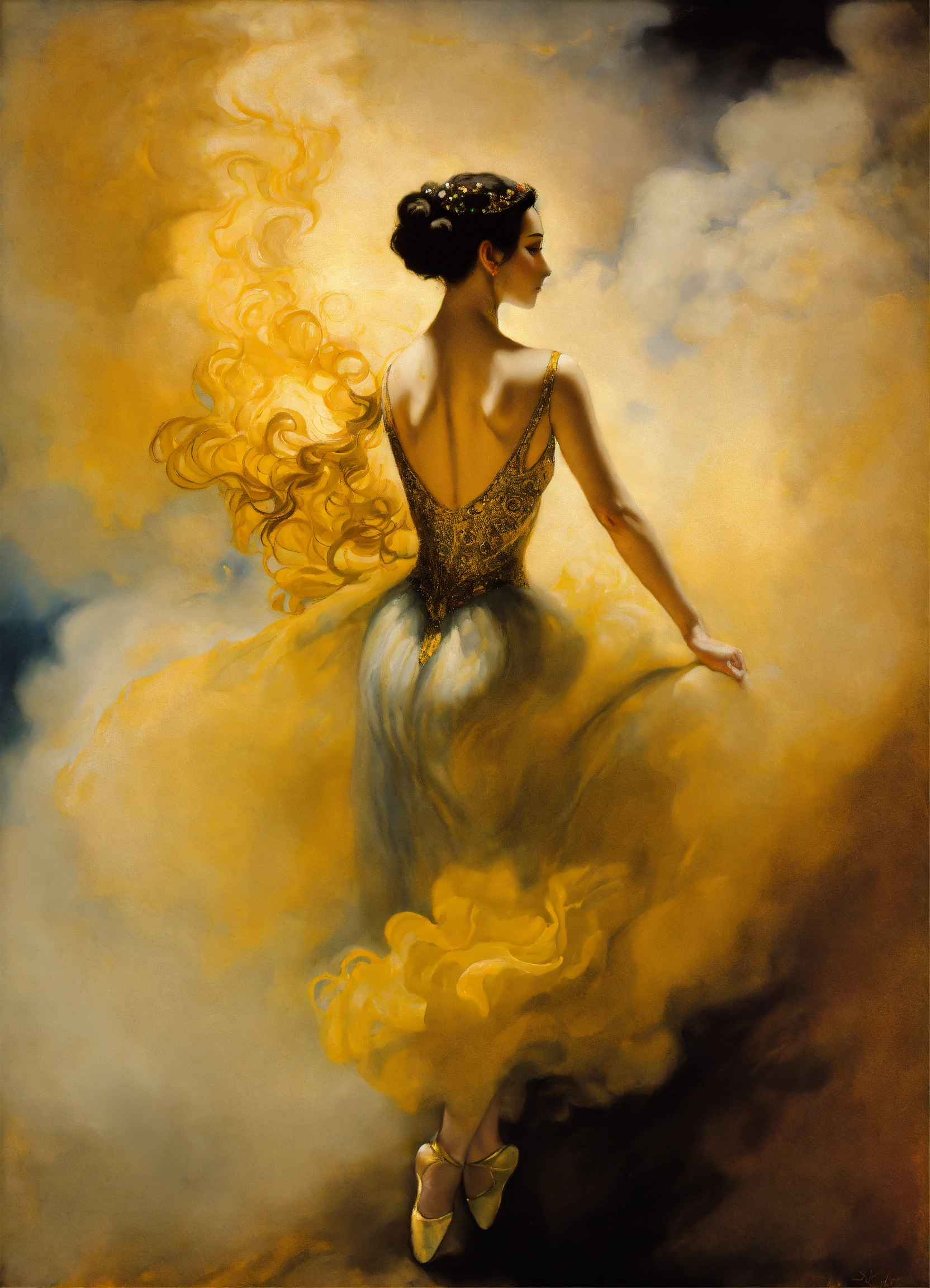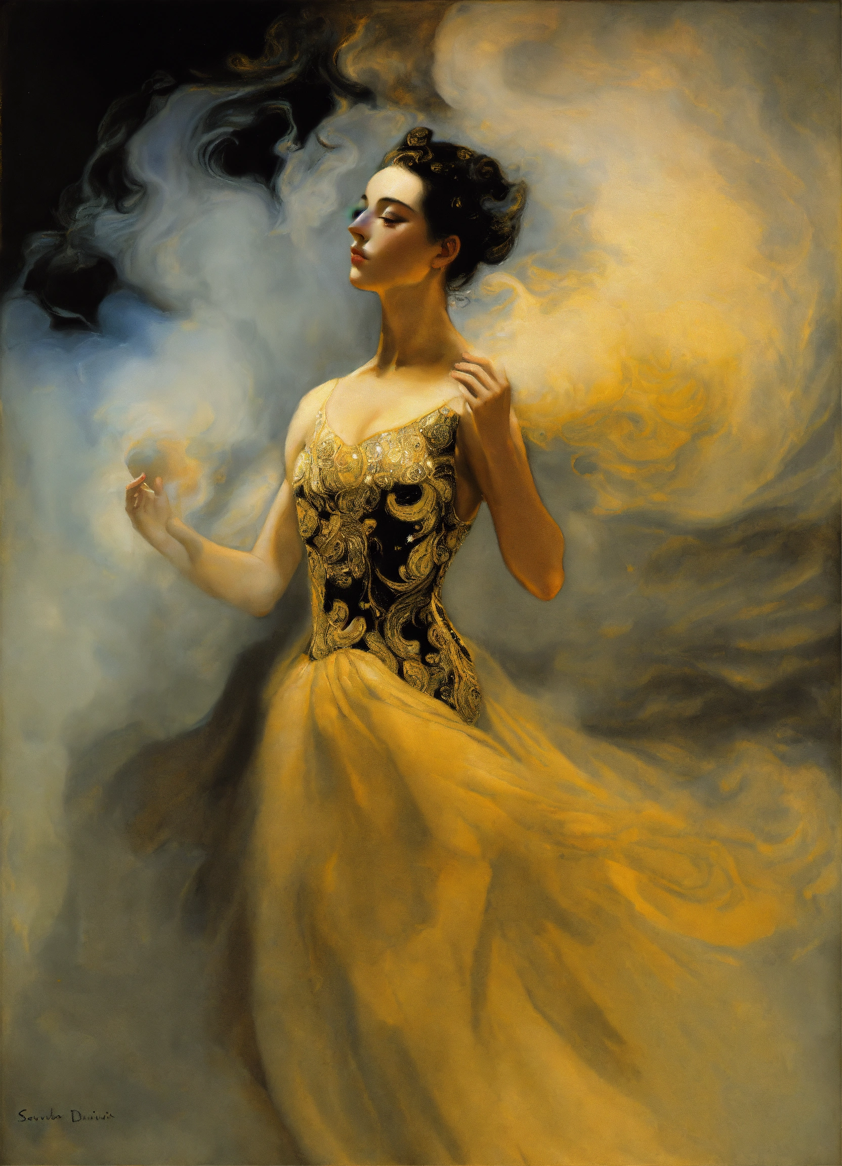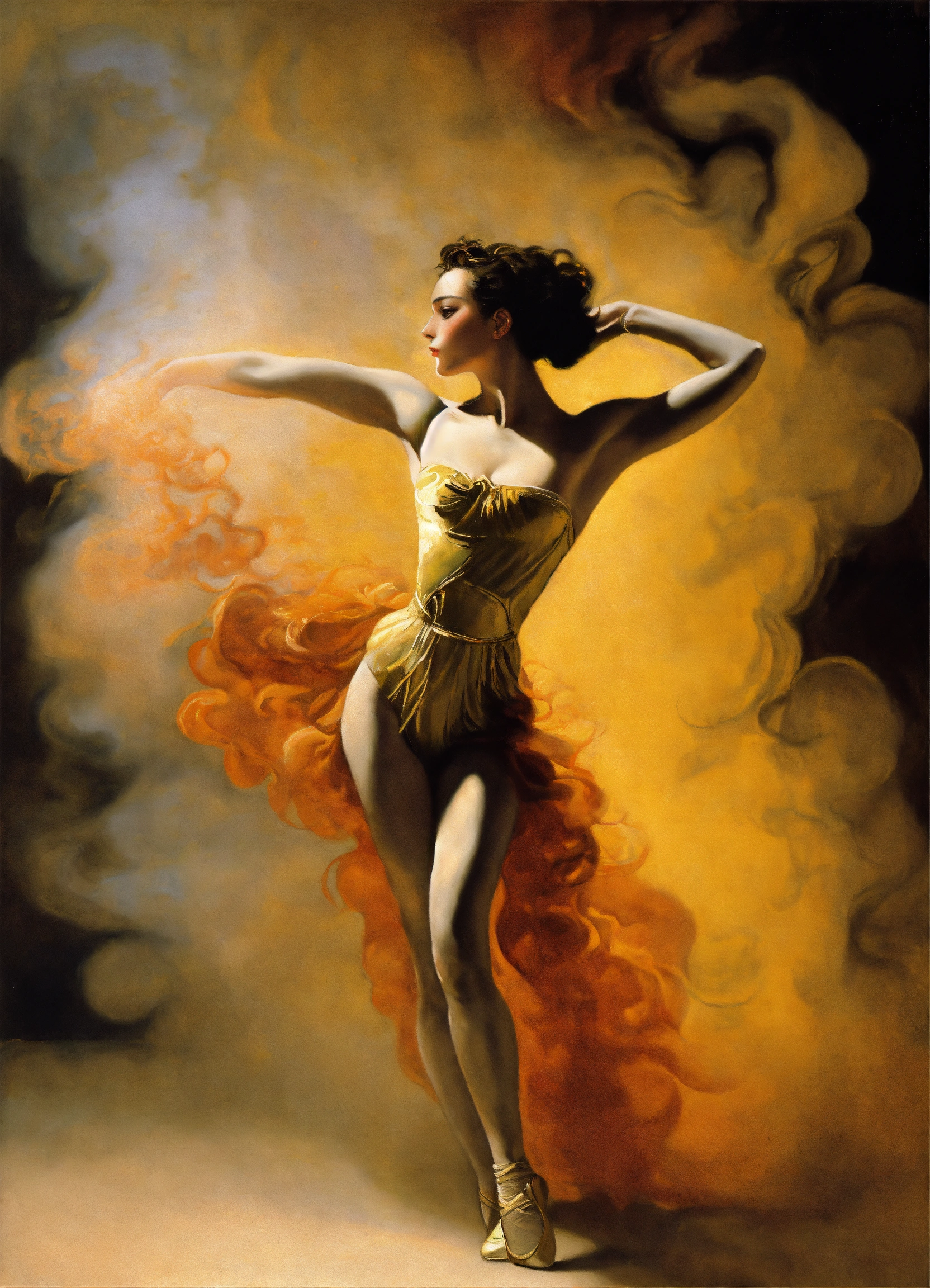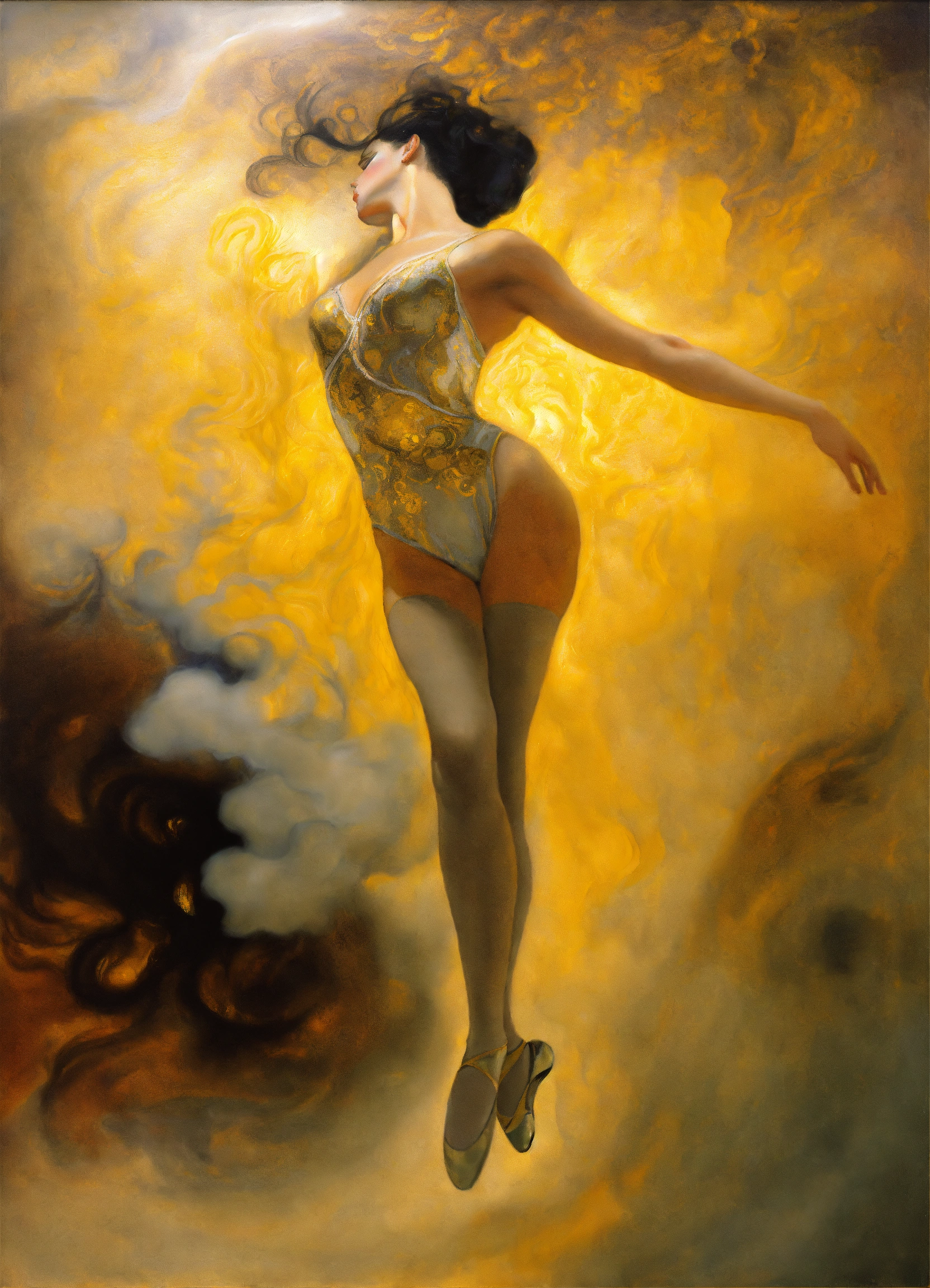 An oil painting of a breathtaking gorgeous prima ballet dancer, enveloped in smoke, by salvador dali, by gustav klimt.