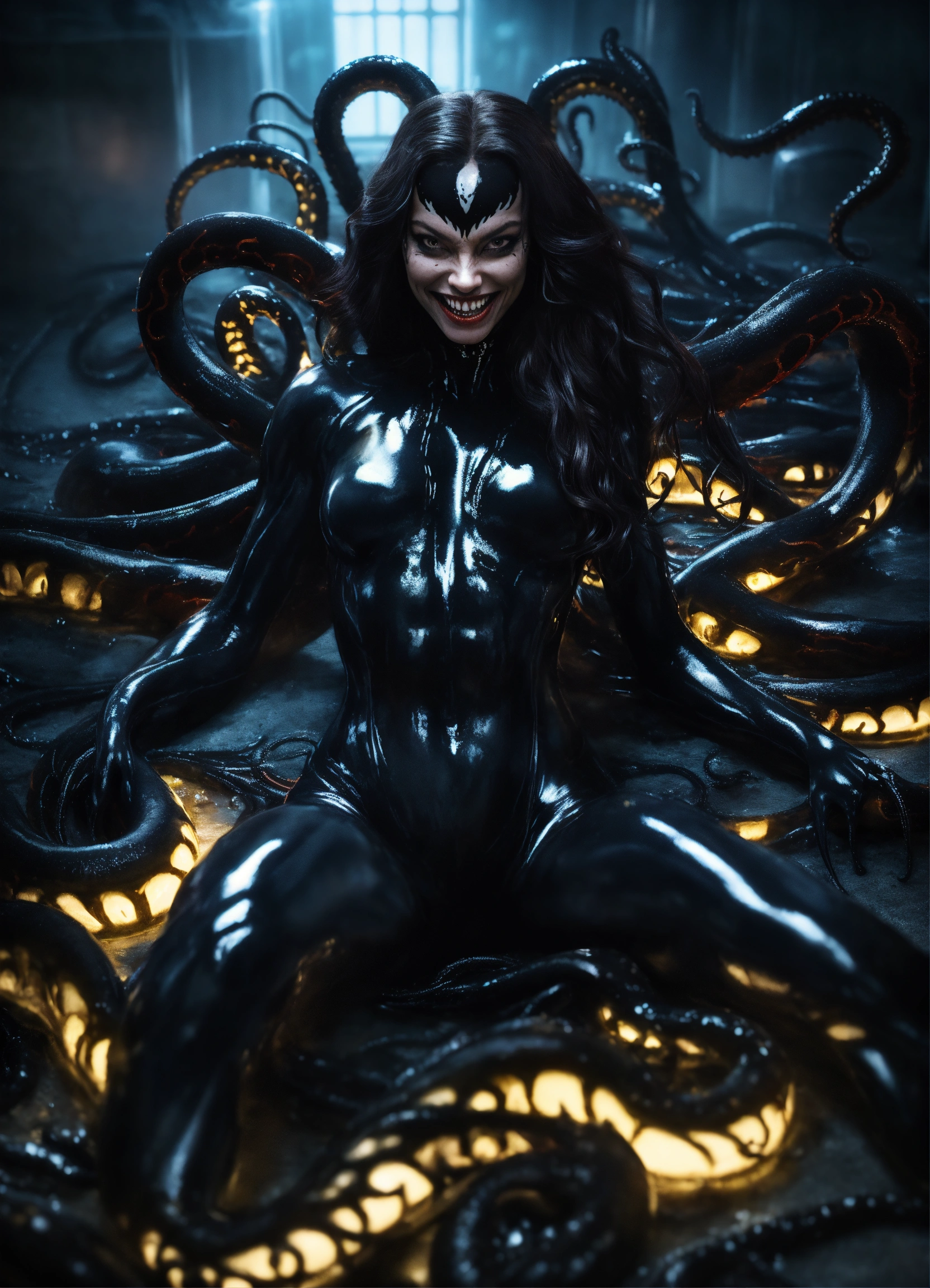 An ultrarealistic full body photograph of woman venom symbiote, laying in dark black liquid with tentacles, long hair, evil smile, evil glowing eyes, venom symbiote on skin, venom symbiote, full body, show skin, 8k