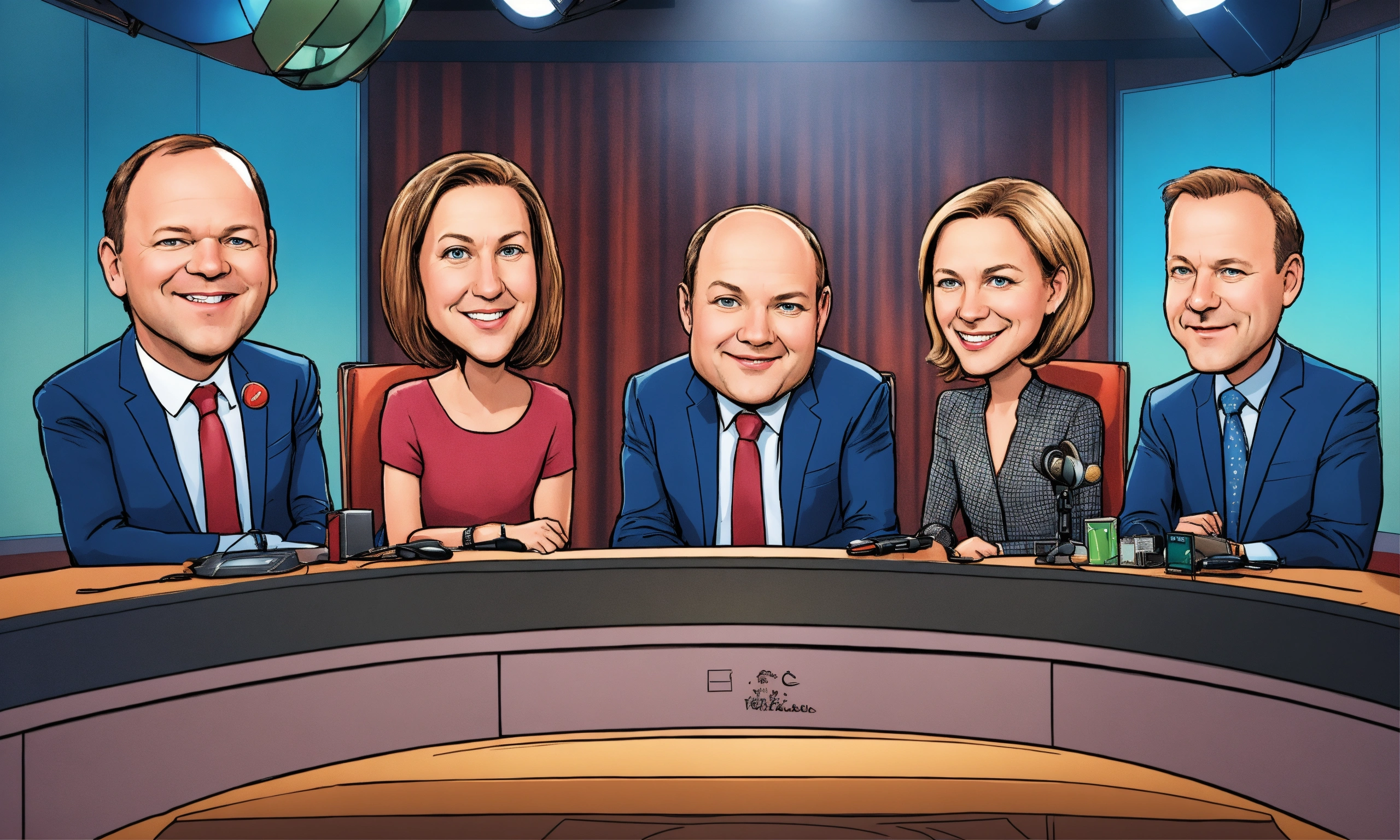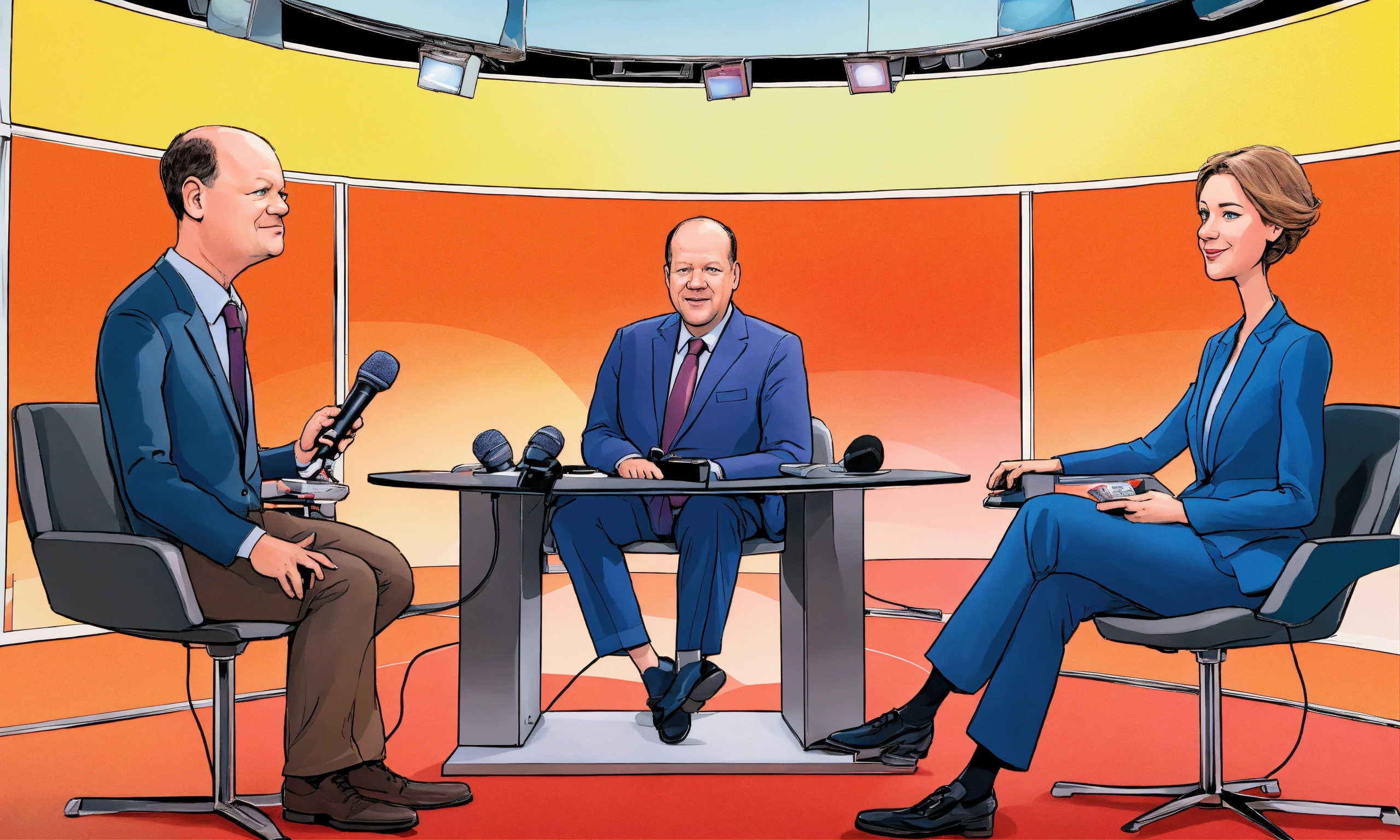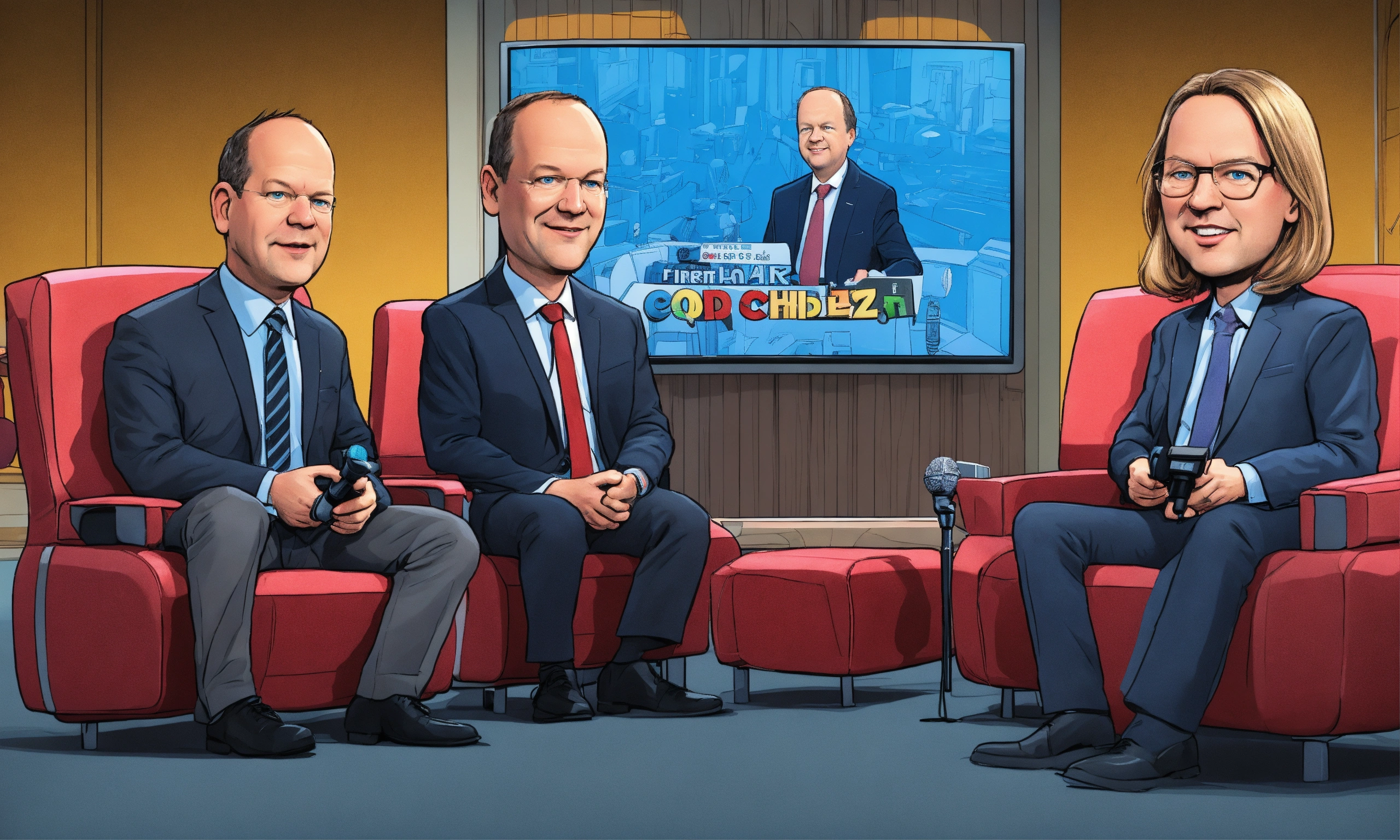 In this cartoon-style image, you can see olaf scholz, friedrich merz, robert habeck, and annalena baerbock depicted as caricature comic characters in a front view. they are sitting on a chair, each holding a microphone. the background resembles a television studio in a comic style. the image quality is described as 3d and uhq.