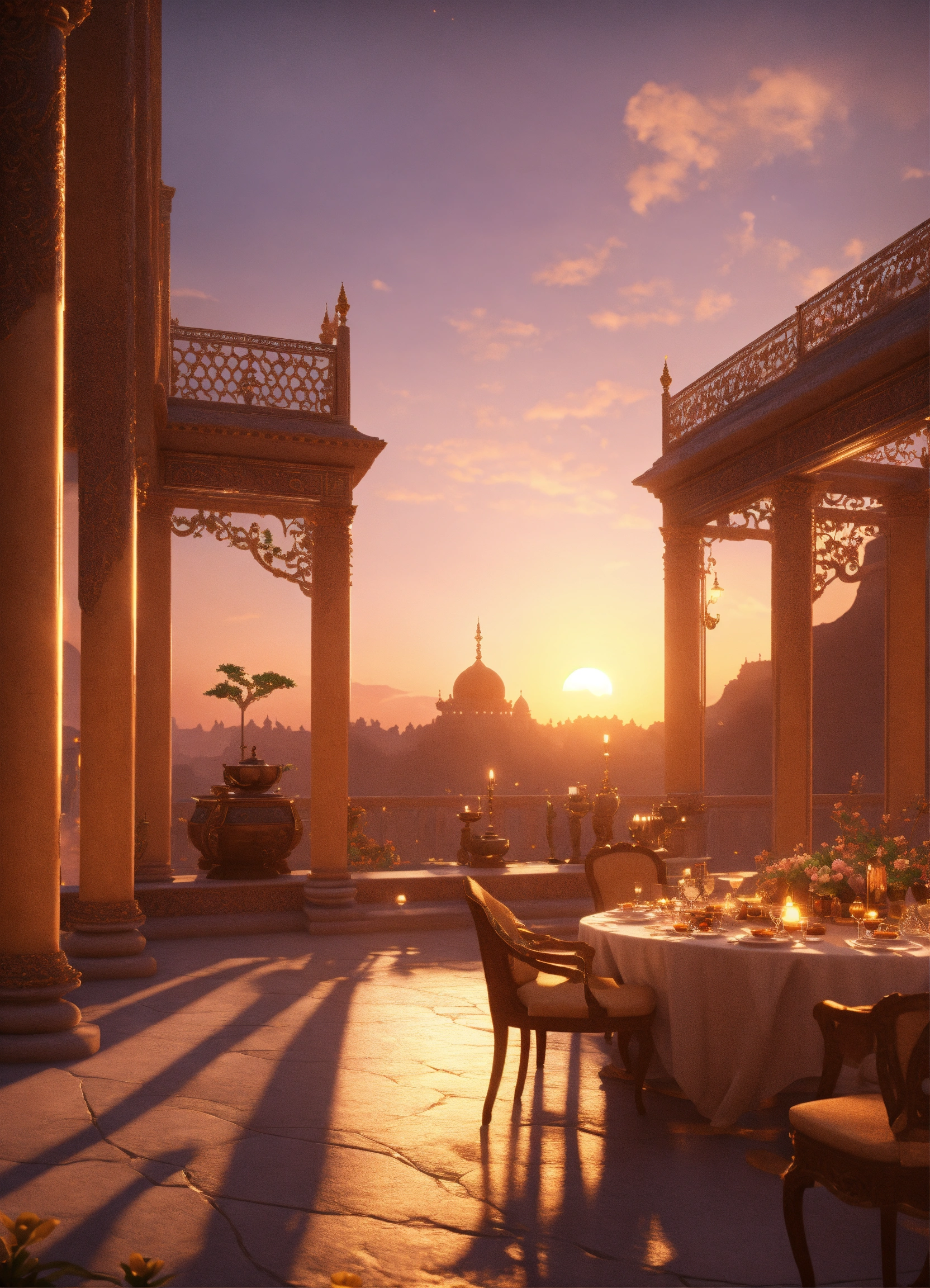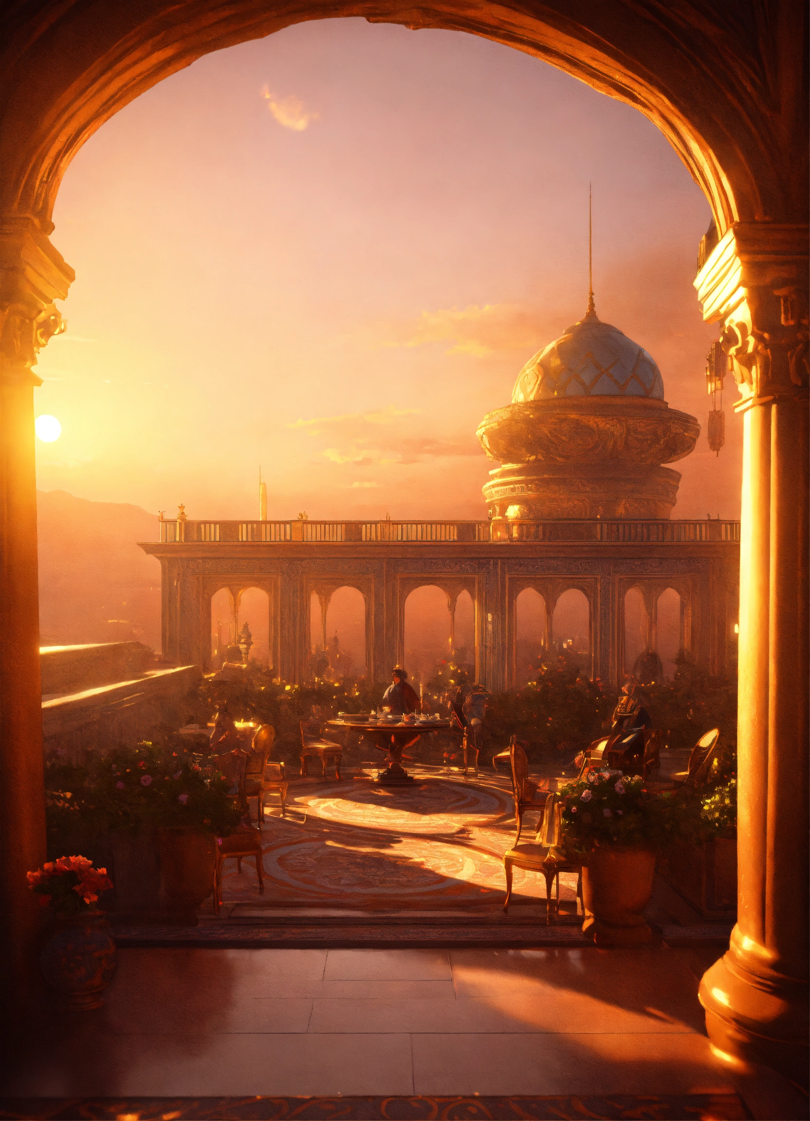A sumptuous palace terrace at sunset. alien orchestra playing instruments, delicacy banquet. 8k, unreal engine