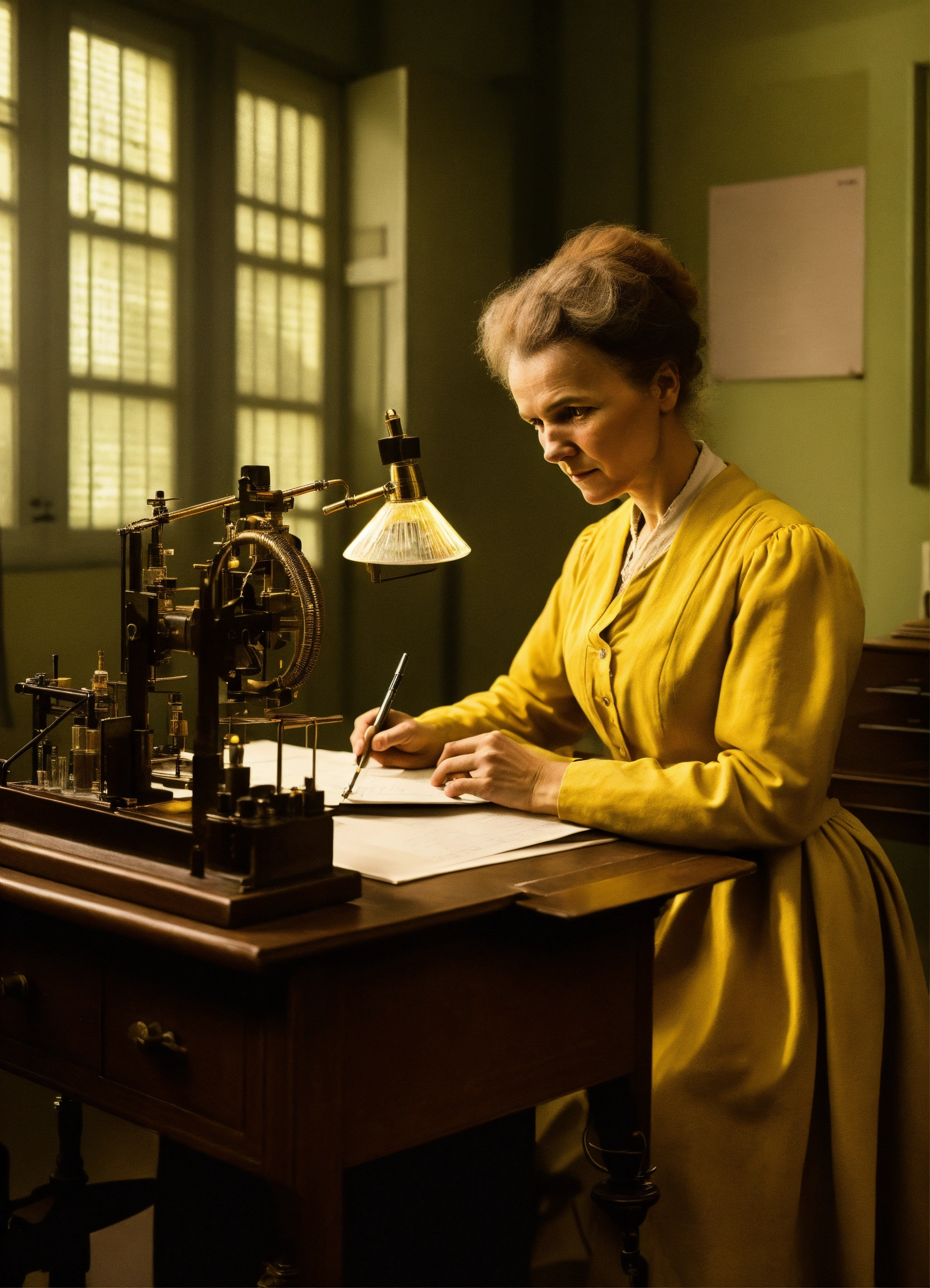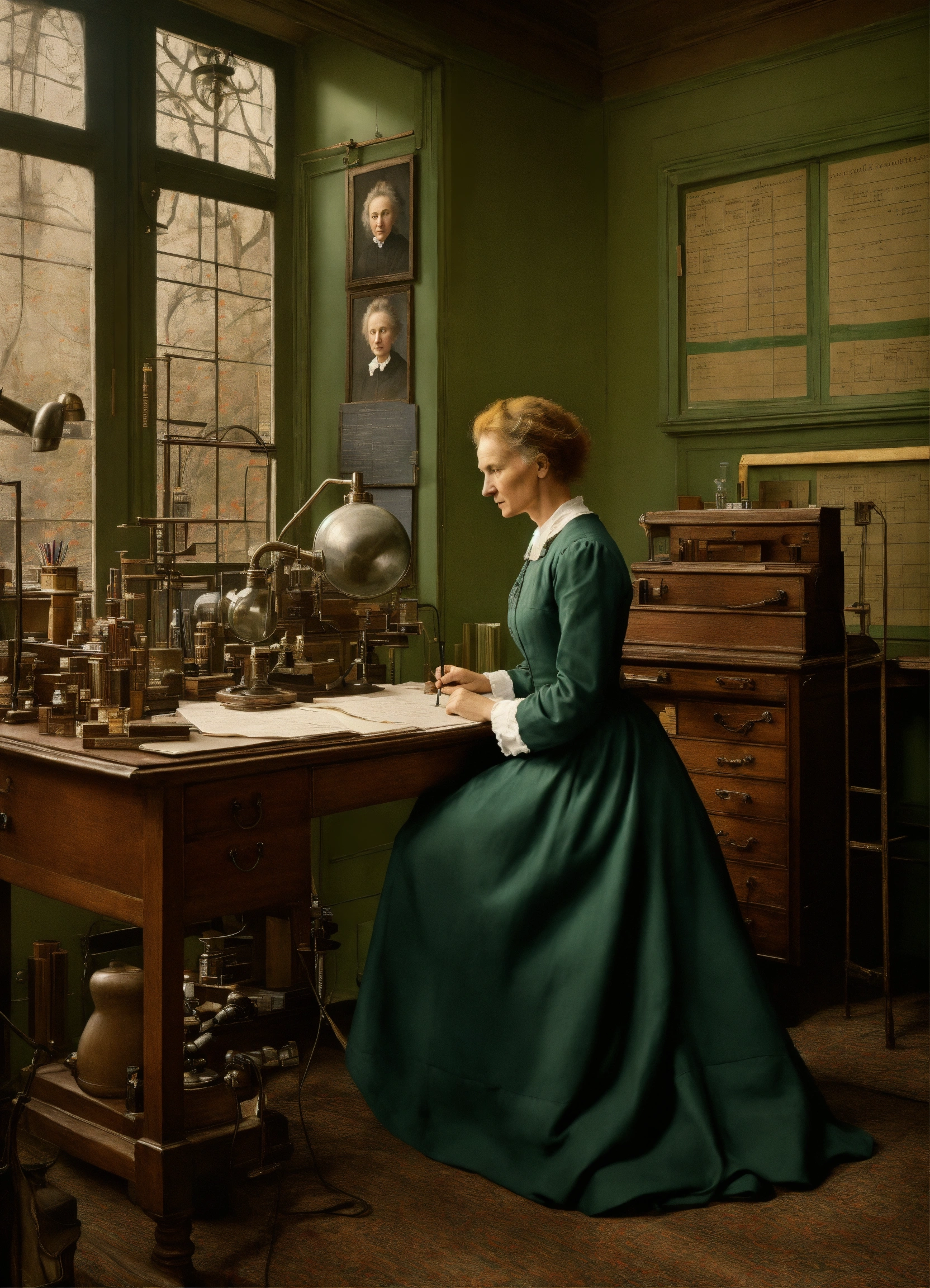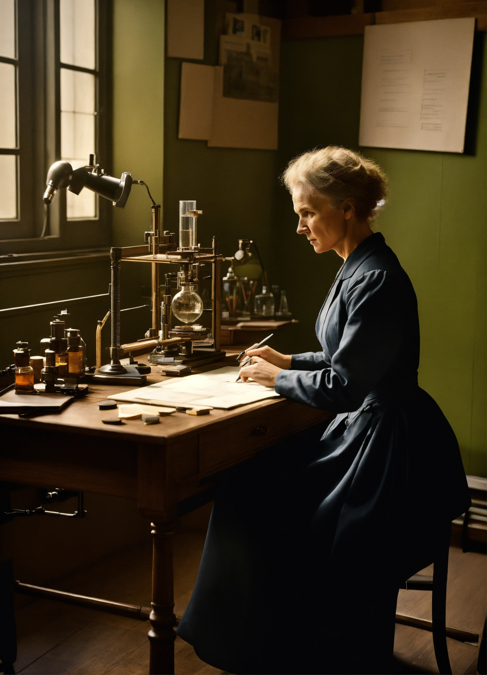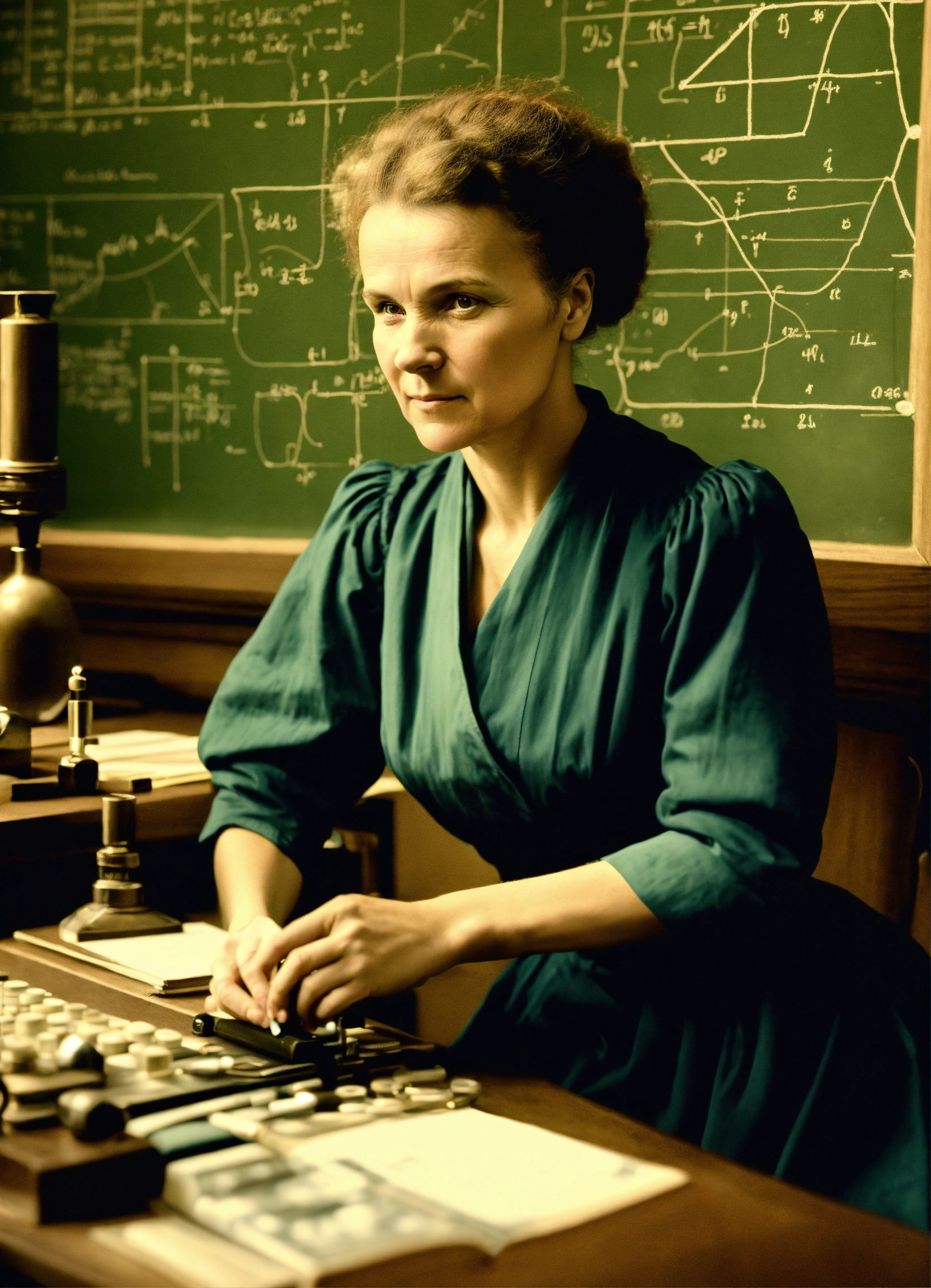 Créez une image réaliste de marie curie dans son bureau de physicienne, prête à raconter son histoire. derrière elle, un tableau avec des calculs scientifiques, elle doit nous regarder