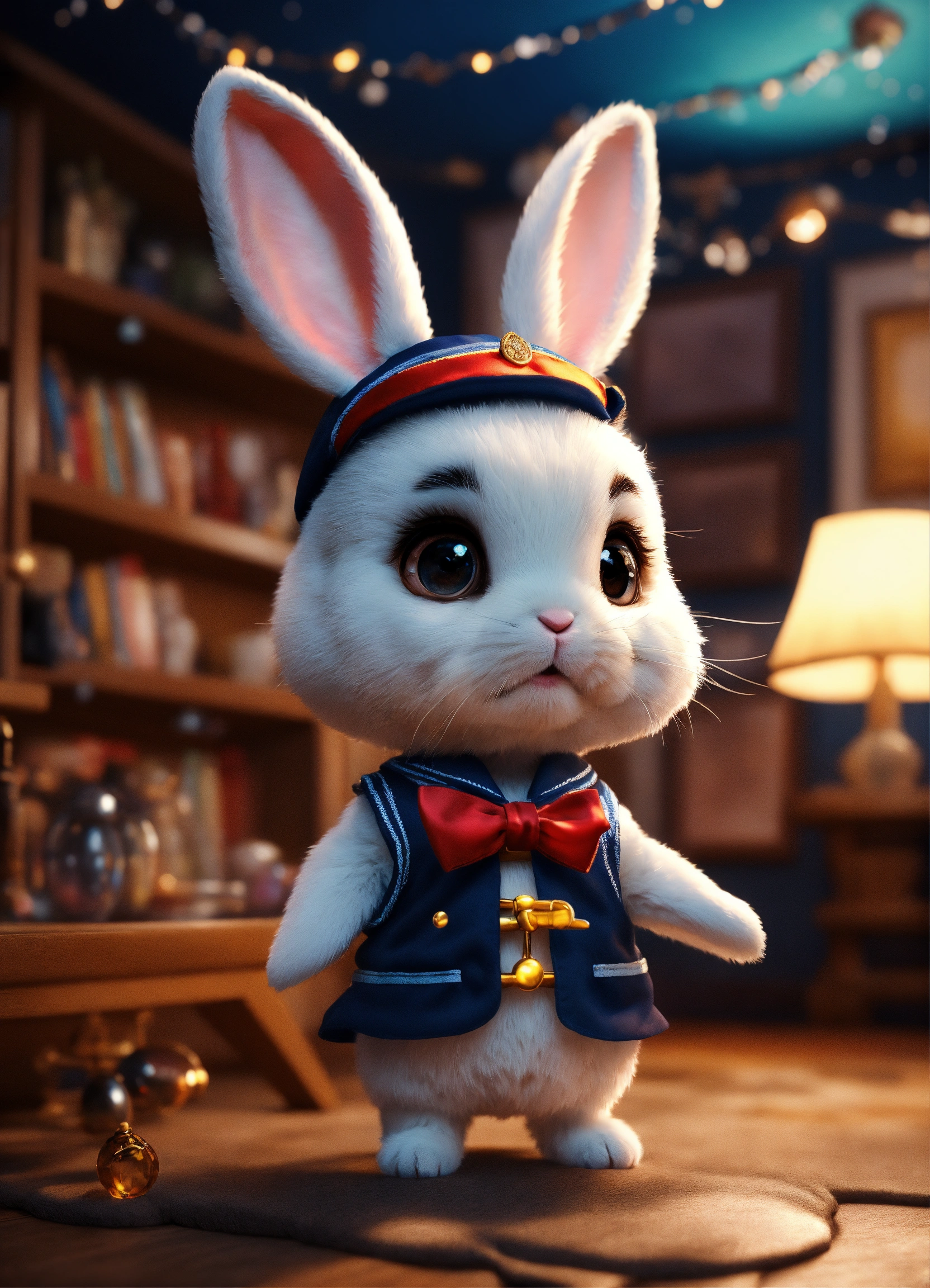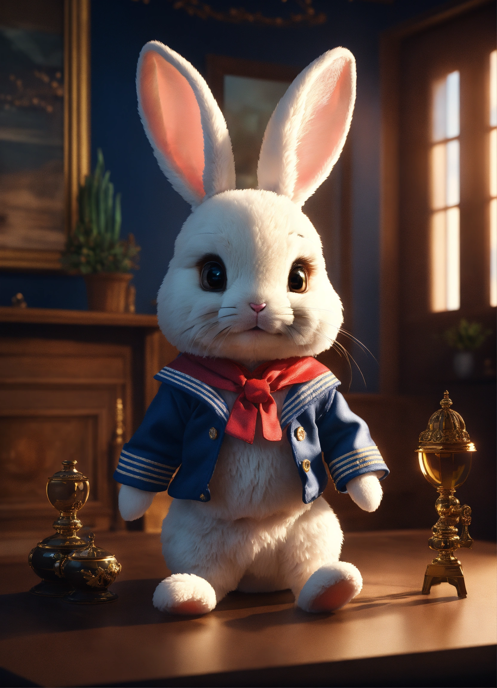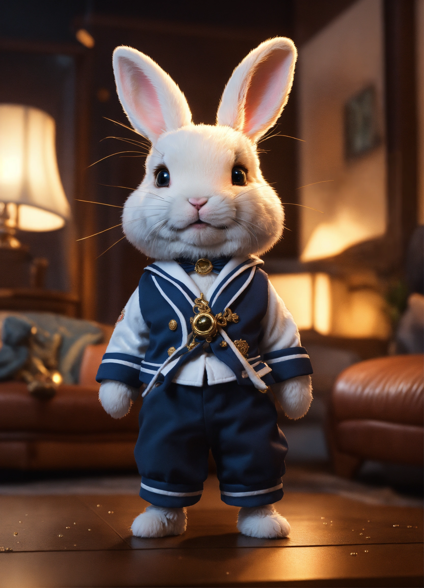 Photorealistic final render of an adorable chibi bunny dressed as a sailor, living room, full body, deep colors, gorgeous eyes, liquid, photorealistic 16k resolution, masterpiece, breathtaking intricate details, realistic and lifelike cgi diorama, dramatic natural lighting, reflective catchlights, high quality fine art cgi vfx, hypermaximalist.