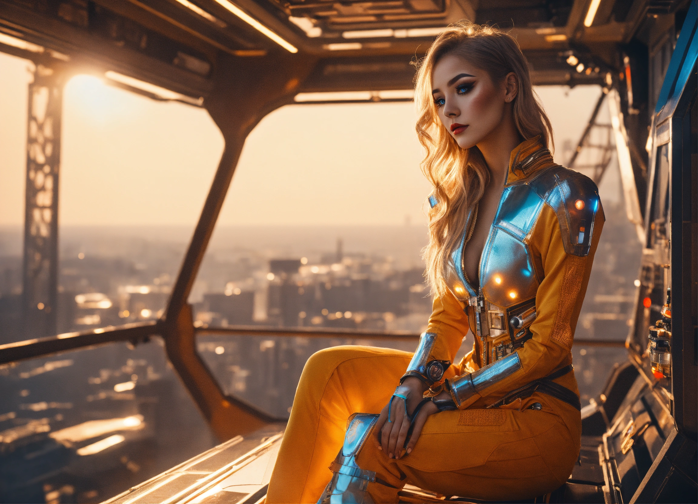 Full body, photo, sci-fi dream girl, futuristic, sunny weather, open shirt, wearing underwaee, 8k, extreme make-up, spacestation