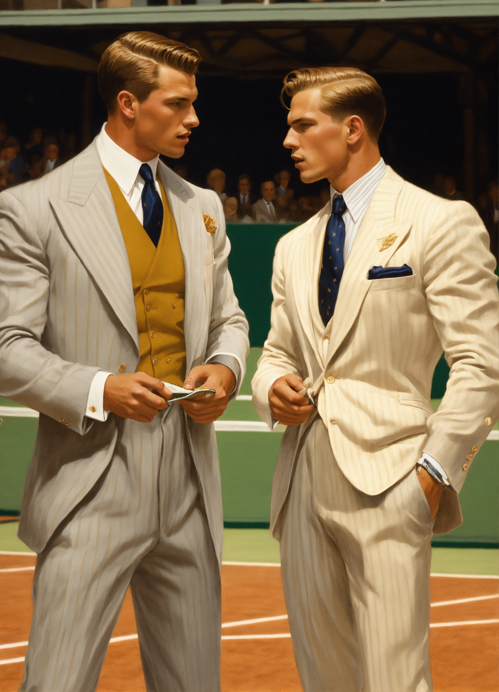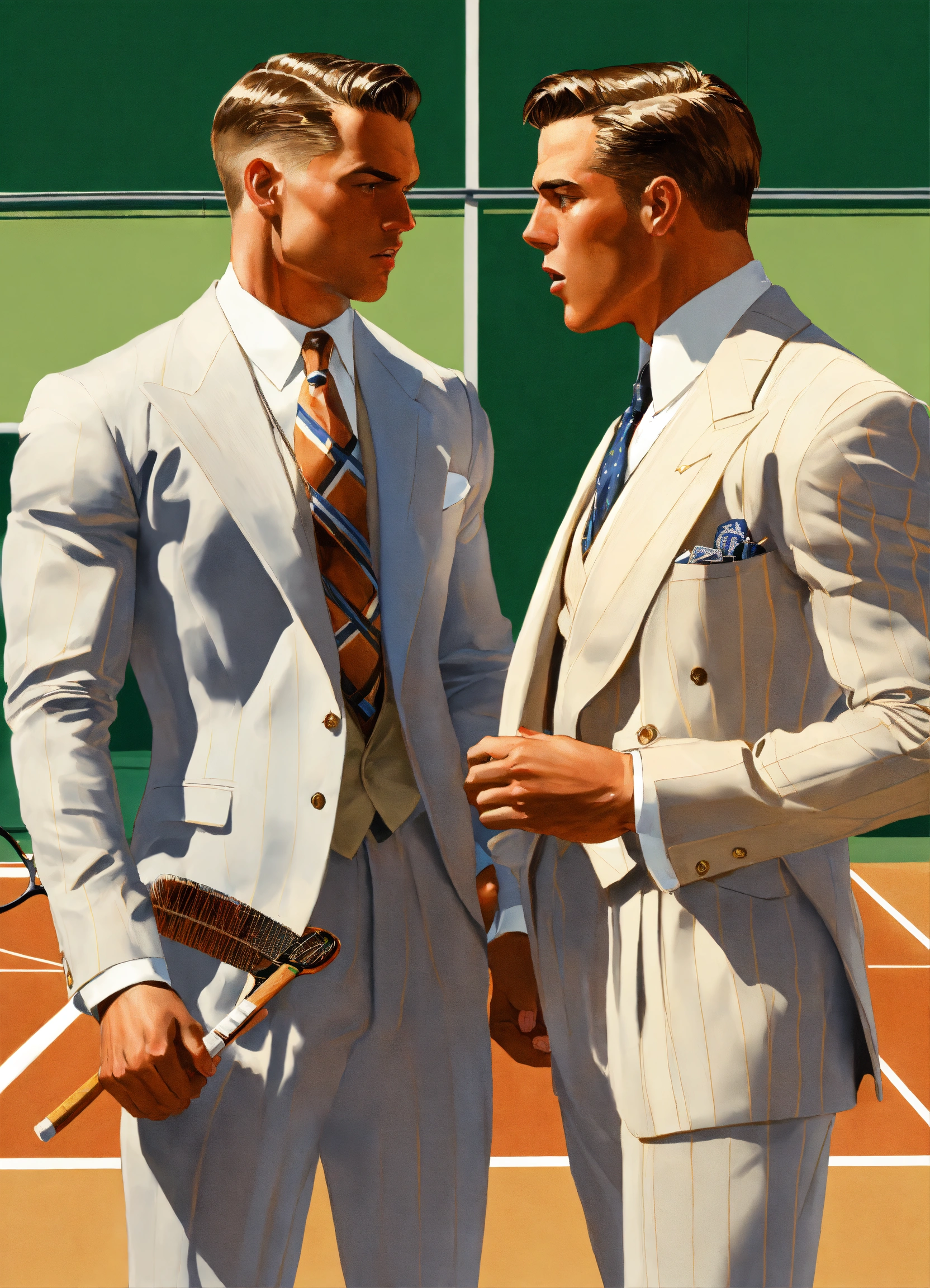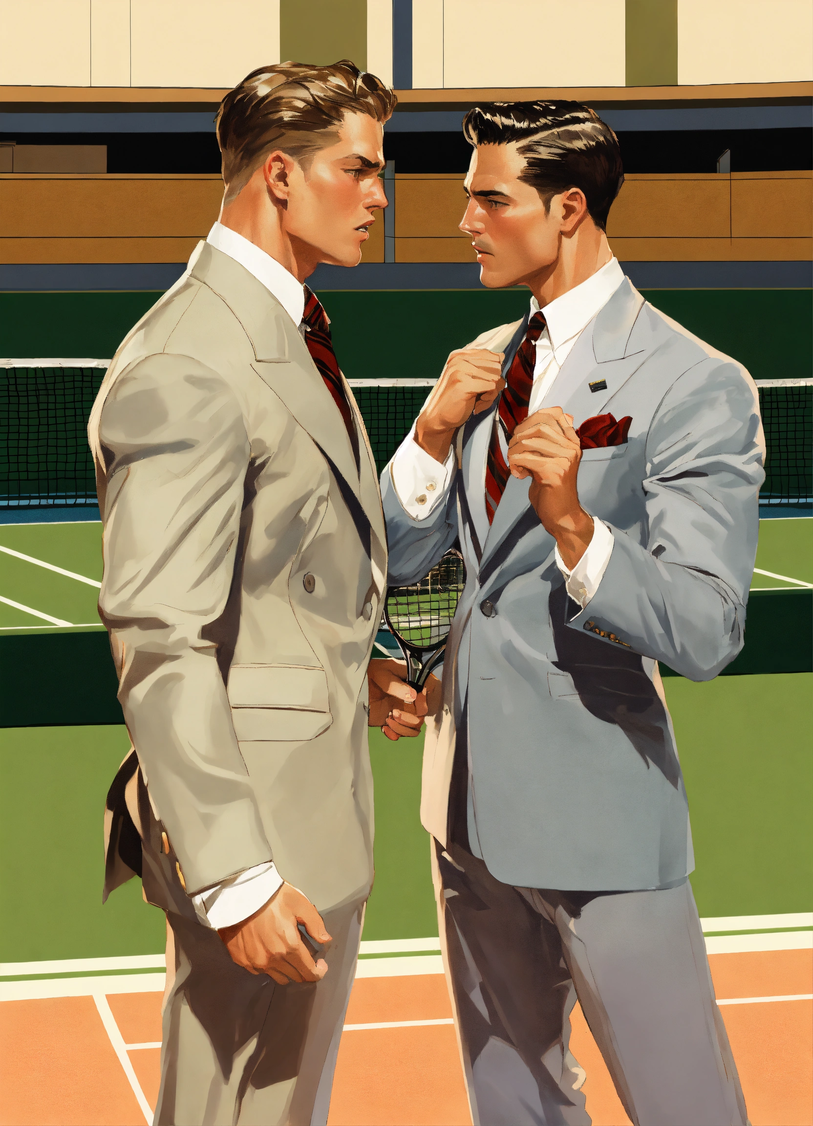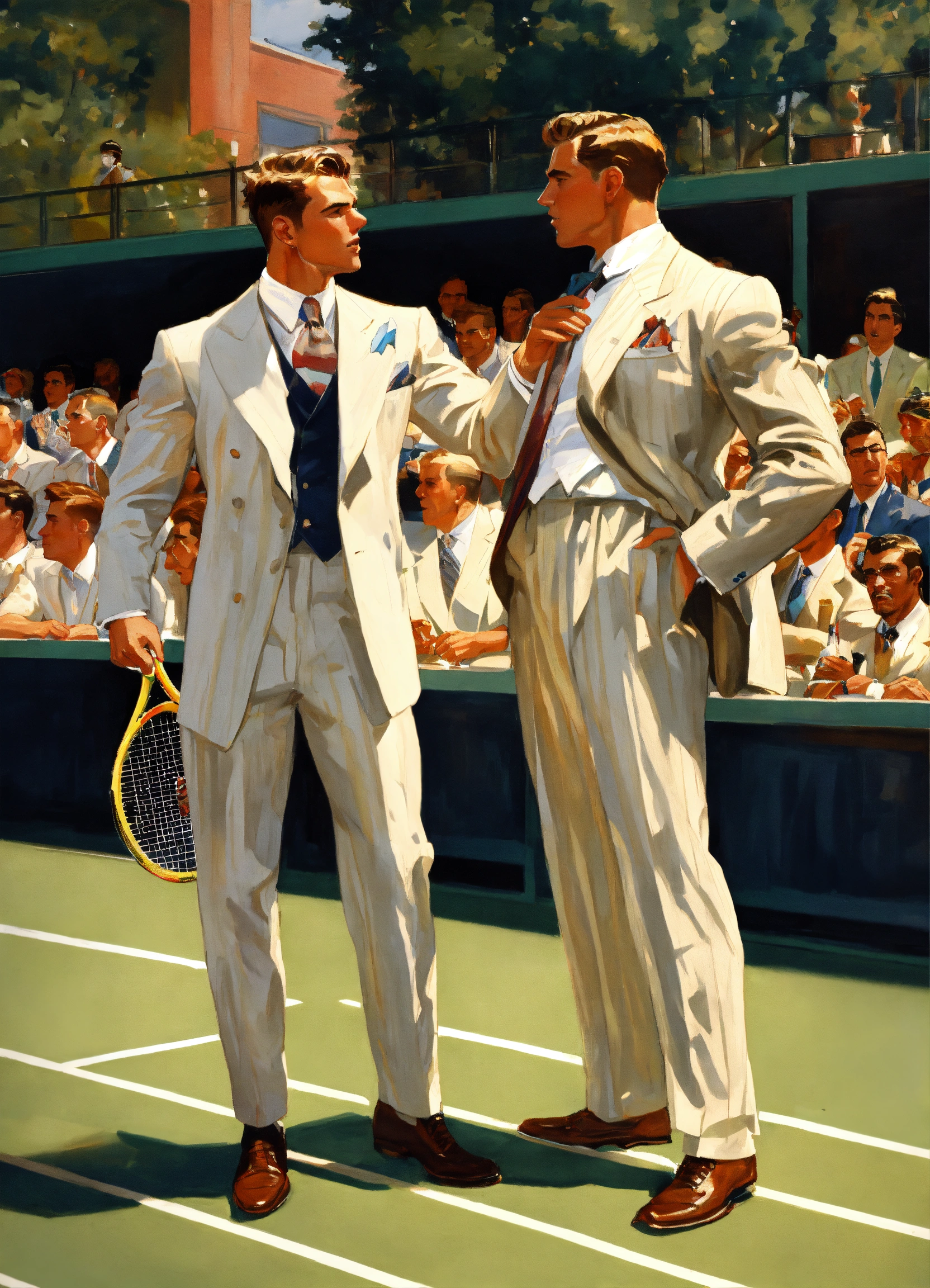 Two muscled male sportsmen in light grey suit, club tie, brushed hair, arguing on a tennis court, leyendecker style