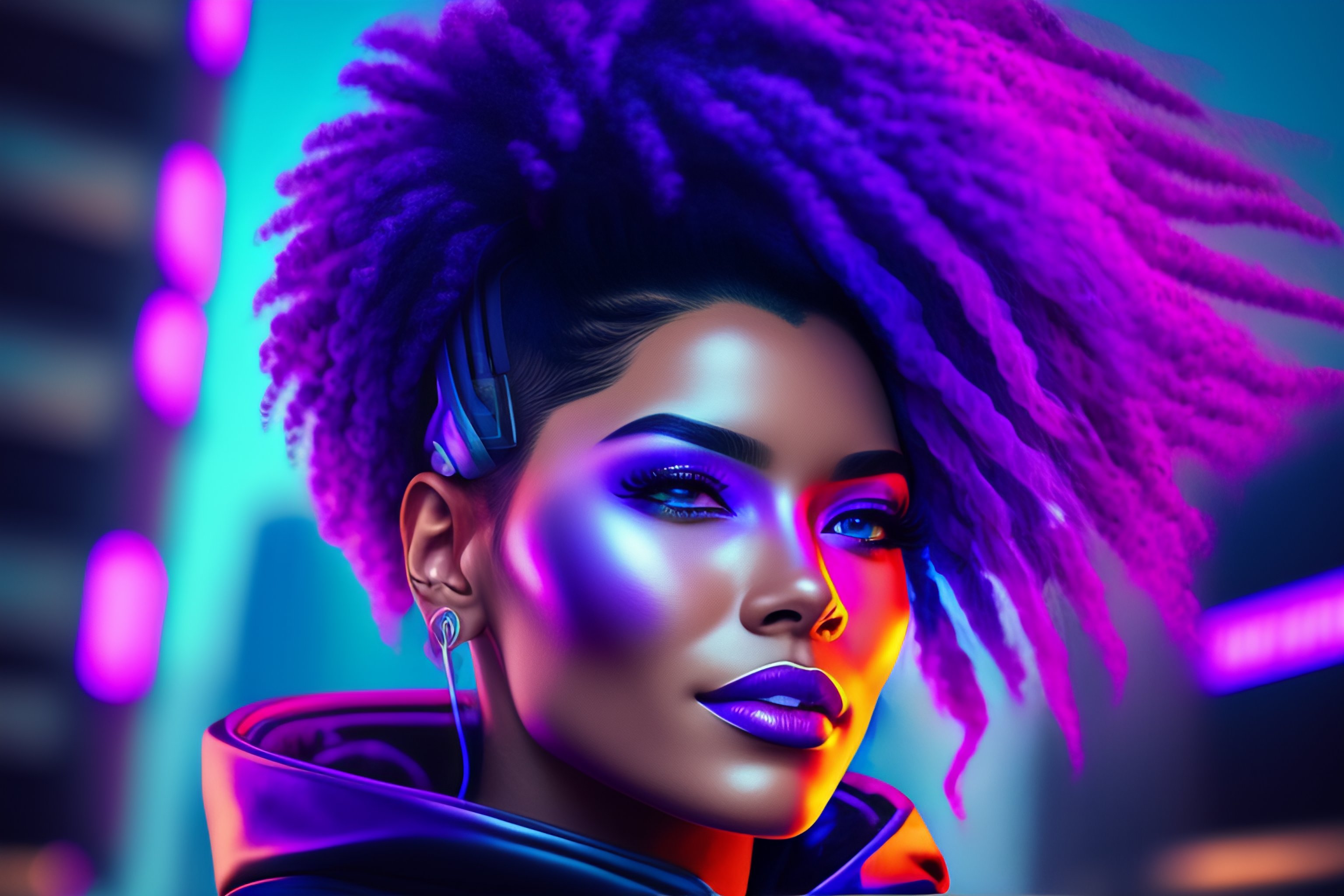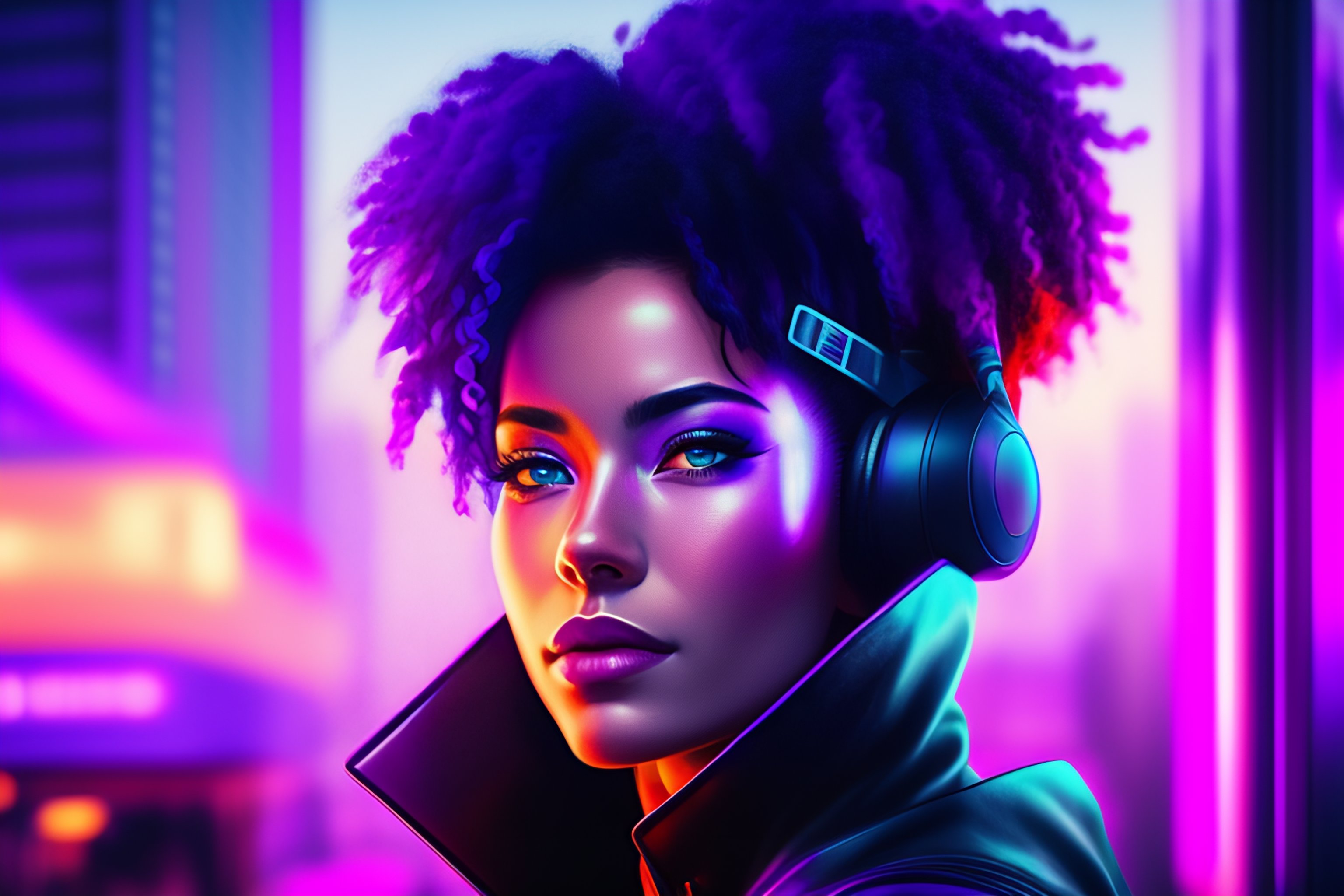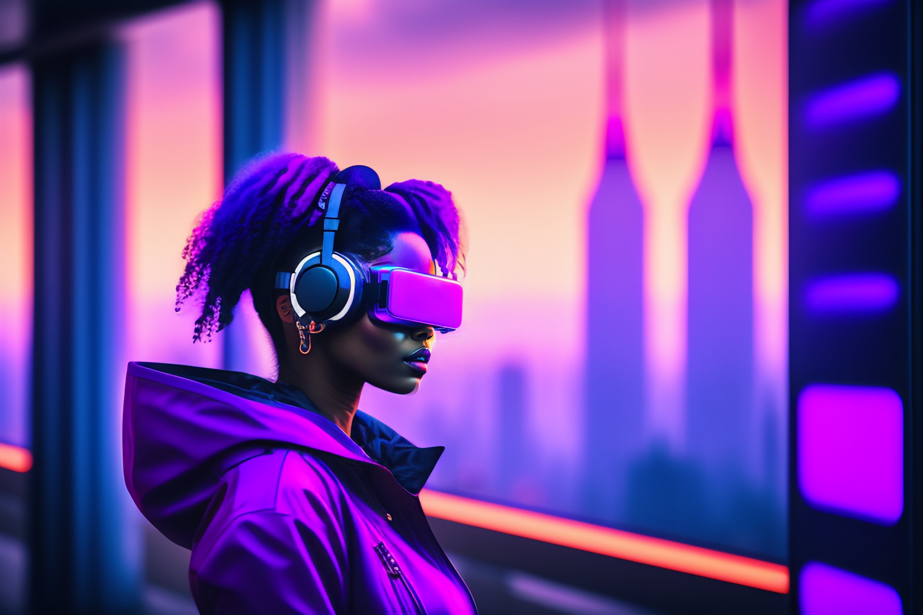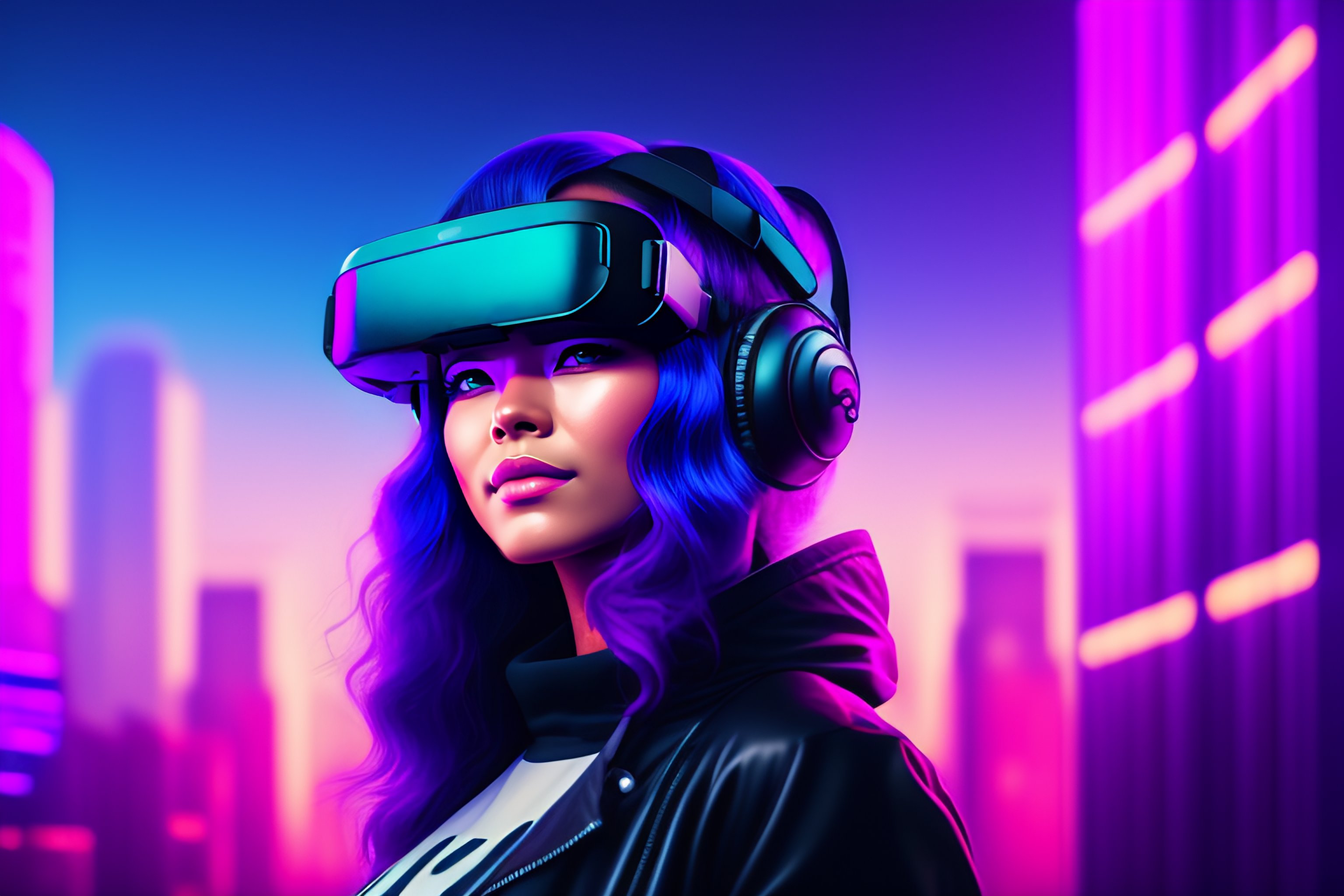 A portrait of a female eyeless cyborg wearing a vr headset, looking straight at the viewer, dystopian city view with screens in the background, magenta purple blue black hair, slight smile, vaporwave elements, vivid bright colors, cyberpunk environment