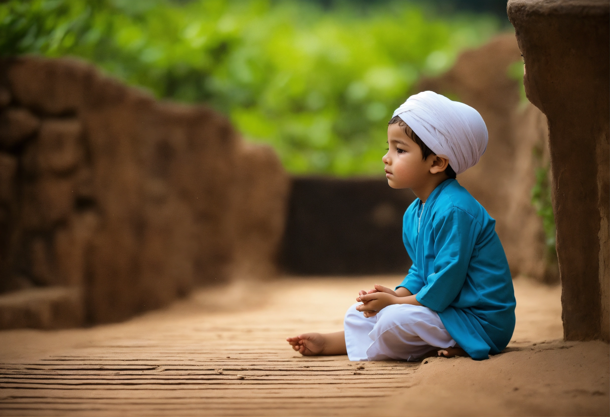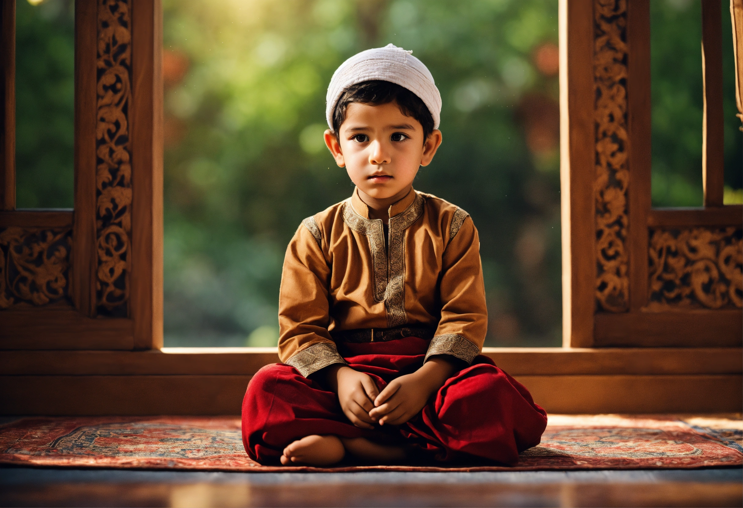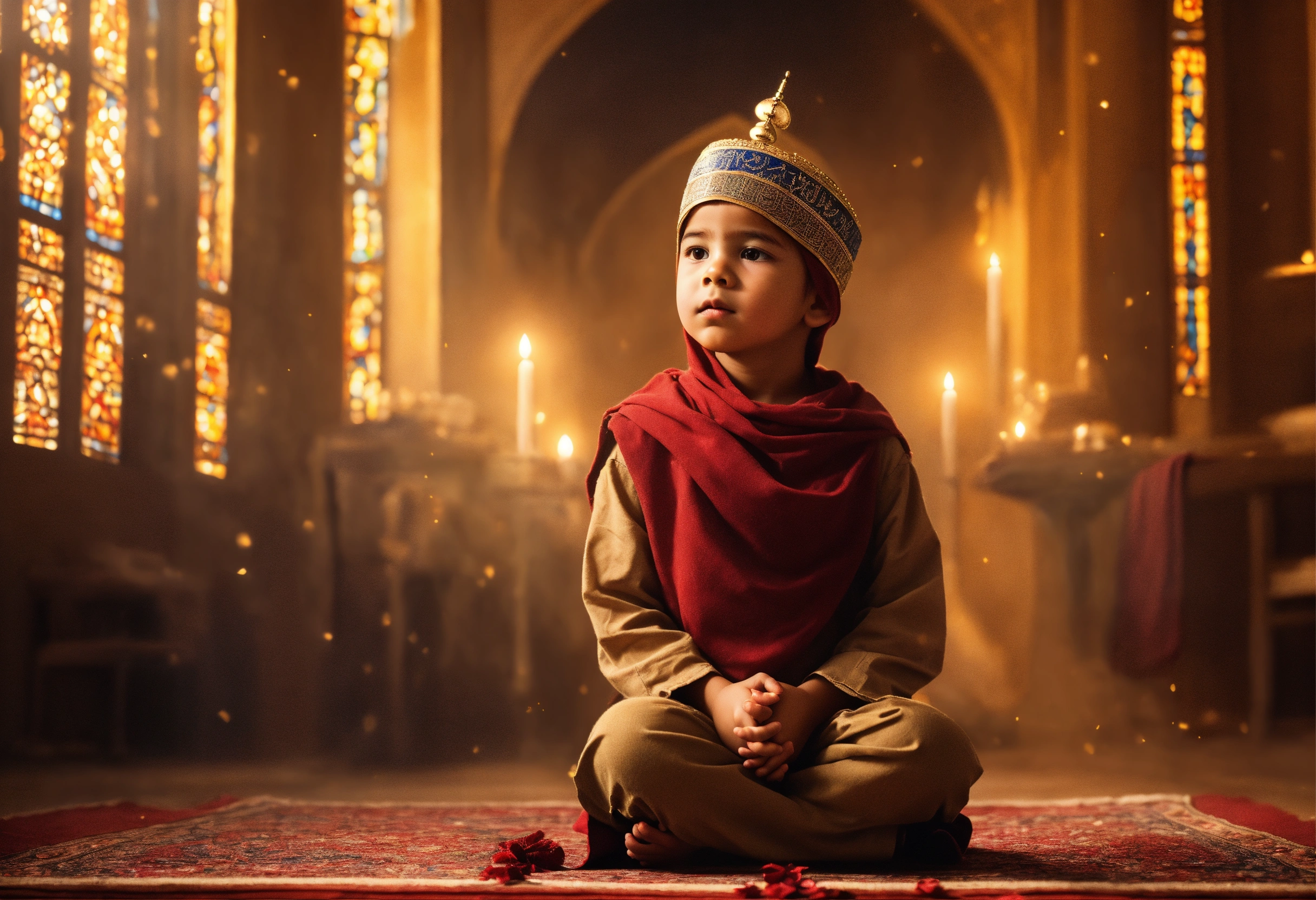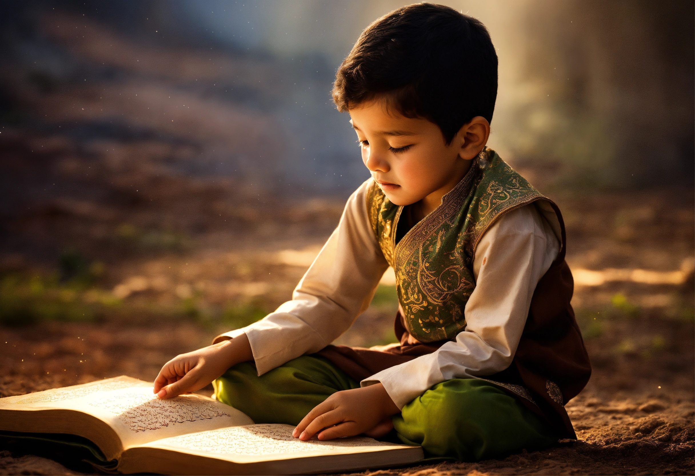 Create a series of visually engaging images that depict the story of a child's faith test from quran khani part 16. the images should convey the emotions and key events of the story. please provide a brief description for each image image 1 show a young child in a thoughtful pose, symbolizing the beginning of their faith