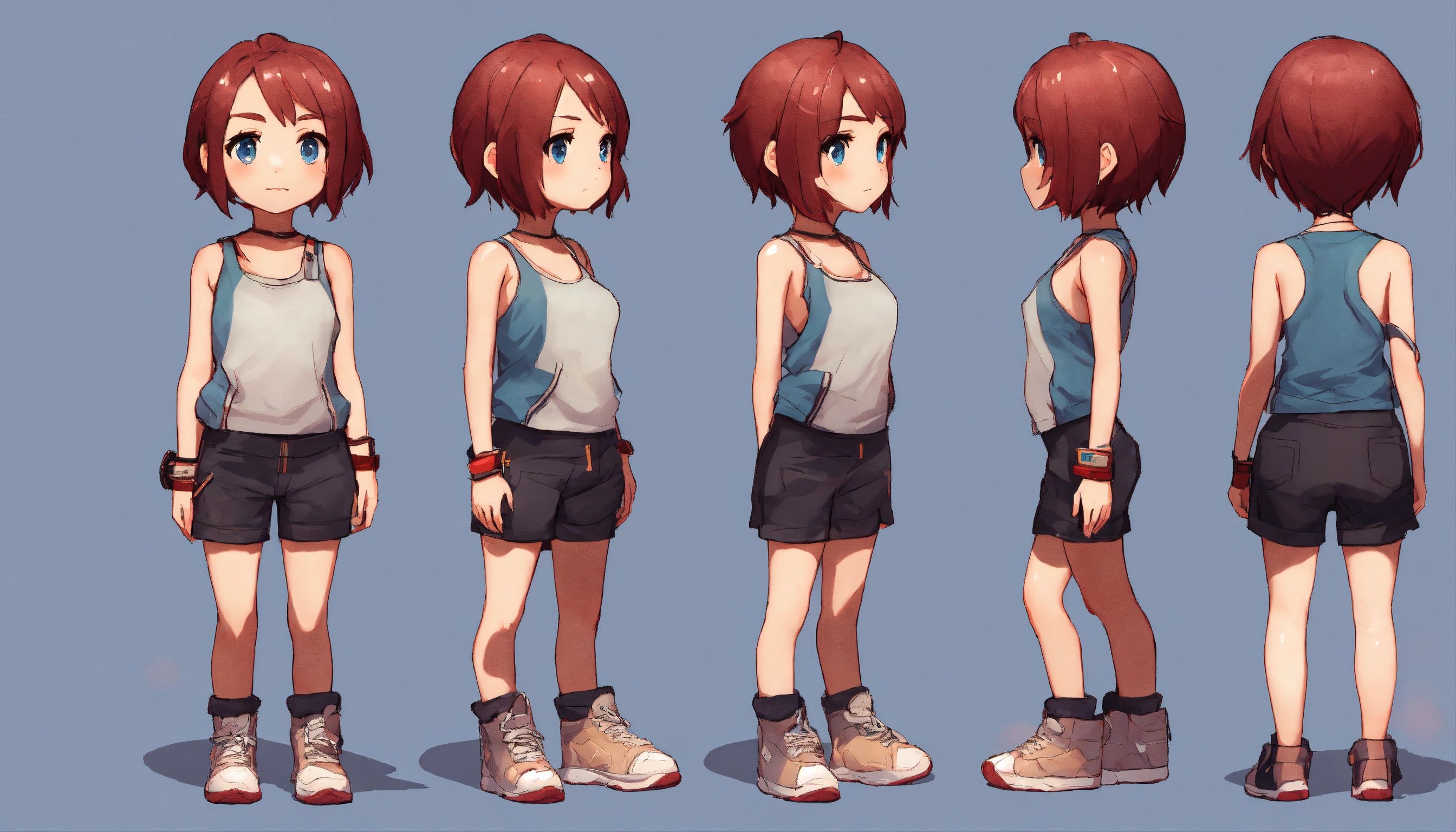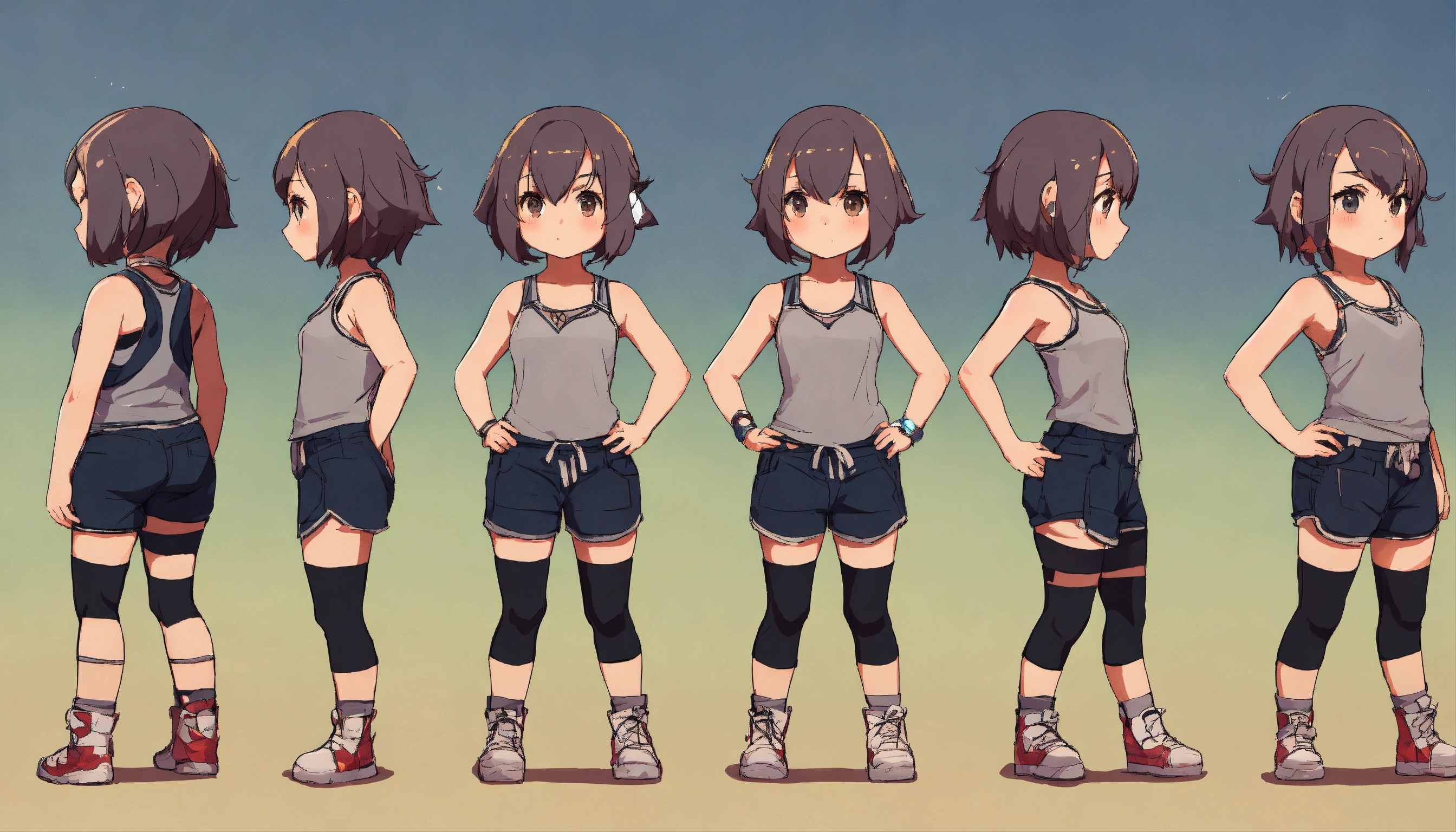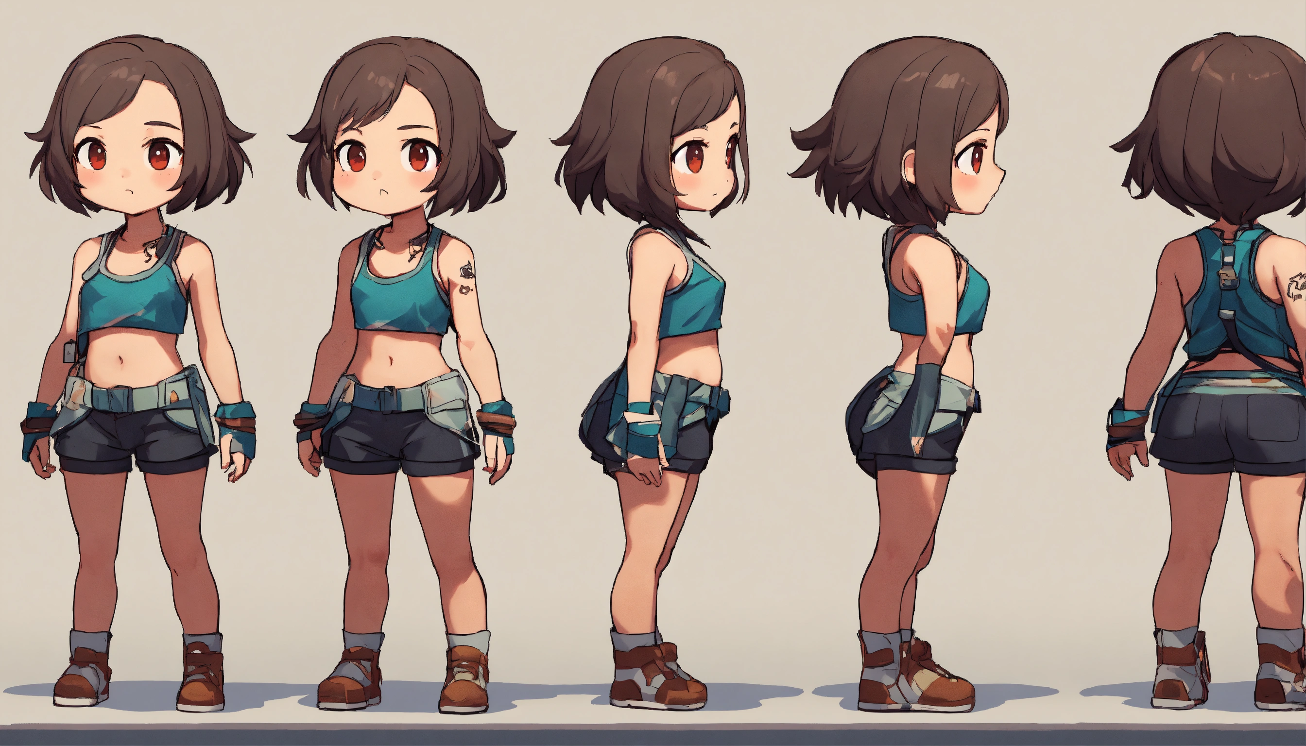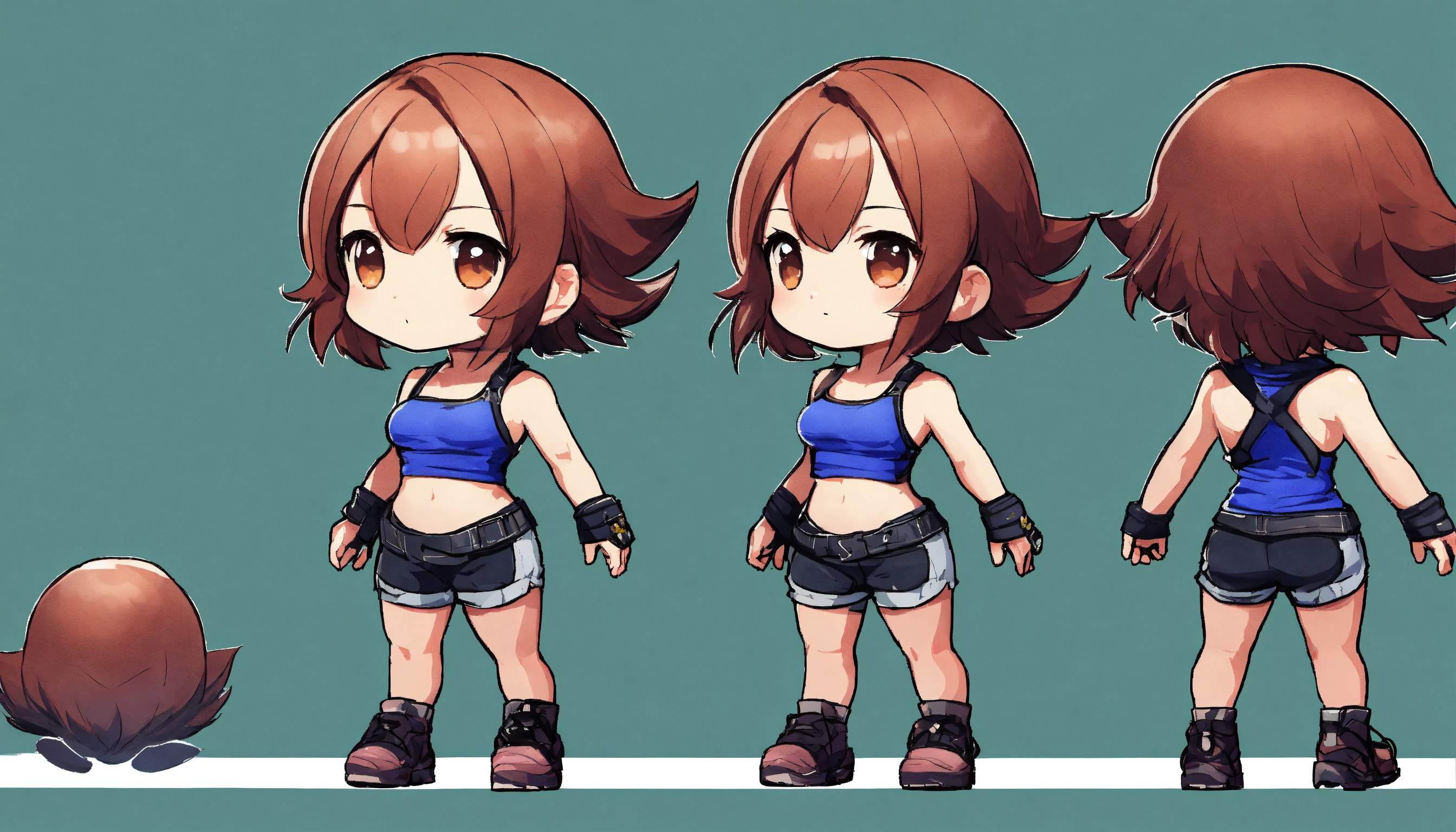 Game art, short haired girl wearing tank top and shorts, multiple poses, full body view, side view, chibi proportions, blank background, artstyle from the game ragnarok