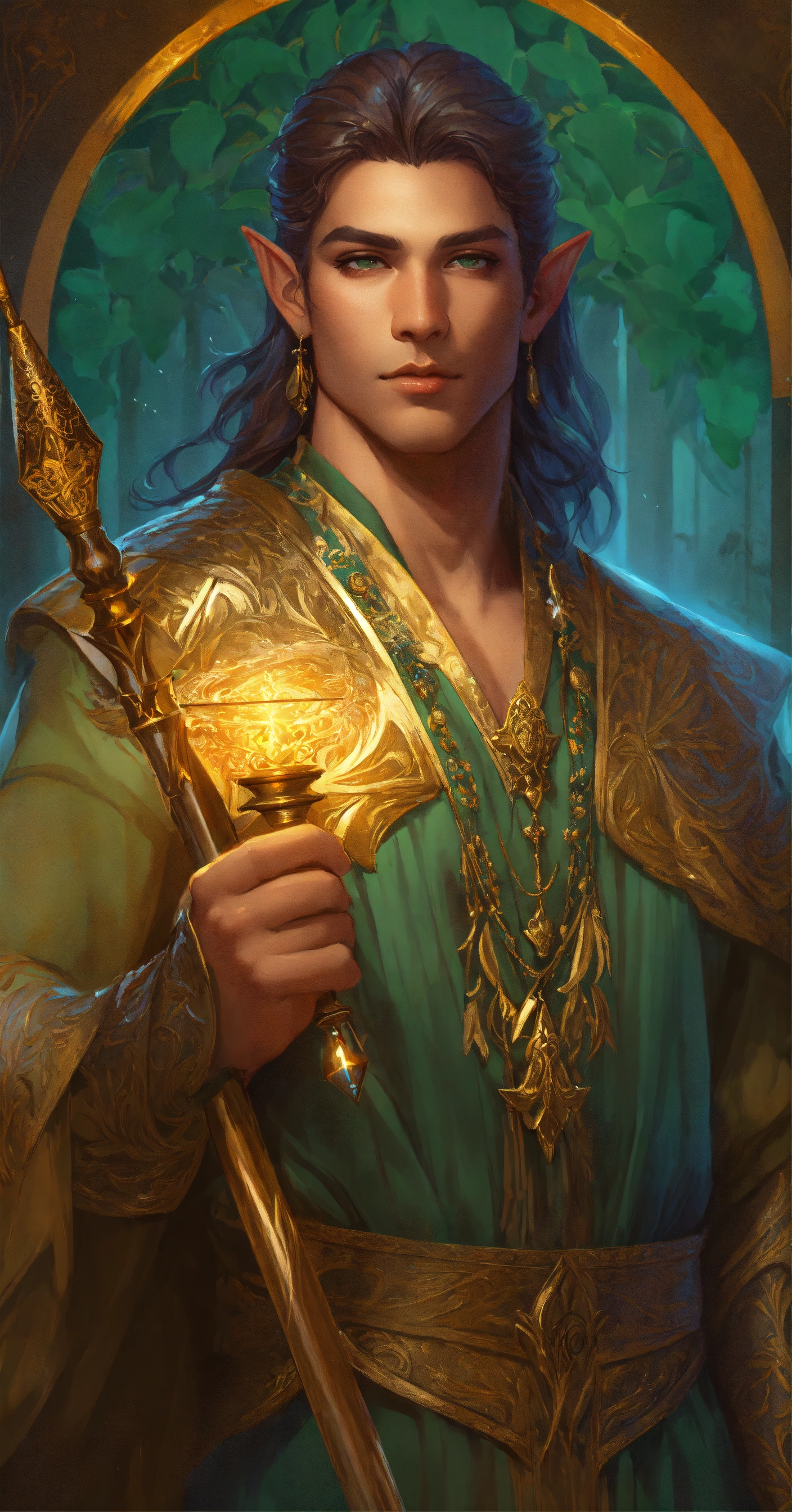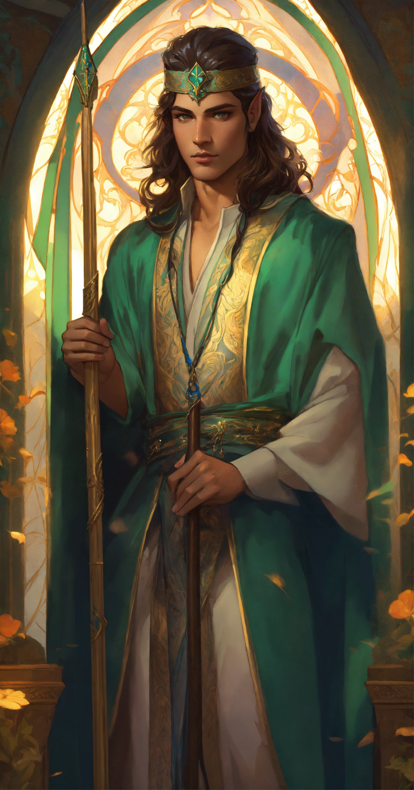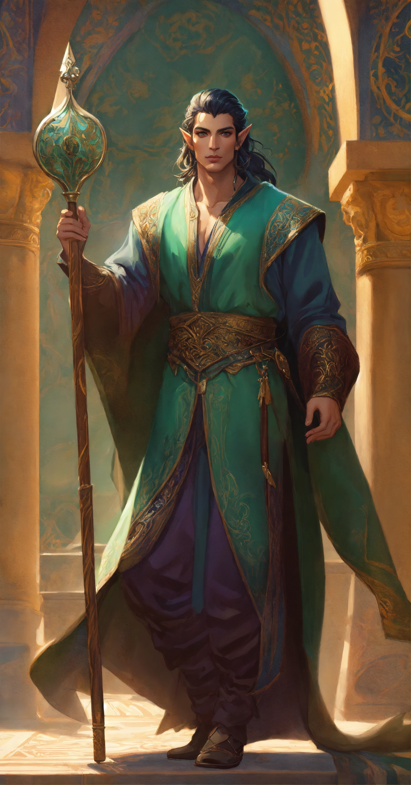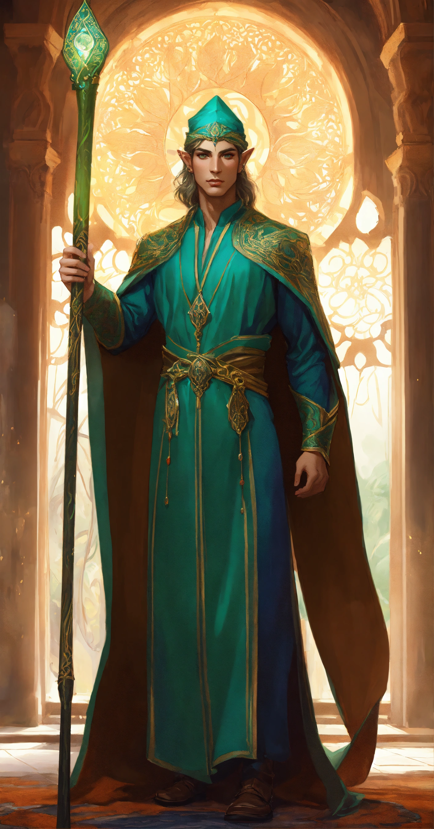 Persian male elf wizard with magical staff, high cheekbones, full body, long hair, hazel green eyes, highly detailed, digital painting, artstation, concept art, smooth, sharp focus, illustration, art by artgerm and greg rutkowski and alphonse mucha, erte, 8 k