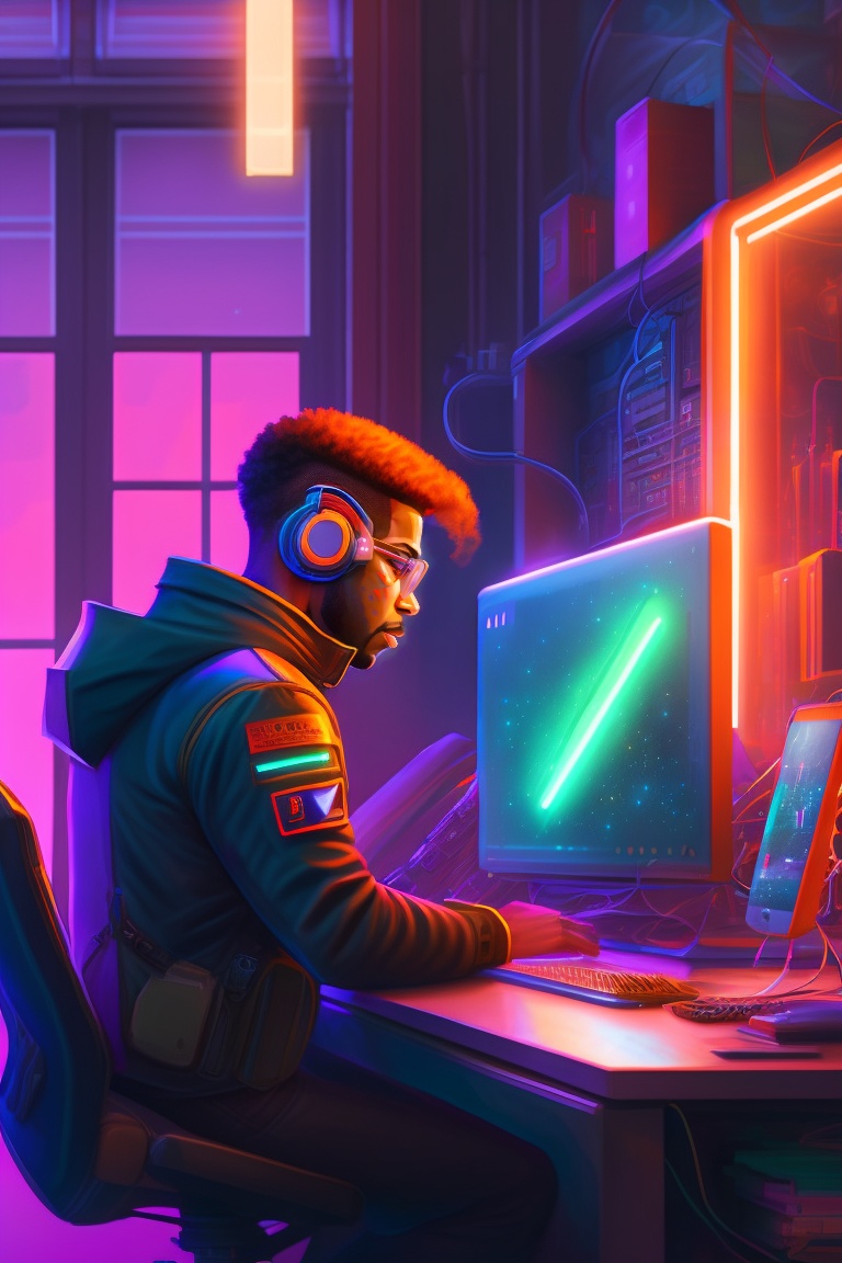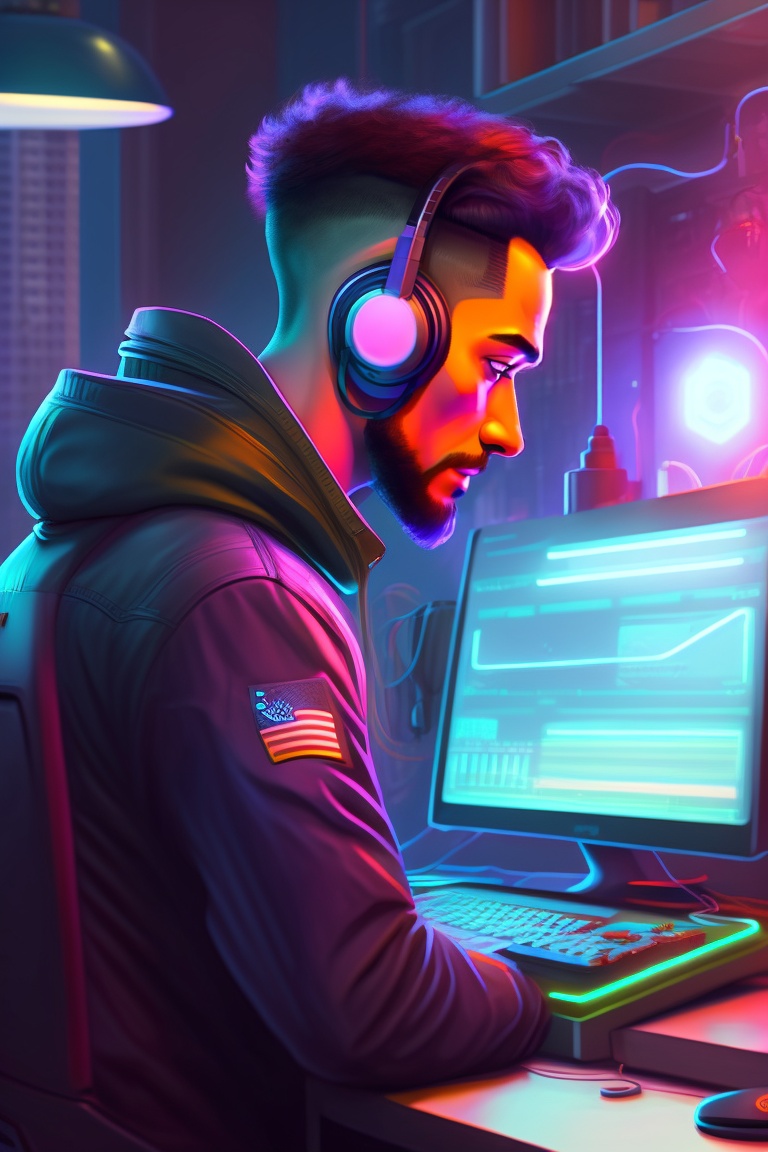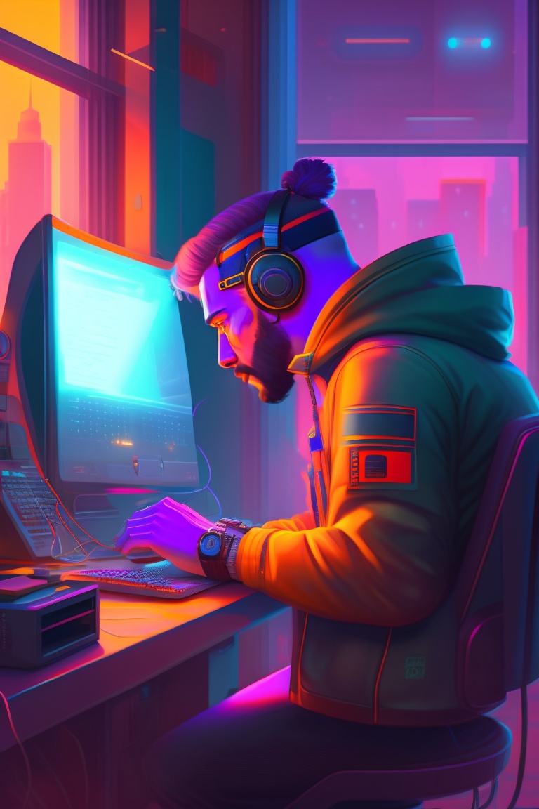 A vibrant artstation illustration of a tech savy man typing away at a computer workstation, room illuminated by workstation monitor, headphones, cyberpunk, by greg rutkowski