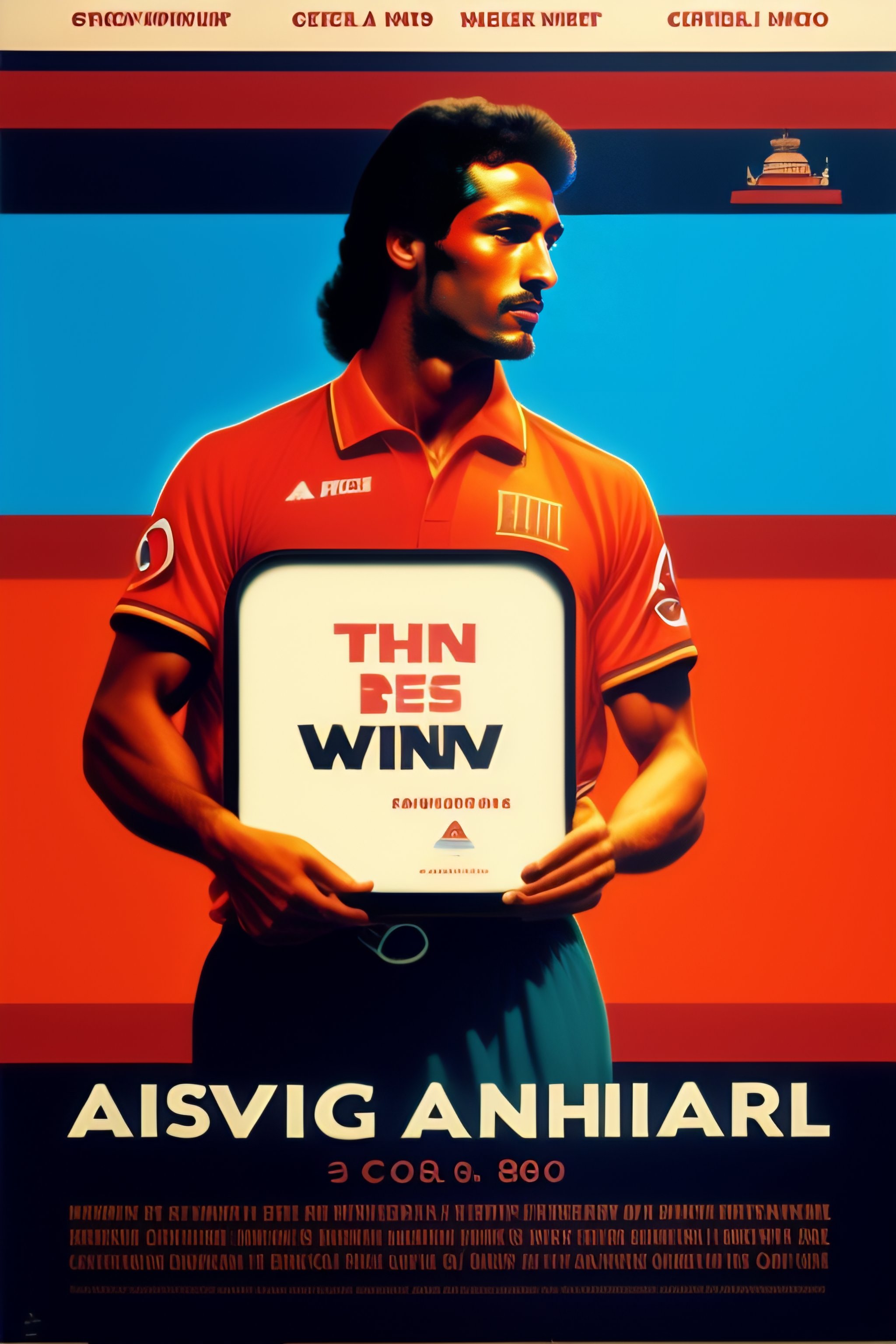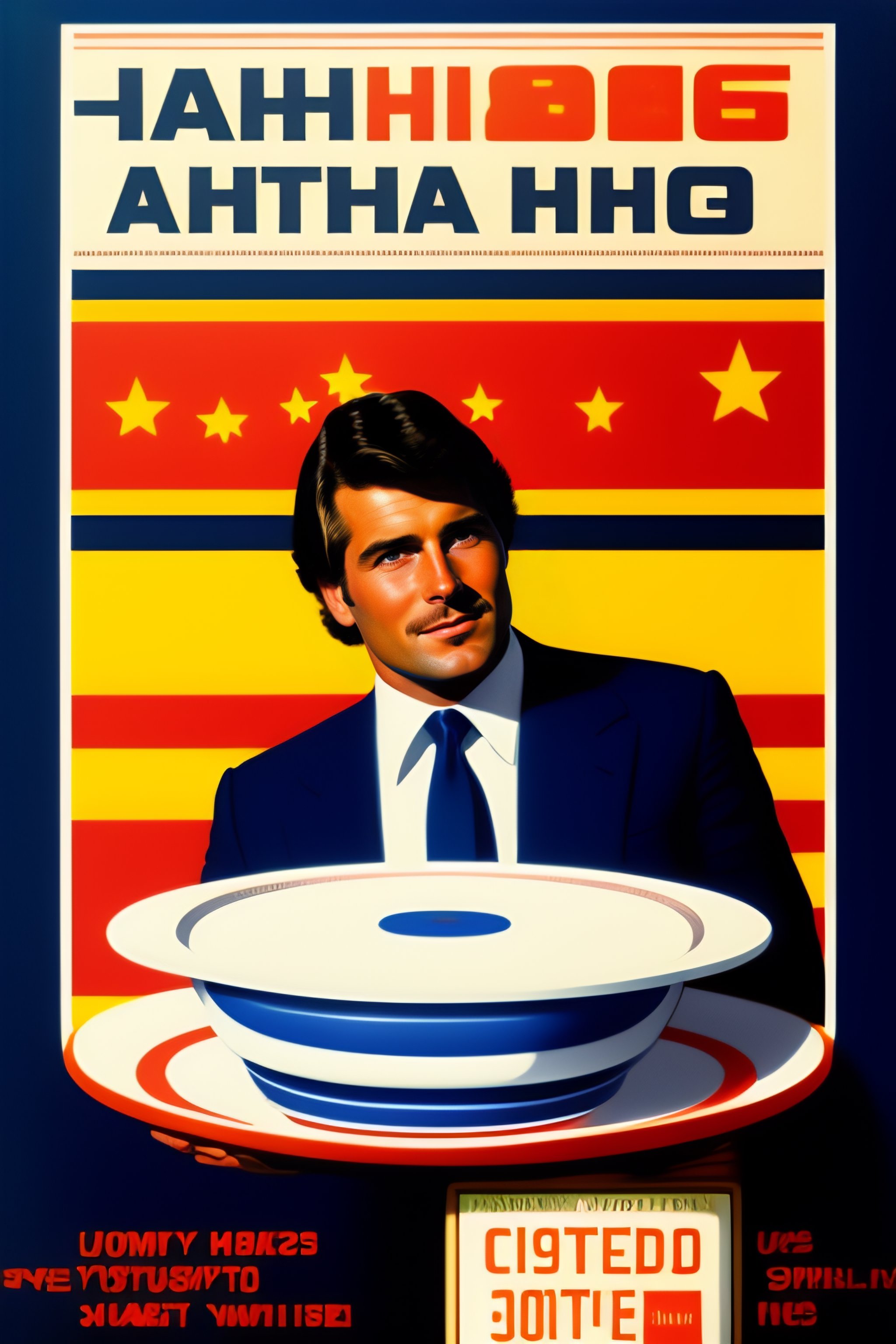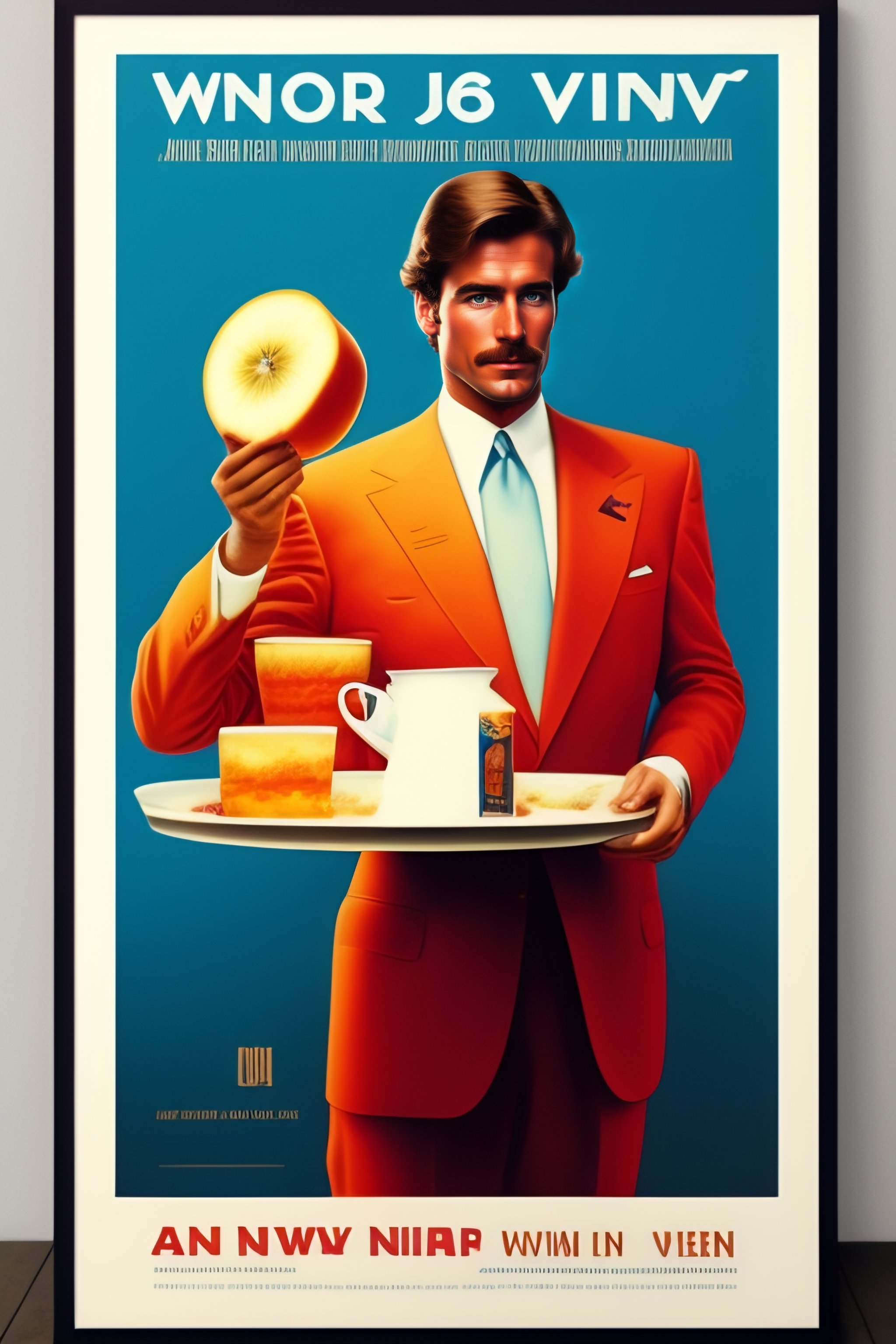 Aword winning poster design from the 80's, a man standing and presents a product on a plate in the style of the 1980s usa