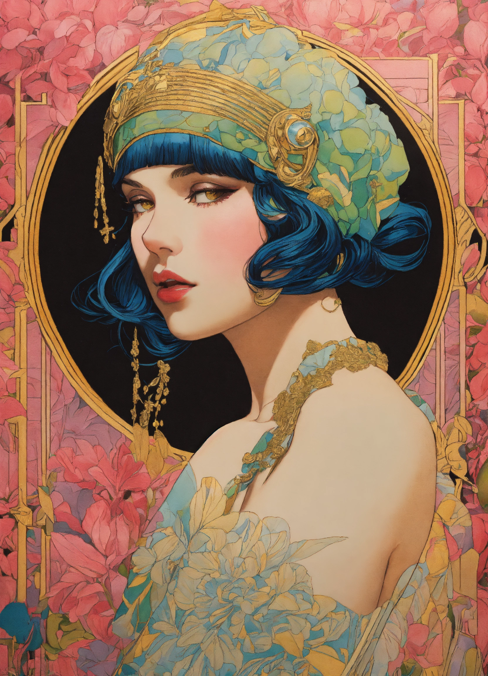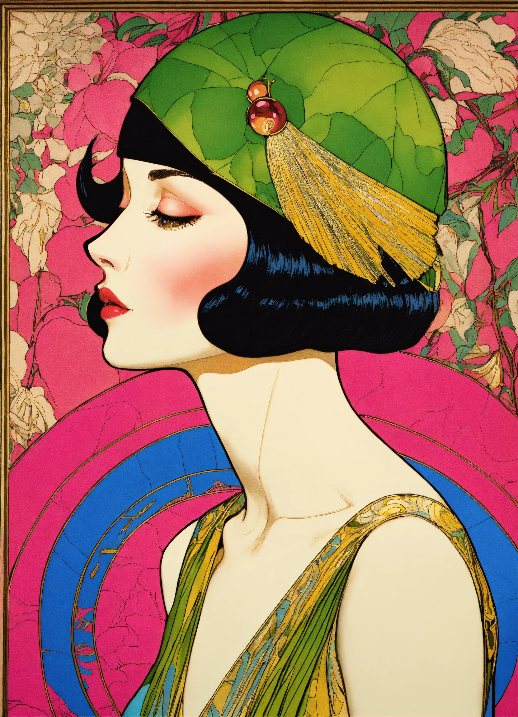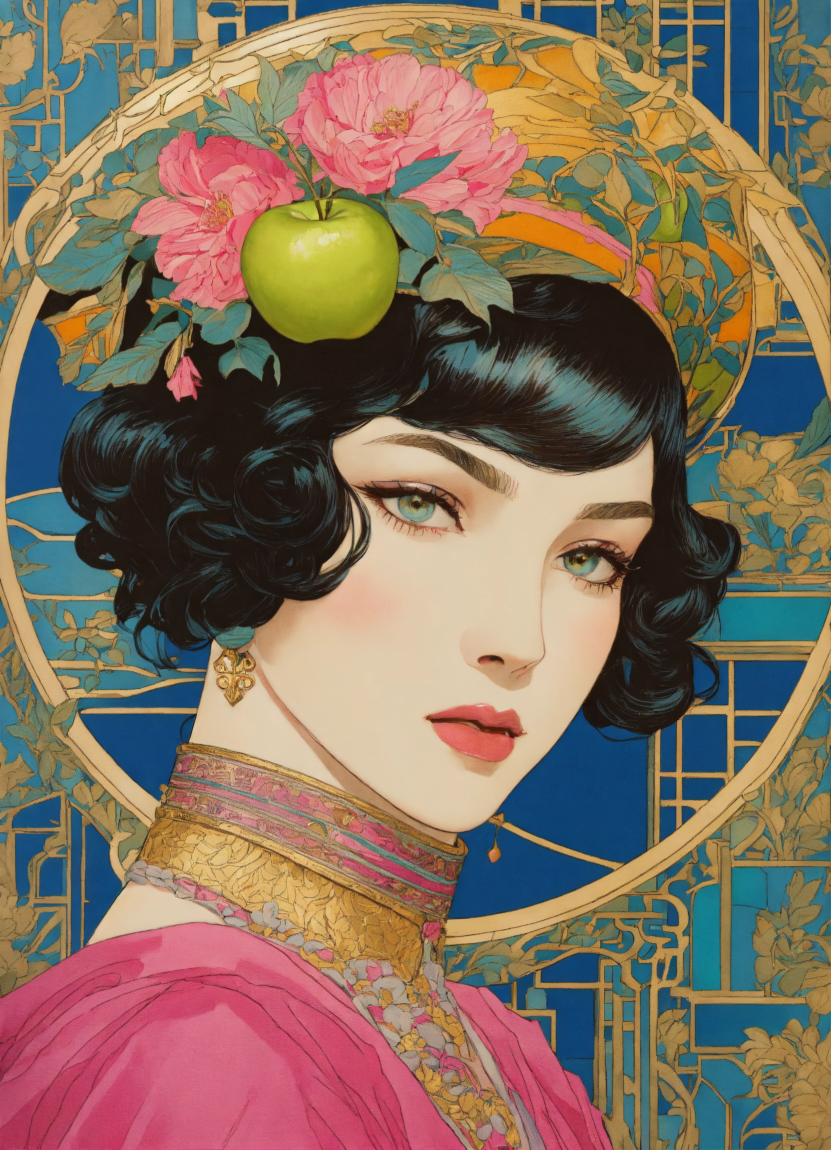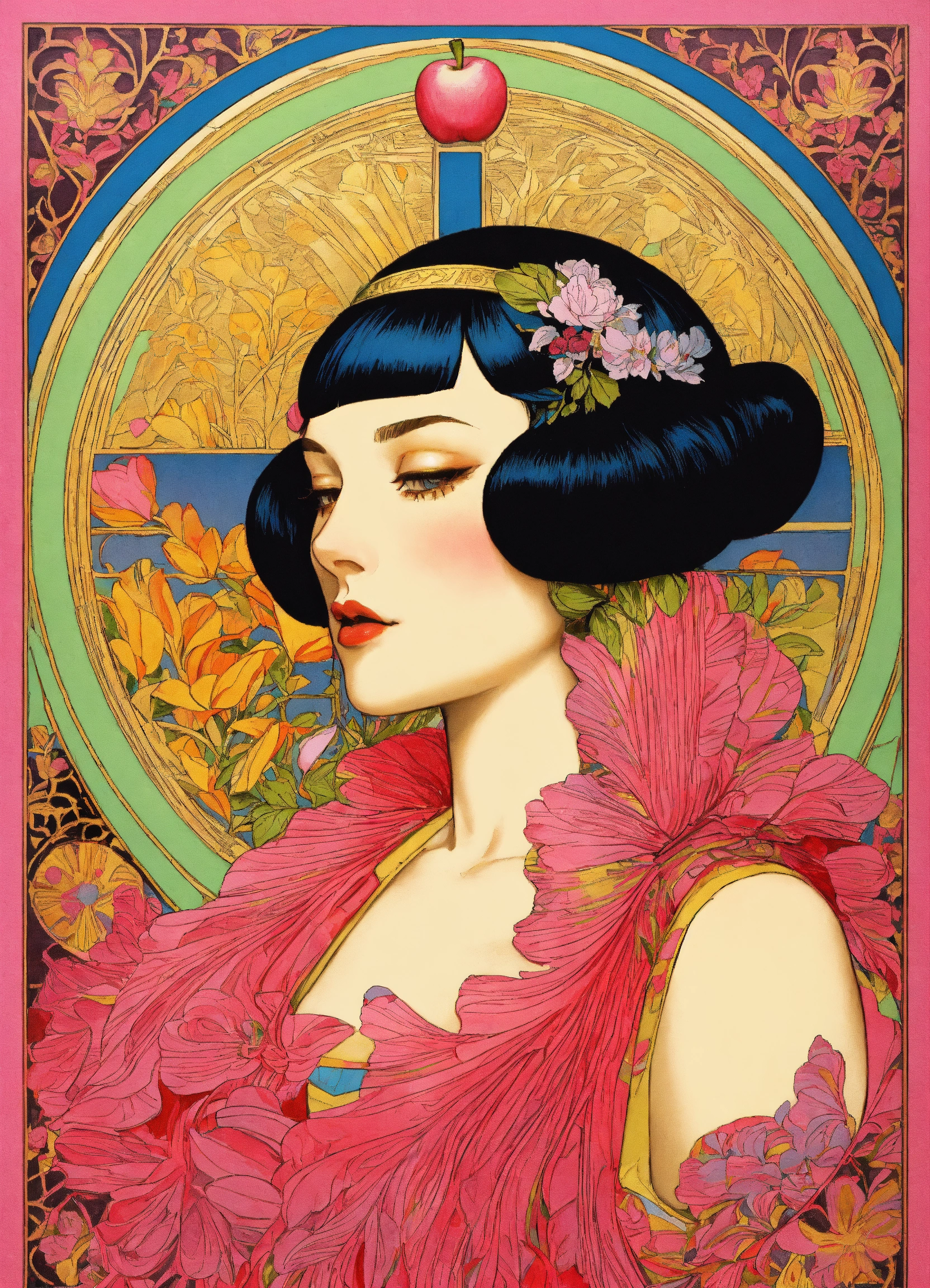Pop art deco every surface covered in intricate contour lines, highly detailed line work in colored lines in hot pink, blues, golden oranges, lime green engraved illustration by j. c. leyendecker and albrecht durer and gustav klimt with gold gilt highlights, gold leaf, portrait of a beautiful 1920s flapper snow white with her black hair cut to chin length holding a large green apple in a white snowy forest, in the style of full color, intaglio engraving, contouring, hashes, cross hashes, stippling, ultra - photorealism, ultra - detail, with intricate fine line work, color in line only, 4 - color plates, plus gold gilt, colored lines, fills the entire artboard