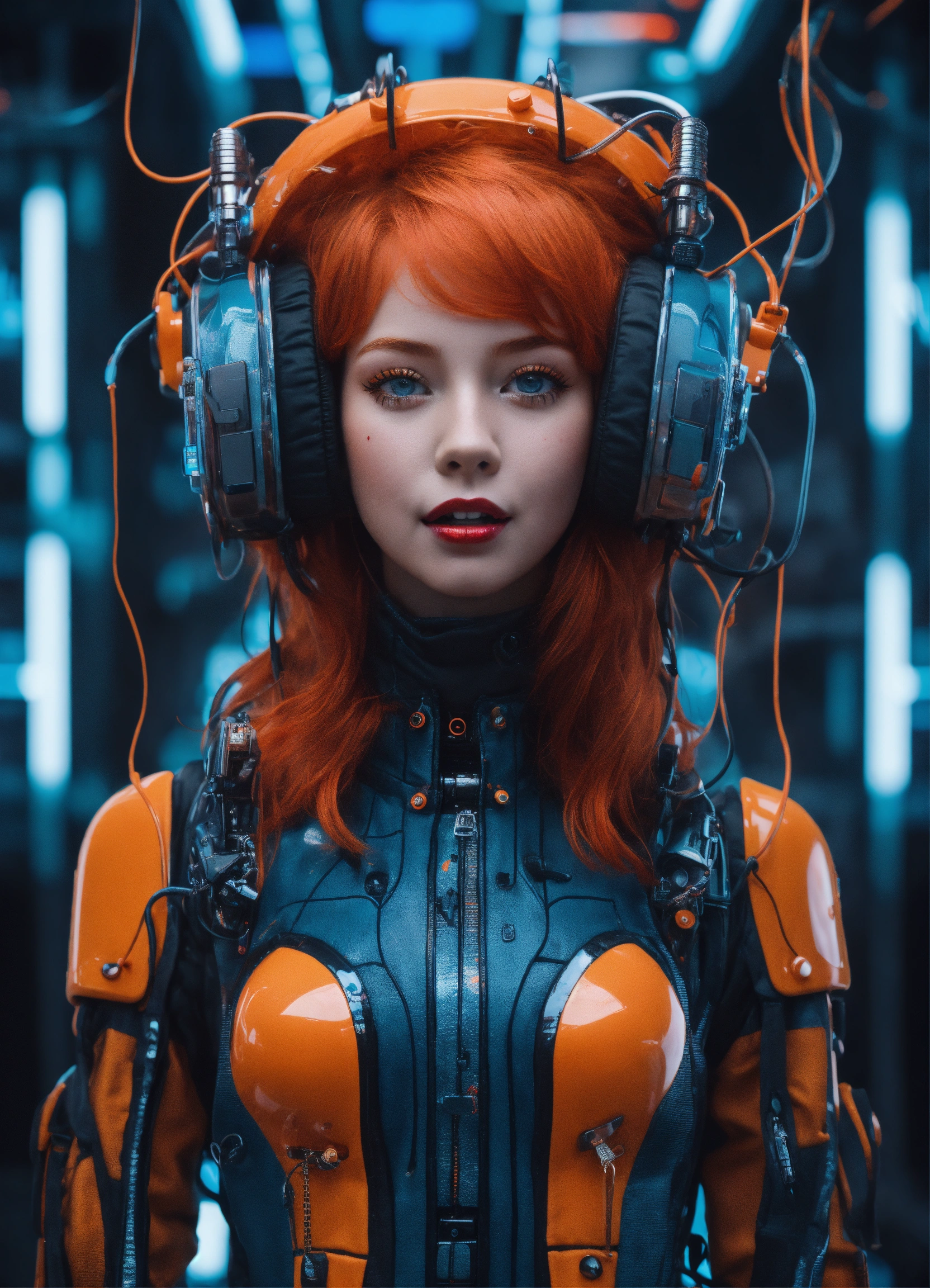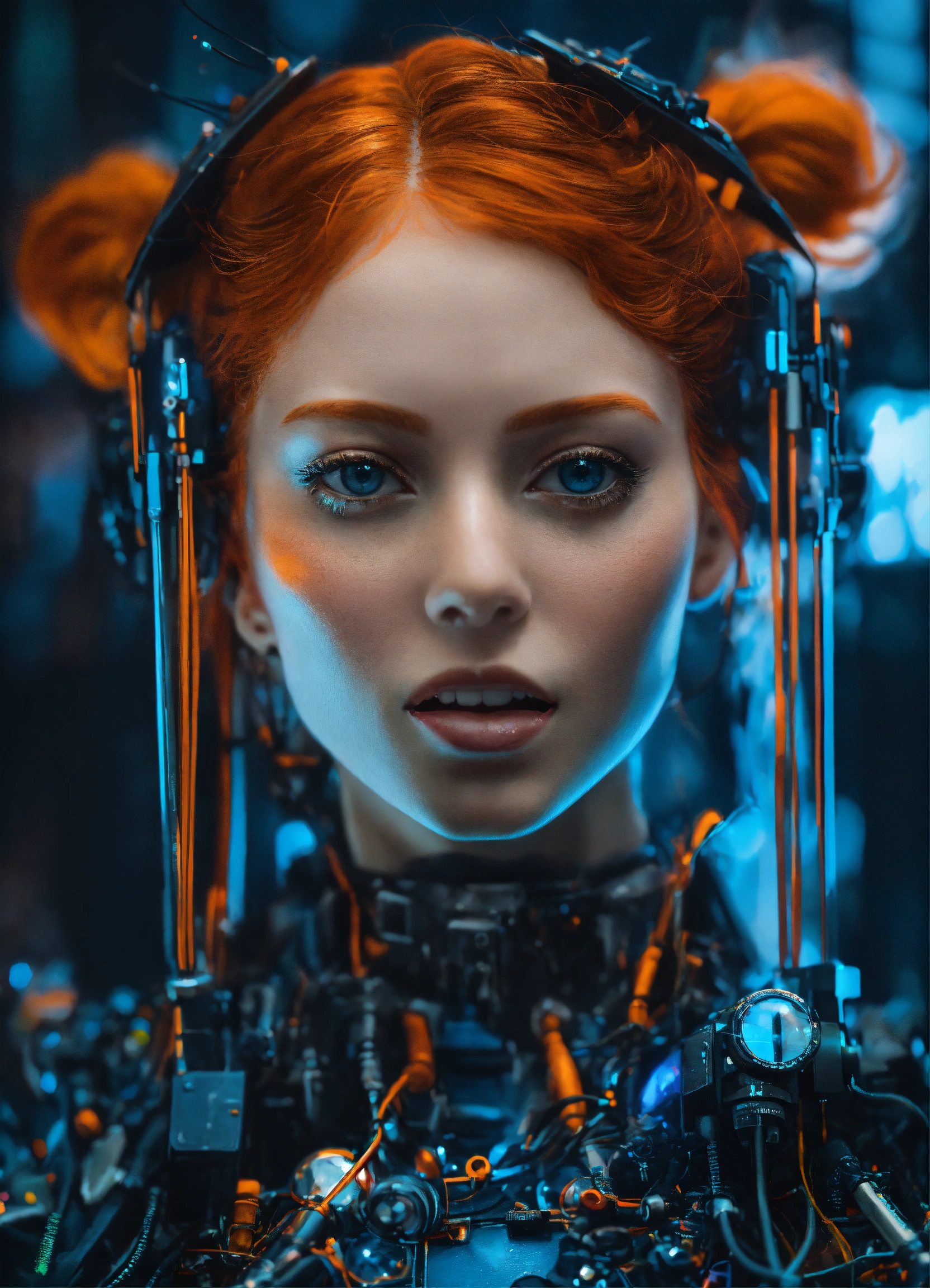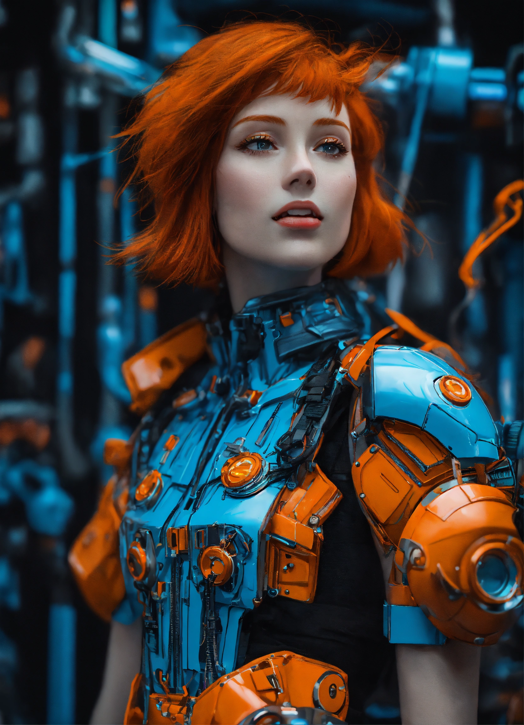 A closup of a excited and happy redhead girl, in the style of cyber punk surrealism, mobile sculptures, blue and orange saturation, black background, tinkercore, made of glass, vaporwave, grey academia