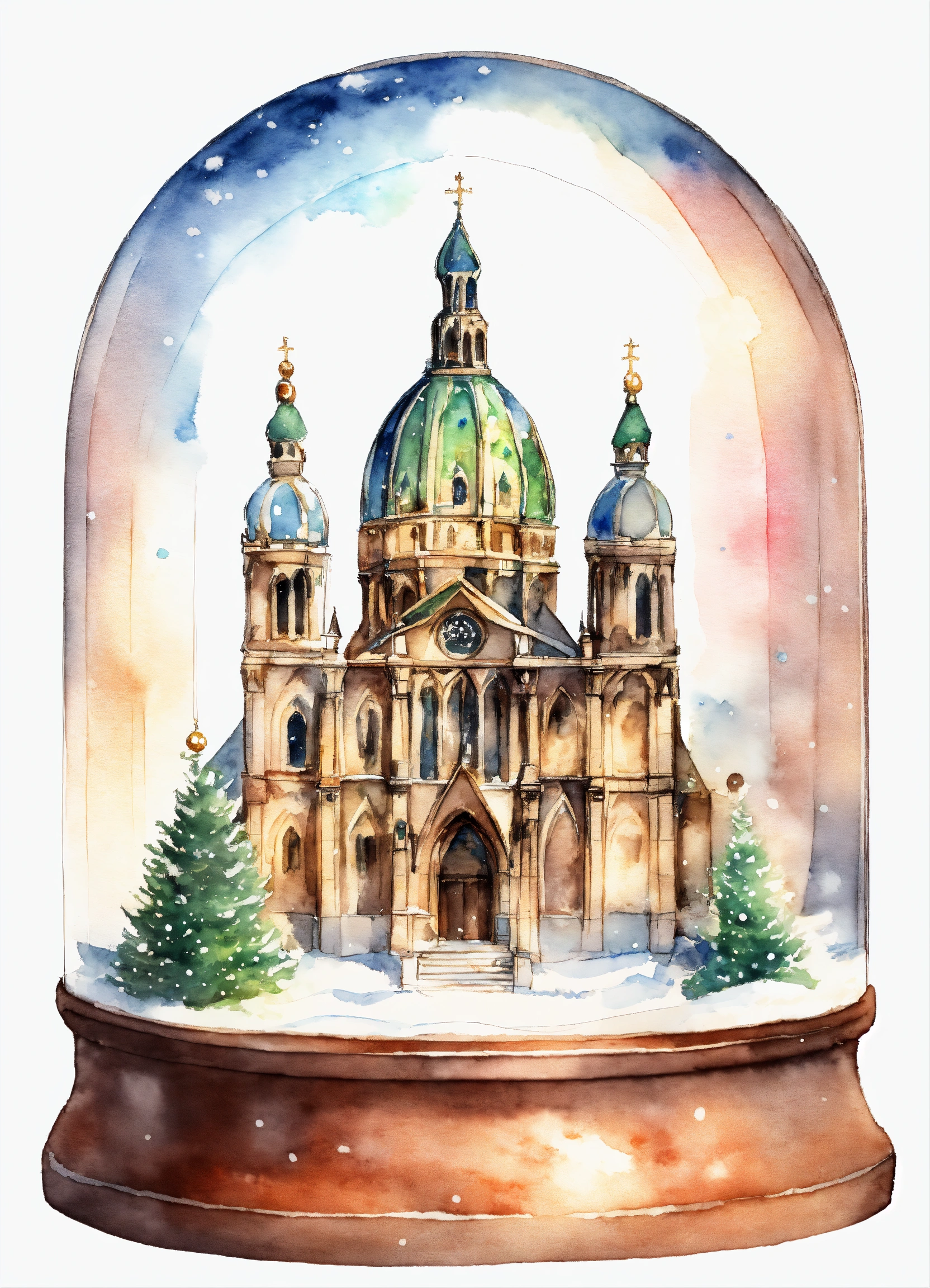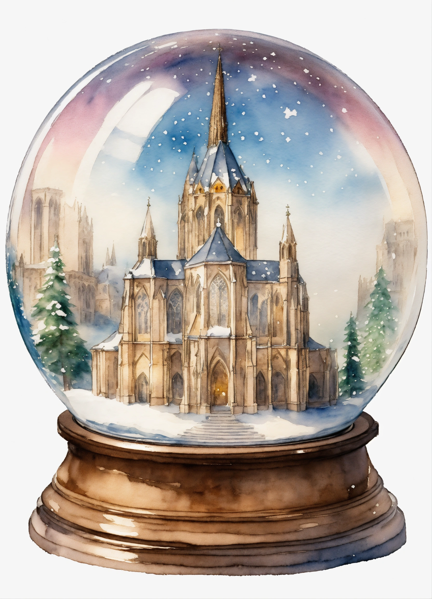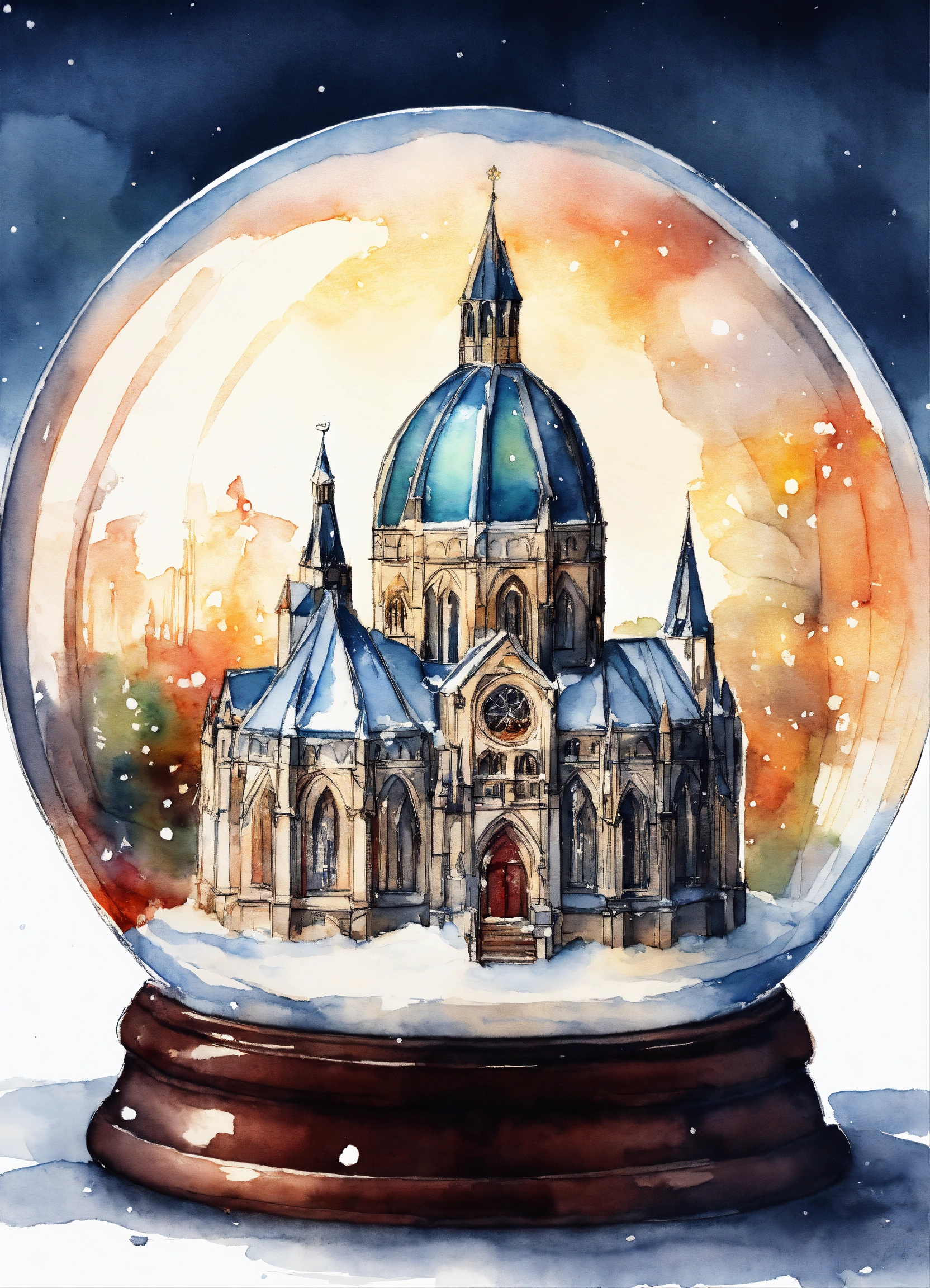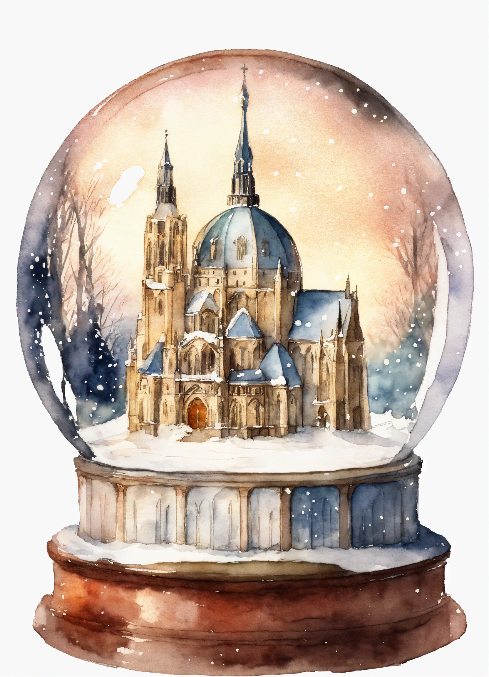A spherical toy snowglobe with a one-tower french gothic cathedral inside of it, it's snowing inside the snowglobe, drawing and light watercolor style, plain white background, 8k.