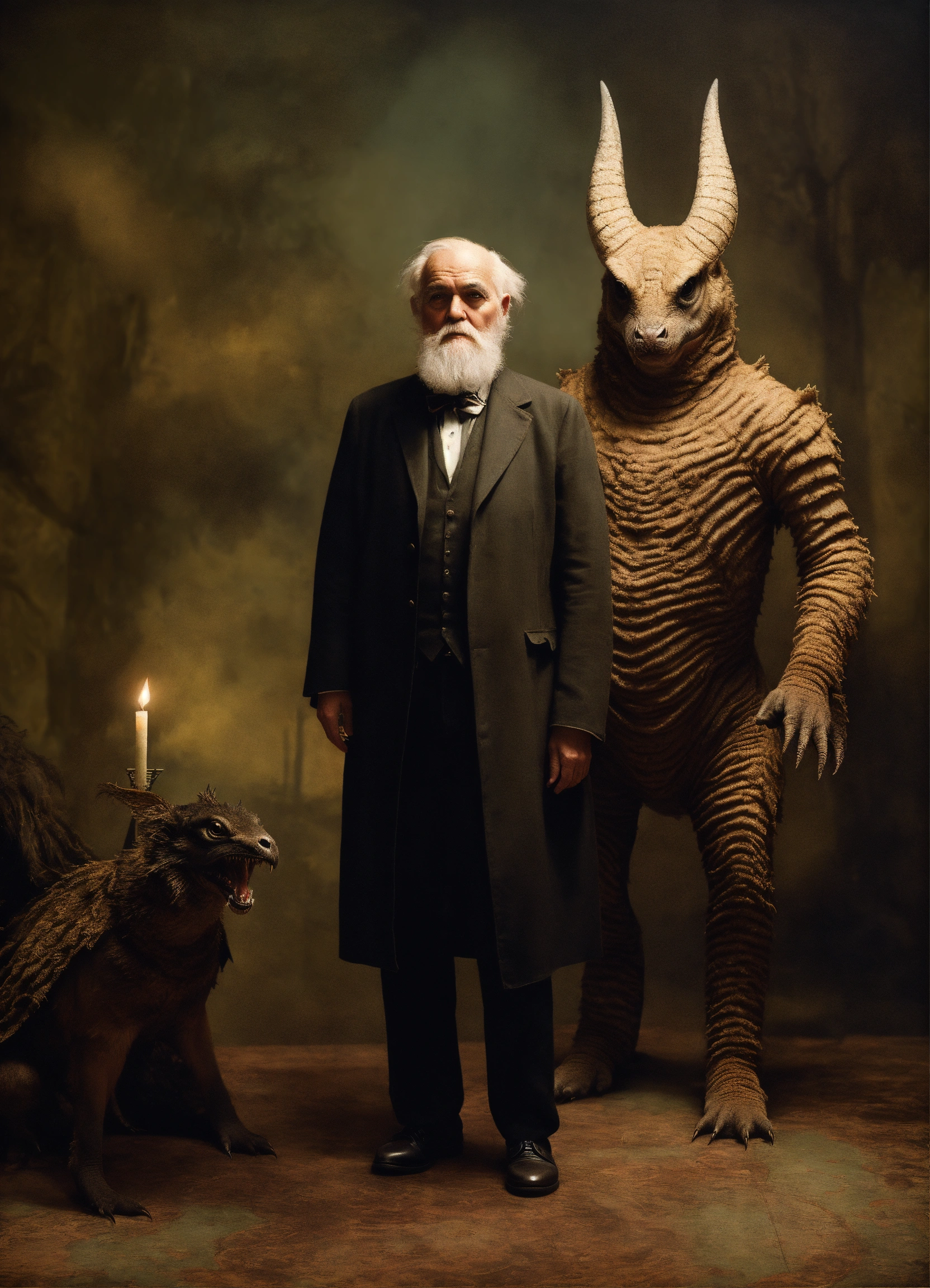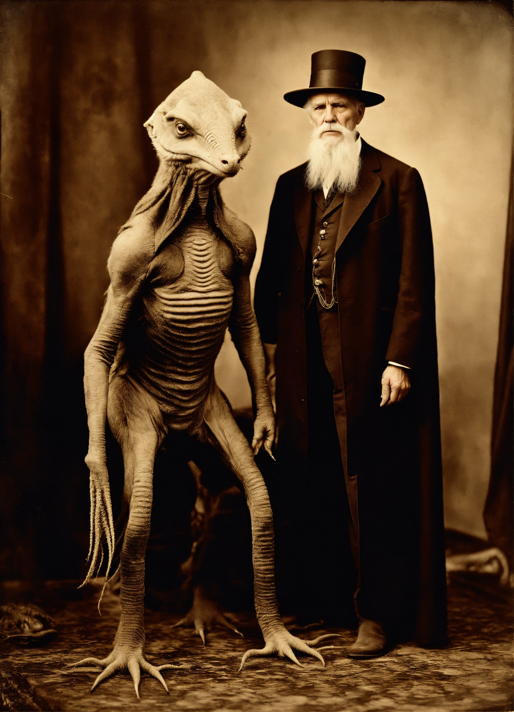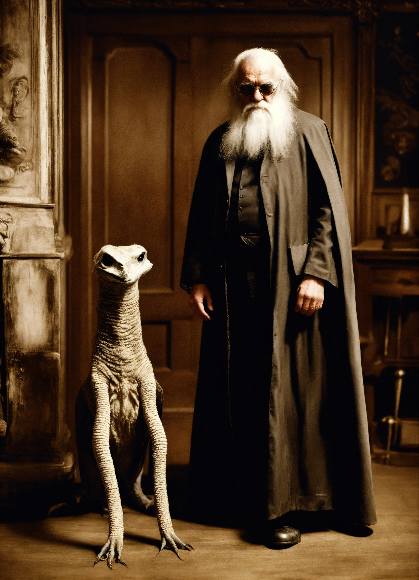 Old man wearing a superhero costume standing next to anstrange creature, in the style of contemporary vintage photography, necronomicon illustrations, tabletop photography, 1890, hyperrealistic animal portraits, ghostly presence, whirring contrivances