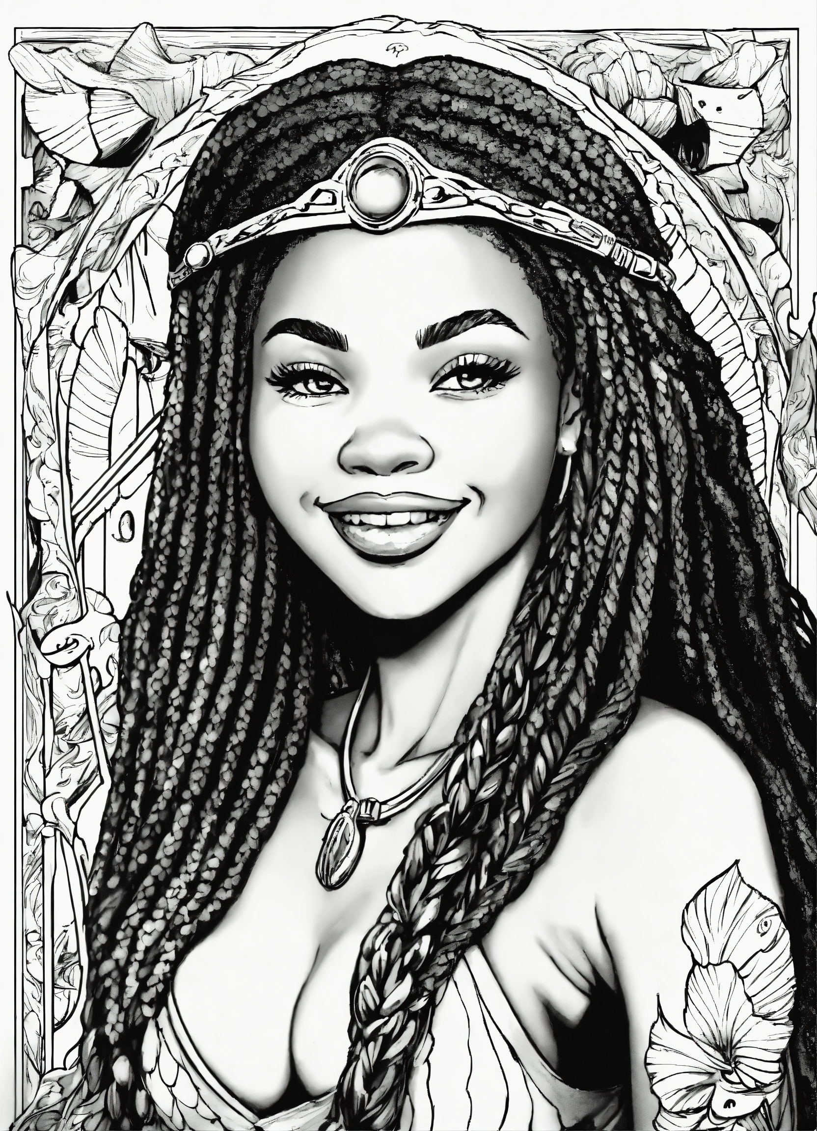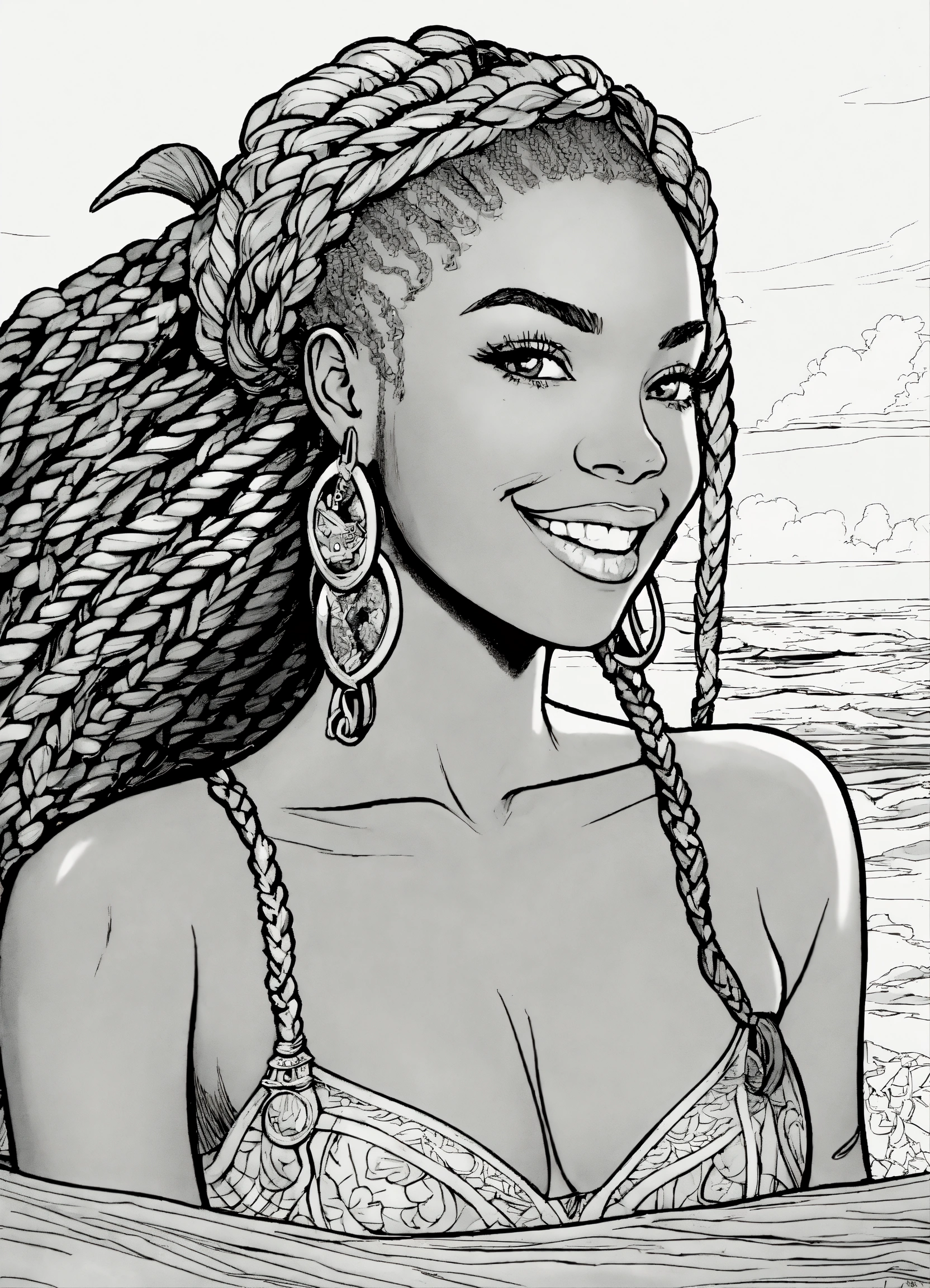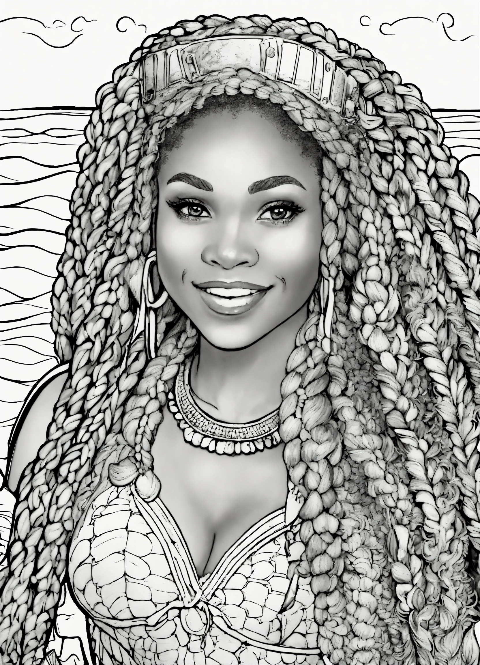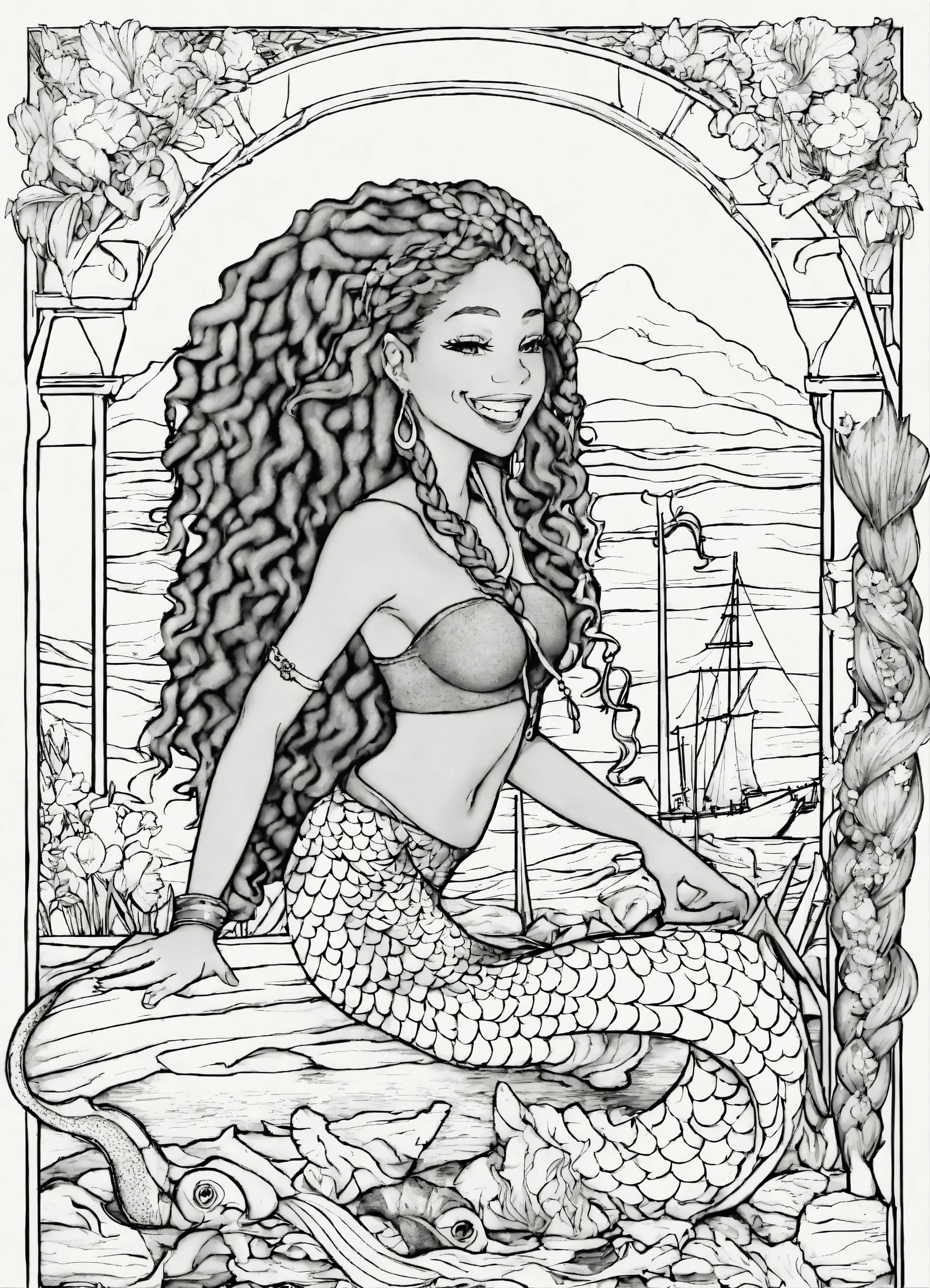 African american smiling mermaid blank sin with braids is a coloring page featuring a shipwreck, realistic design.