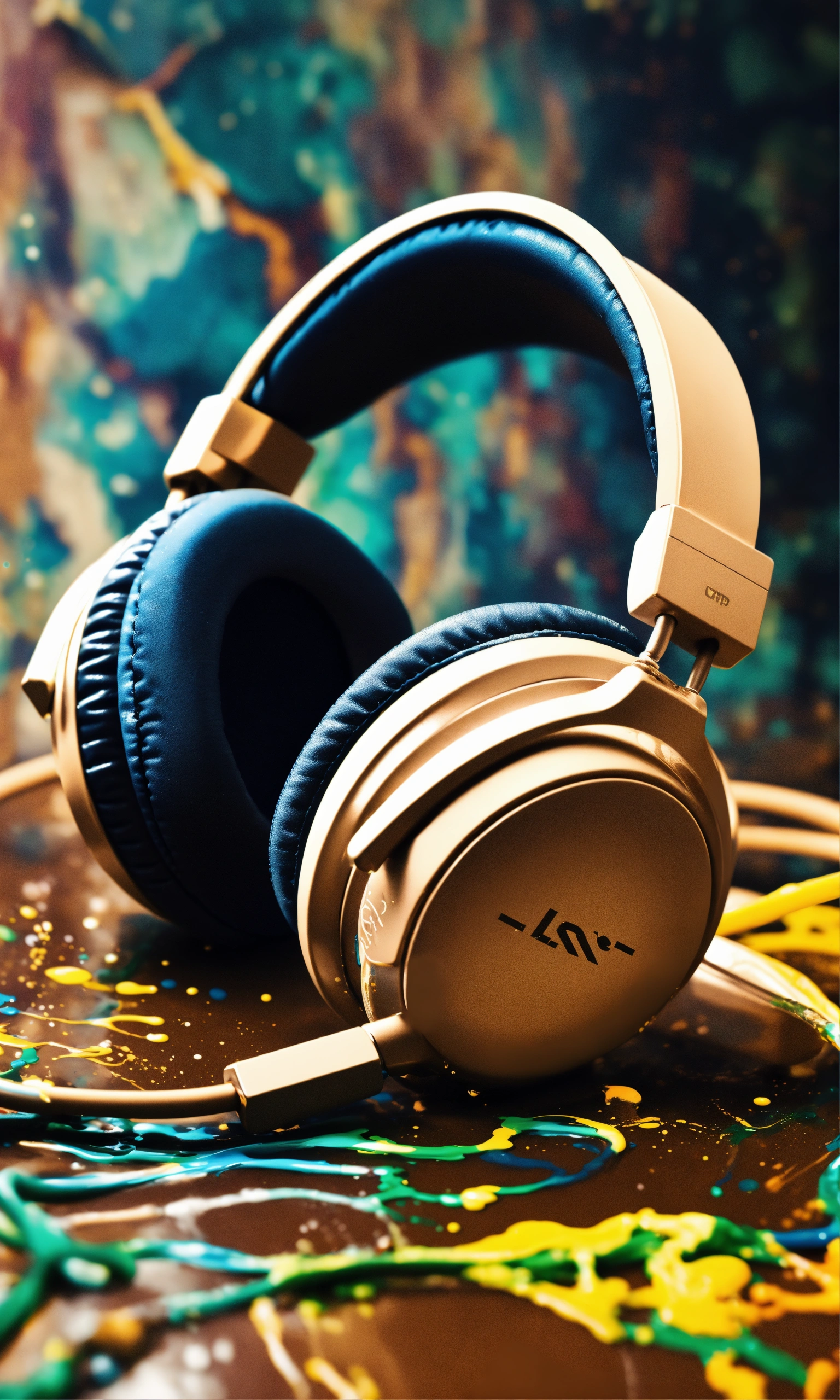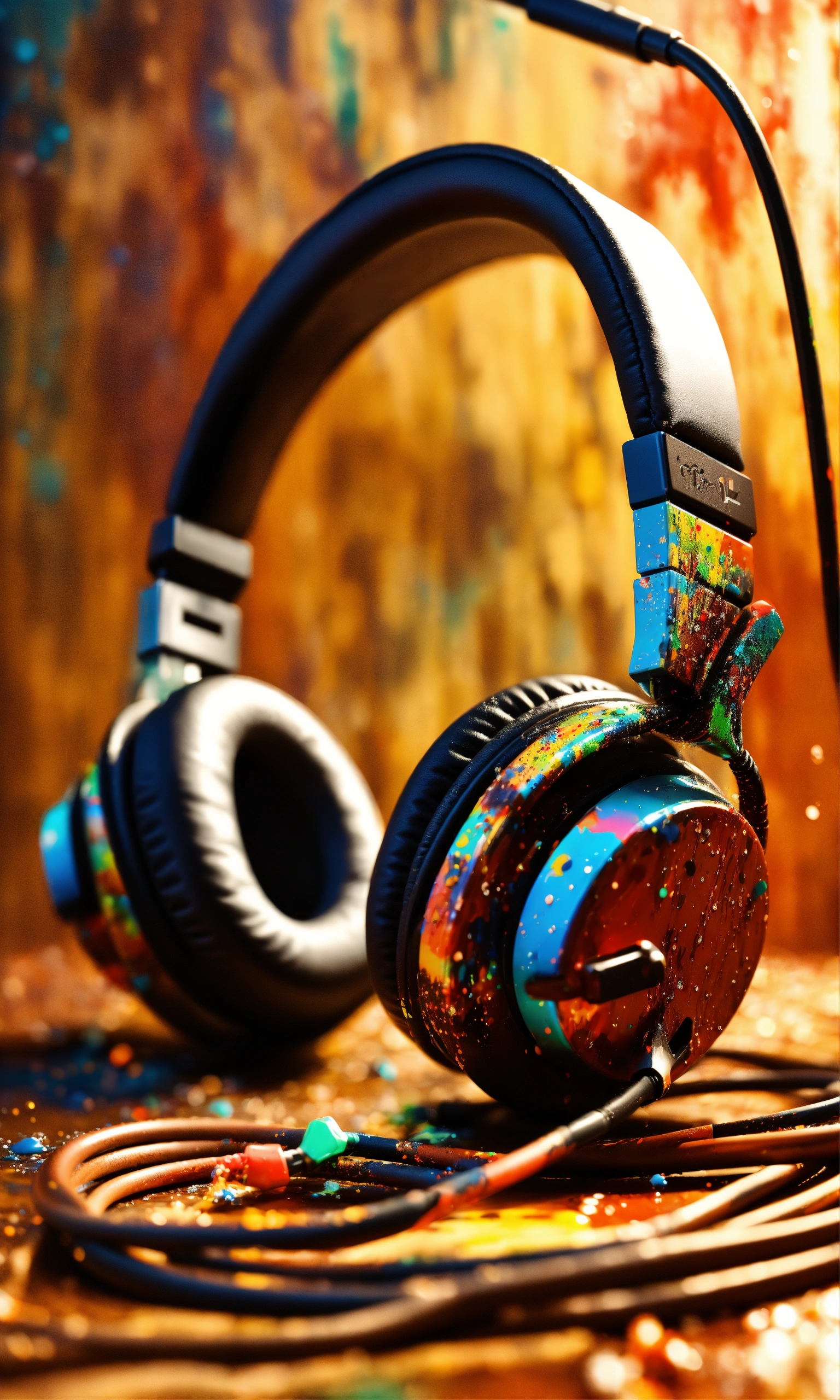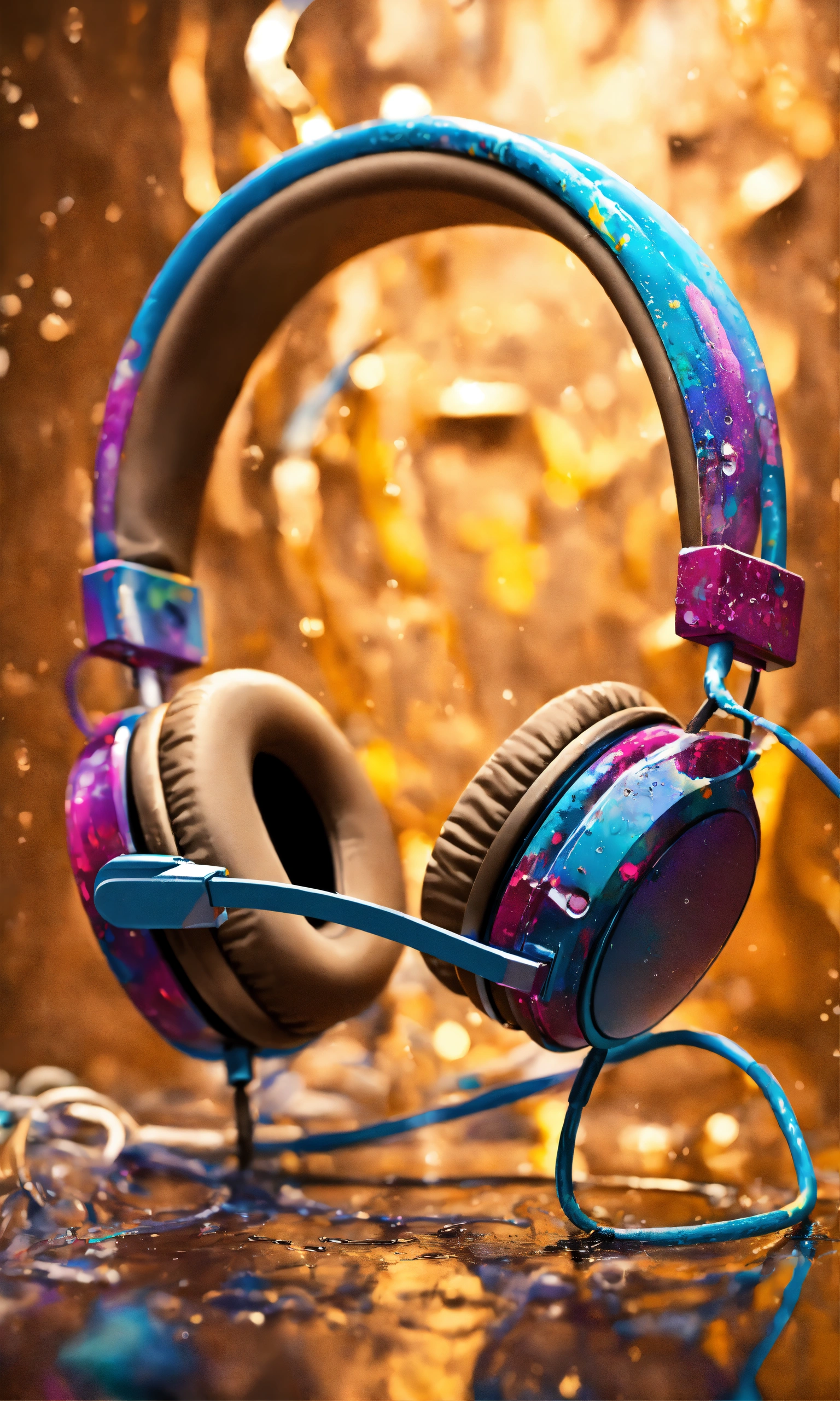 Drip paint headset. usb-c cables tangled with hdmi cables colorful brilliant tones. paint splatters in sepia toned background. water condensation effect, photograph, hyper realistic, intricate detail