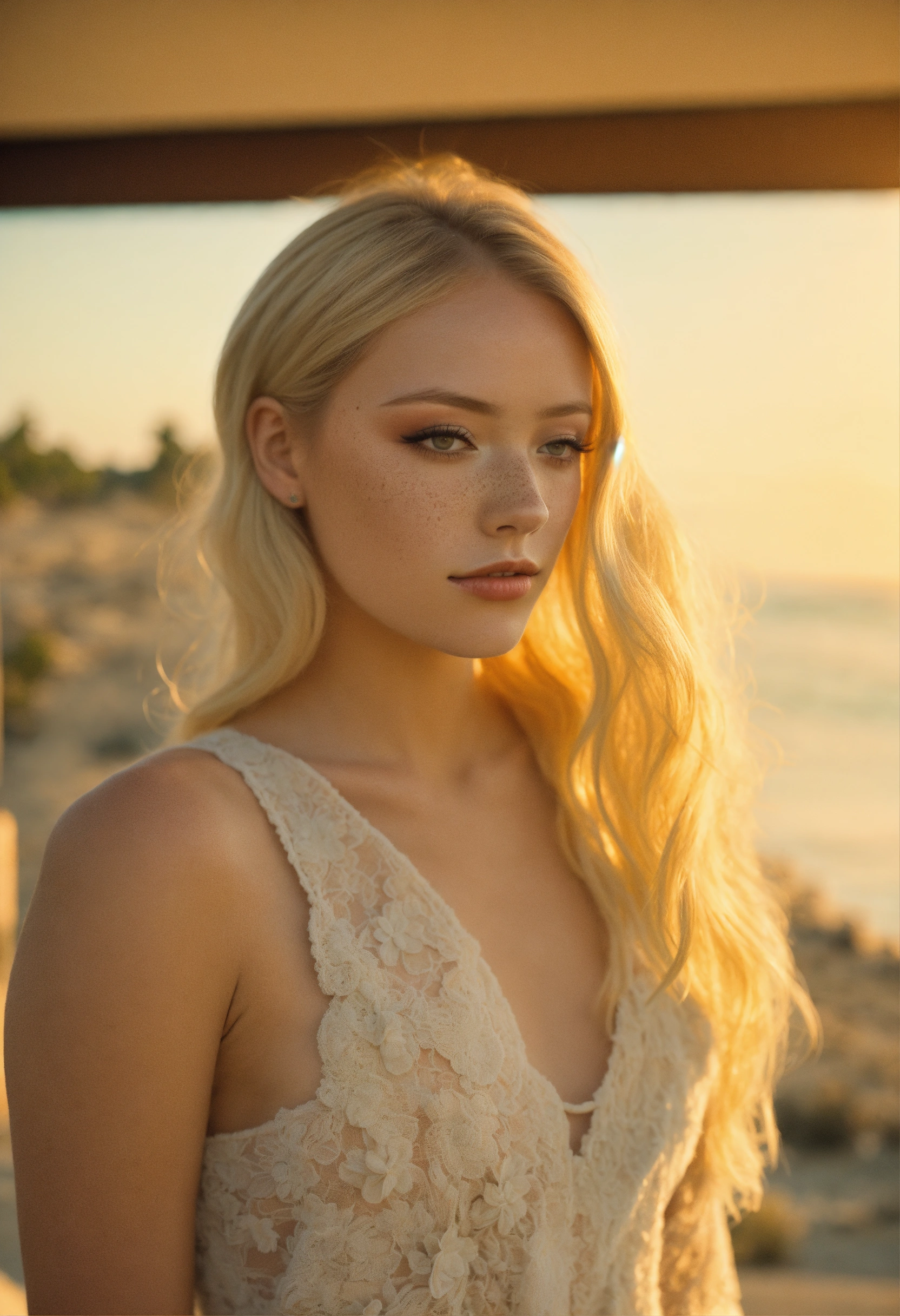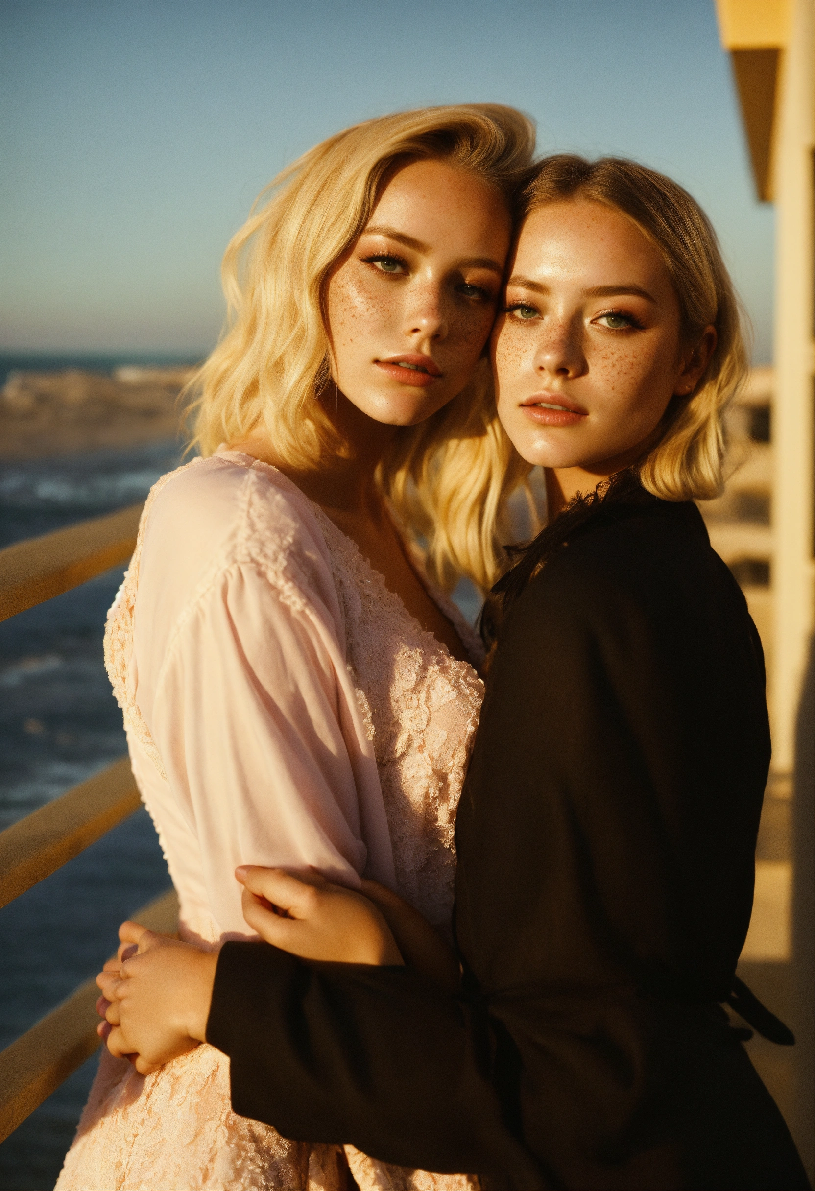Kodachrome two models 1st-model=<blonde-amber(maika-monroe heard><wearing-formal-makeup> hugging 2nd-model=<brunette-effy-stonem><wearing-formal-makeup> kissing love pastel-goth, beach sunrise, hotel balcony high-depth cinematic symmetry central point of composition soft realistic skin, freckles