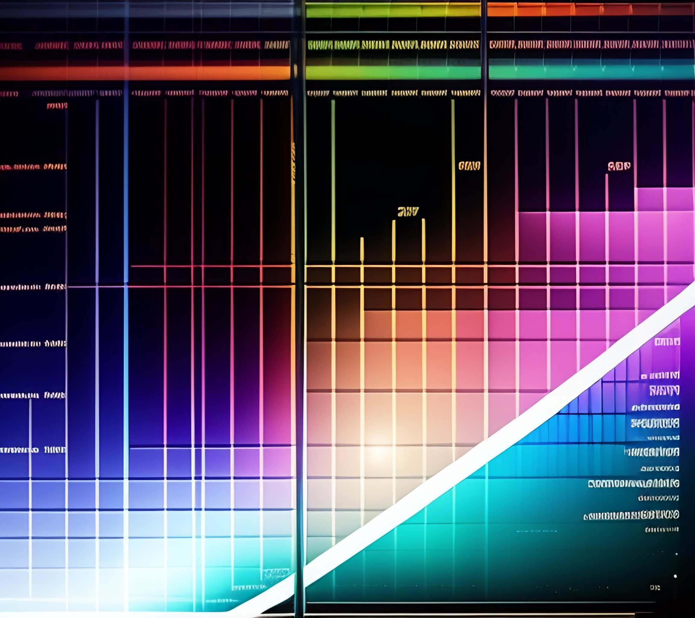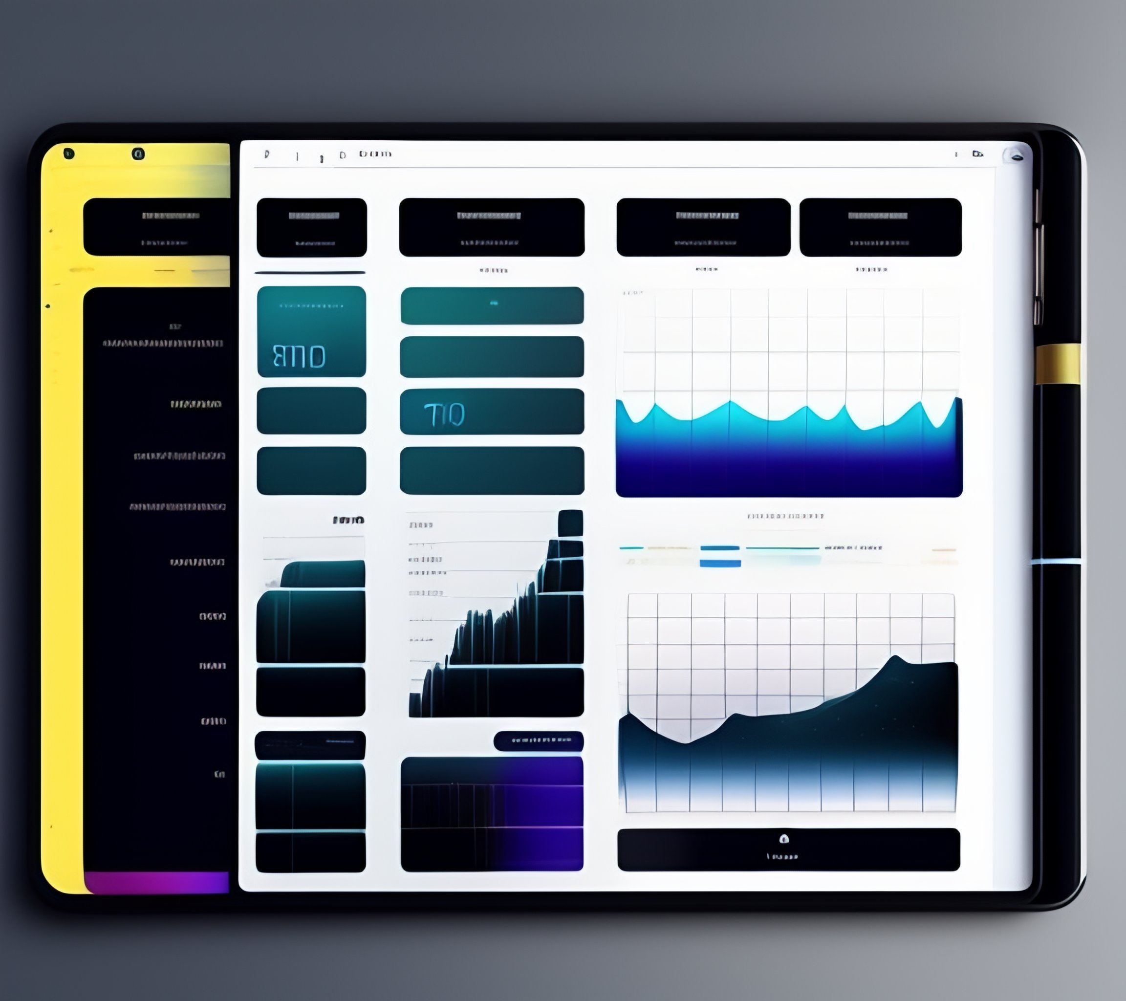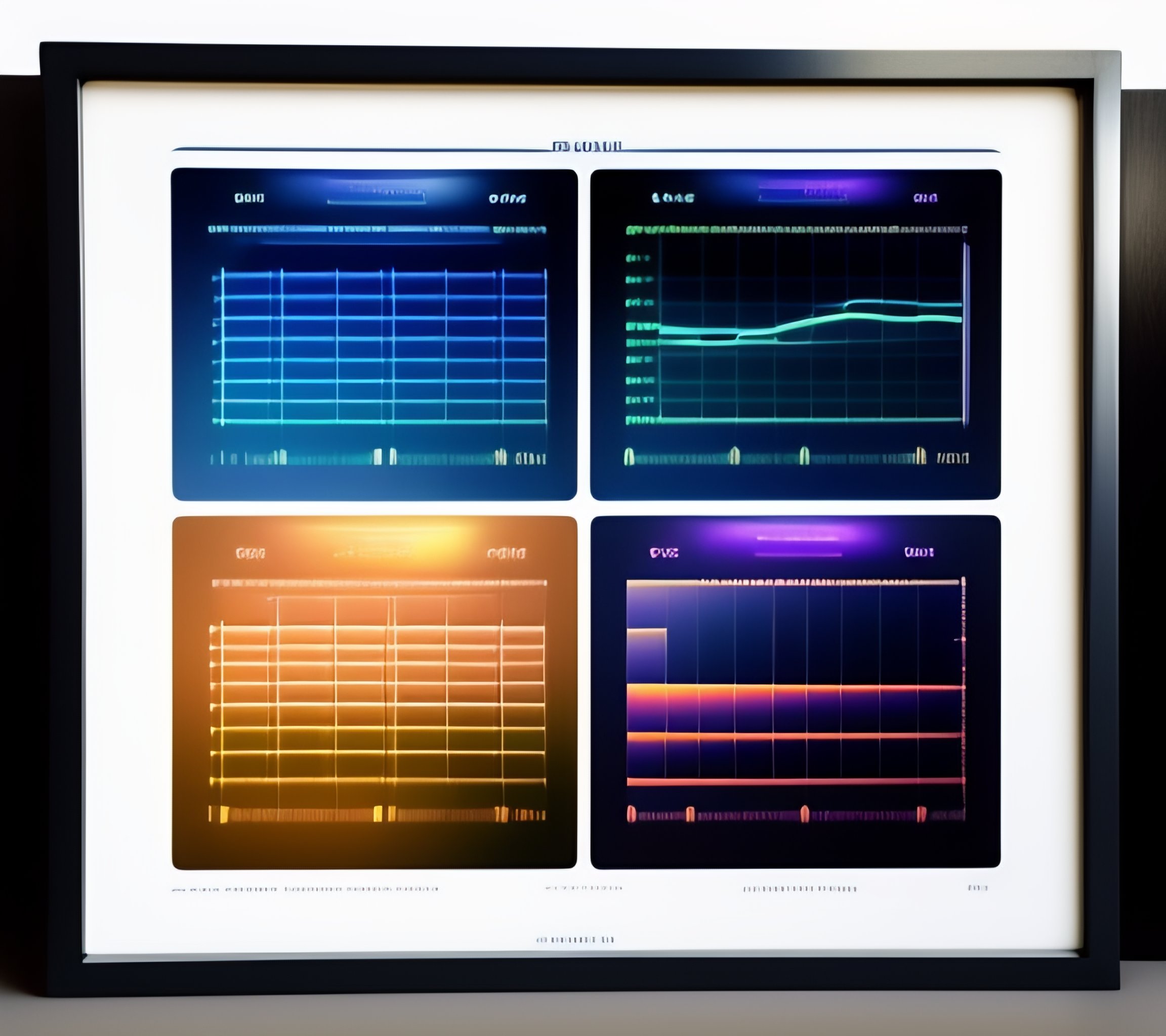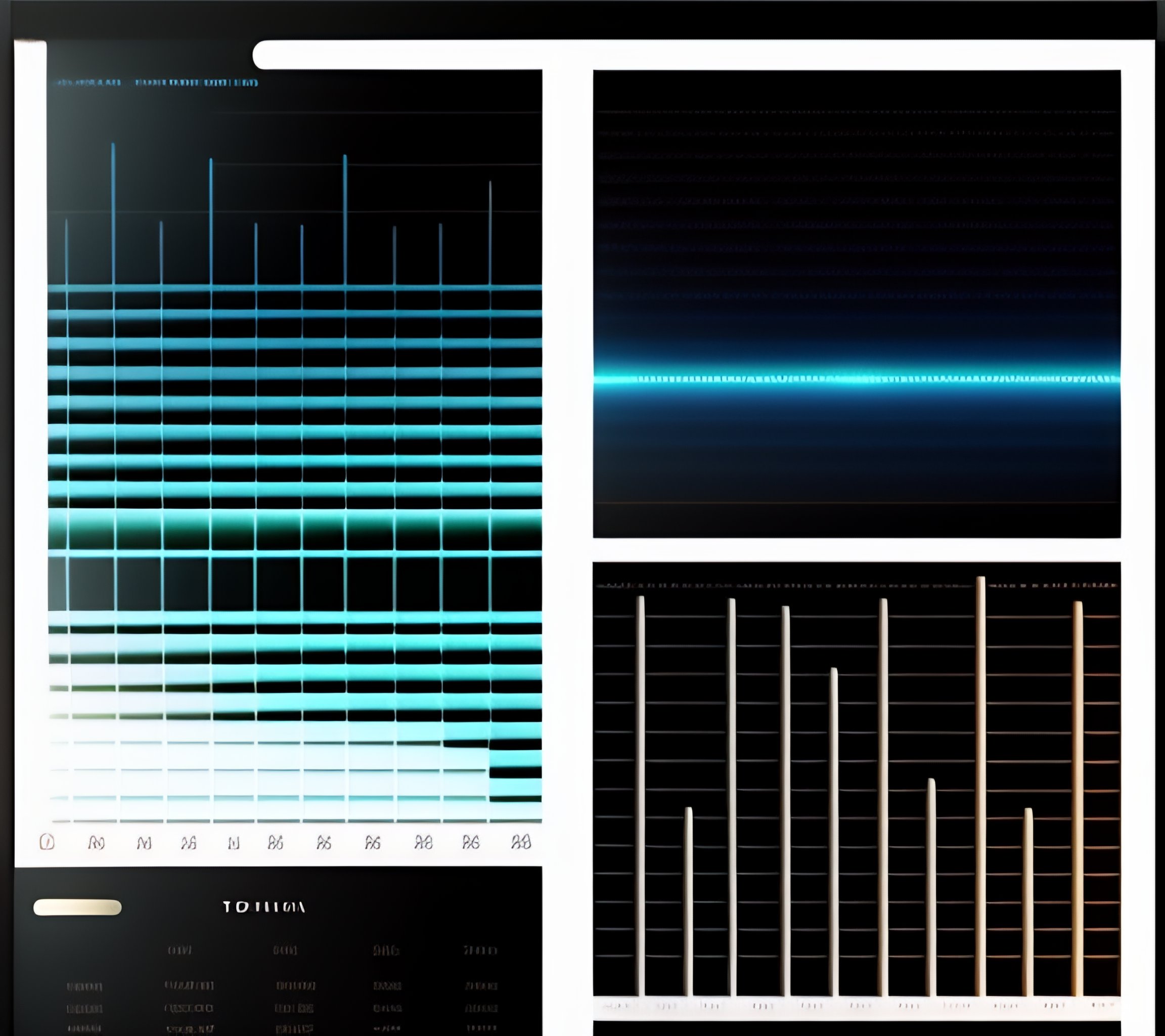 Sci fi data readouts, dark screen, molecular analysis, bar graphs, abstract shapes, typographical scan of dna, variety of lines and shapes