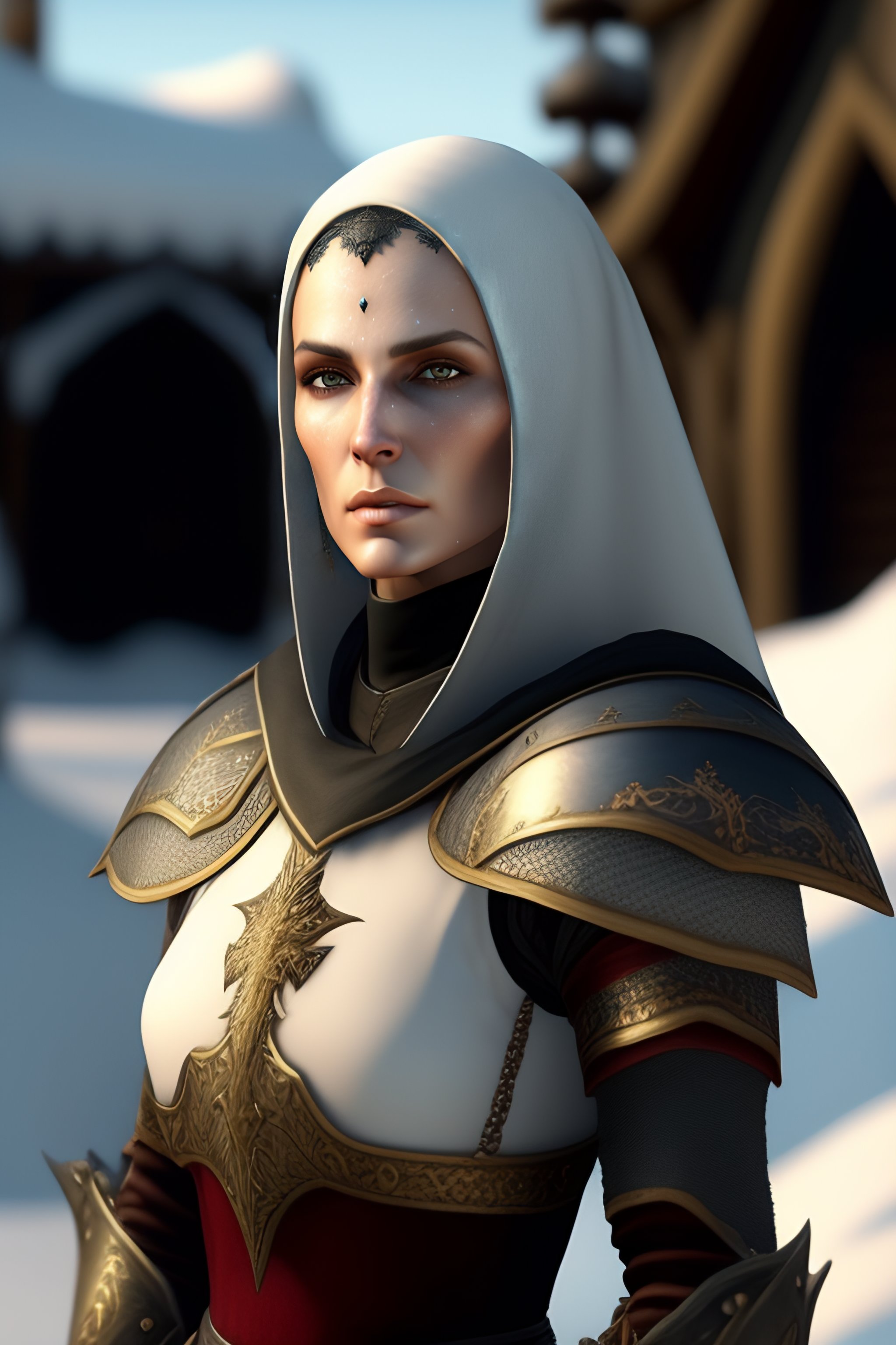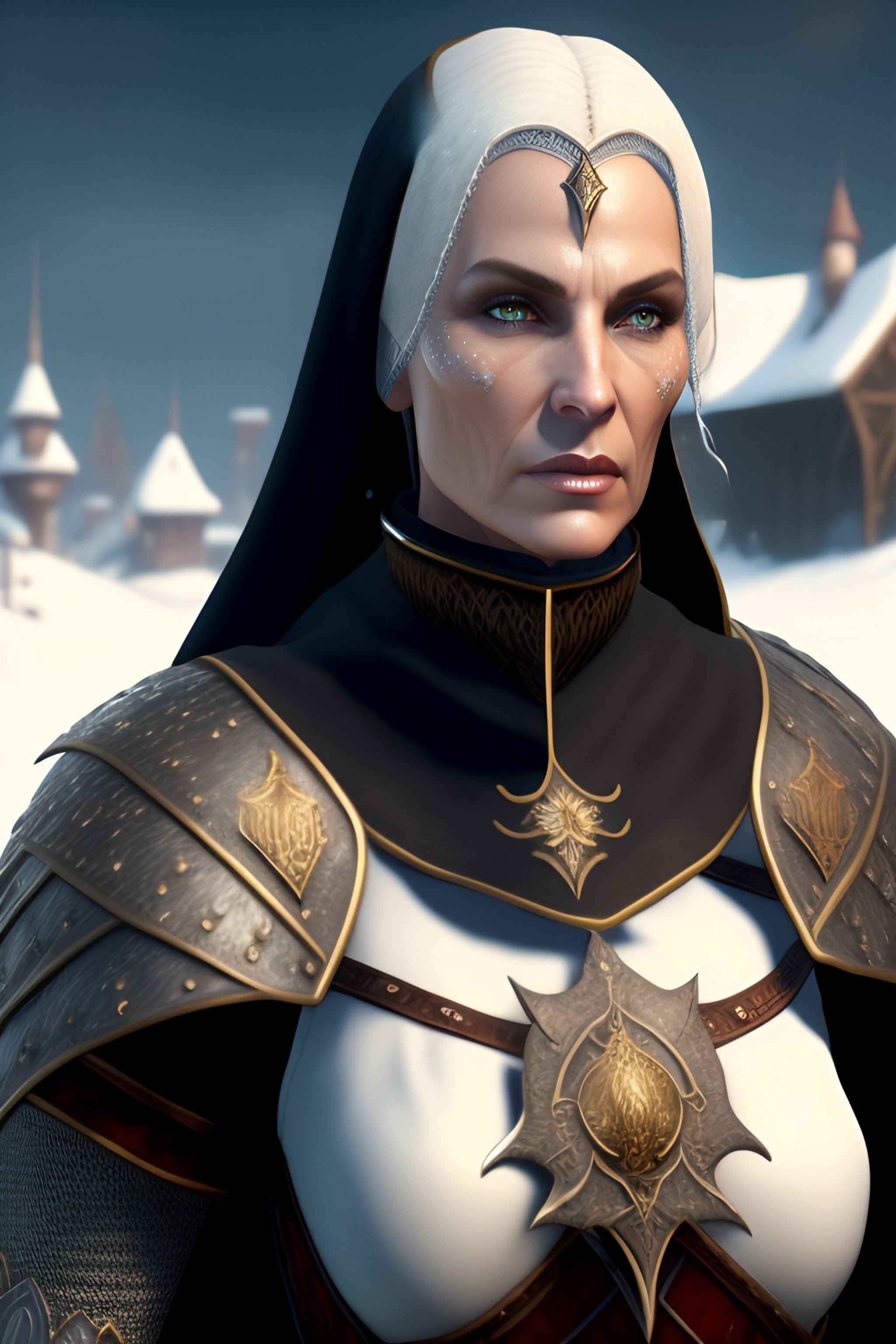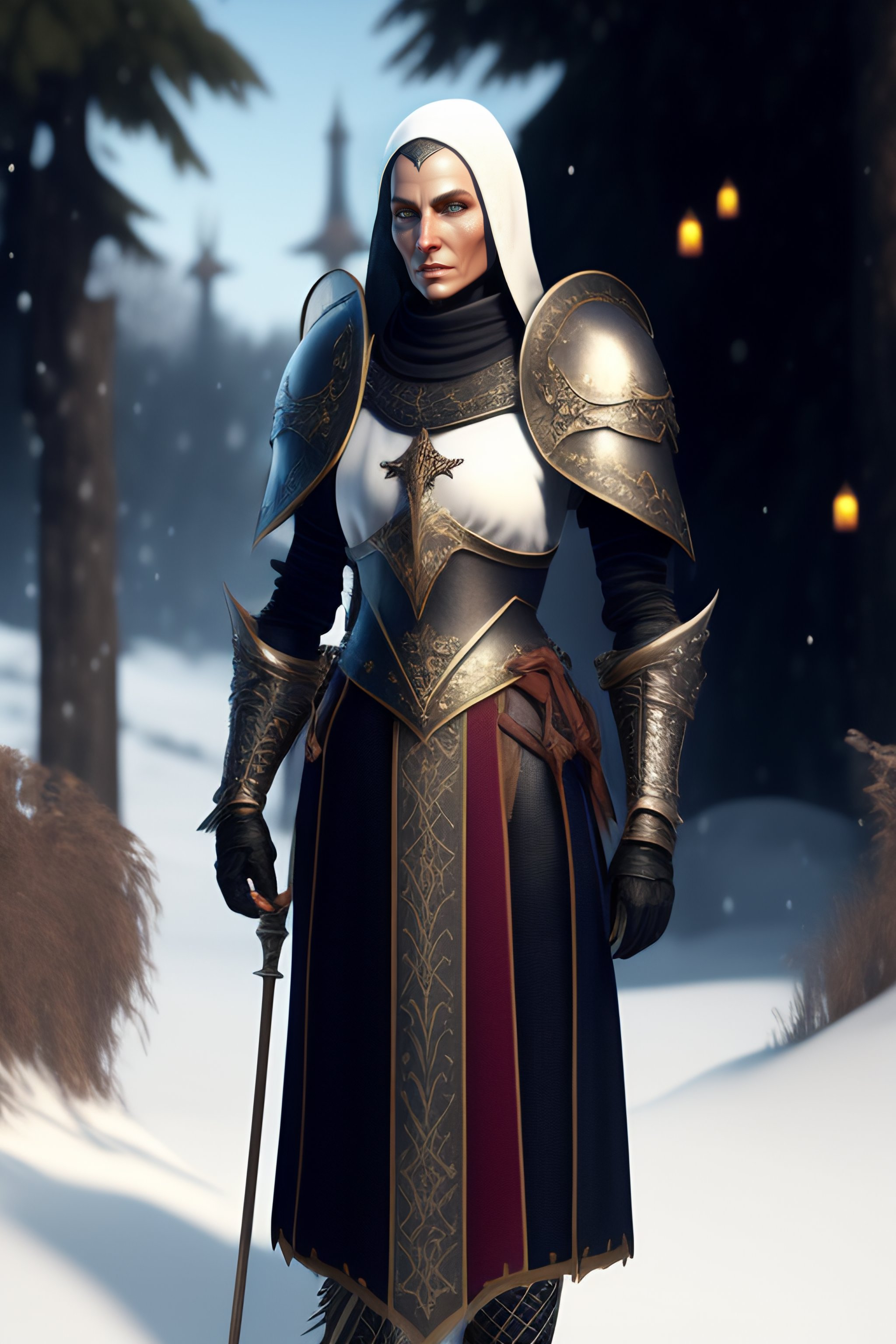 Nun, 48 year old medieval fantasy knight, weathered characteristics, white skin with tattoos, short hair with white bangs, exquisite gothic bone armor in the snow realistic full body hd 8k