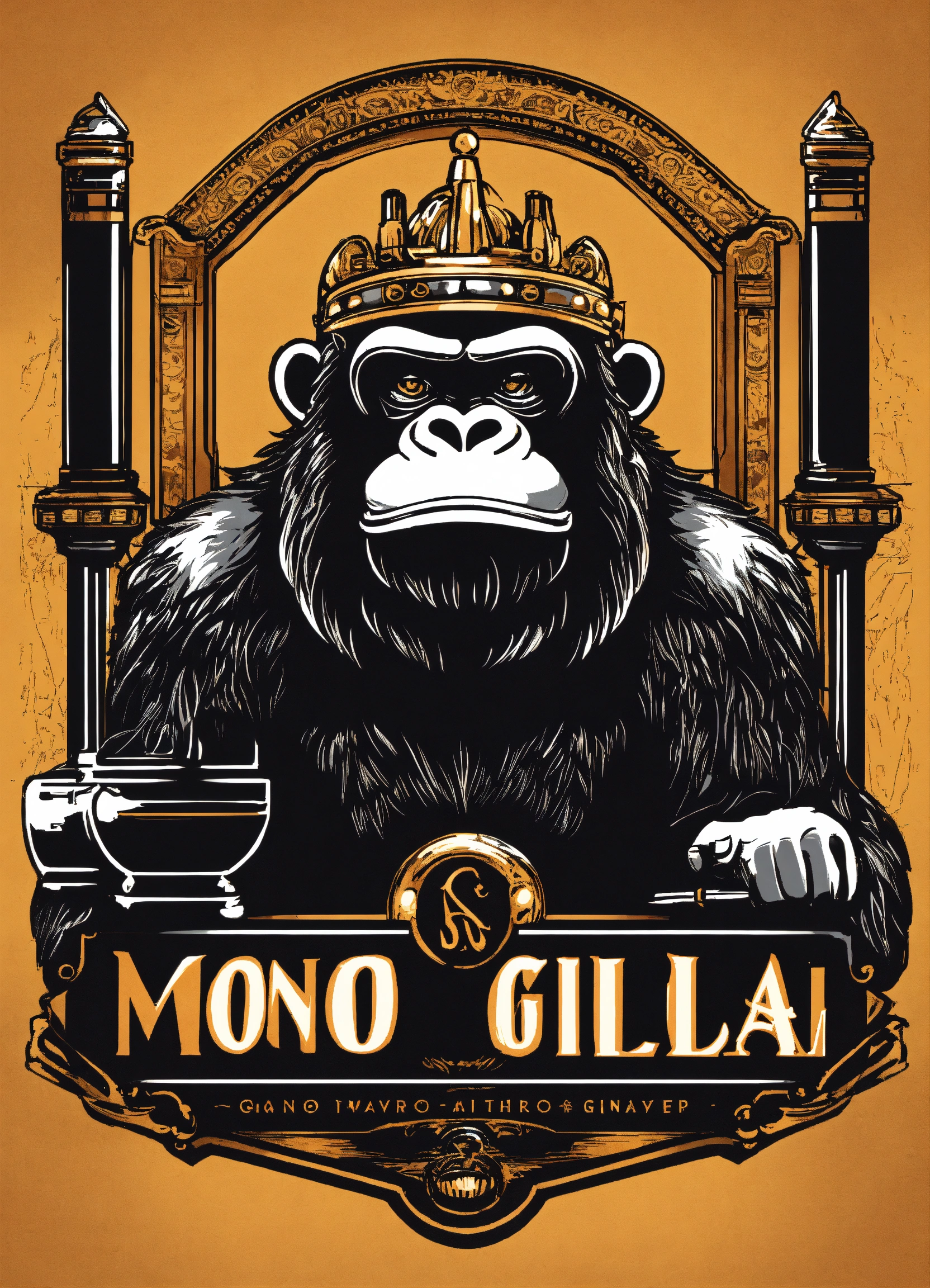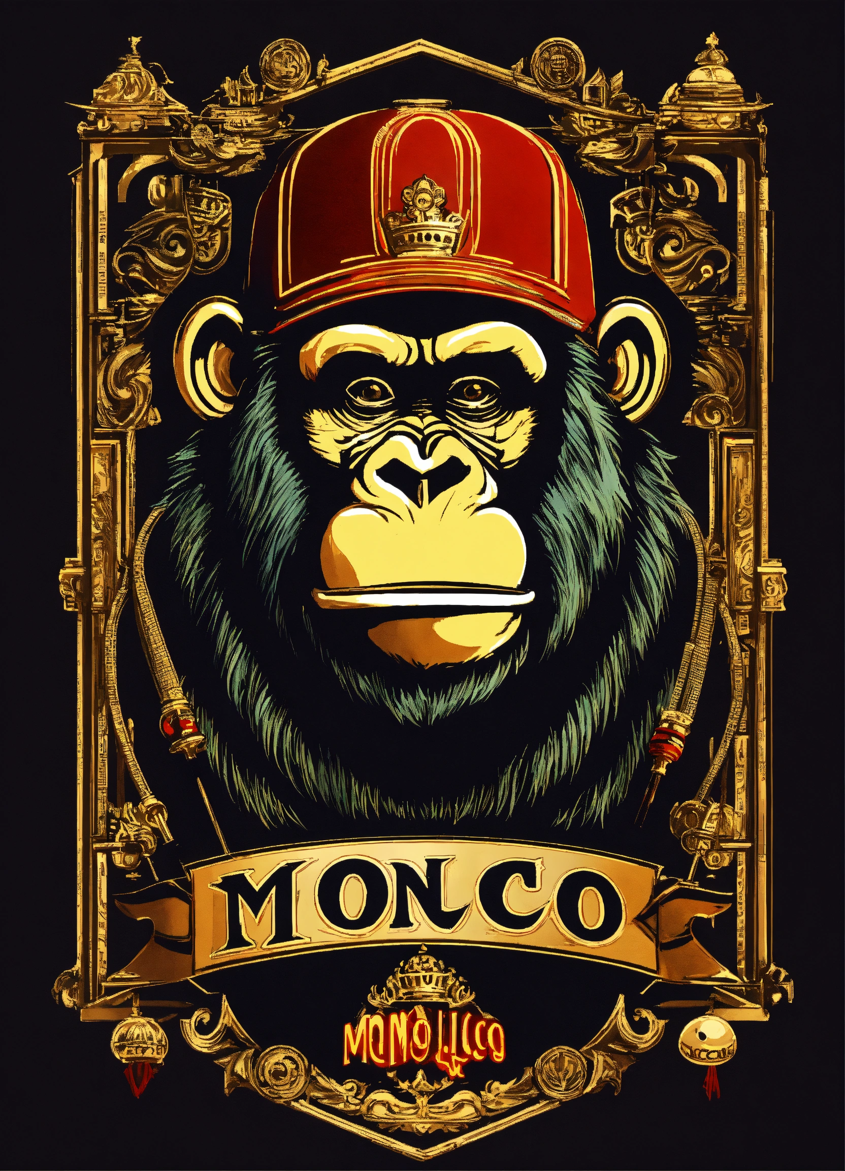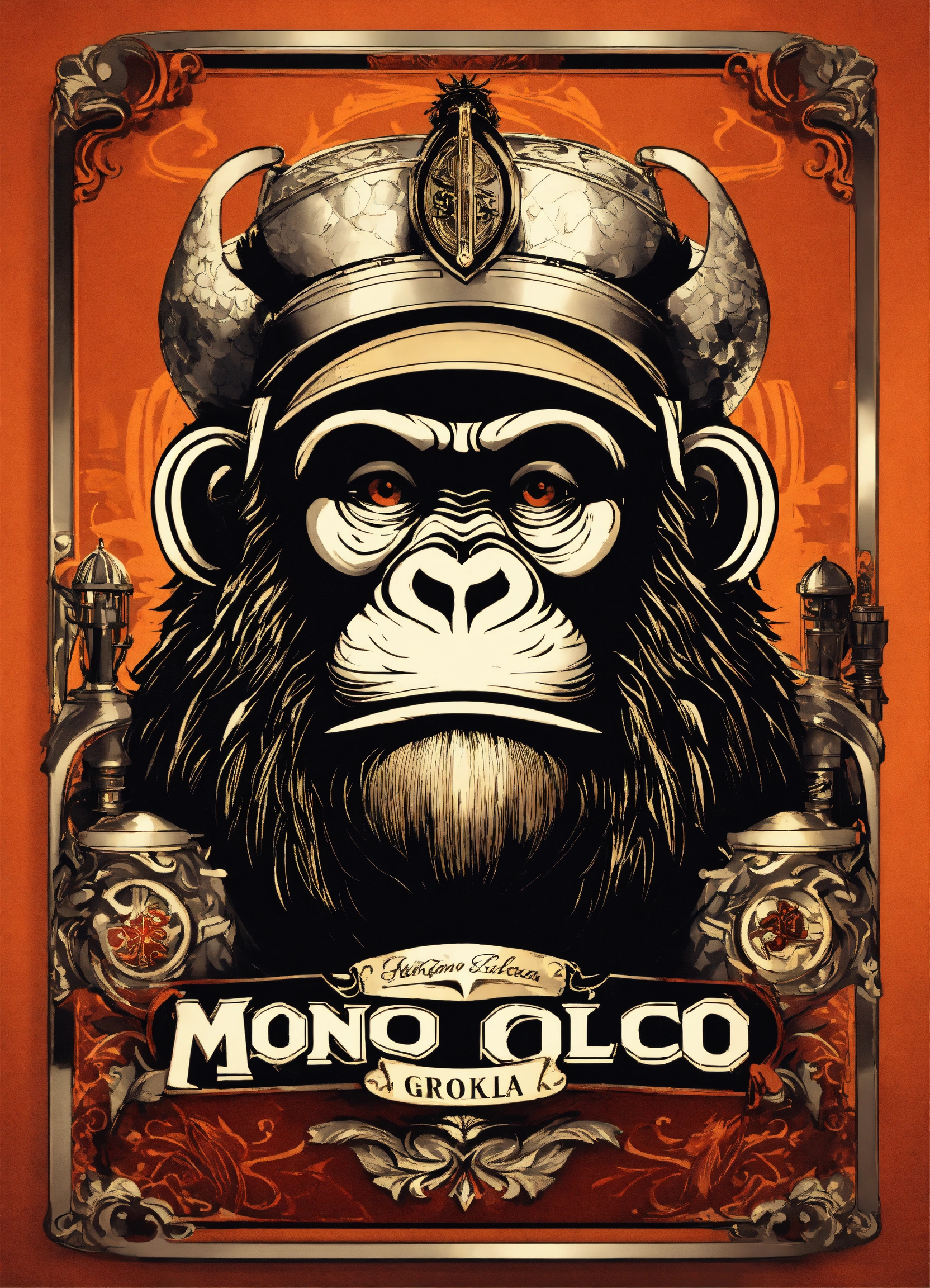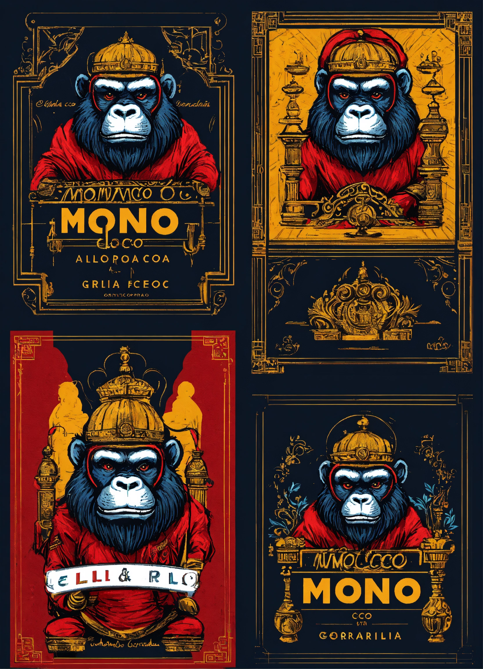 Diseño de logotipo corporativo con naming “mono loco”, el fondo gráfico es un gorila sentado sobre un trono con una gorra de visera recta estilo rapero y una shisha