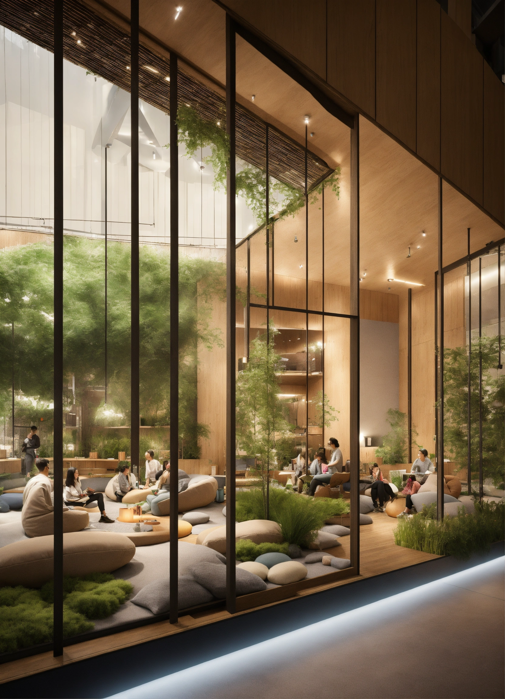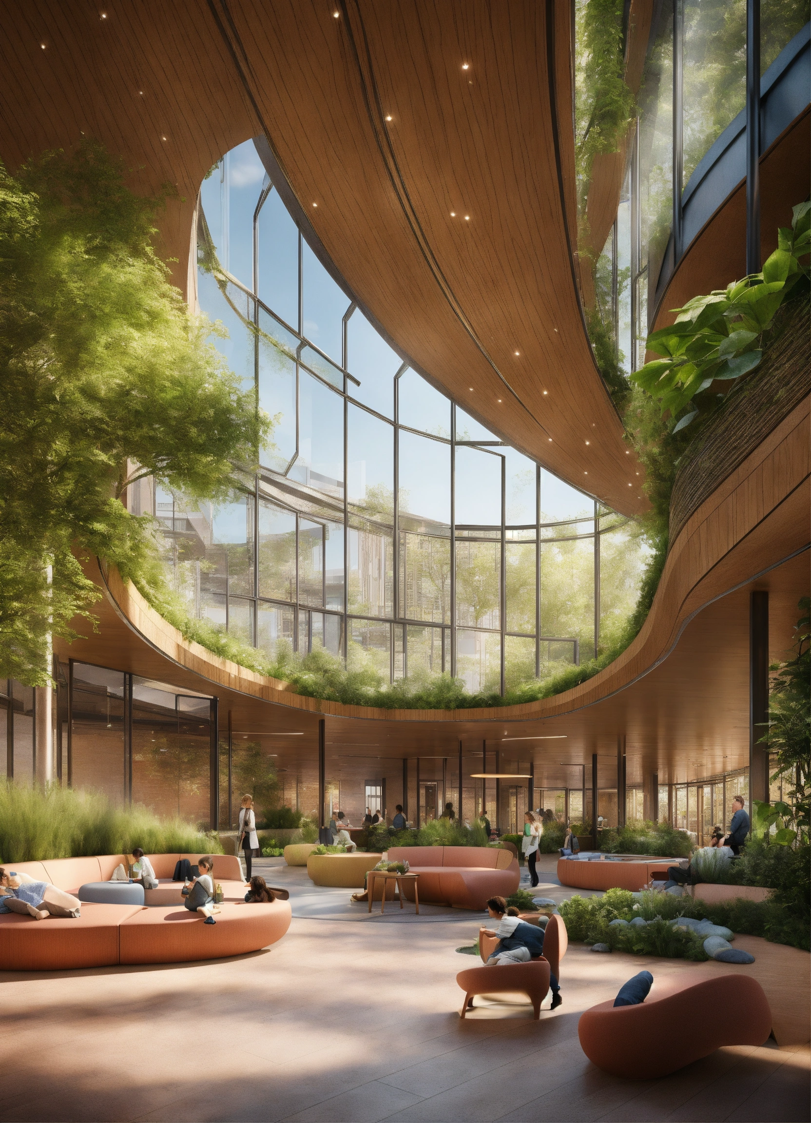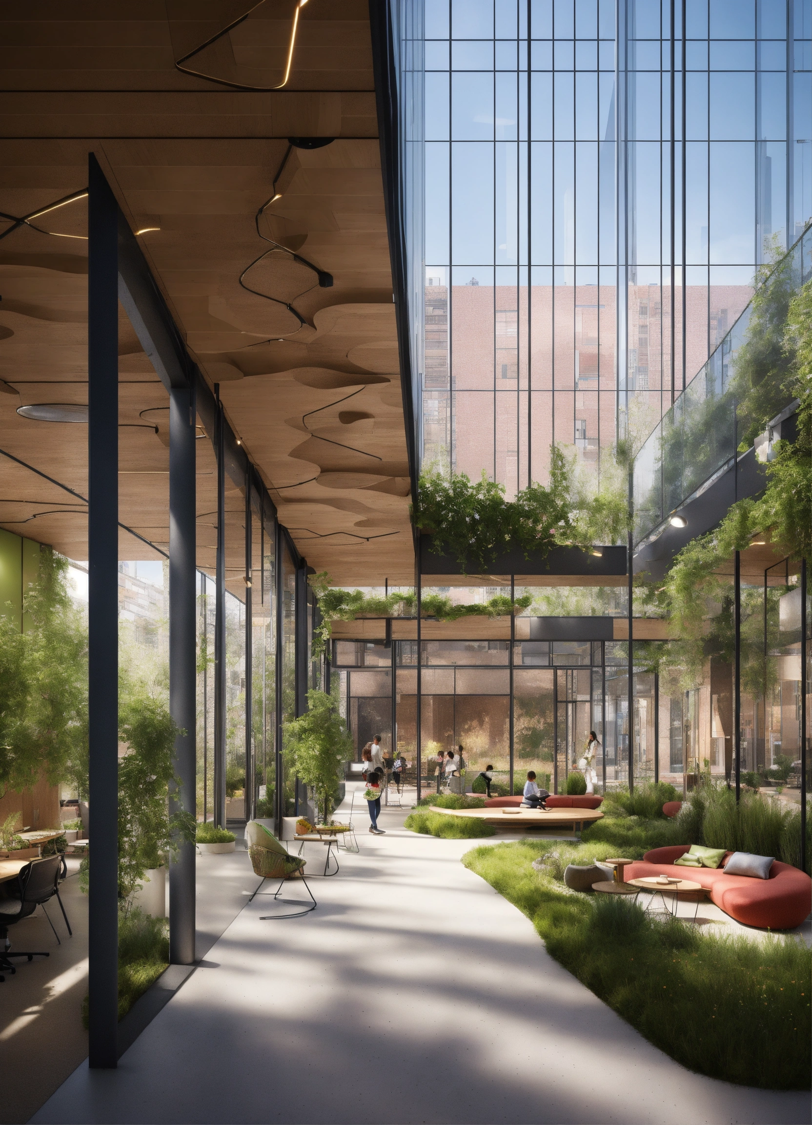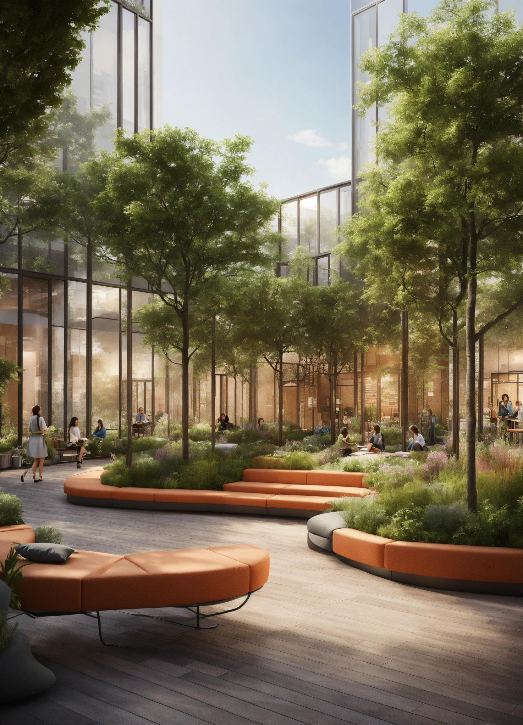 An urban landscape where buildings are equipped with cutting-edge air quality monitoring systems and biophilic design elements. visualize a cityscape where modern structures seamlessly integrate green spaces, gardens, and natural elements. inside, meditation pods and therapy rooms are interspersed with collaborative workspaces, all designed to promote mental and physical well-being. communal areas are vibrant with social interactions, and spaces are adapted to be inclusive for all ages.
