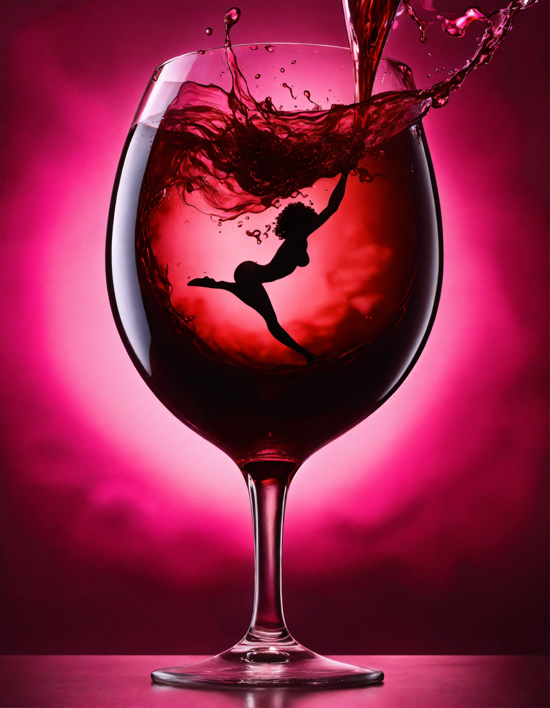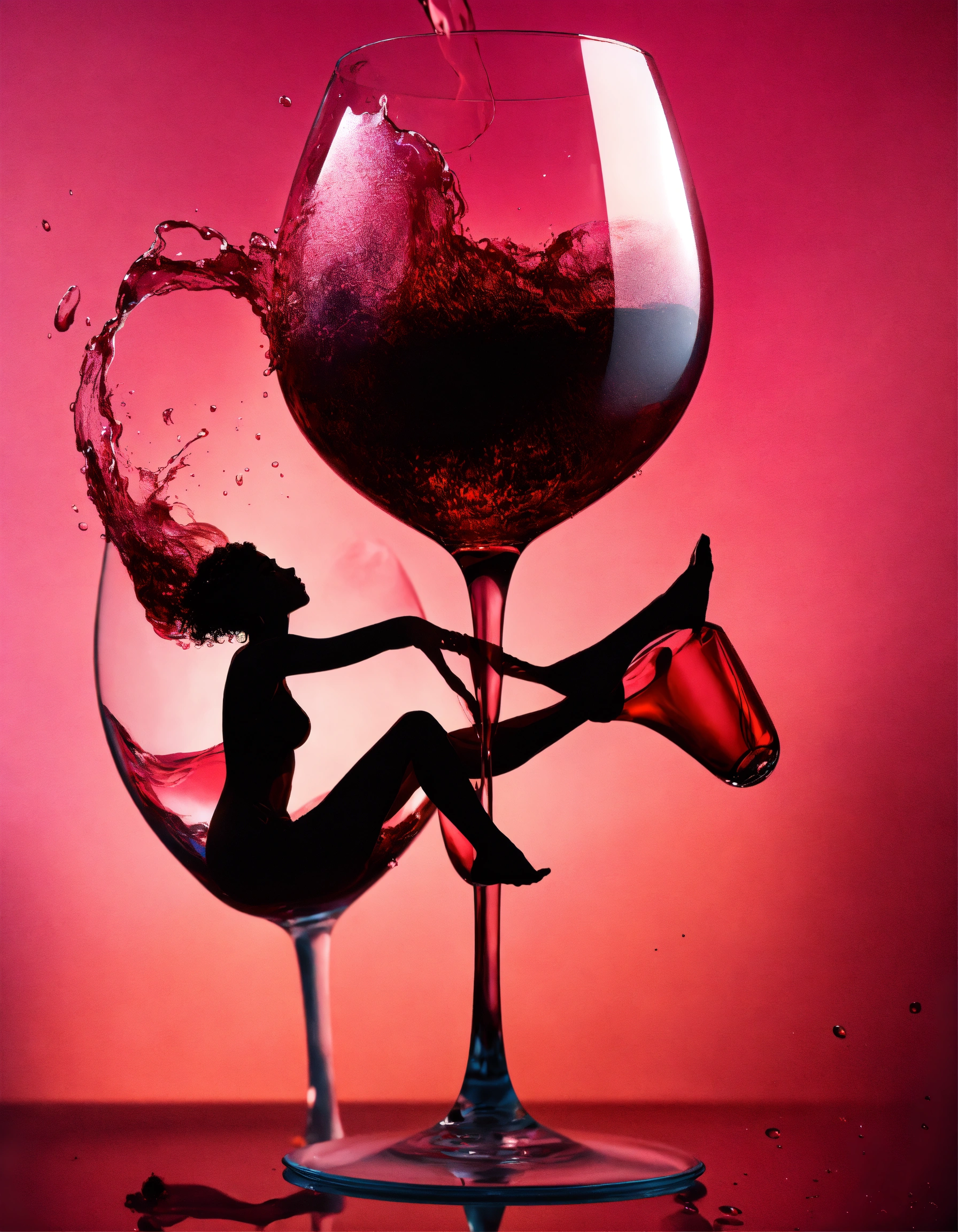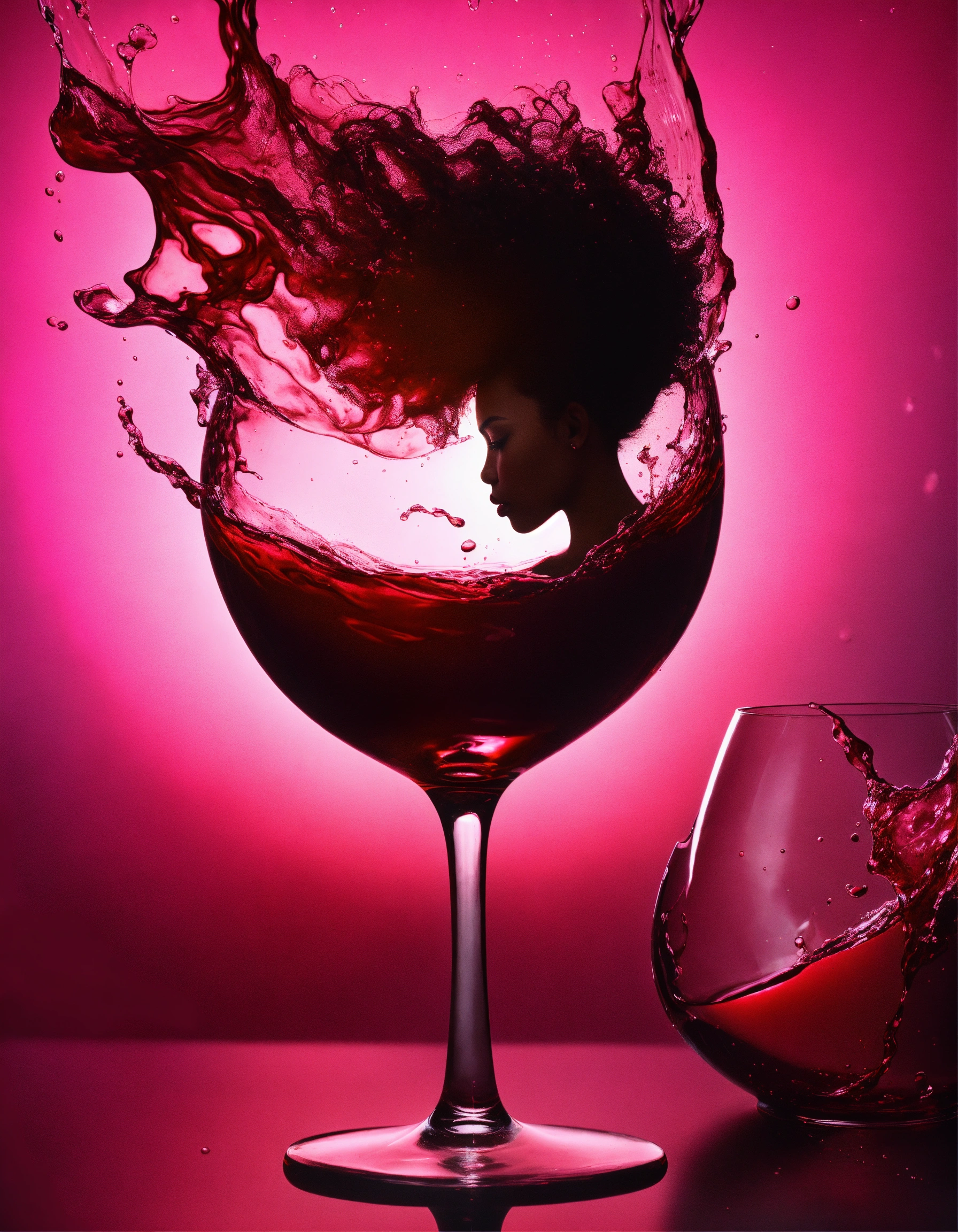 3d realistic silhouette of an african american woman laying embedded inside a wine glass becoming one together, a big dark bottle of red wine is poured on her splashing in the wine glass and over her body in shades of dark pink, her hair is big and curly, photo art, antigravity, the background is a neutral backdrop.