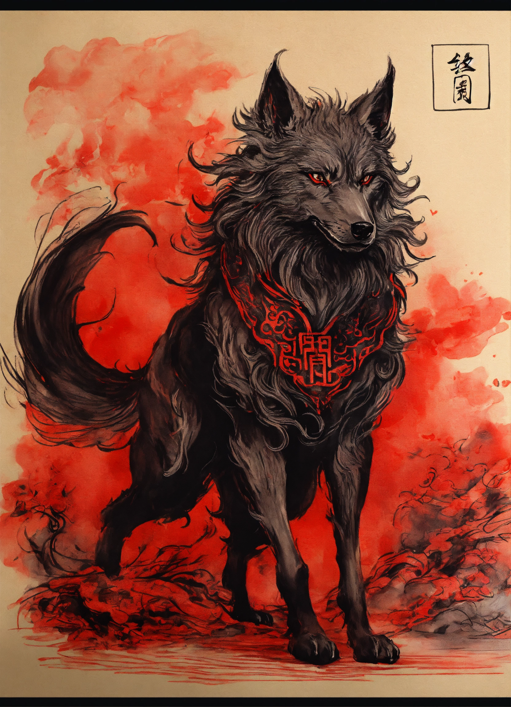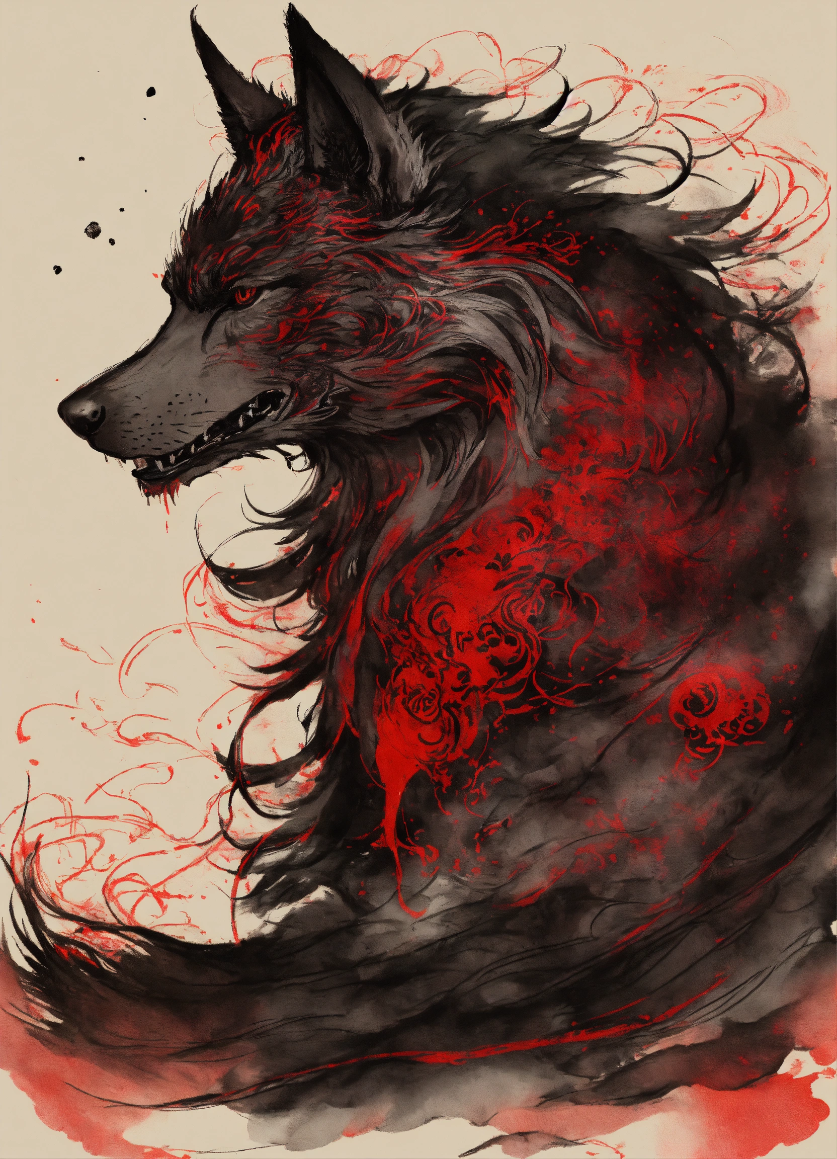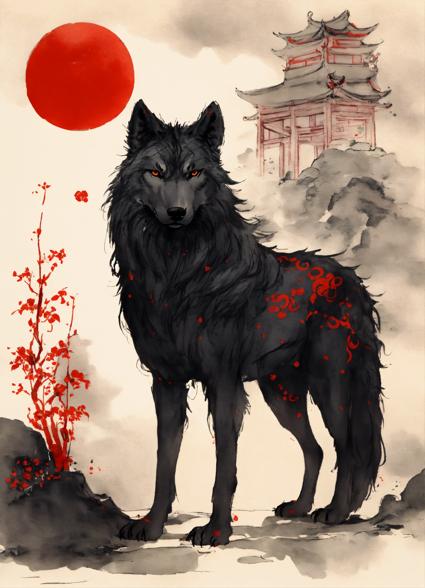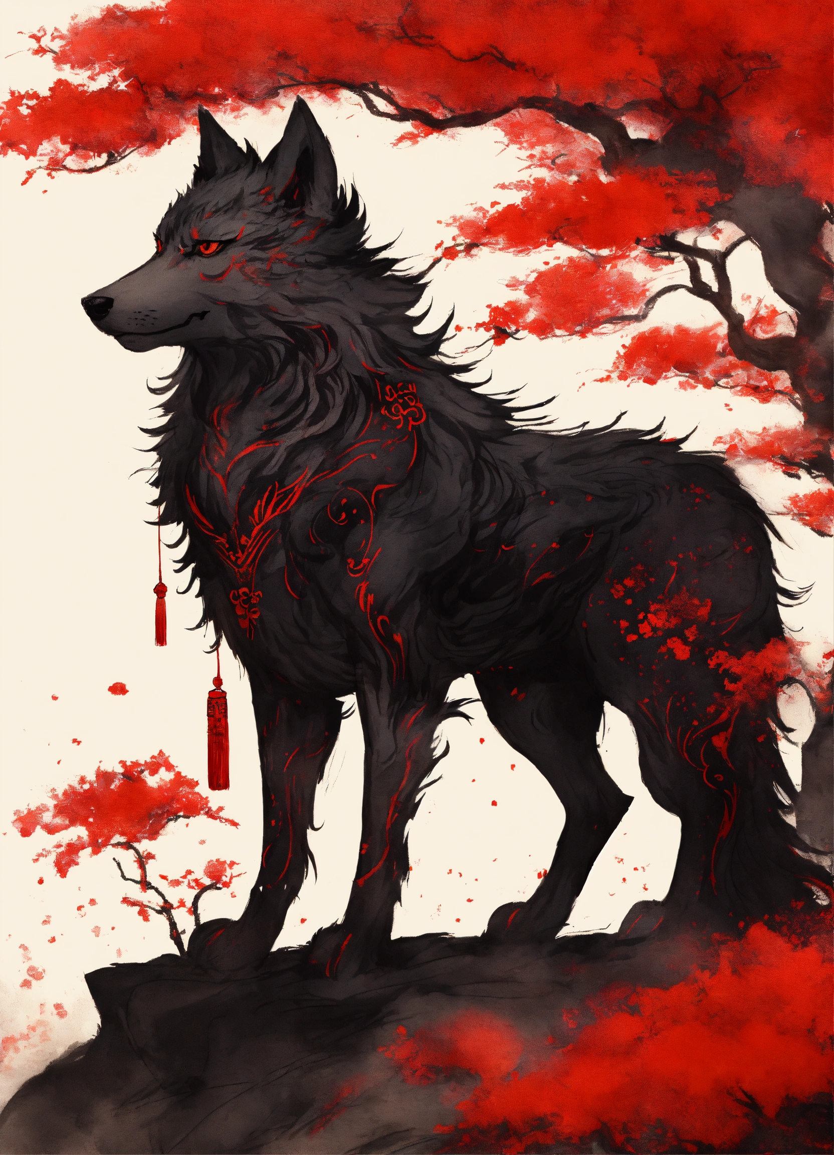 Shuǐmò huà, 水墨画, black and red ink, a fantasy wolf made from coal, in chinese style, ink art by mschiffer, whimsical, rough sketch, (sketch1.3)