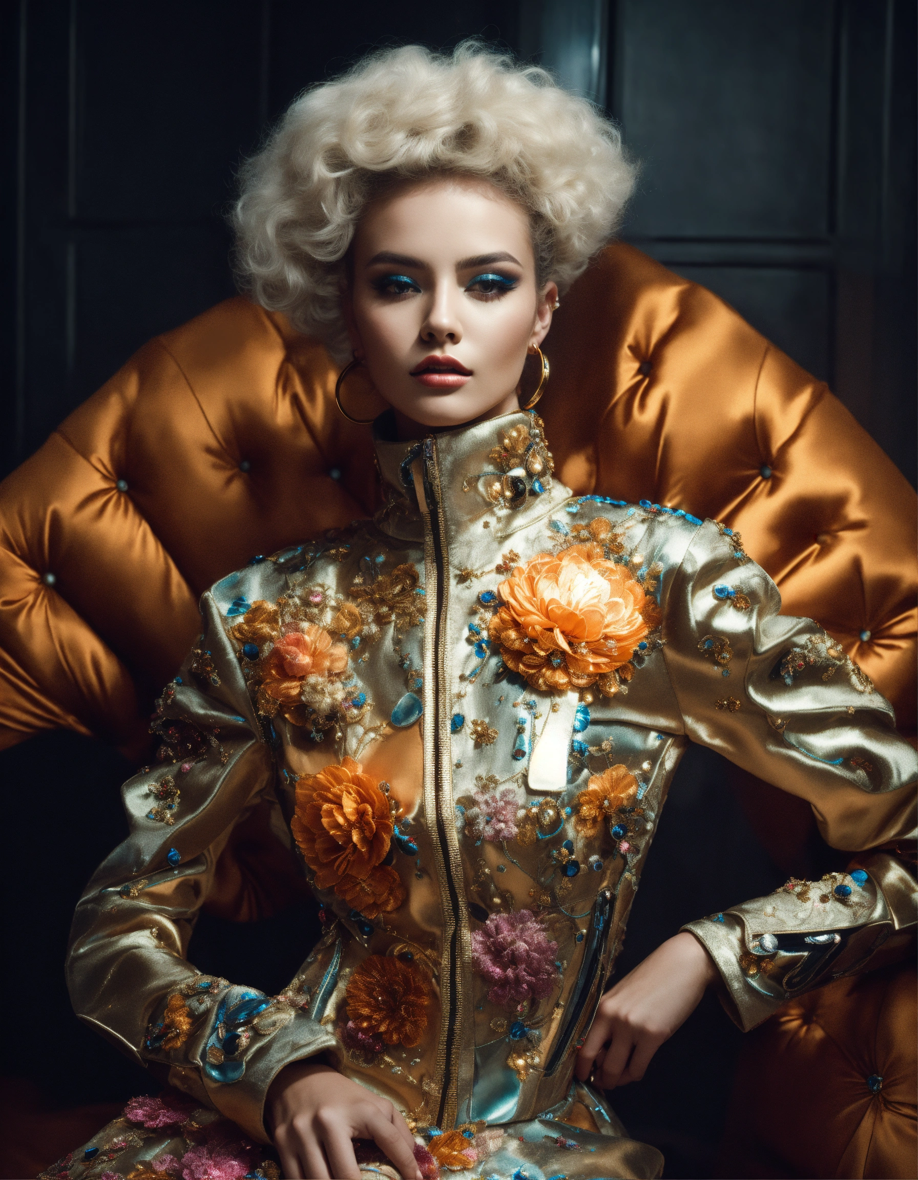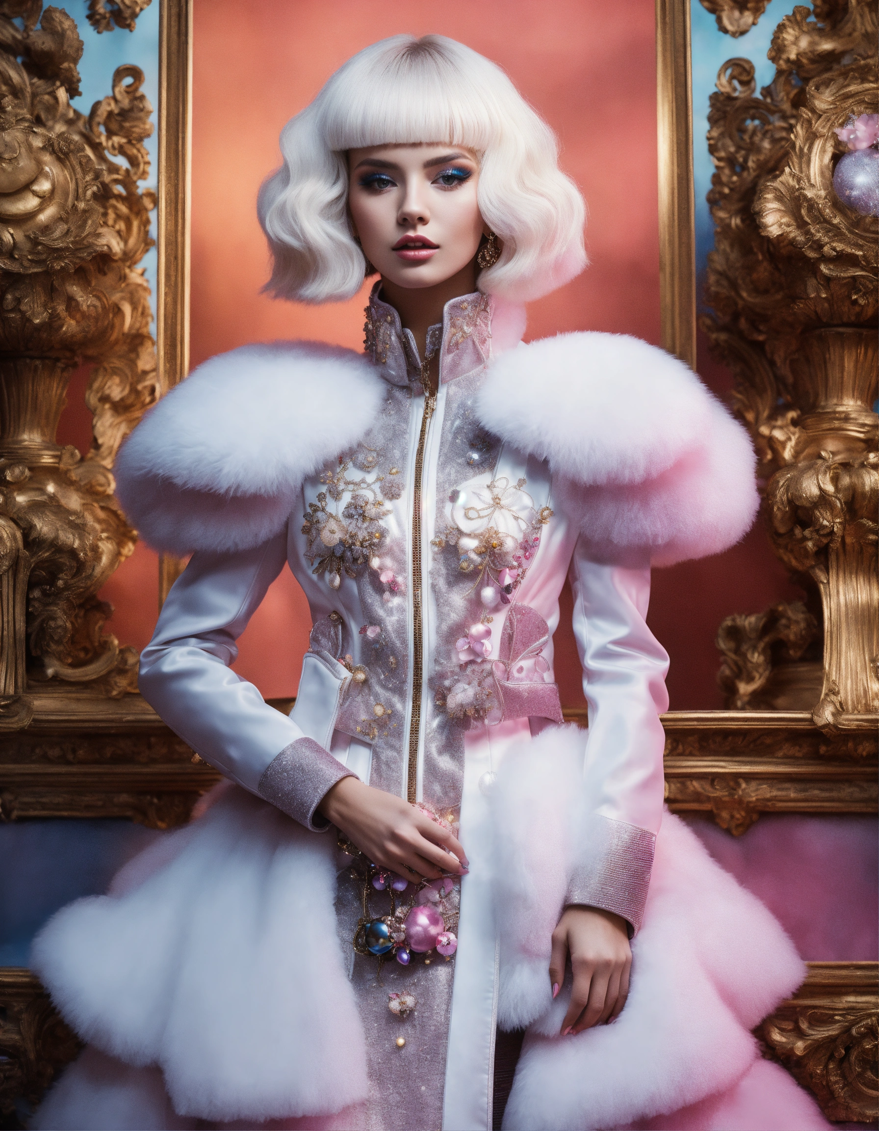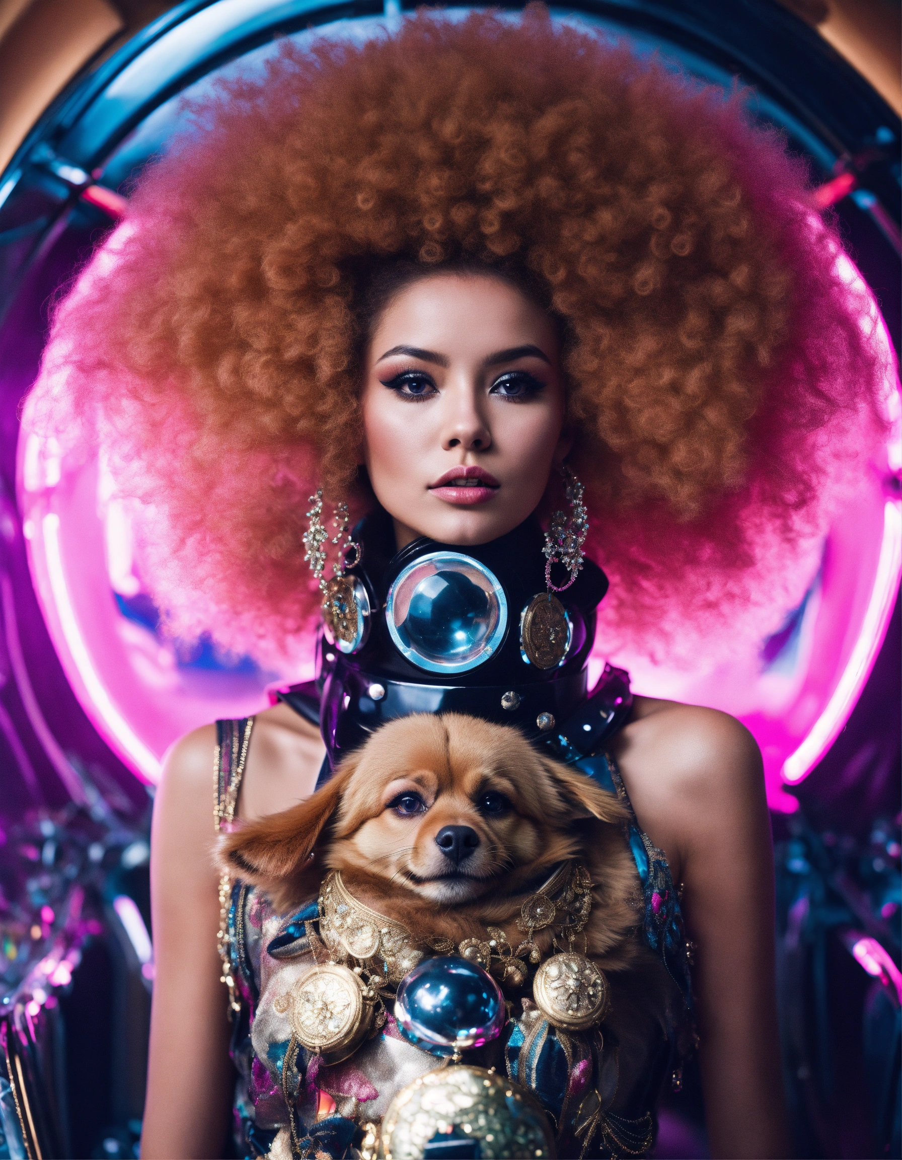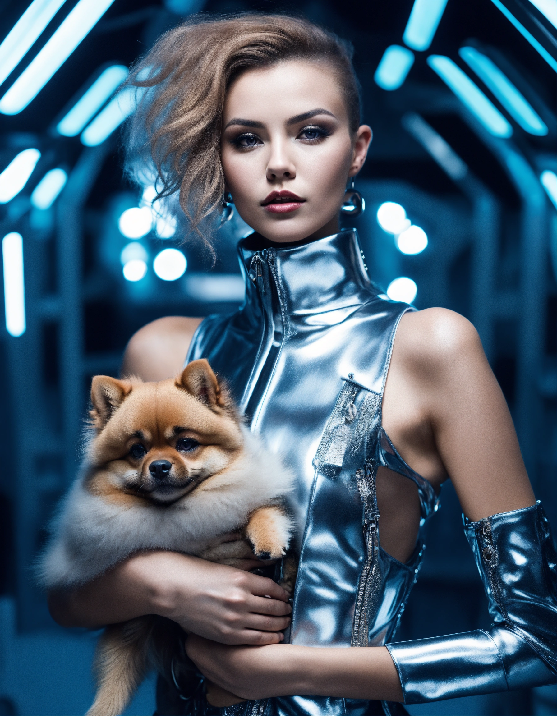Fashion shooting with a beautiful fashion model with futuristic style in cosmos, futuristic and baroque style, with a pomerian in her arms