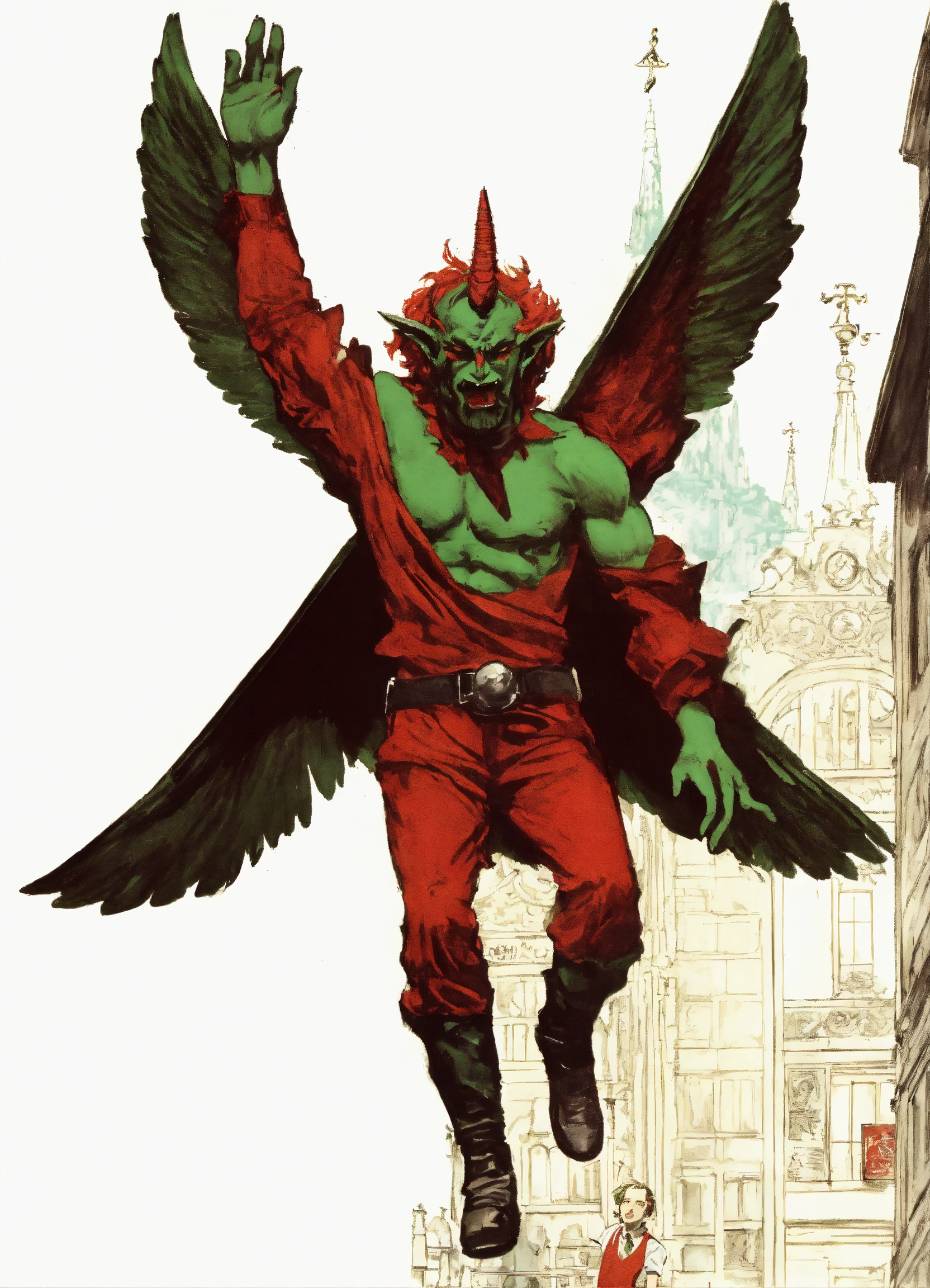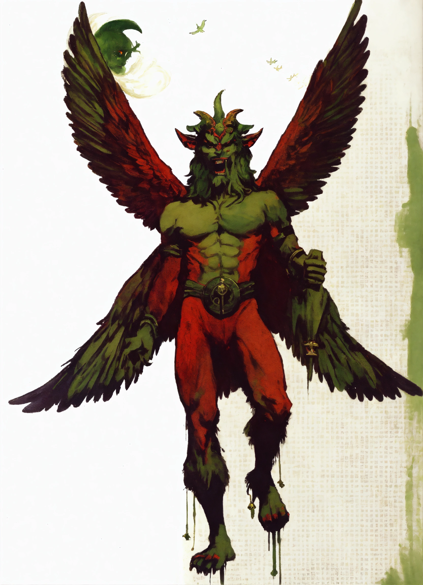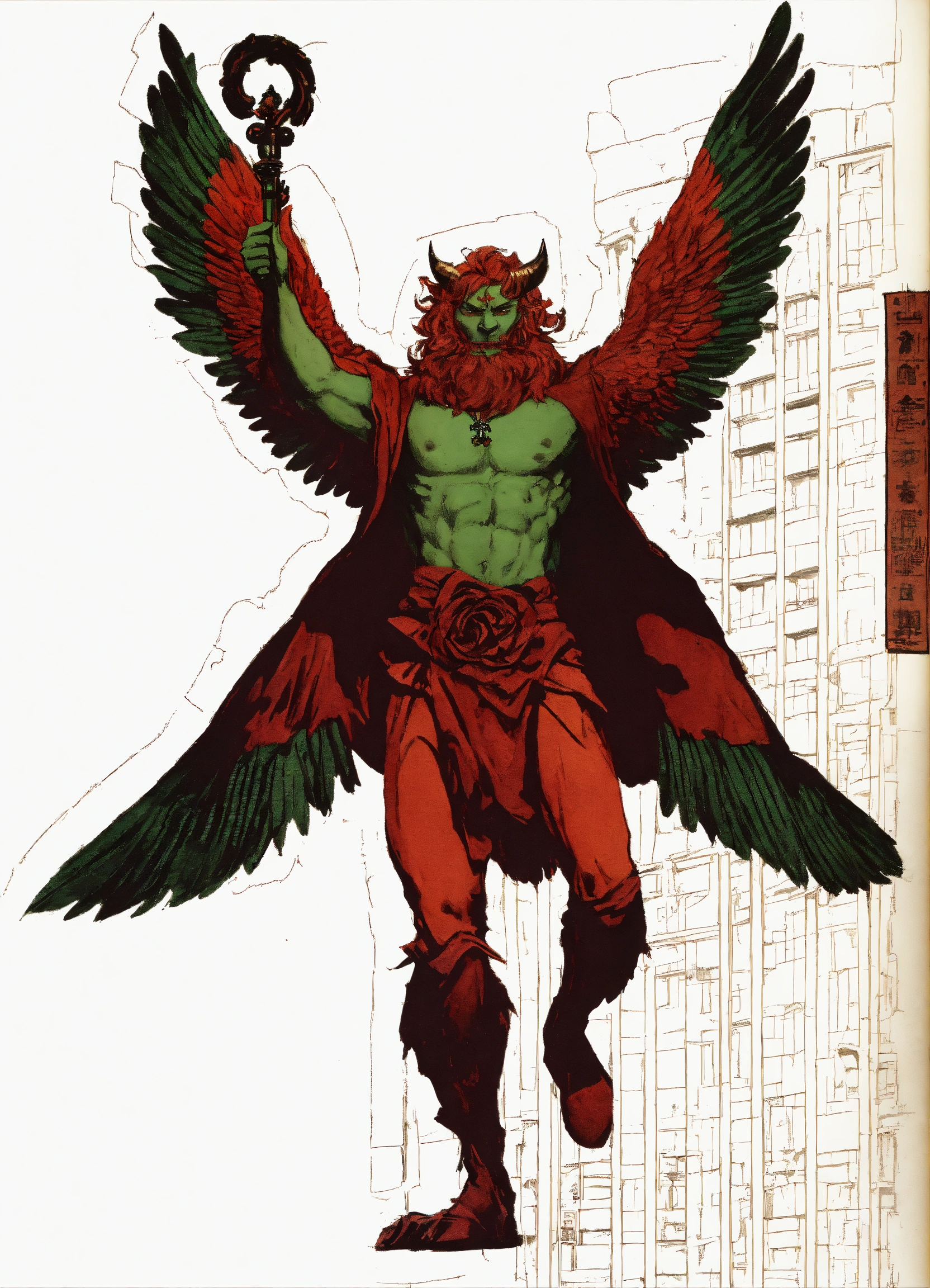Create an illustration by jacques tardi featuring green pazuzu the lord demon (with one arm raised toward the sky and the other arm pointing downward) evil leonine face with horns, but with the distinctive aesthetic of 90s analog photos. emphasize the retro texture inherent to analog developments, ensuring to capture the visual essence of that era. pay attention to details to recreate the authentic look of analog photographs from that period, while also bringing a contemporary touch to the overall composition.